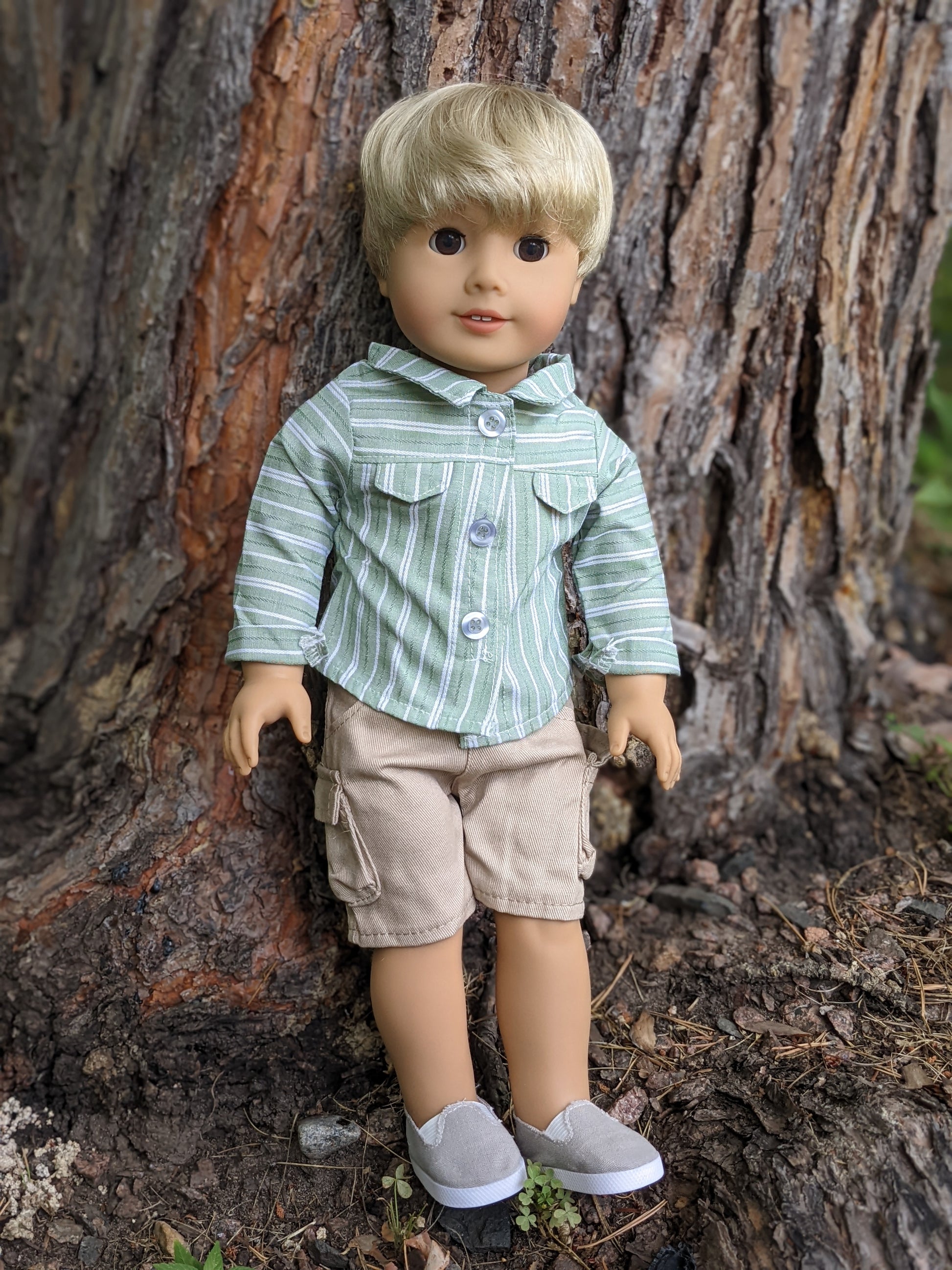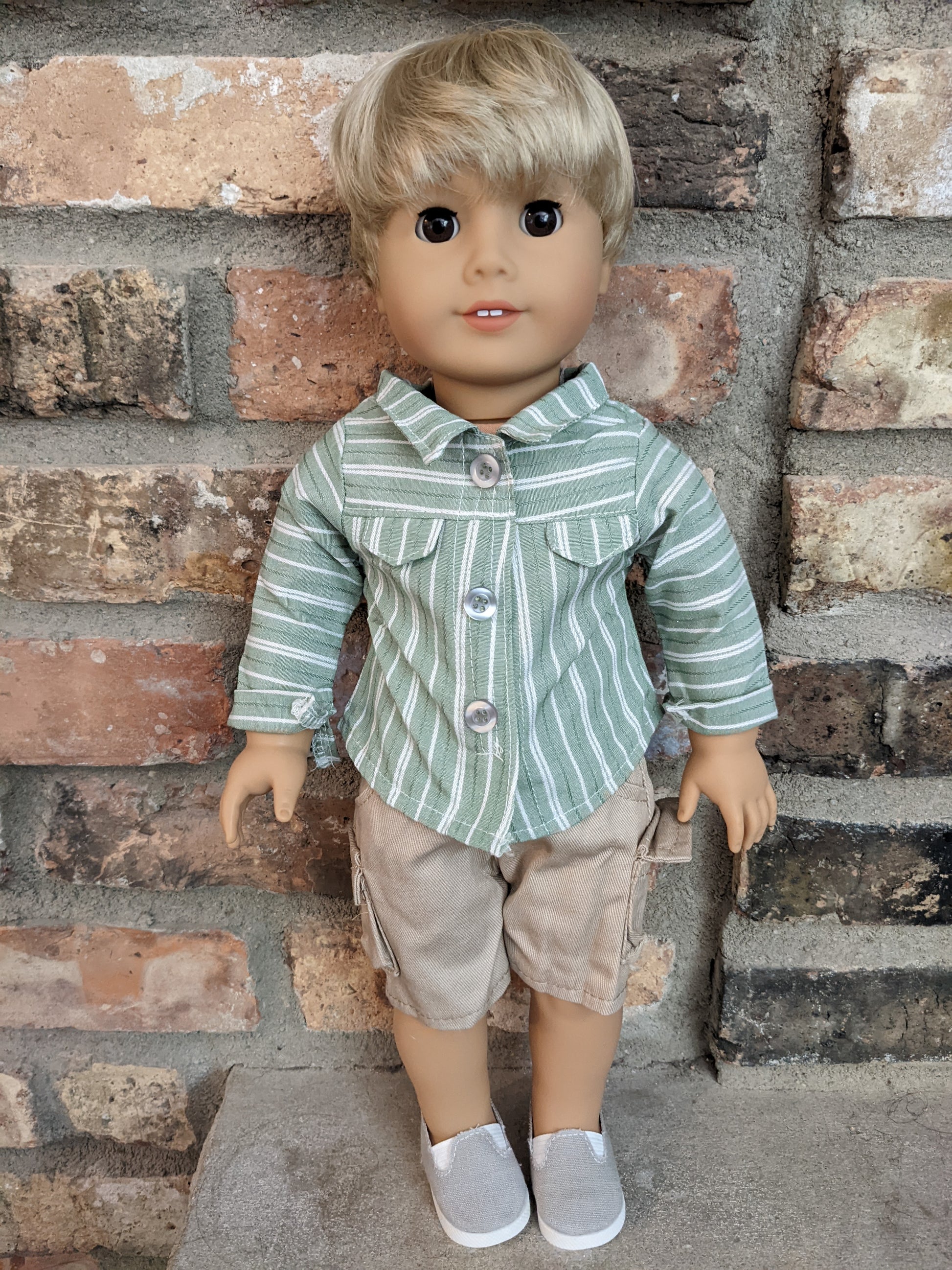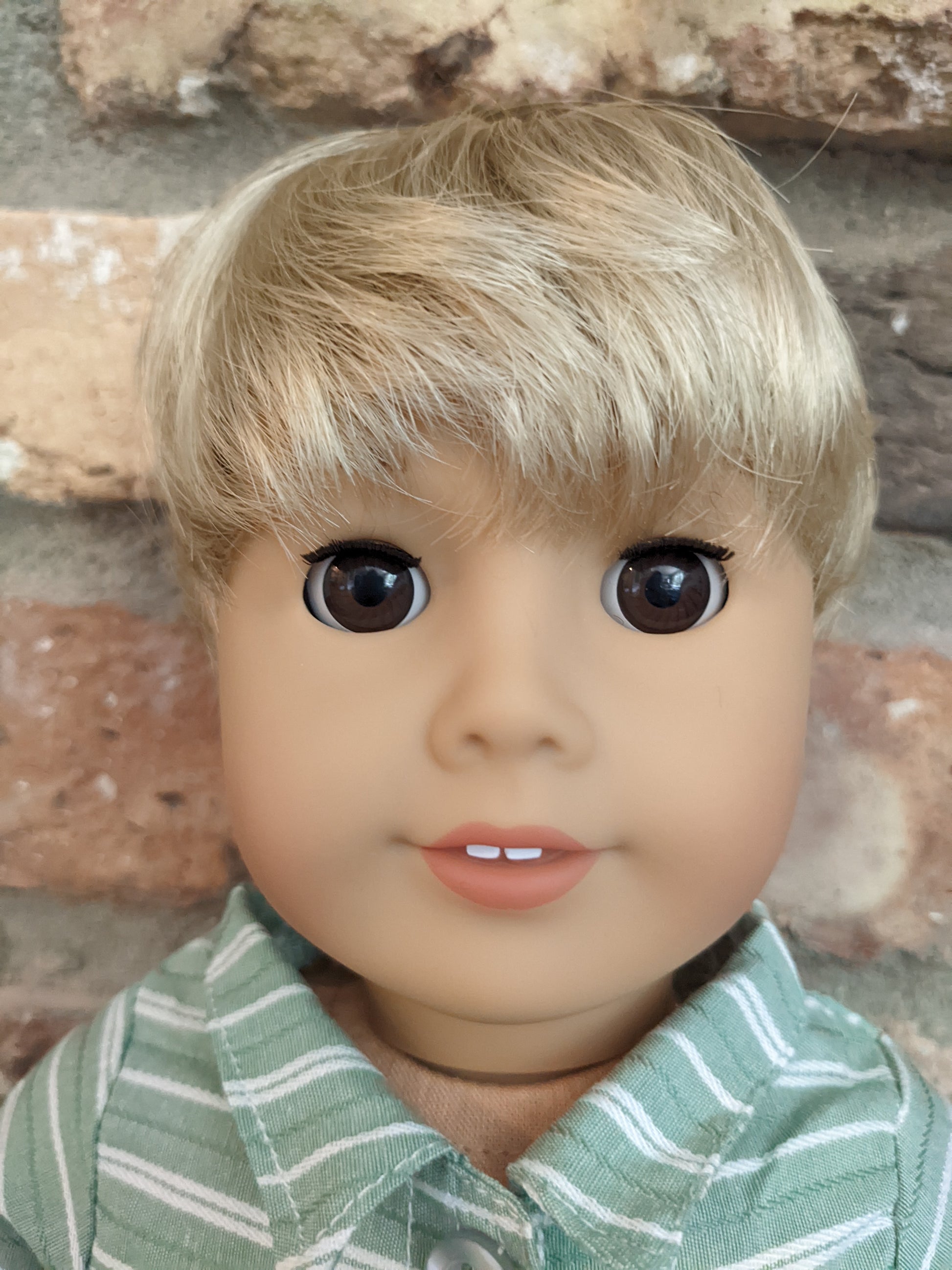 This one of a kind OOAK custom American Girl doll was created with a brand new Truly Me doll, a blonde wig, and brown eyes. He may have some minor shine marks from handling. He comes with the outfit pictured.