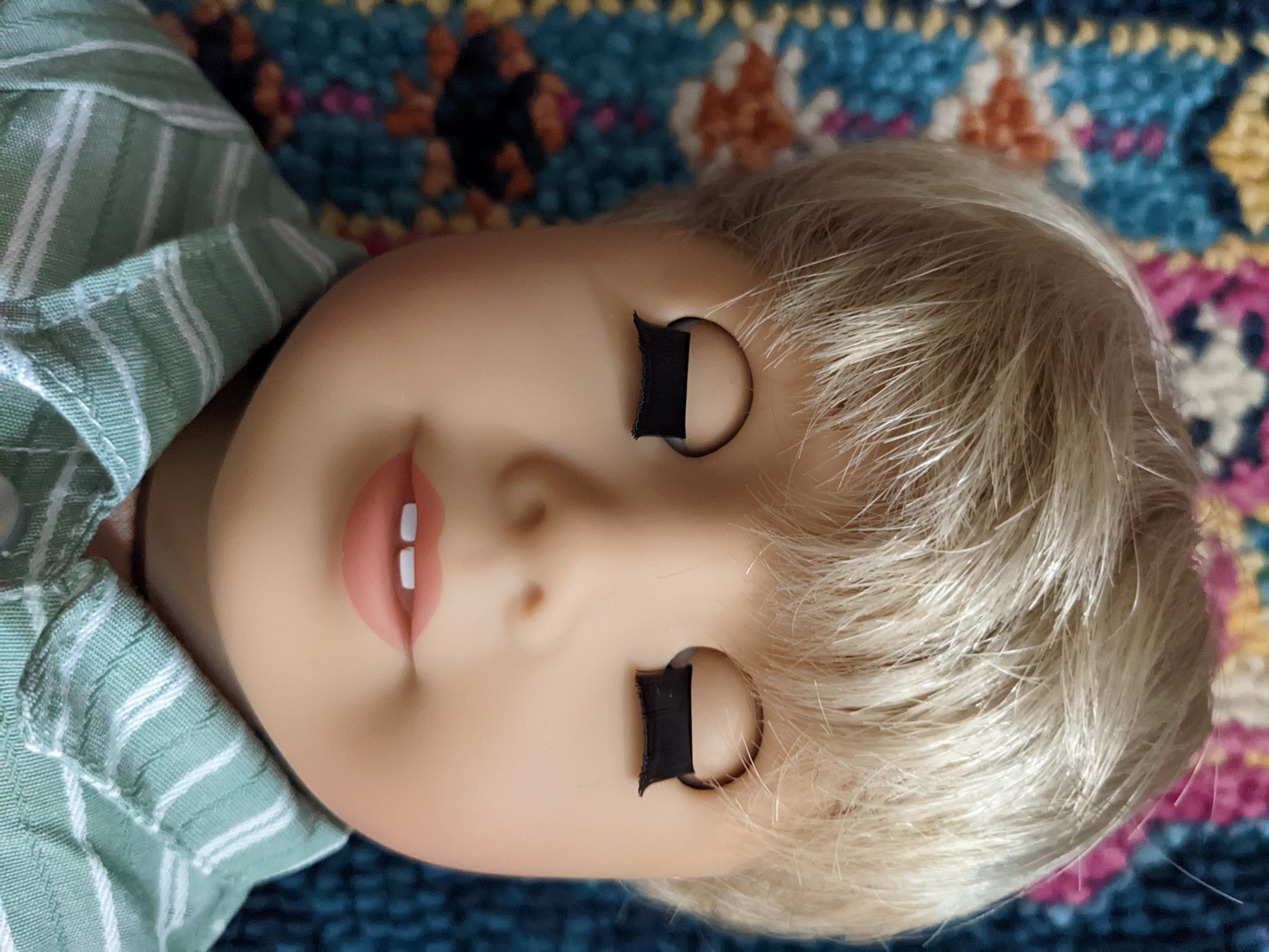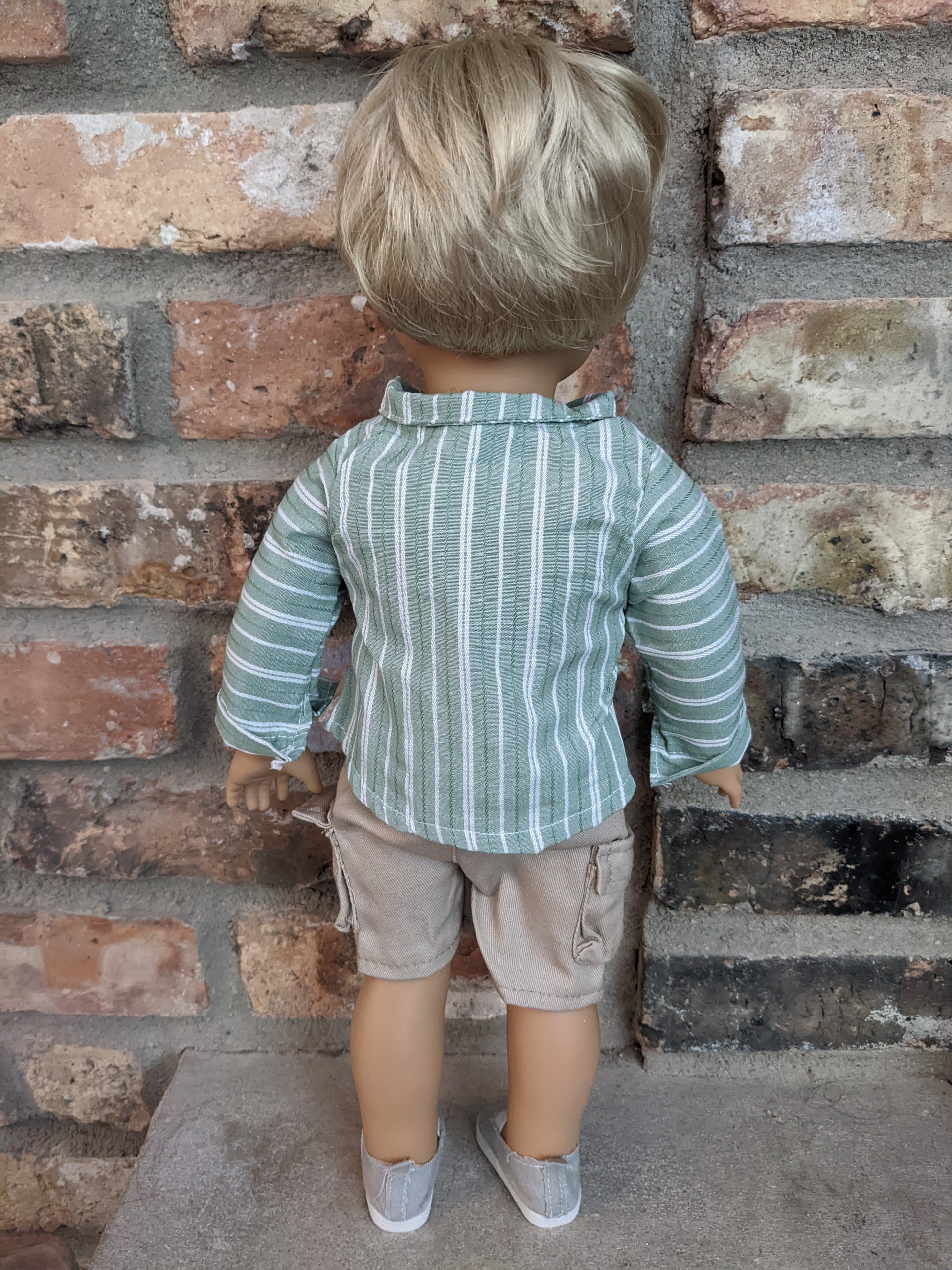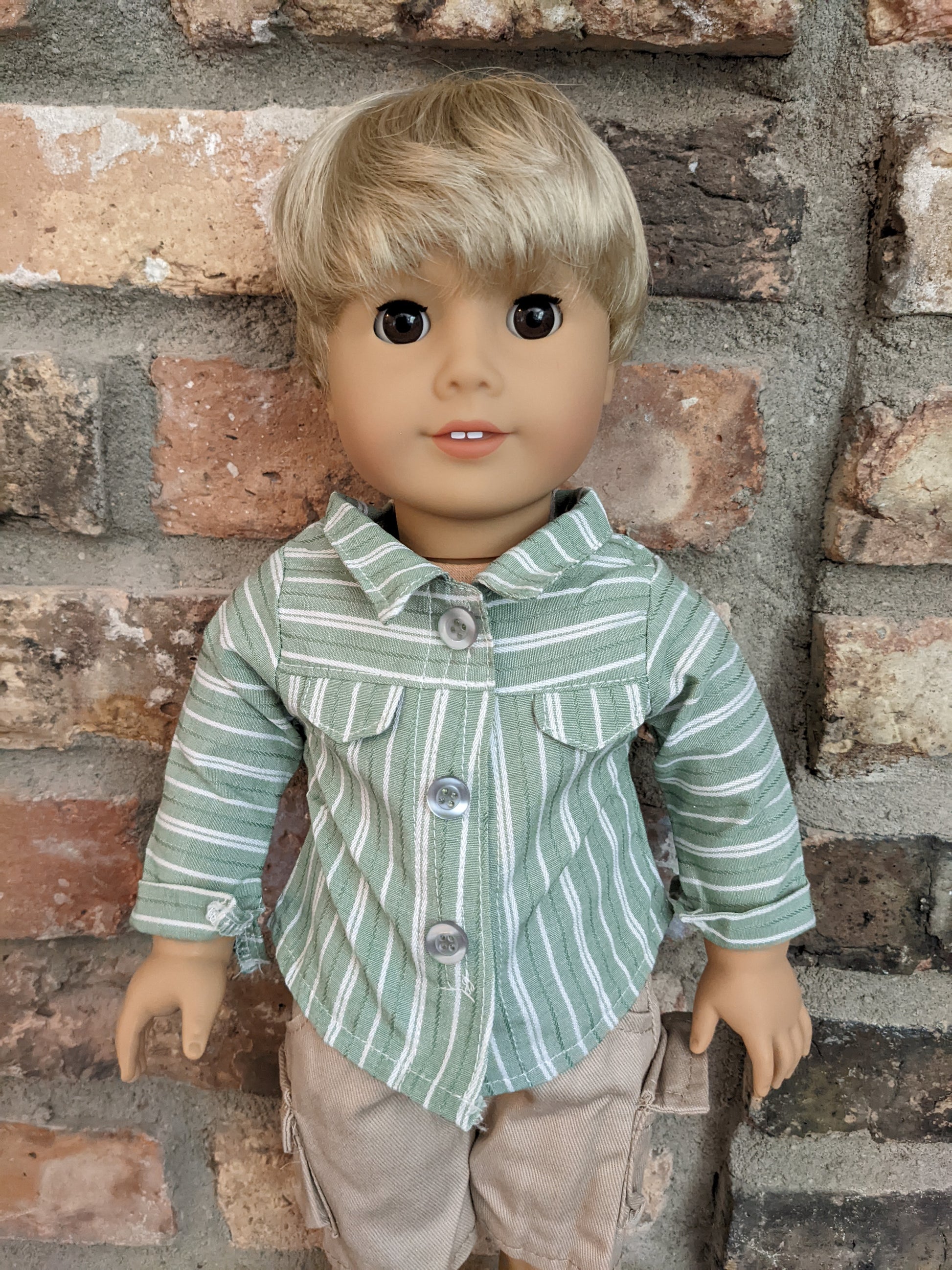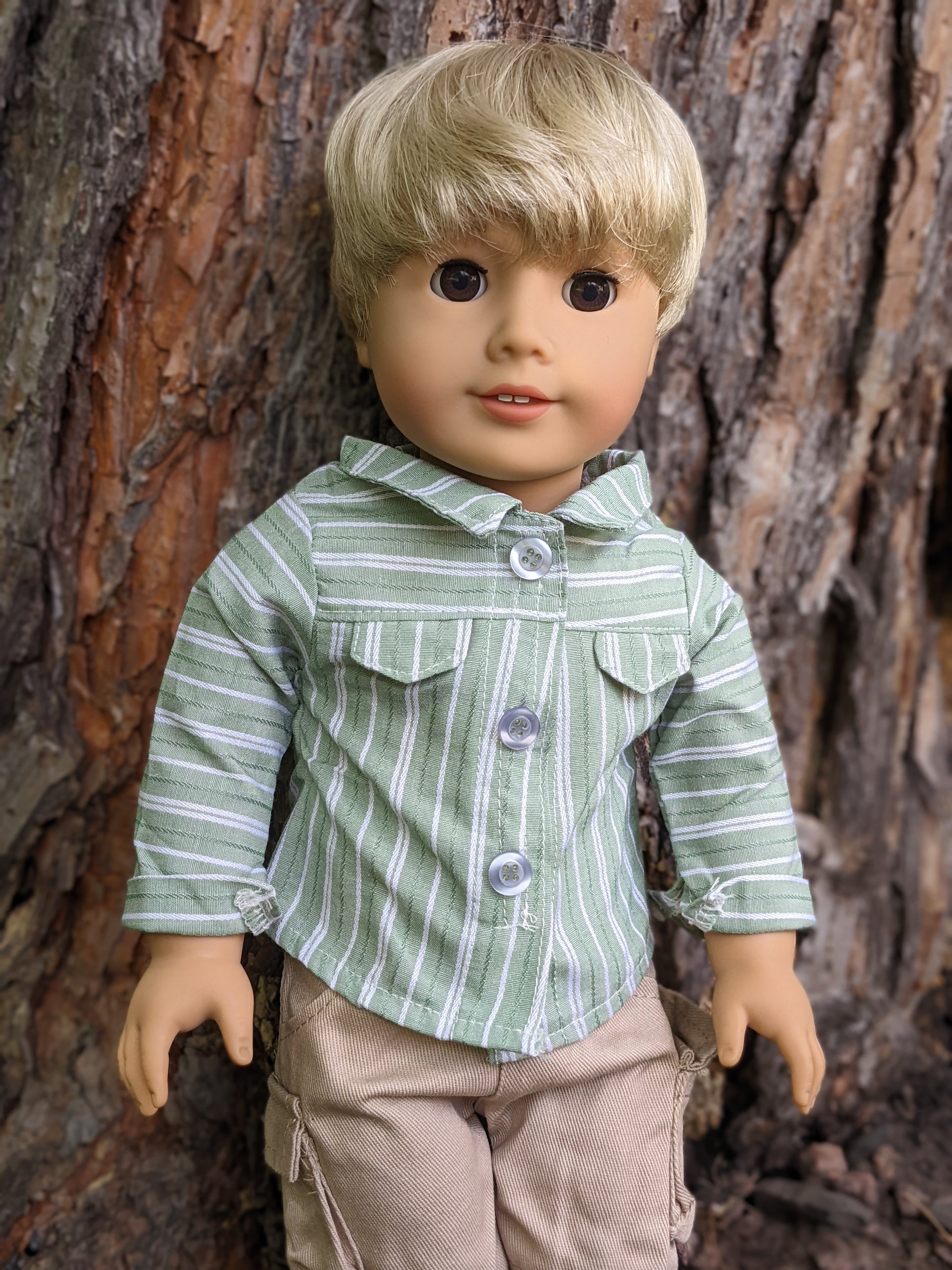 This one of a kind OOAK custom American Girl doll was created with a brand new Truly Me doll, a blonde wig, and brown eyes. He may have some minor shine marks from handling. He comes with the outfit pictured.