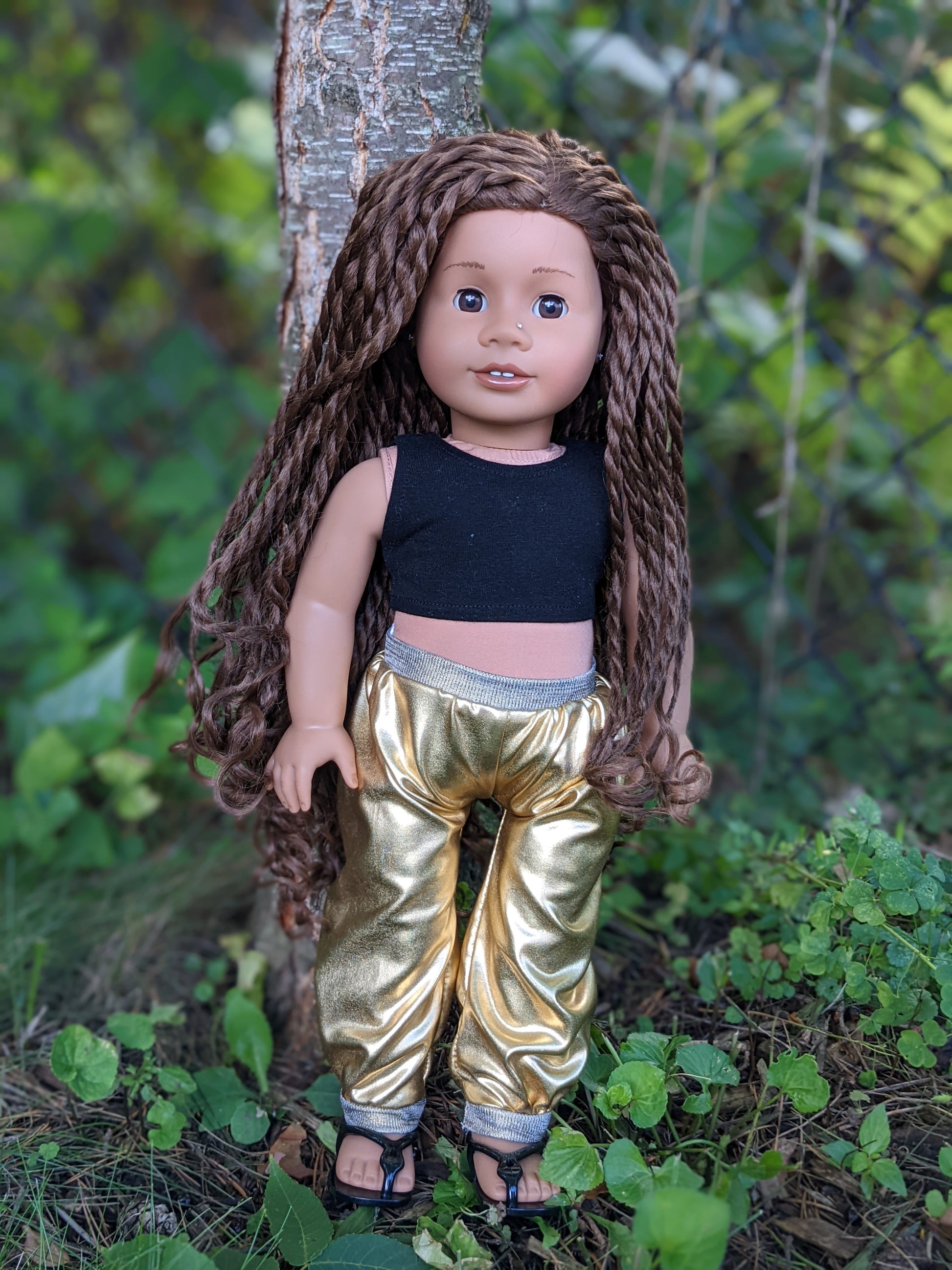 This one of a kind OOAK custom American Girl doll was created with a brand new Truly Me doll, a brown twisted wig, and brown eyes. She has lip gloss that was hand painted and sealed. She may have some minor shine marks from handling. She comes with the outfit pictured. She has a microfiber cloth body and permapanties with a tiny x on her bum. Her ears are double pierced with normal earrings and the tiny diamond look studs are included. Her nose is also pierced.