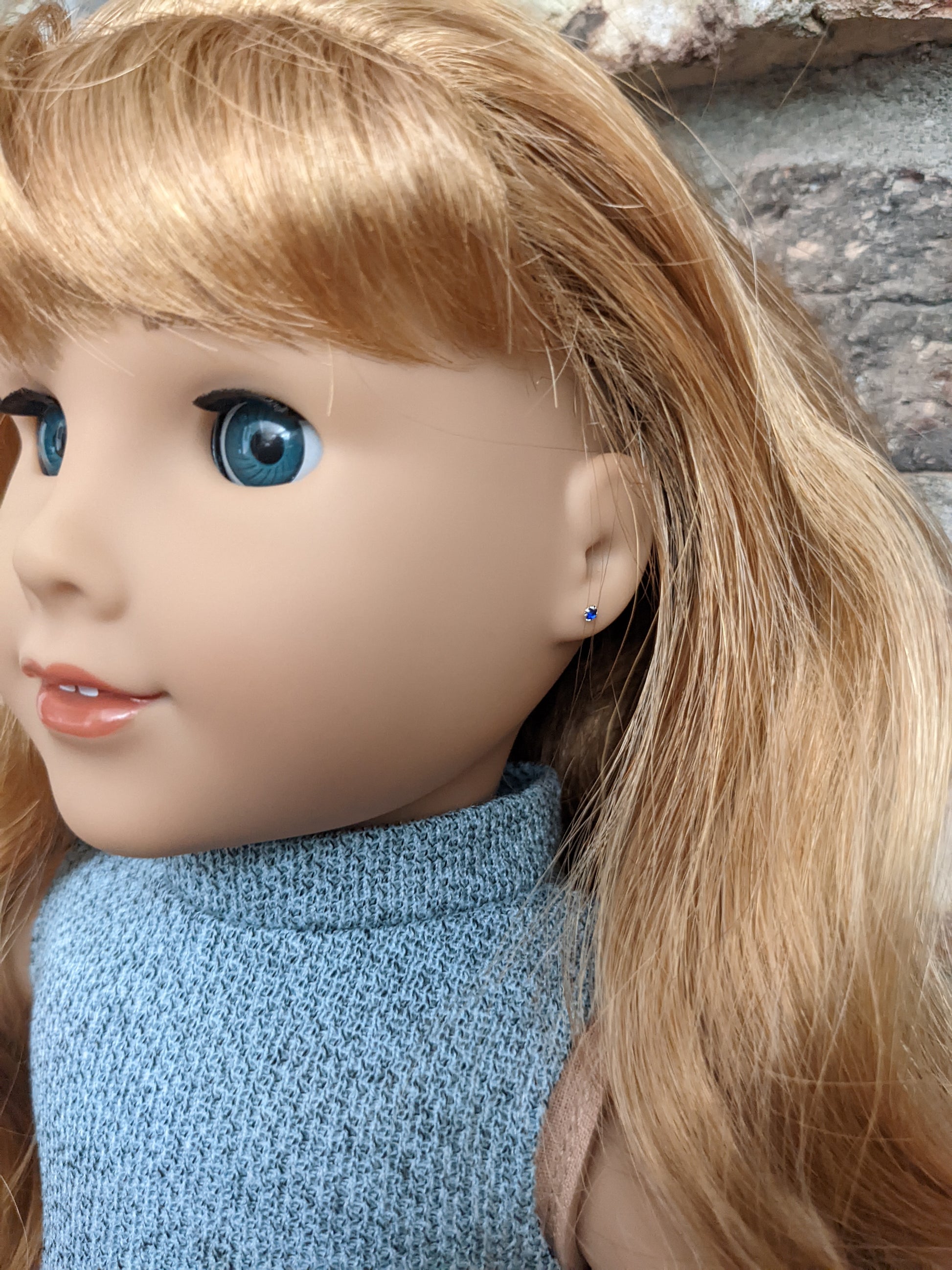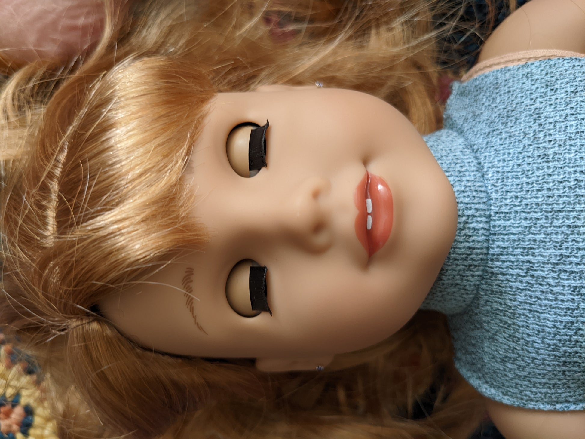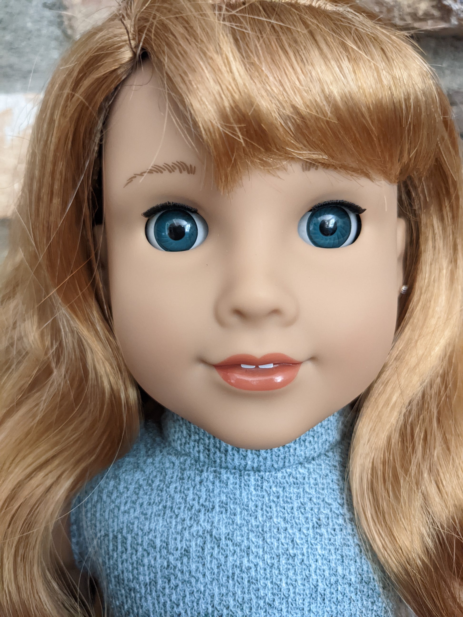 This one of a kind OOAK custom American Girl doll was created with a brand new Joss doll, a light red wig from a new Maryellen doll, and blue eyes. She has lip gloss that was hand painted and sealed. Her ears are pierced with normal earrings and the tiny diamond look studs are included. She may have some minor shine marks from handling. She comes with the outfit pictured.