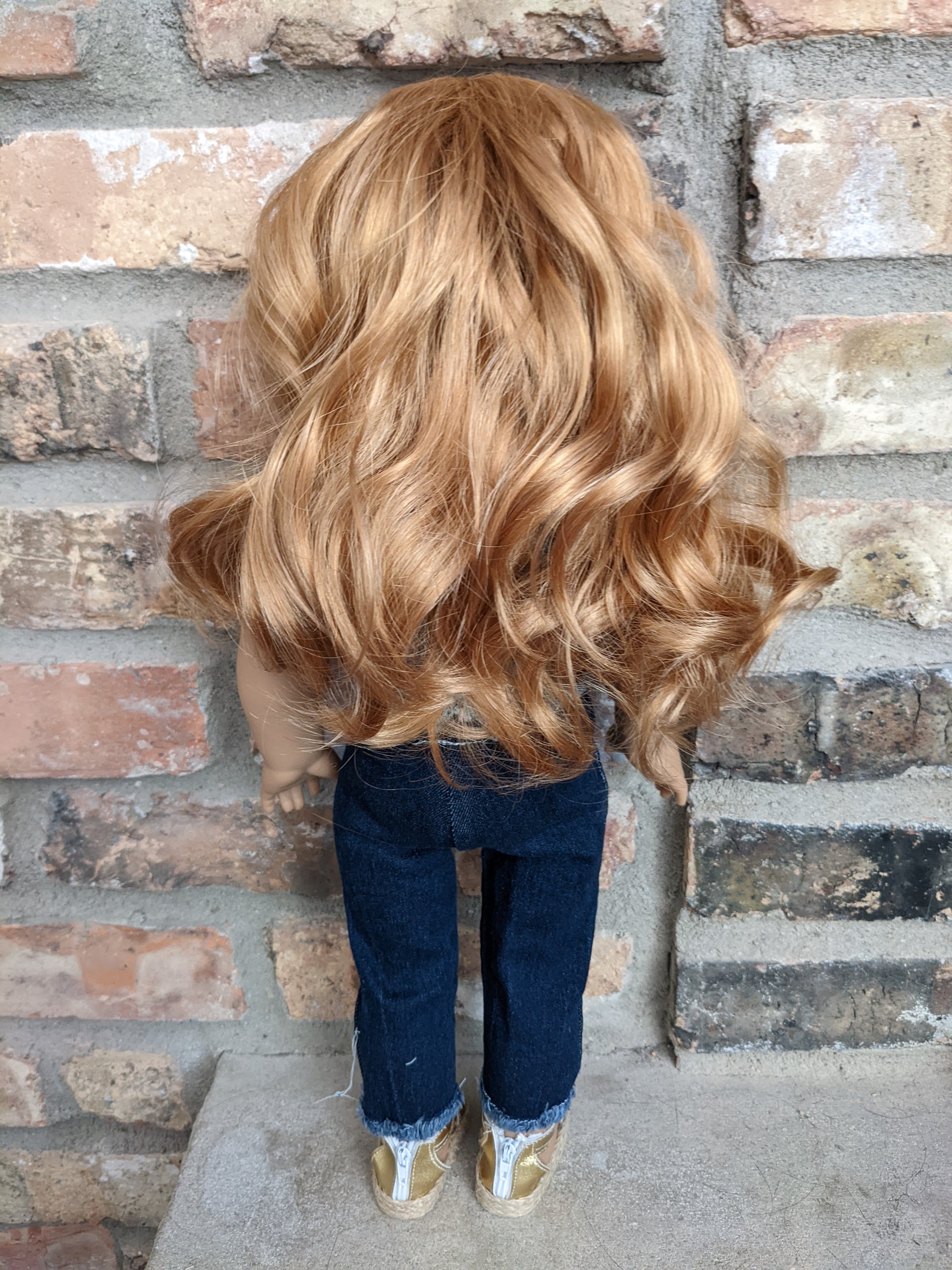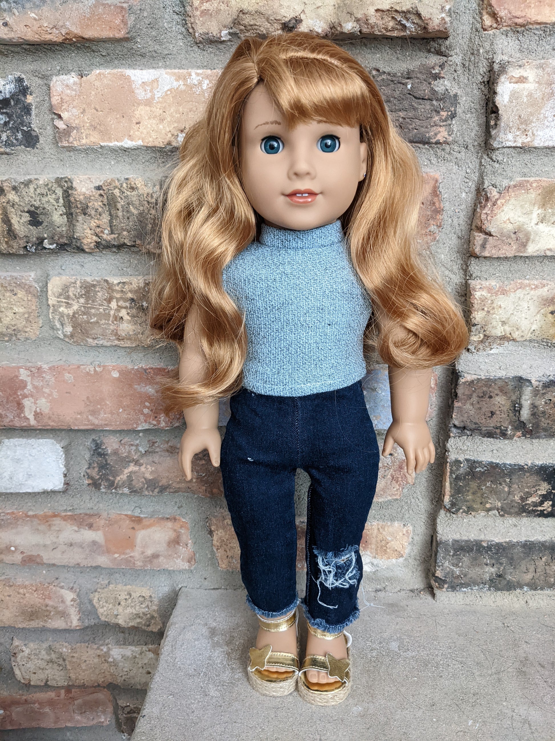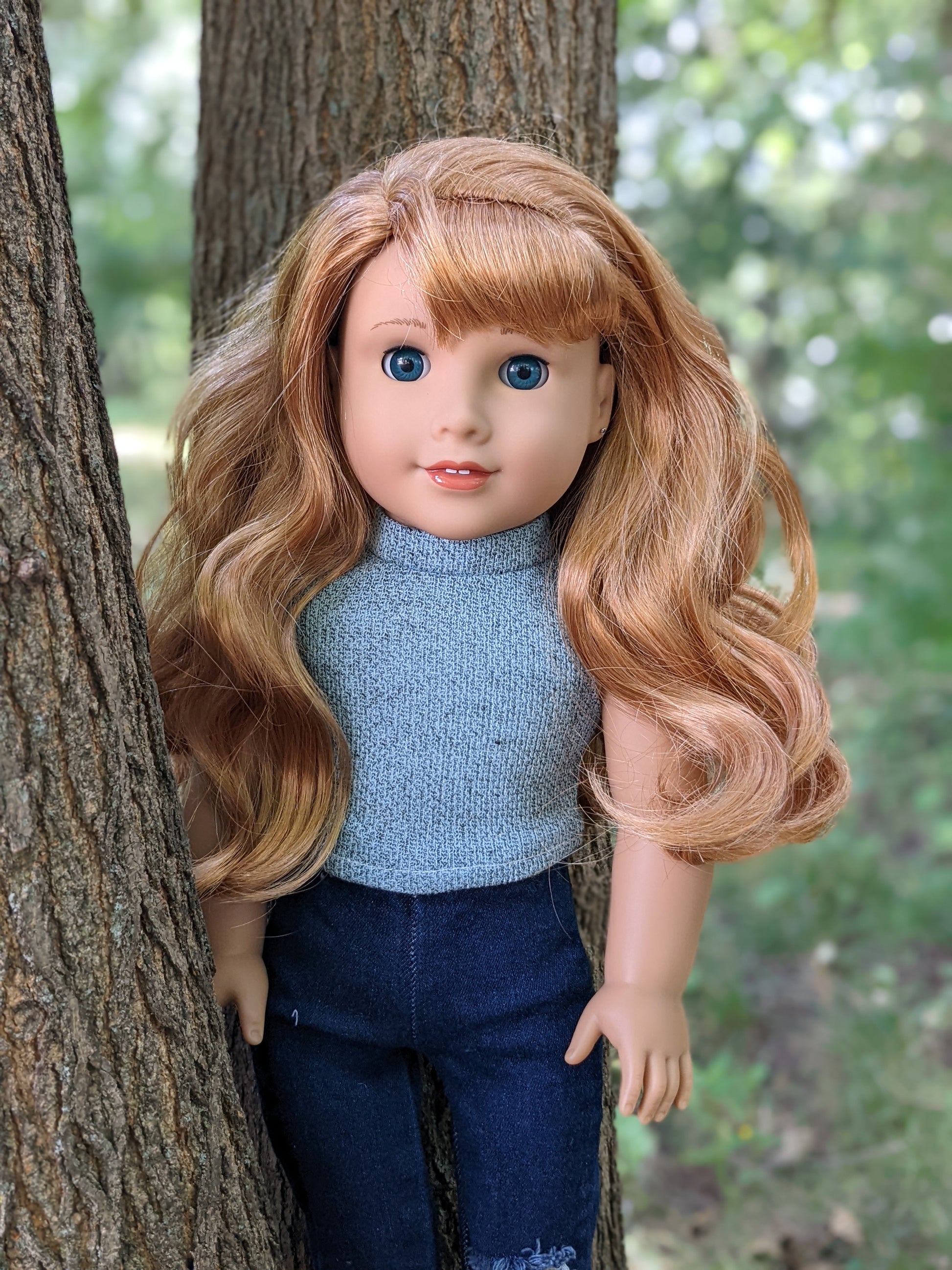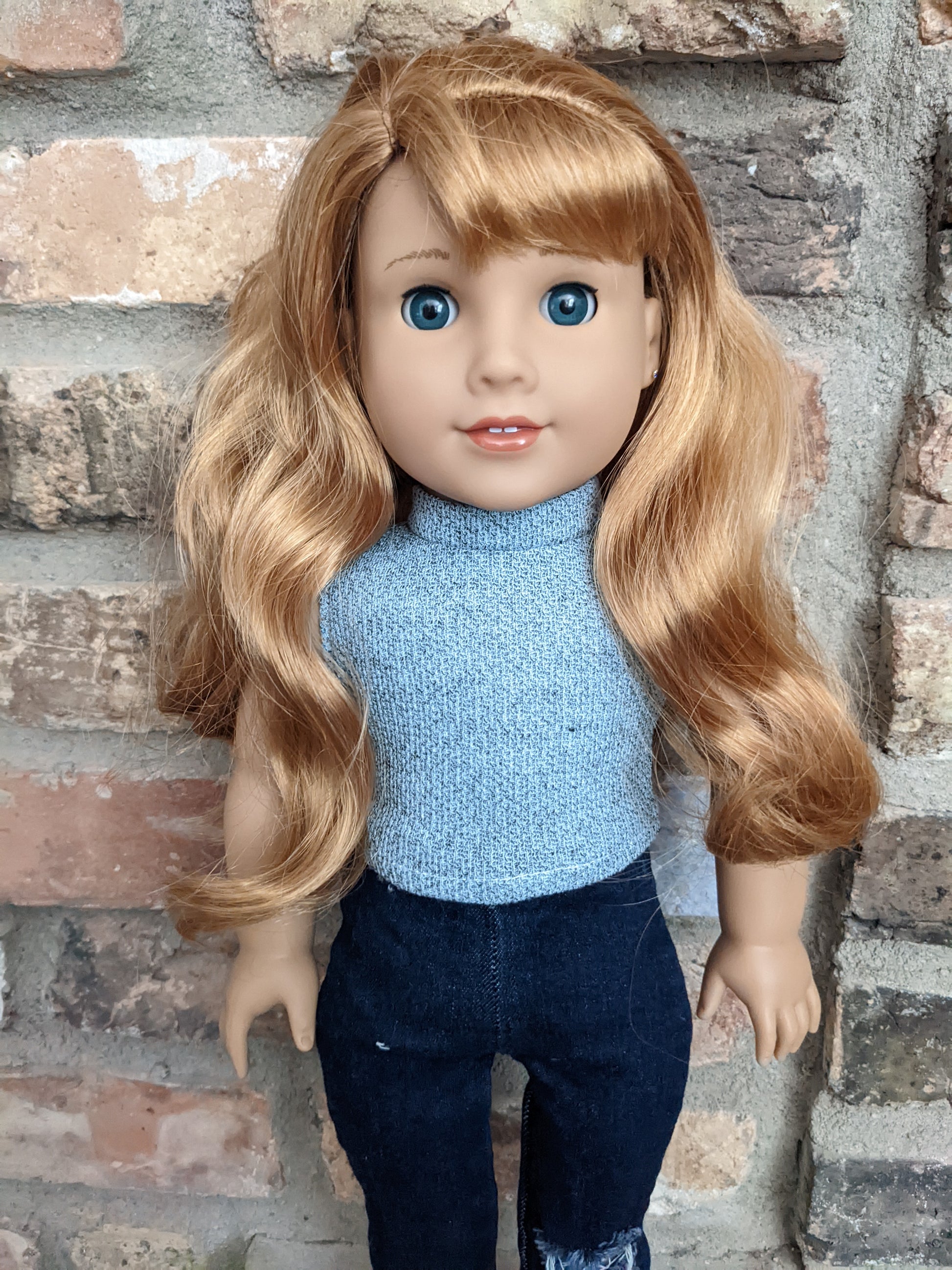This one of a kind OOAK custom American Girl doll was created with a brand new Joss doll, a light red wig from a new Maryellen doll, and blue eyes. She has lip gloss that was hand painted and sealed. Her ears are pierced with normal earrings and the tiny diamond look studs are included. She may have some minor shine marks from handling. She comes with the outfit pictured.