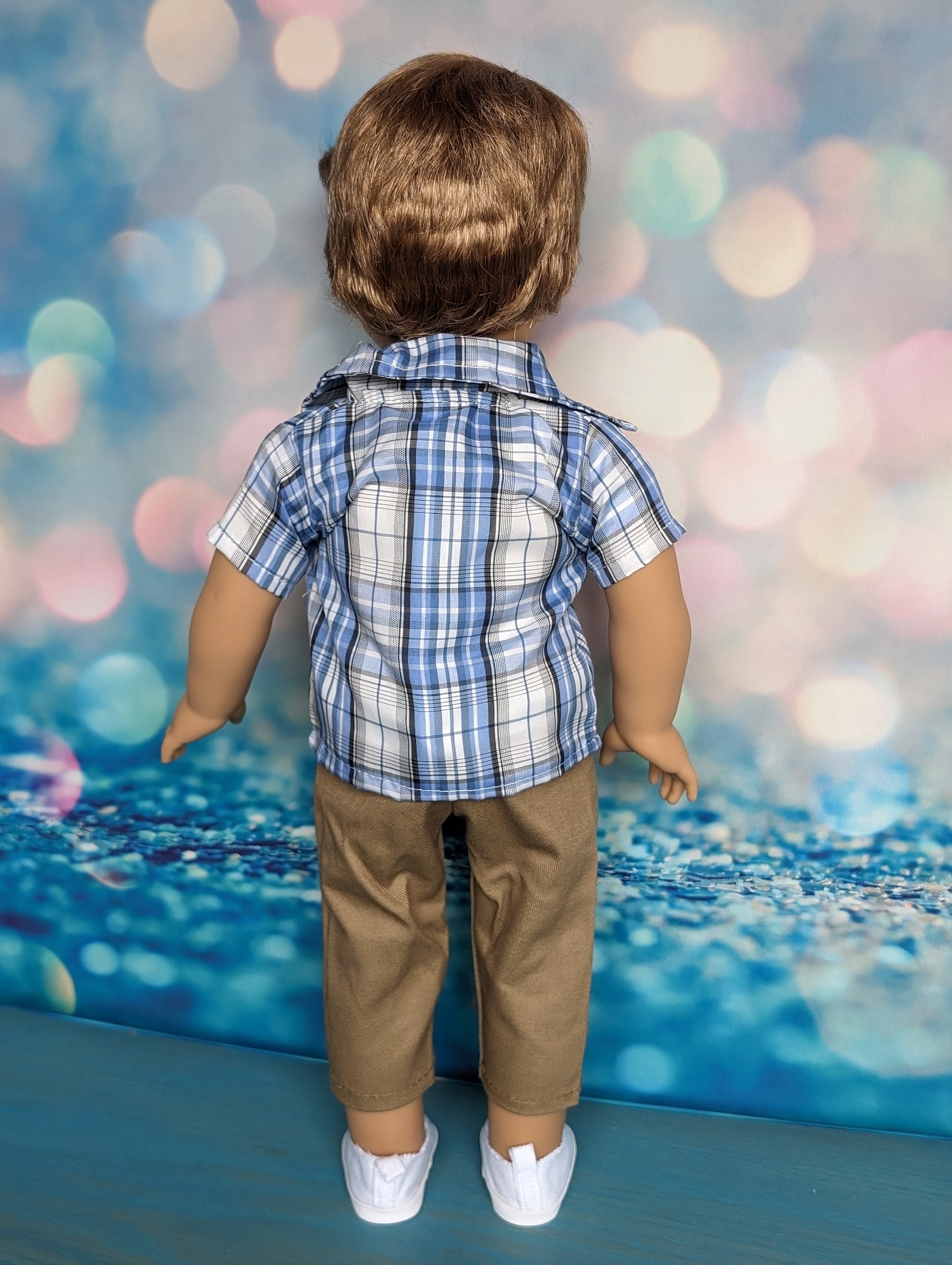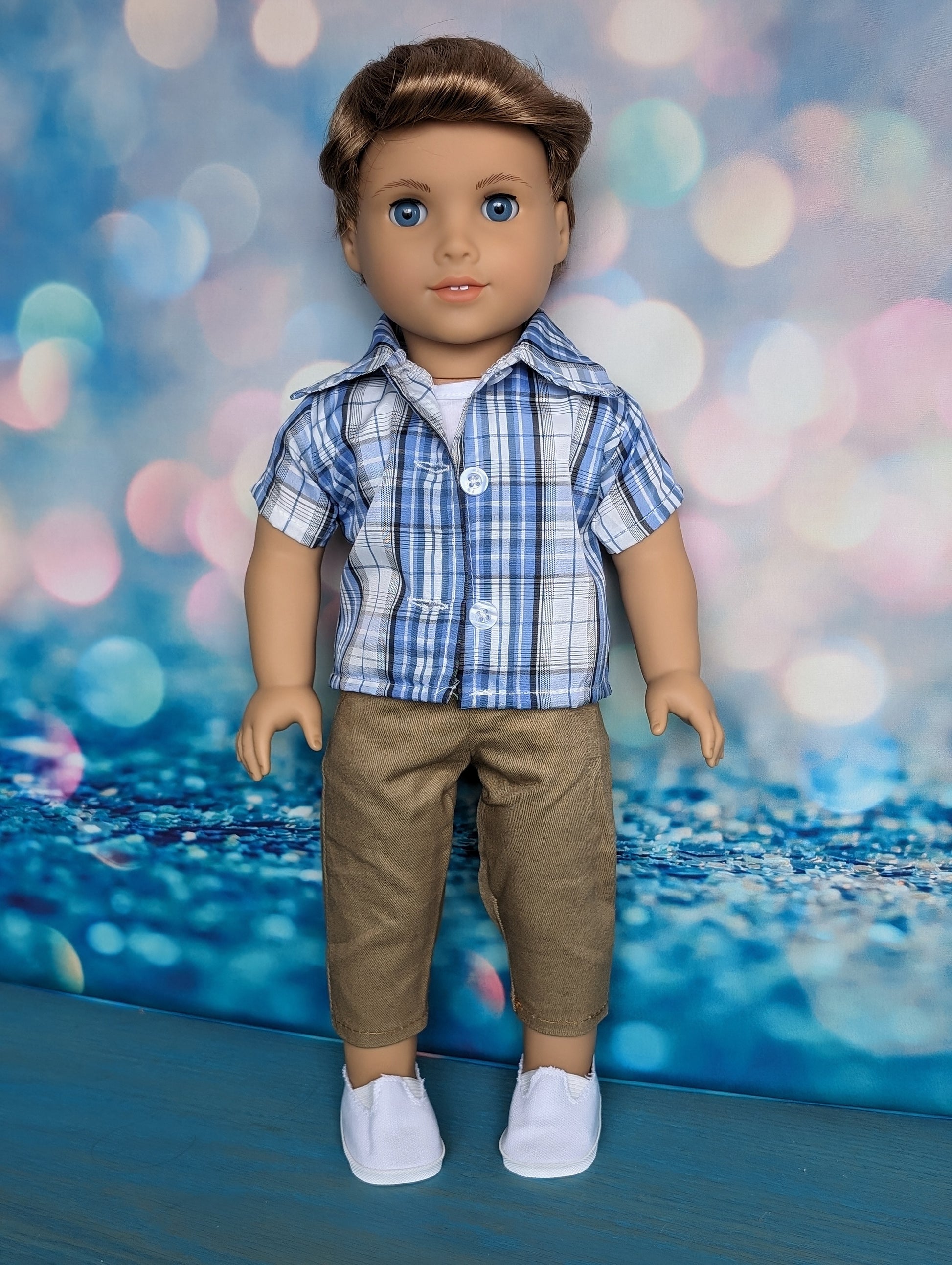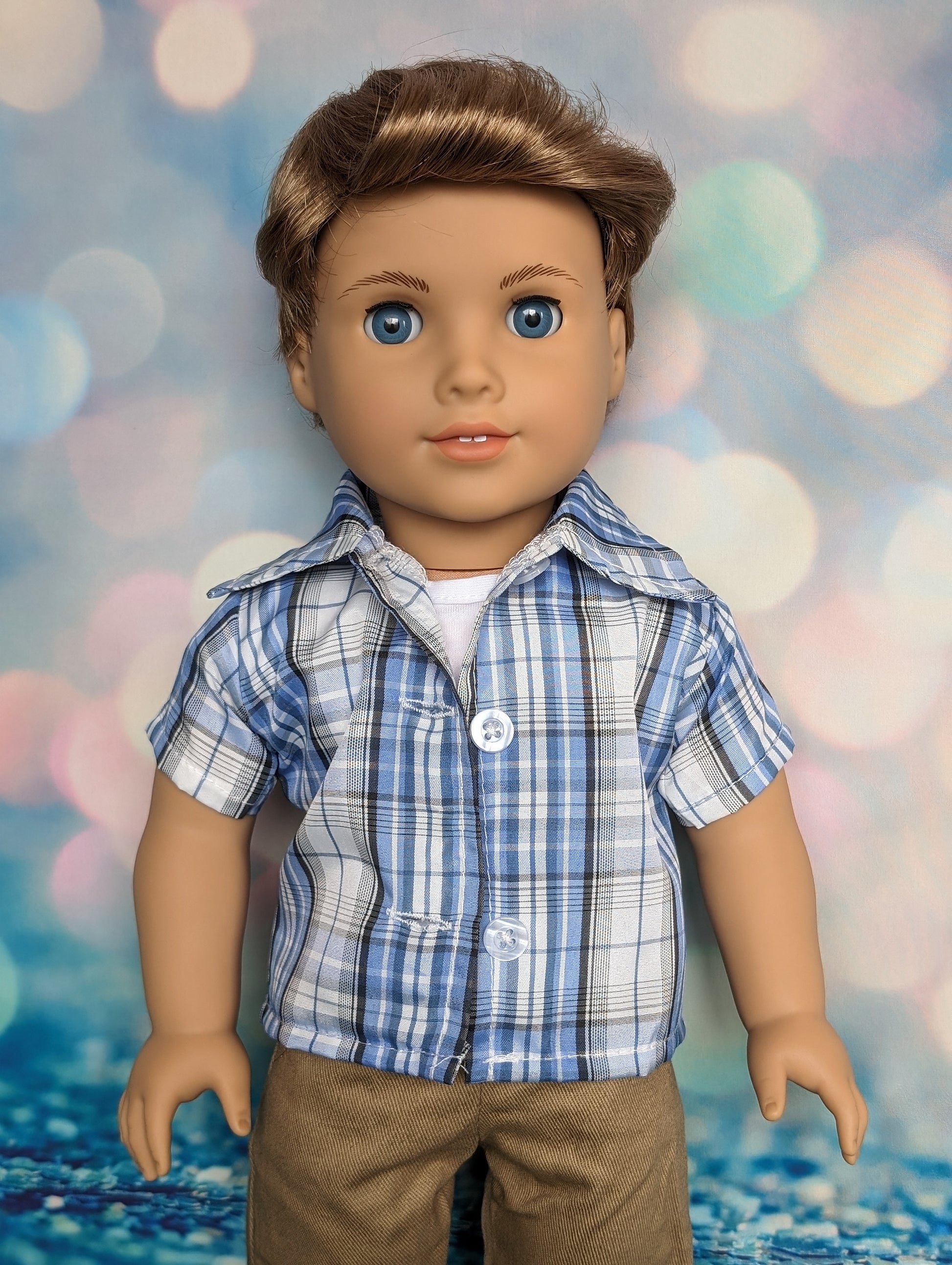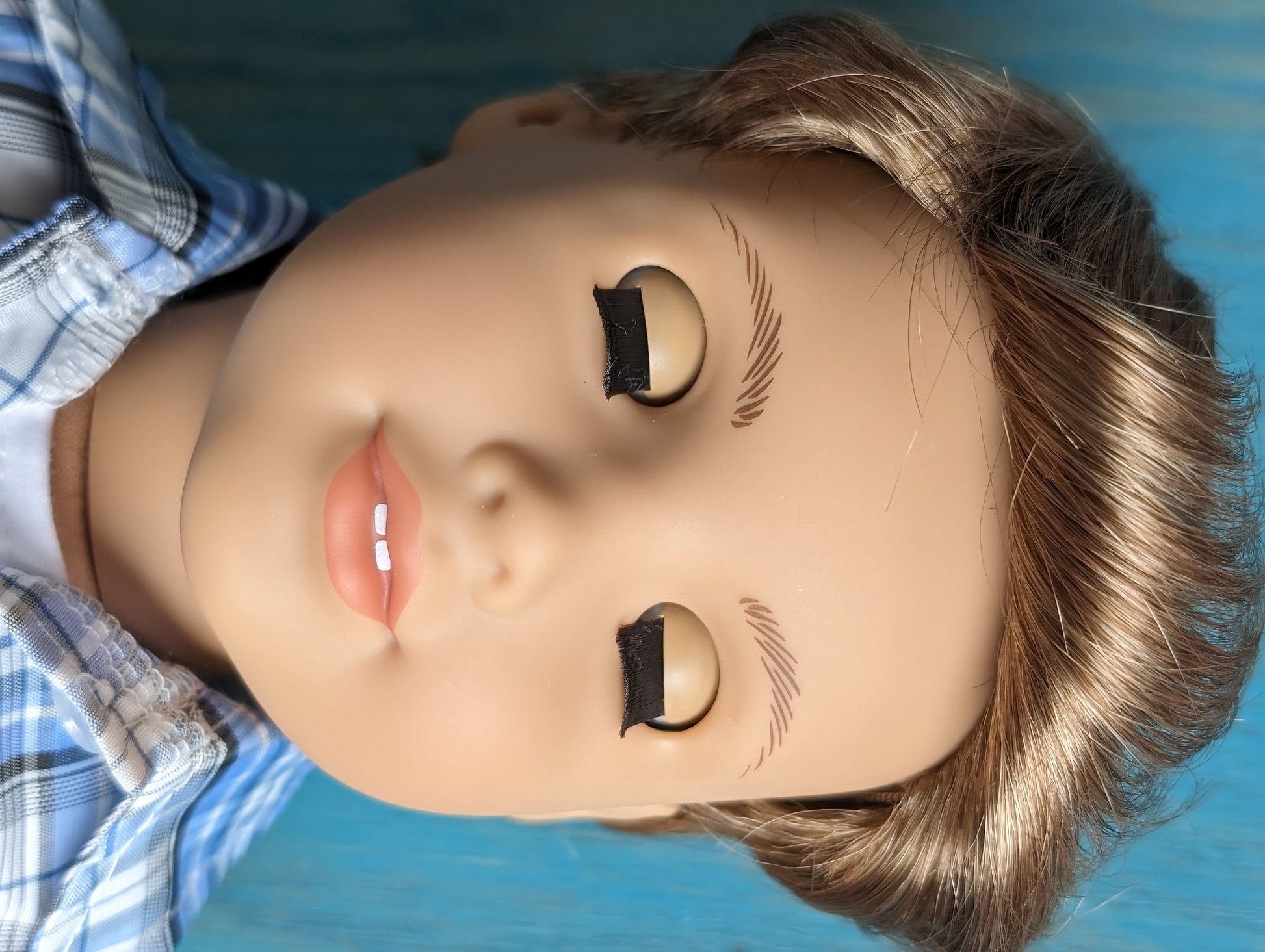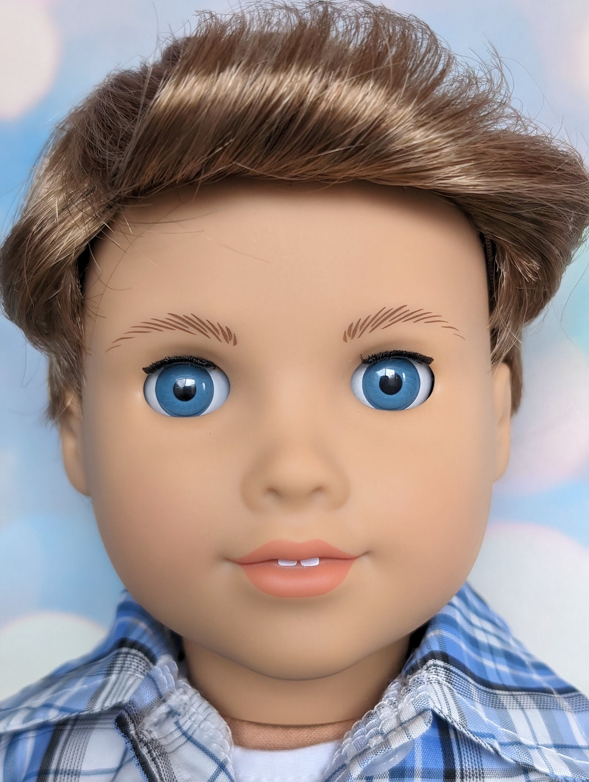 This one of a kind OOAK custom boy American Girl doll was created with a brand new doll, a blonde wig, and light blue eyes. He may have some minor shine marks from handling. He comes with the outfit pictured.