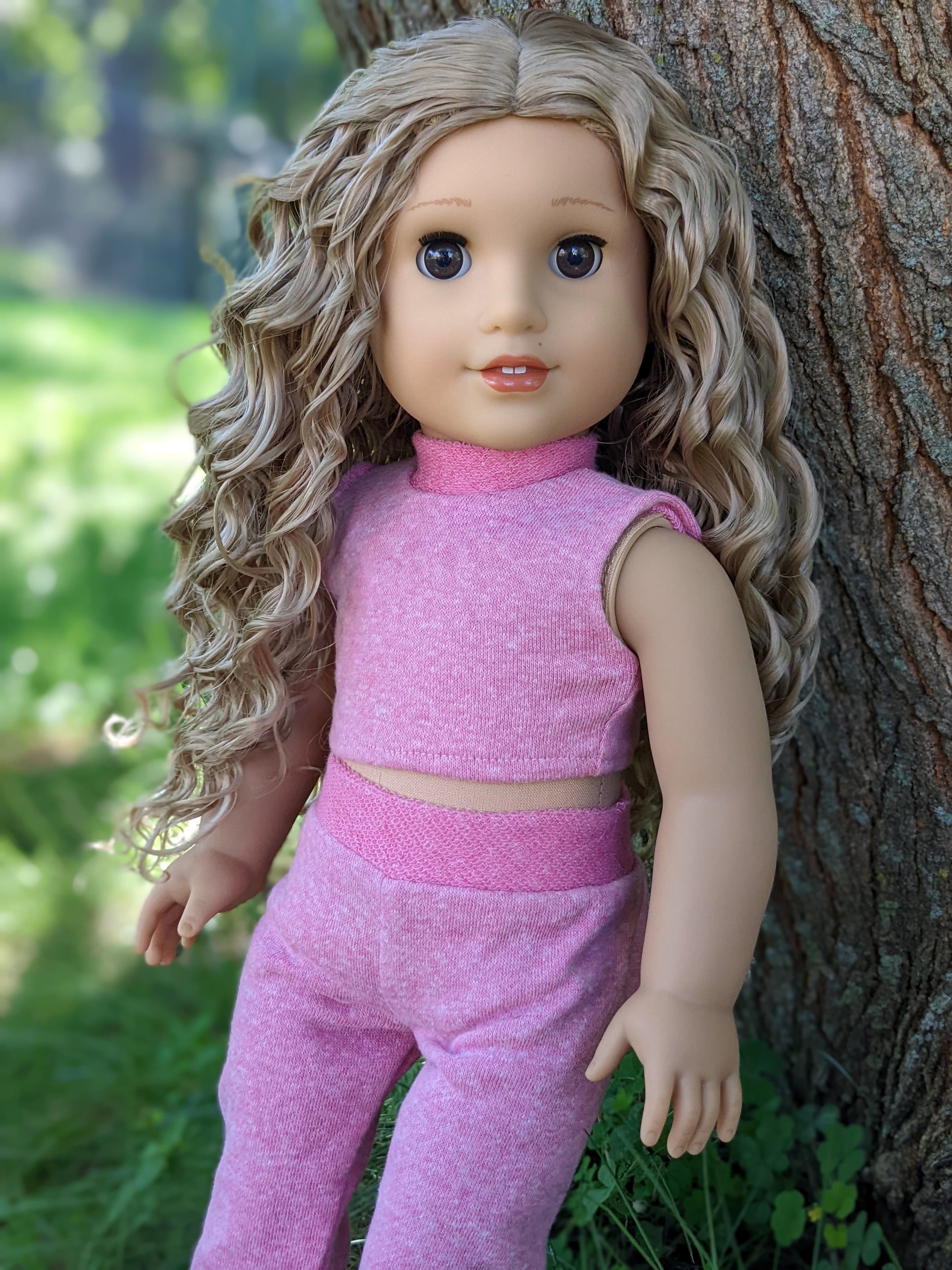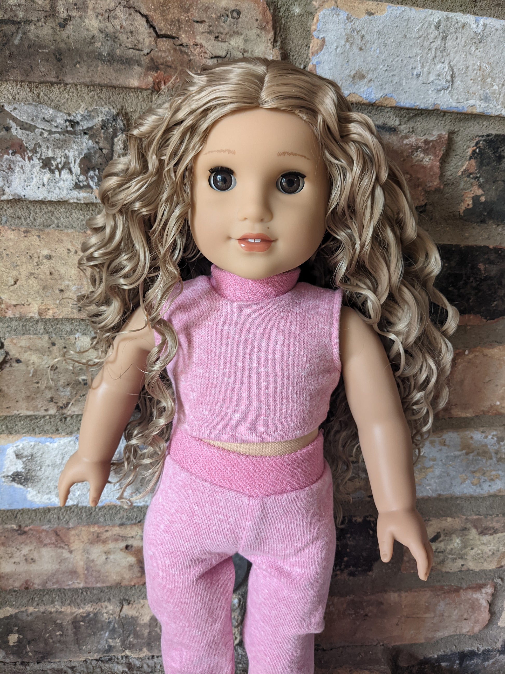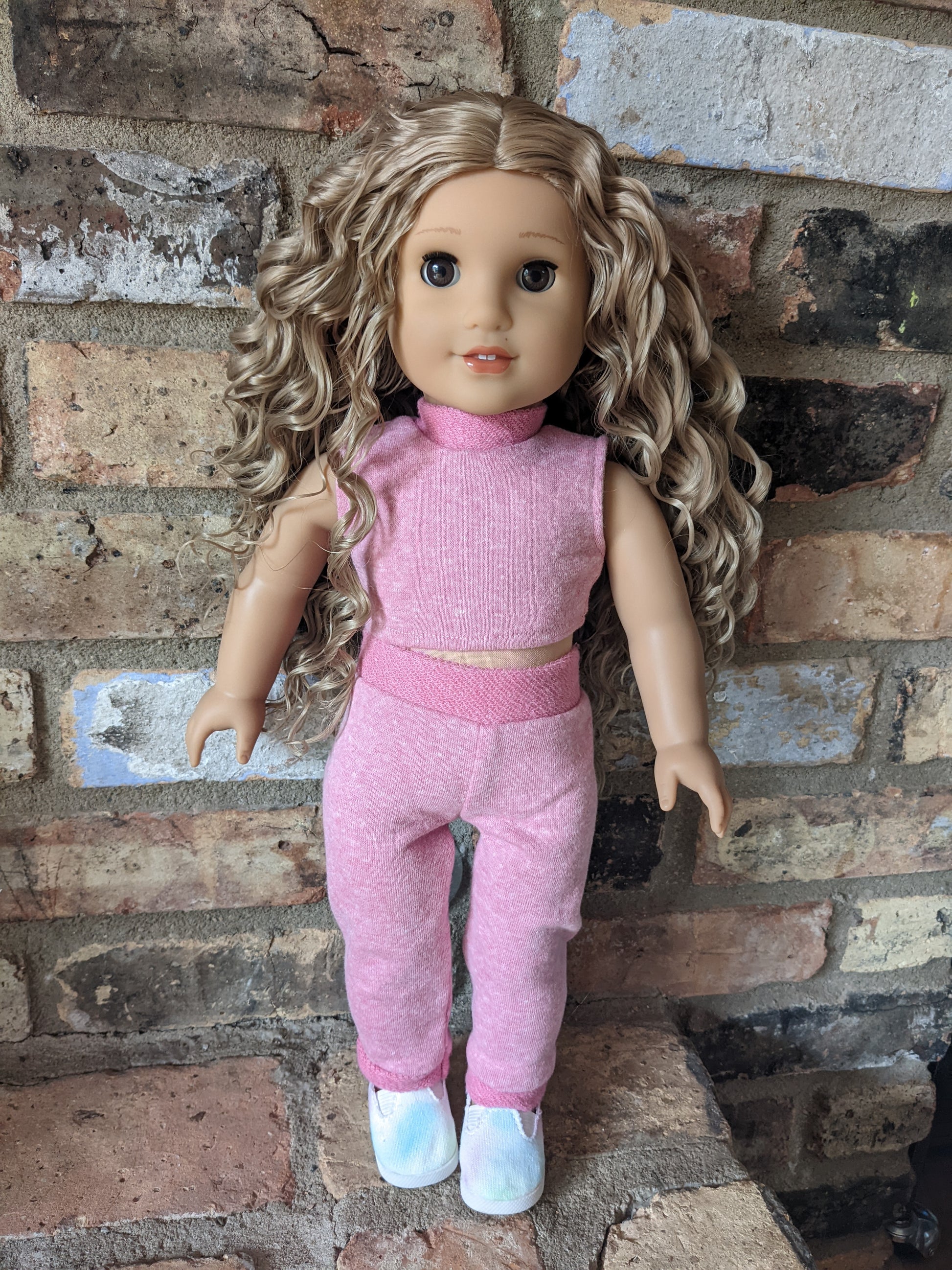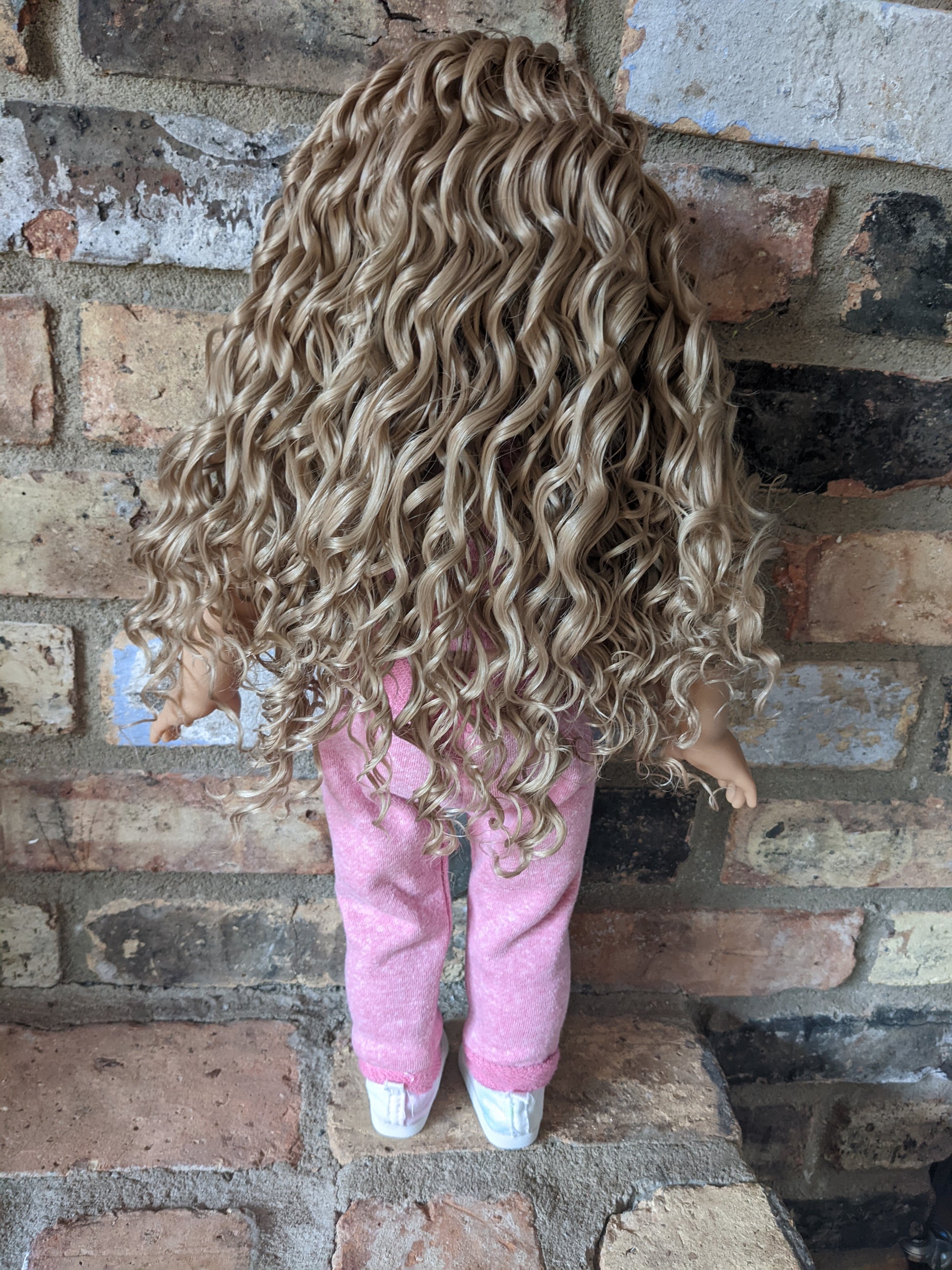 This one of a kind OOAK custom American Girl doll was created with a brand new Kira doll, a blonde curly wig, and brown eyes. She has lip gloss and a beauty mark above her lip that was hand painted and sealed. She may have some minor shine marks from handling. She comes with the outfit pictured.
