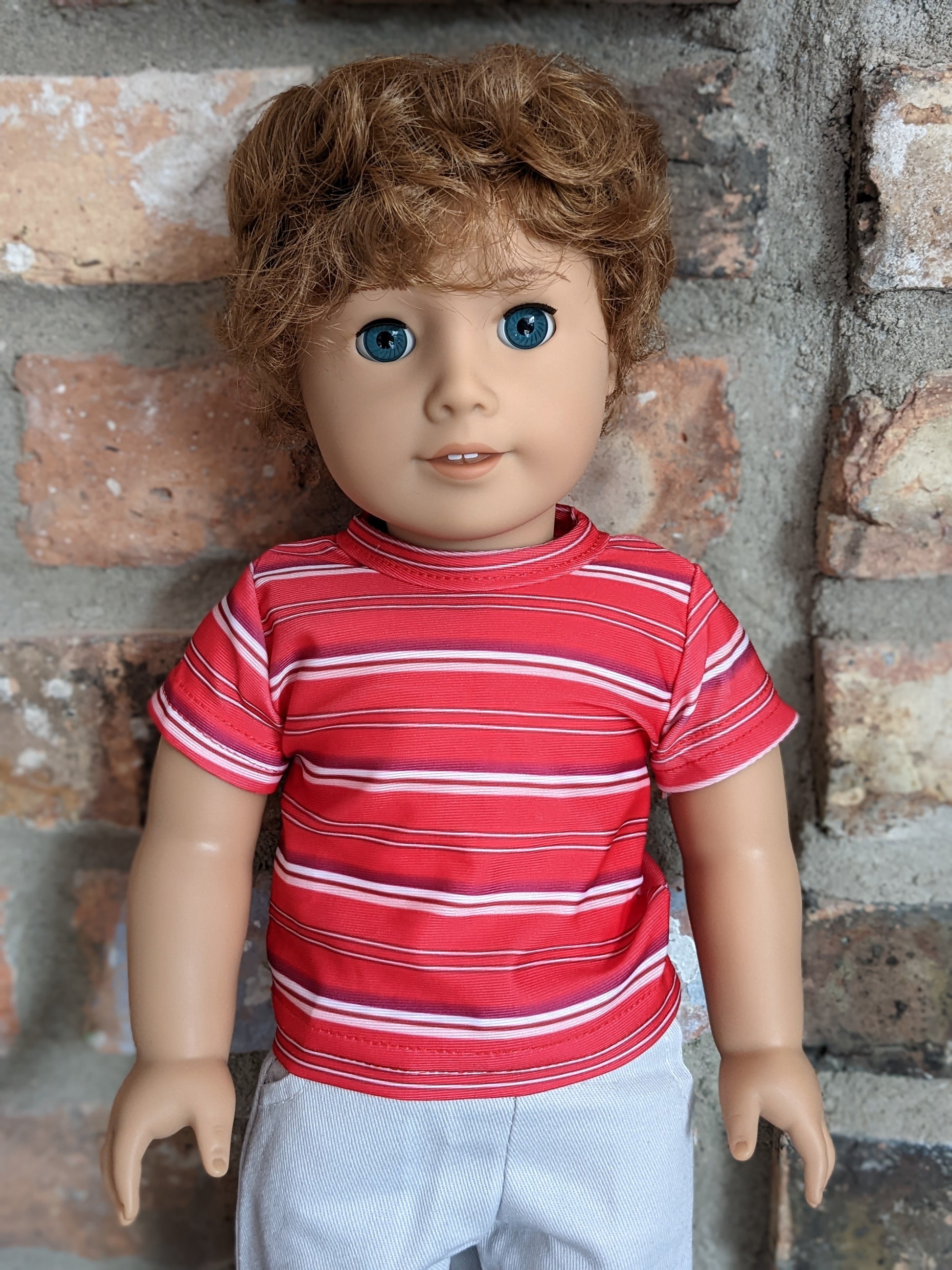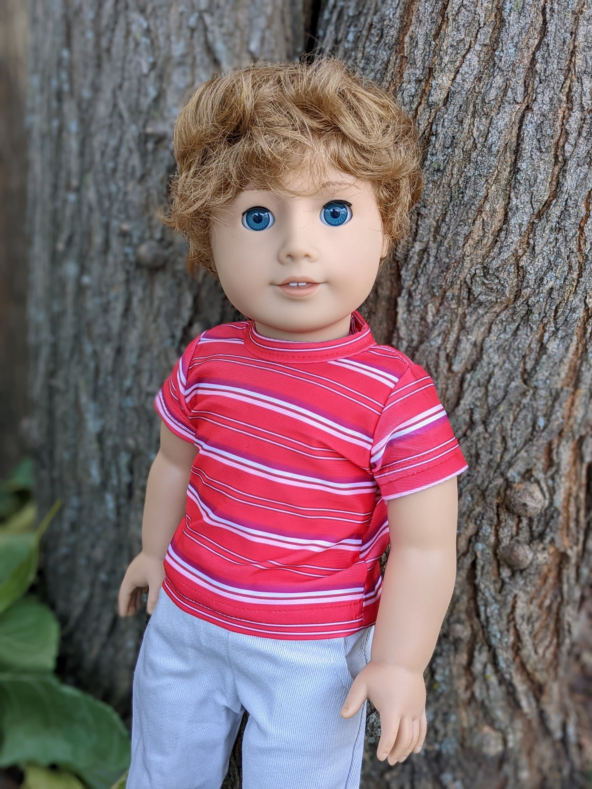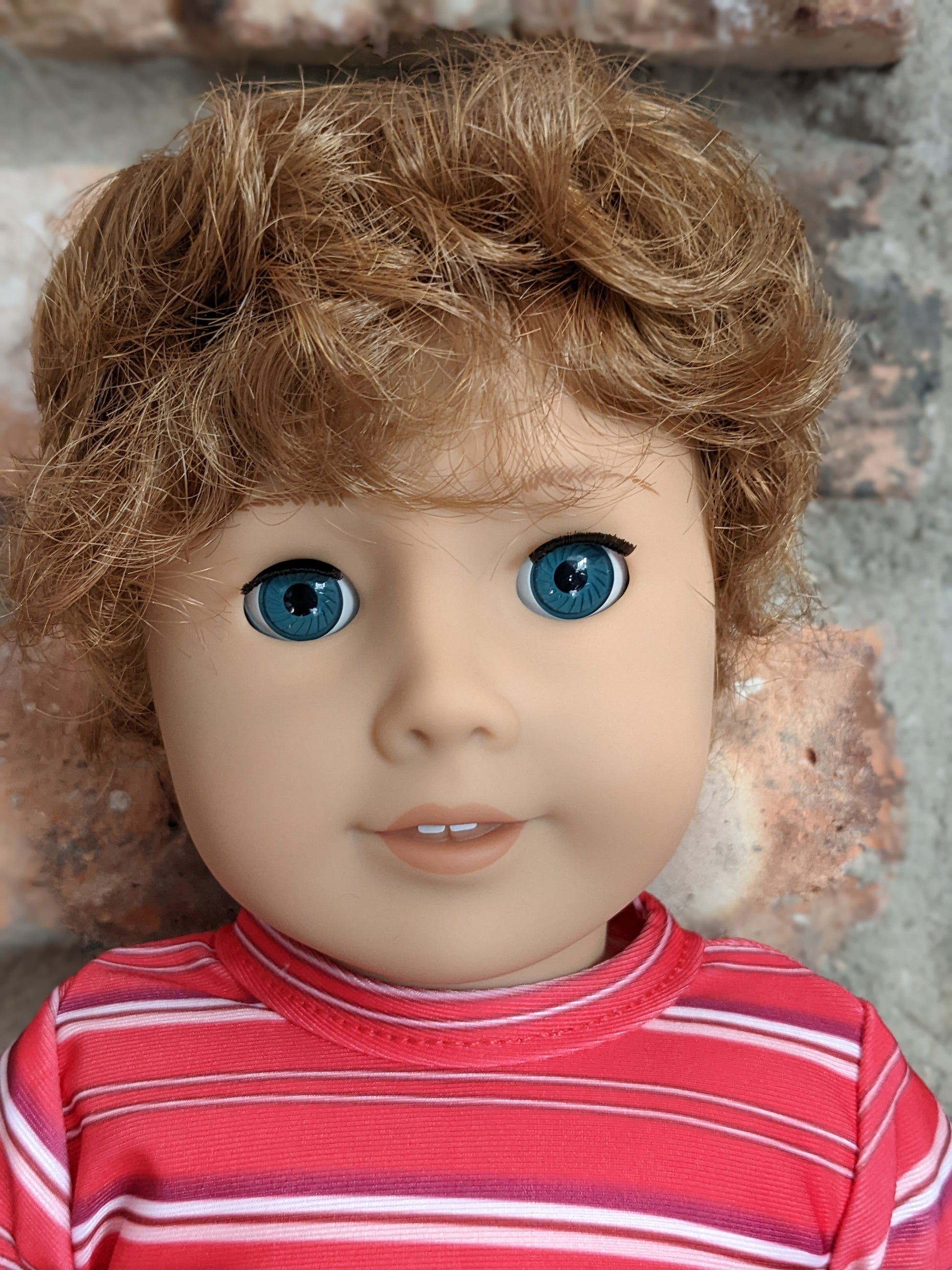 This one of a kind OOAK custom American Girl doll was created with a brand new doll, a strawberry blonde wig, and blue eyes. He may have some minor shine marks from handling. He comes with the outfit pictured.