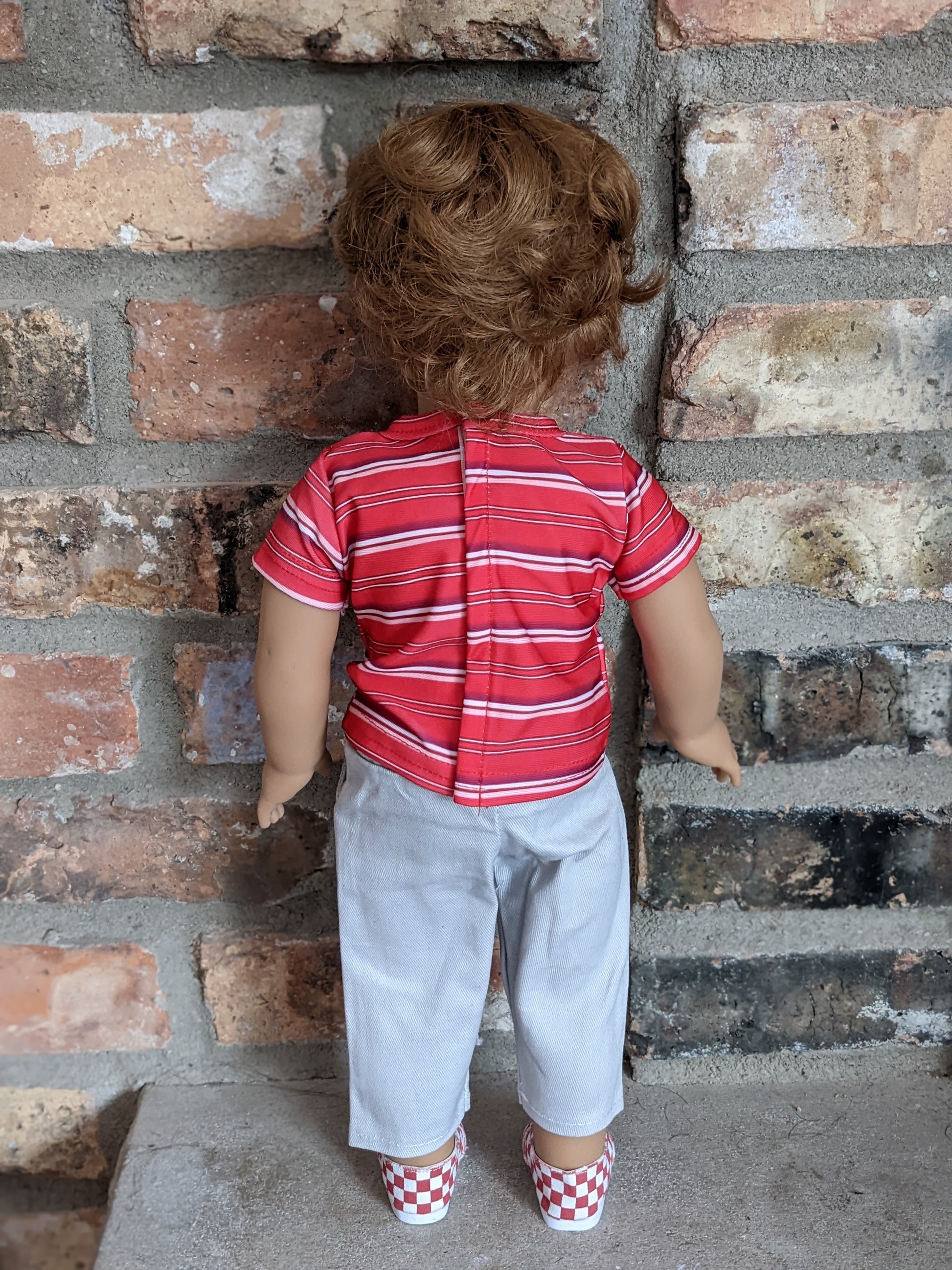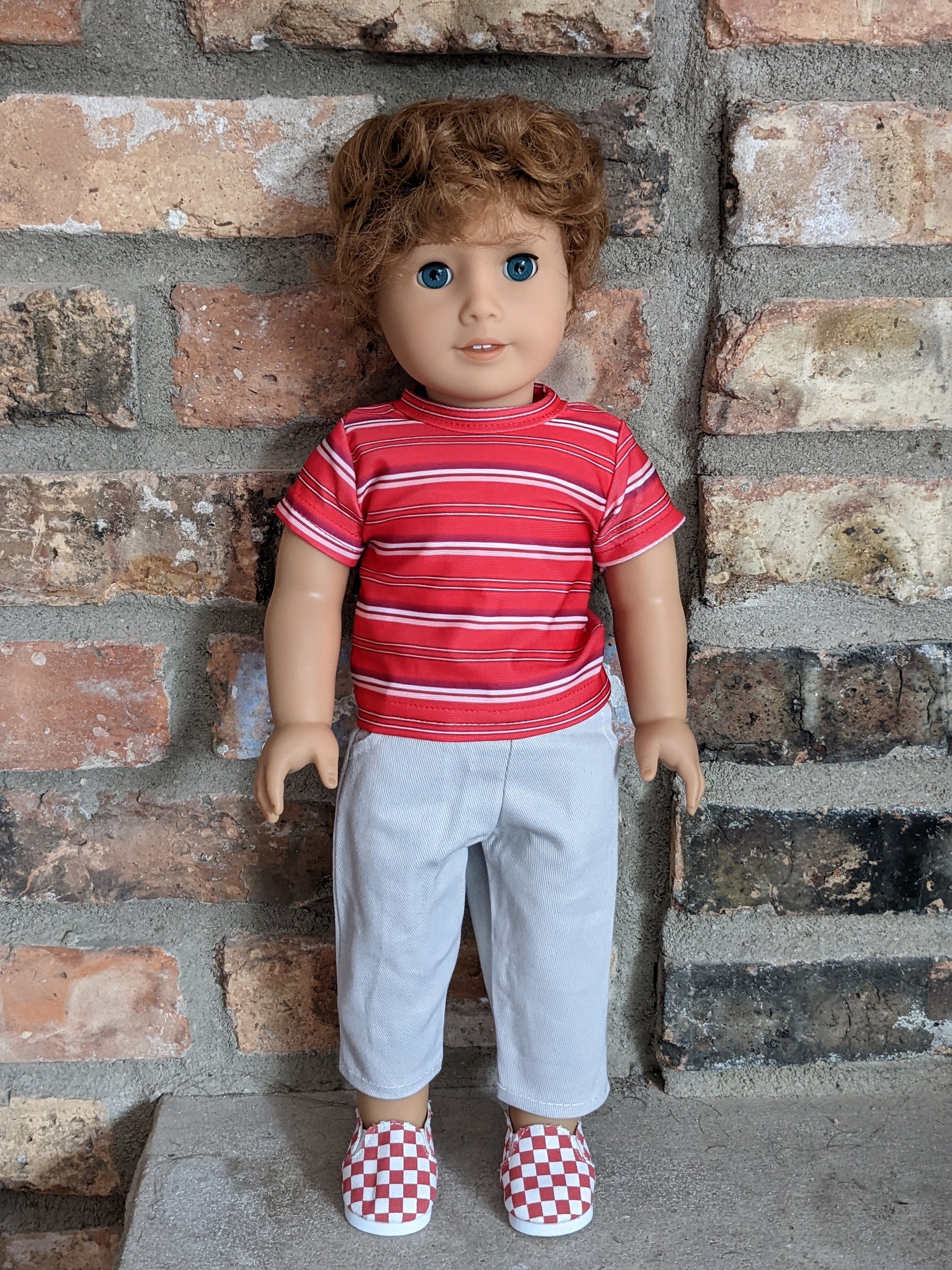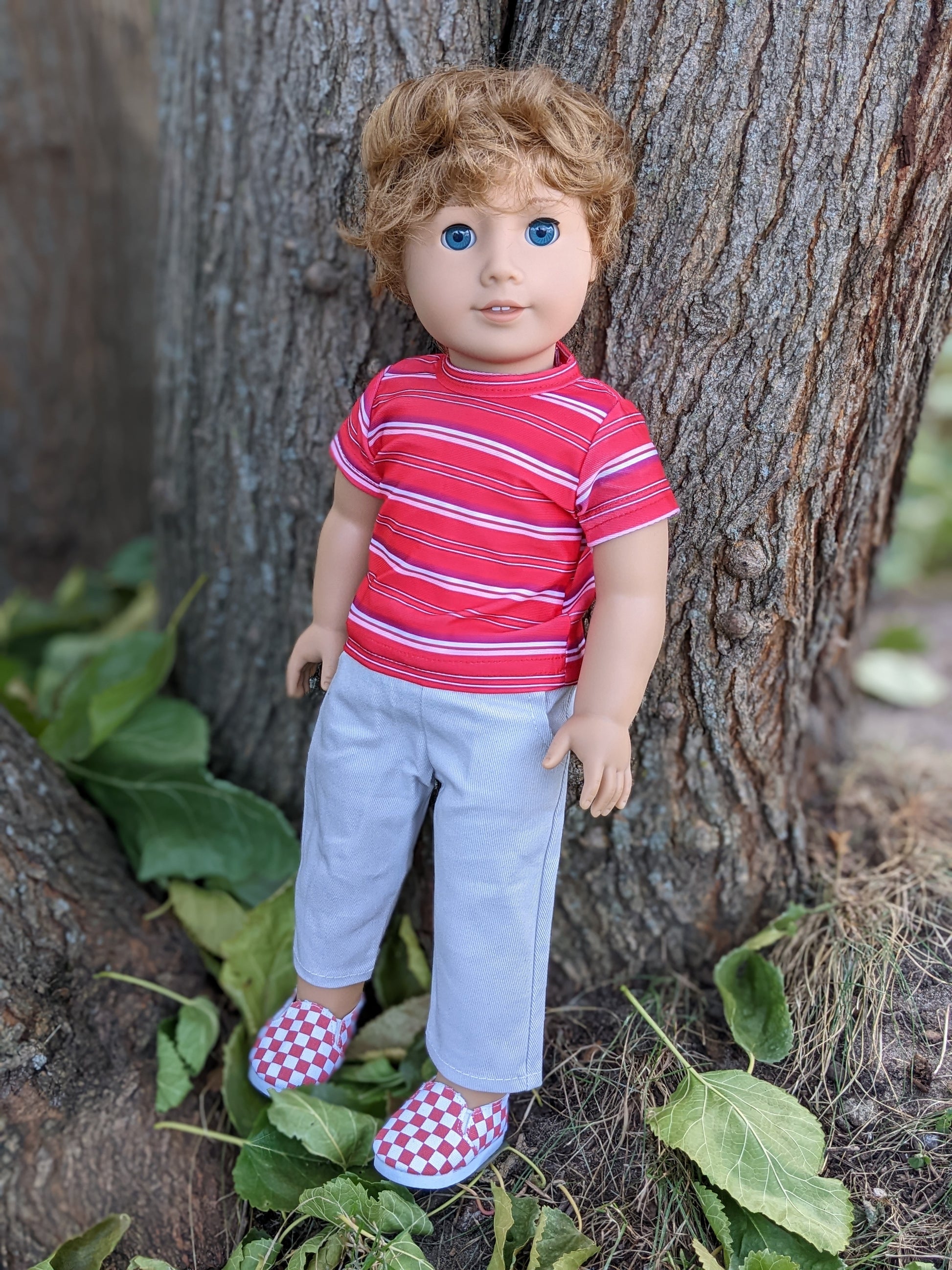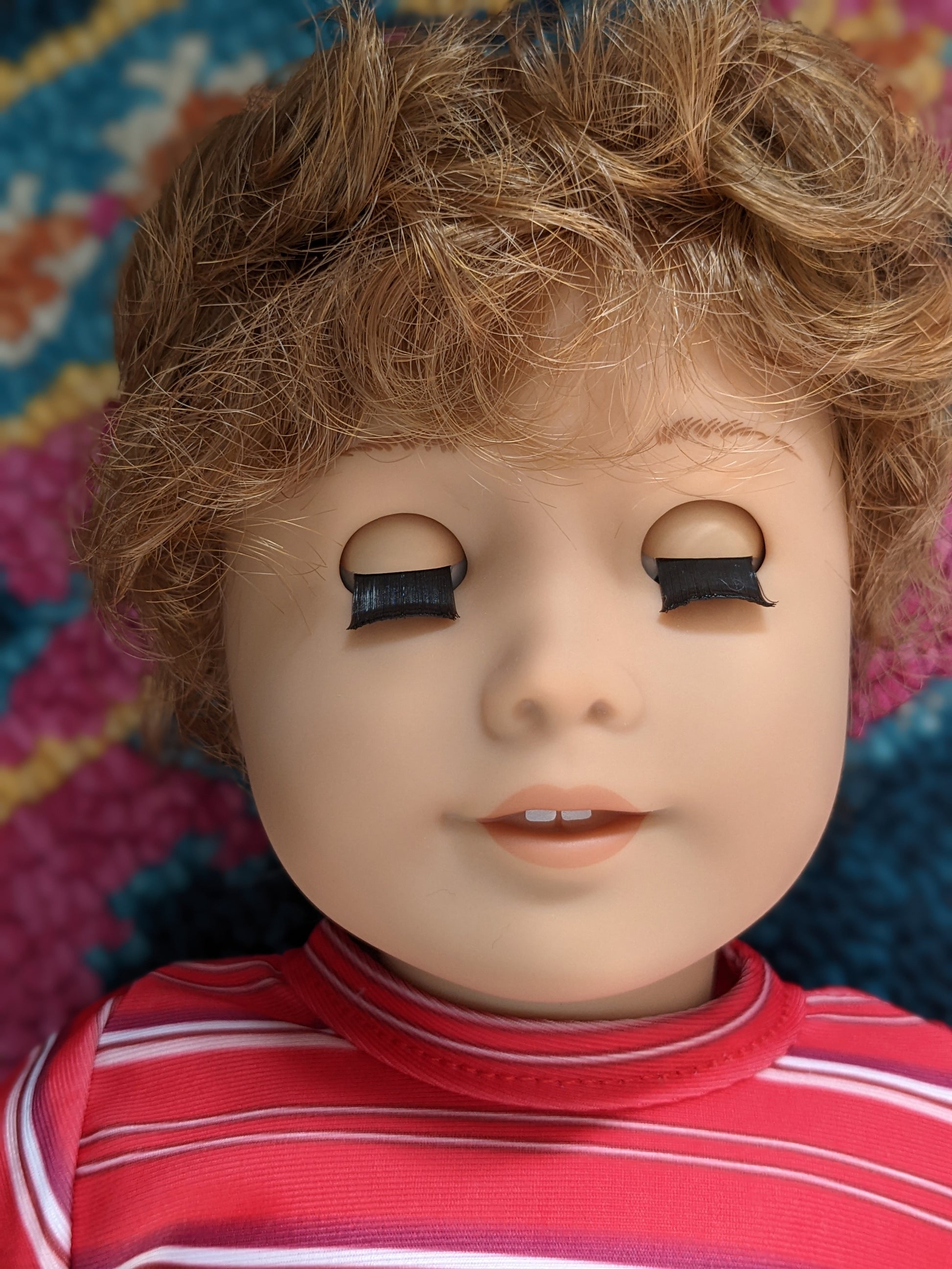 This one of a kind OOAK custom American Girl doll was created with a brand new doll, a strawberry blonde wig, and blue eyes. He may have some minor shine marks from handling. He comes with the outfit pictured.