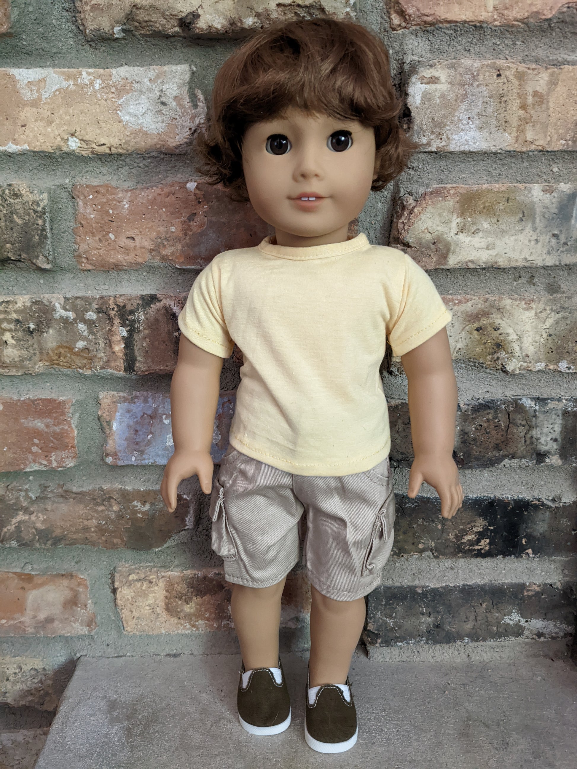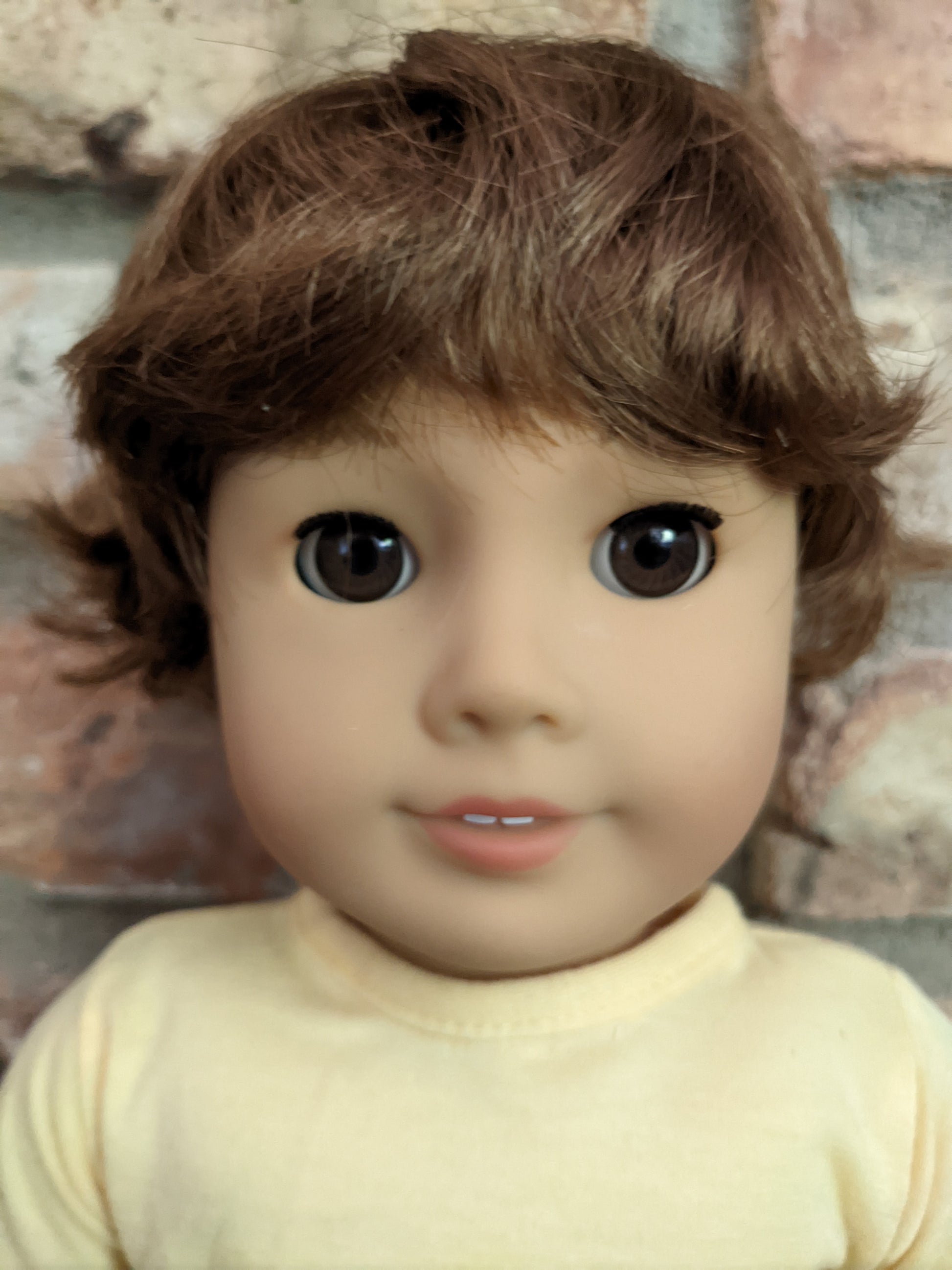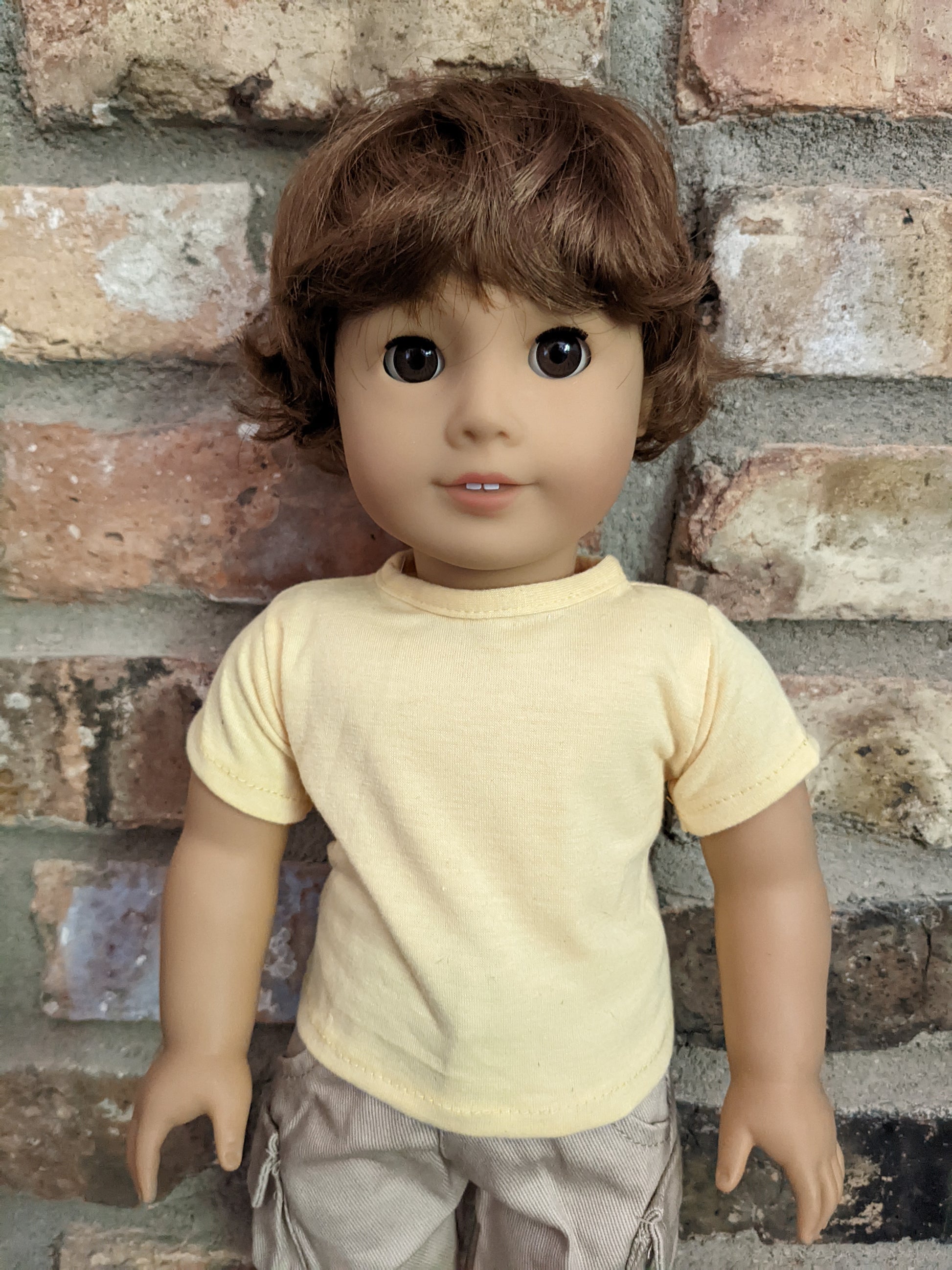 This one of a kind OOAK custom boy American Girl doll was created with a gently used doll, an auburn brown short wig, and brown eyes. He may have some minor shine marks from handling. He comes with the outfit pictured. If you would like the wig left unattached, please leave a note in the "Order Special Instructions" box upon checkout. Otherwise I will attach the wig using a heavy duty permanent adhesive for a strong hold.