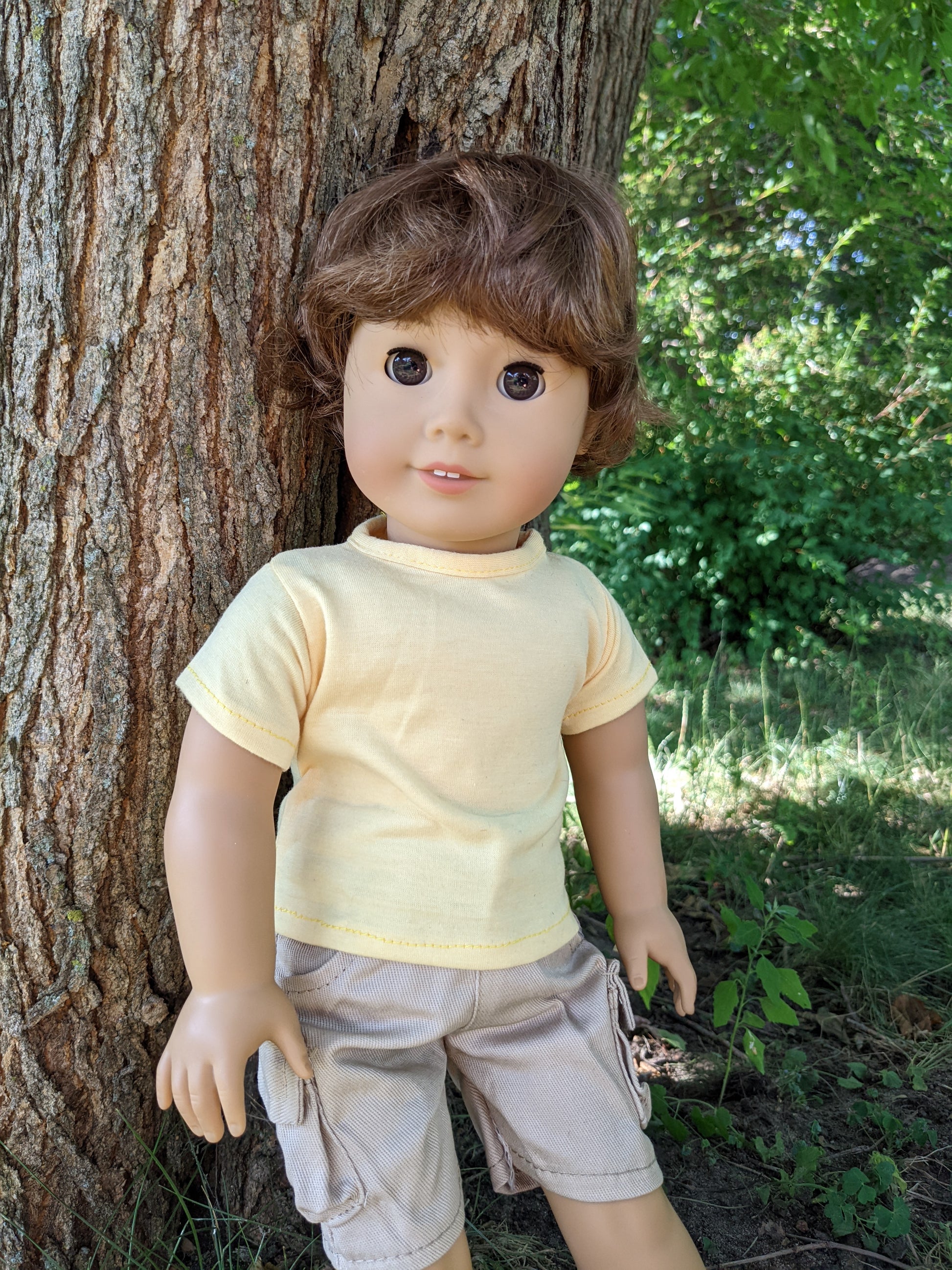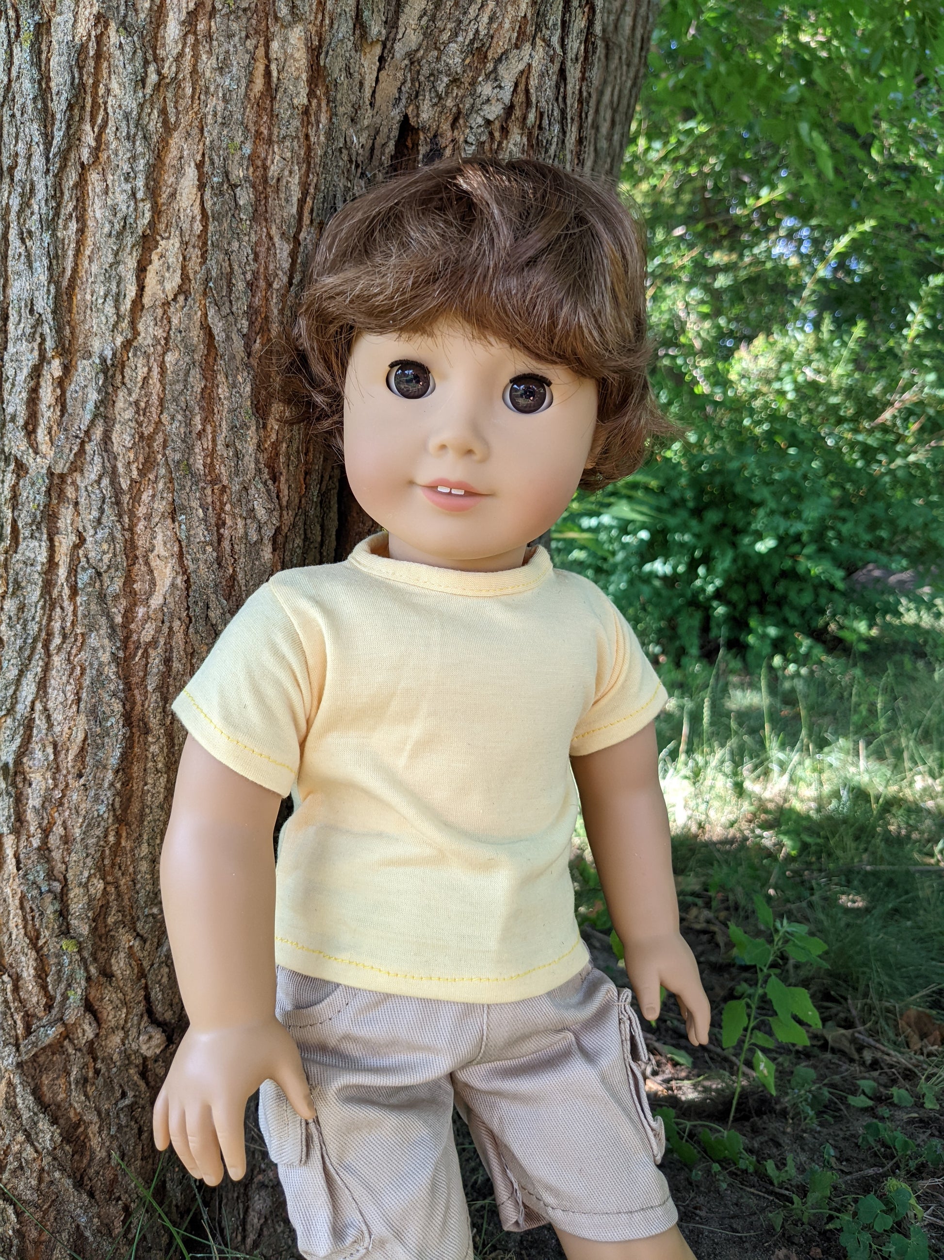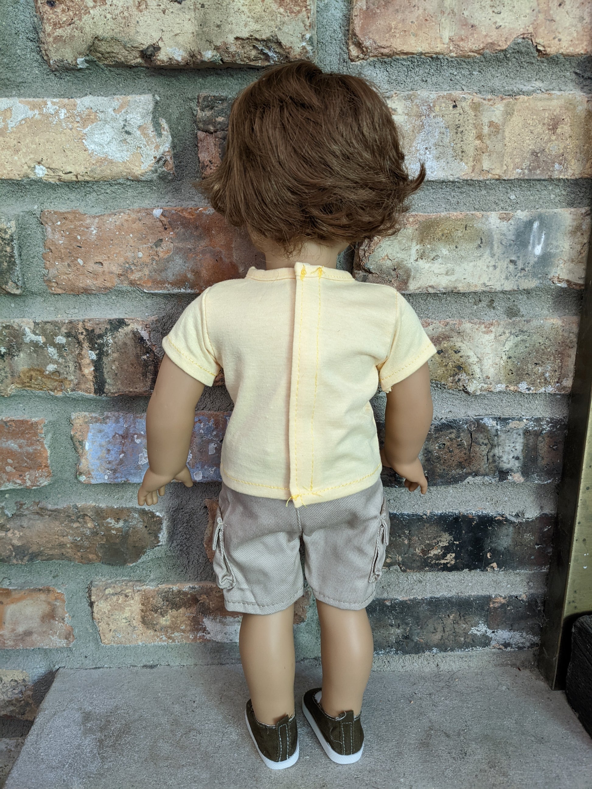 This one of a kind OOAK custom boy American Girl doll was created with a gently used doll, an auburn brown short wig, and brown eyes. He may have some minor shine marks from handling. He comes with the outfit pictured. If you would like the wig left unattached, please leave a note in the "Order Special Instructions" box upon checkout. Otherwise I will attach the wig using a heavy duty permanent adhesive for a strong hold.