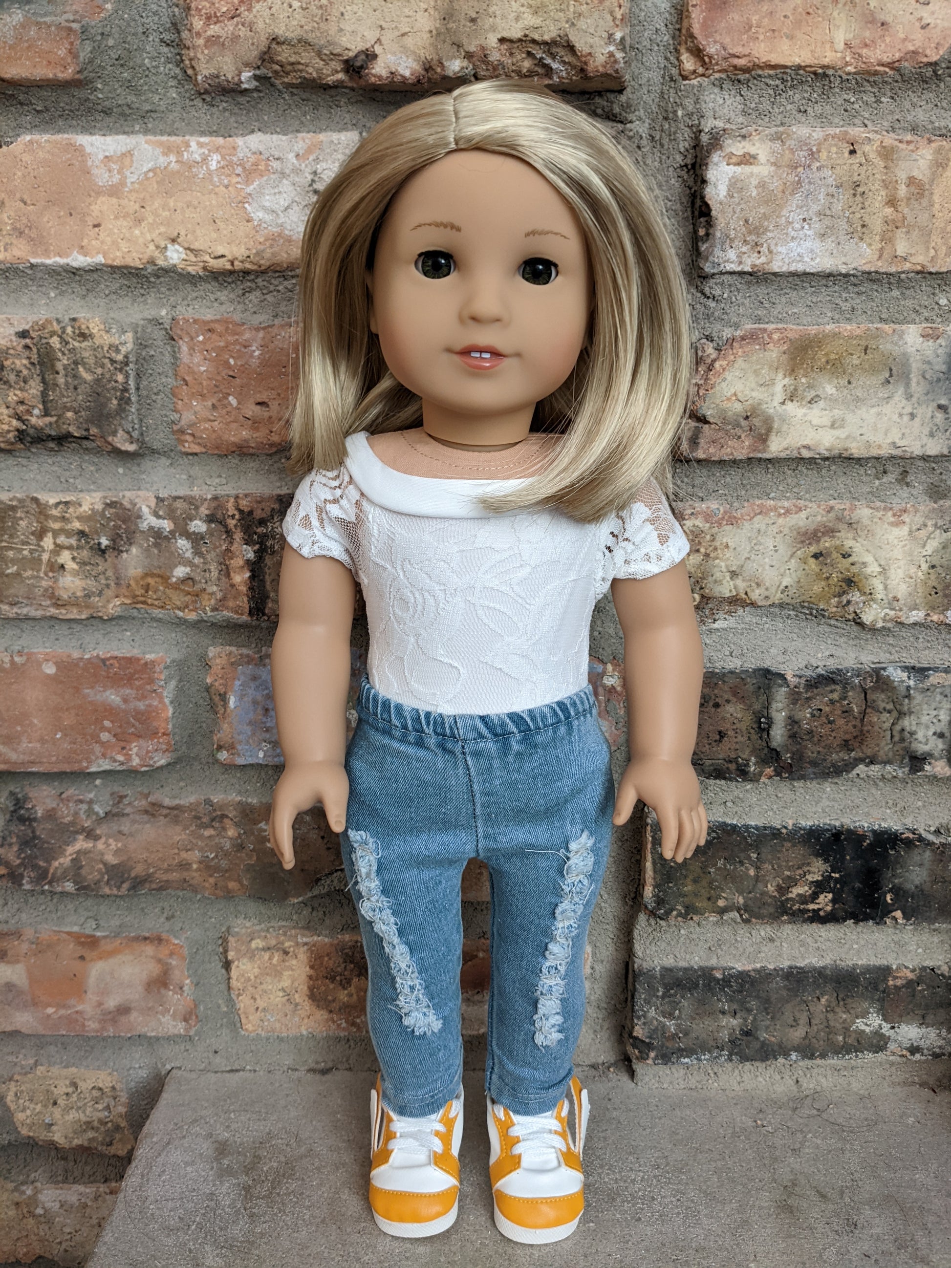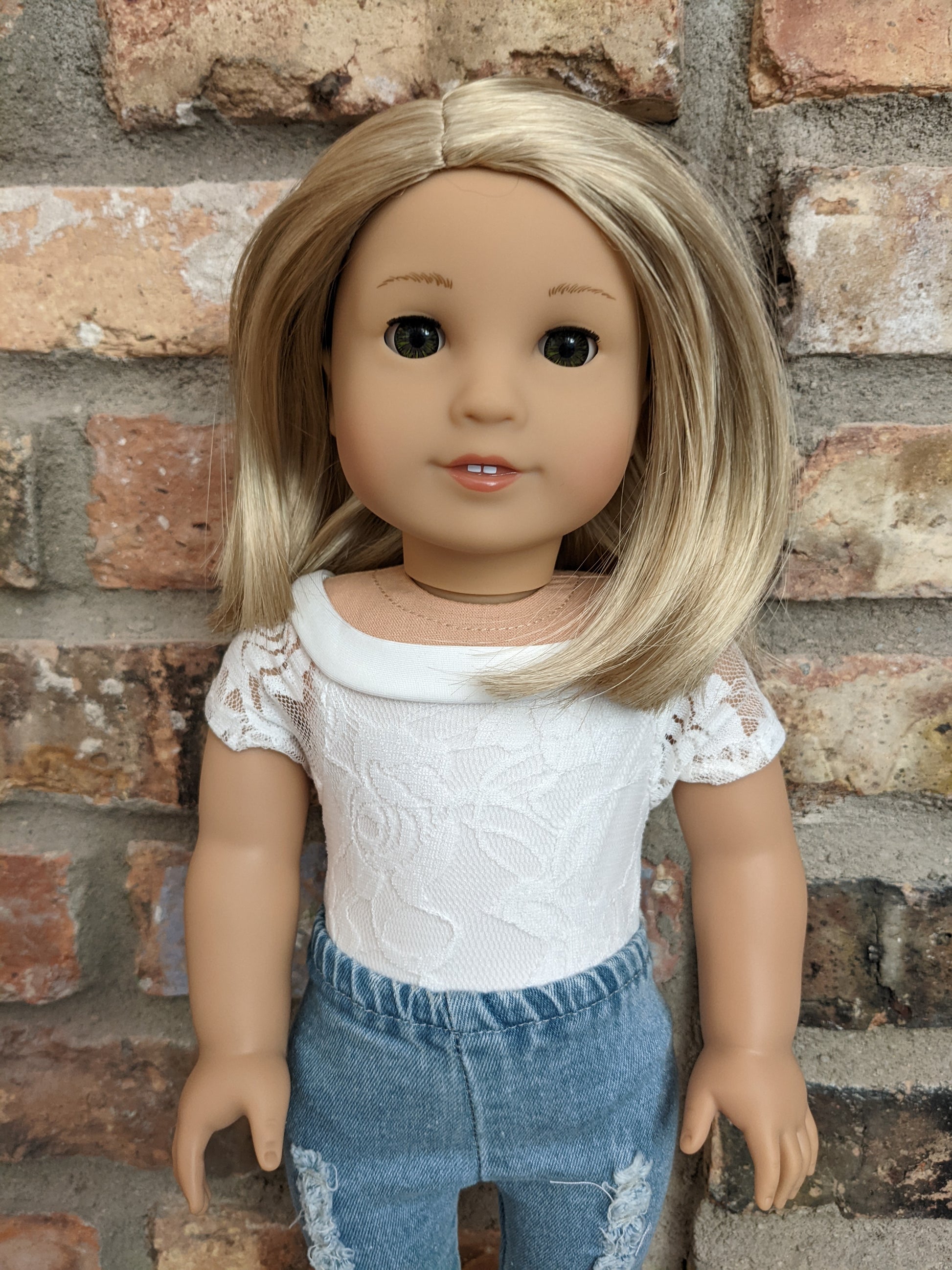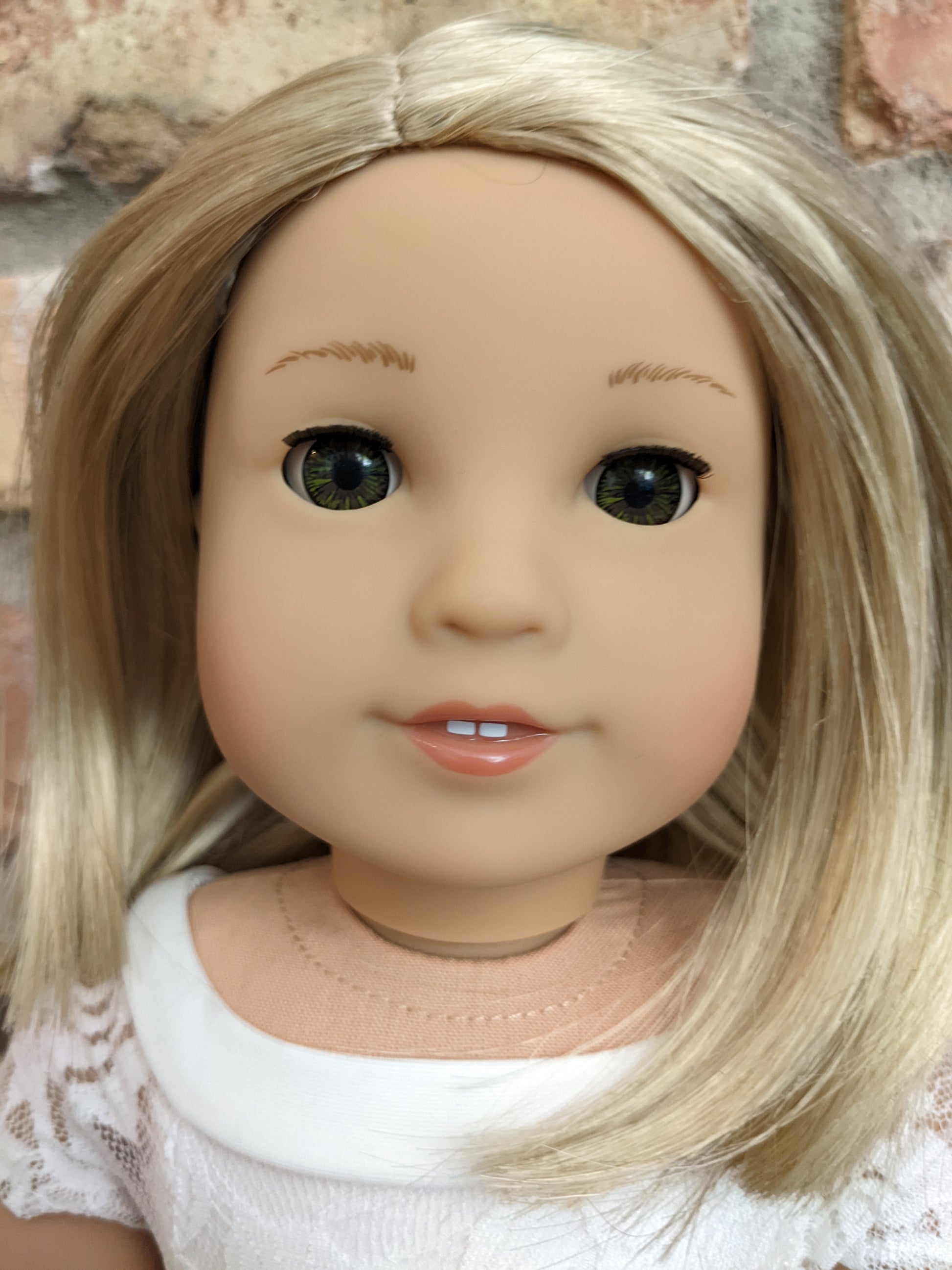 This one of a kind OOAK custom American Girl doll was created with a brand new Truly Me doll, a light blonde wig from a new TM doll, and hazel eyes. She has lip gloss that was hand painted and sealed. She may have some minor shine marks from handling. She comes with the outfit pictured.