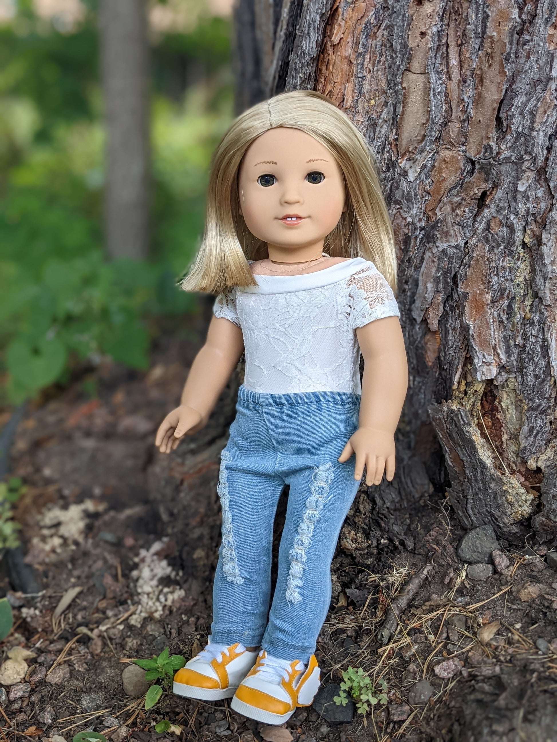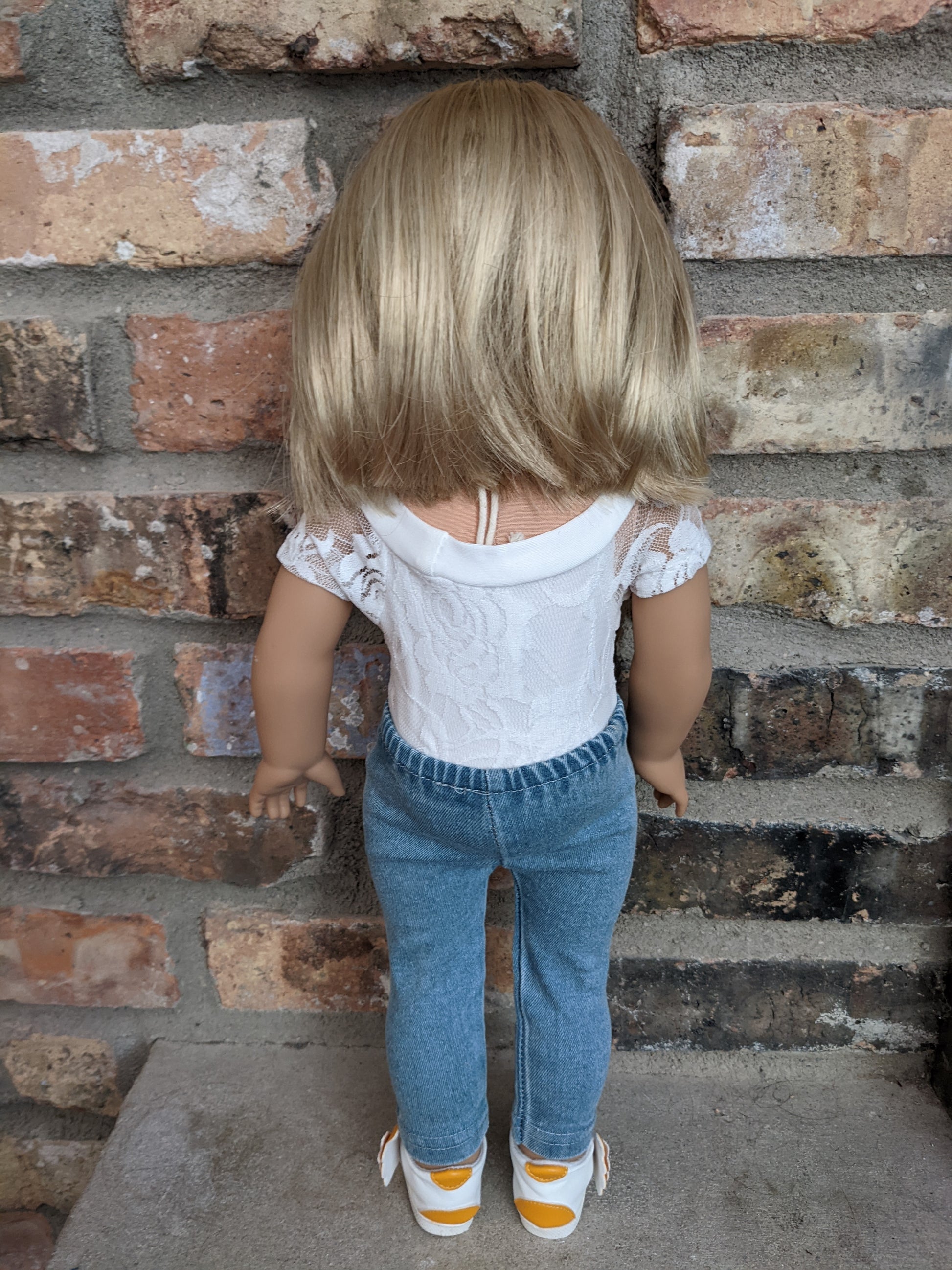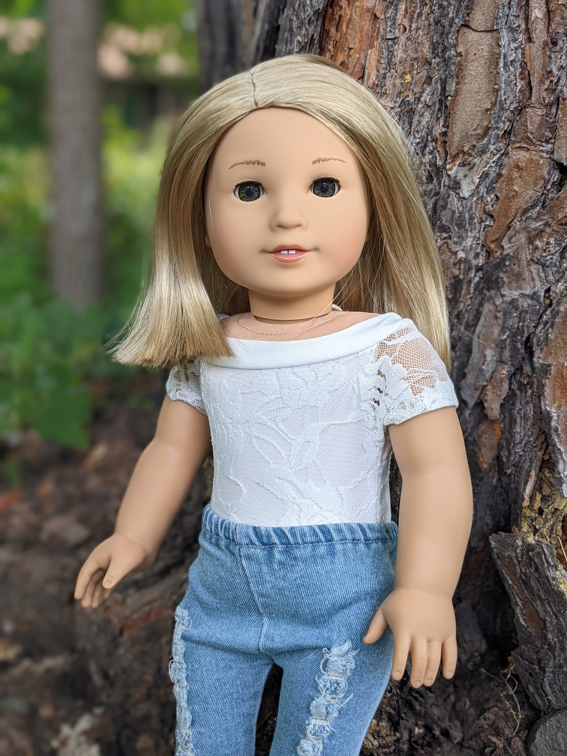 This one of a kind OOAK custom American Girl doll was created with a brand new Truly Me doll, a light blonde wig from a new TM doll, and hazel eyes. She has lip gloss that was hand painted and sealed. She may have some minor shine marks from handling. She comes with the outfit pictured.