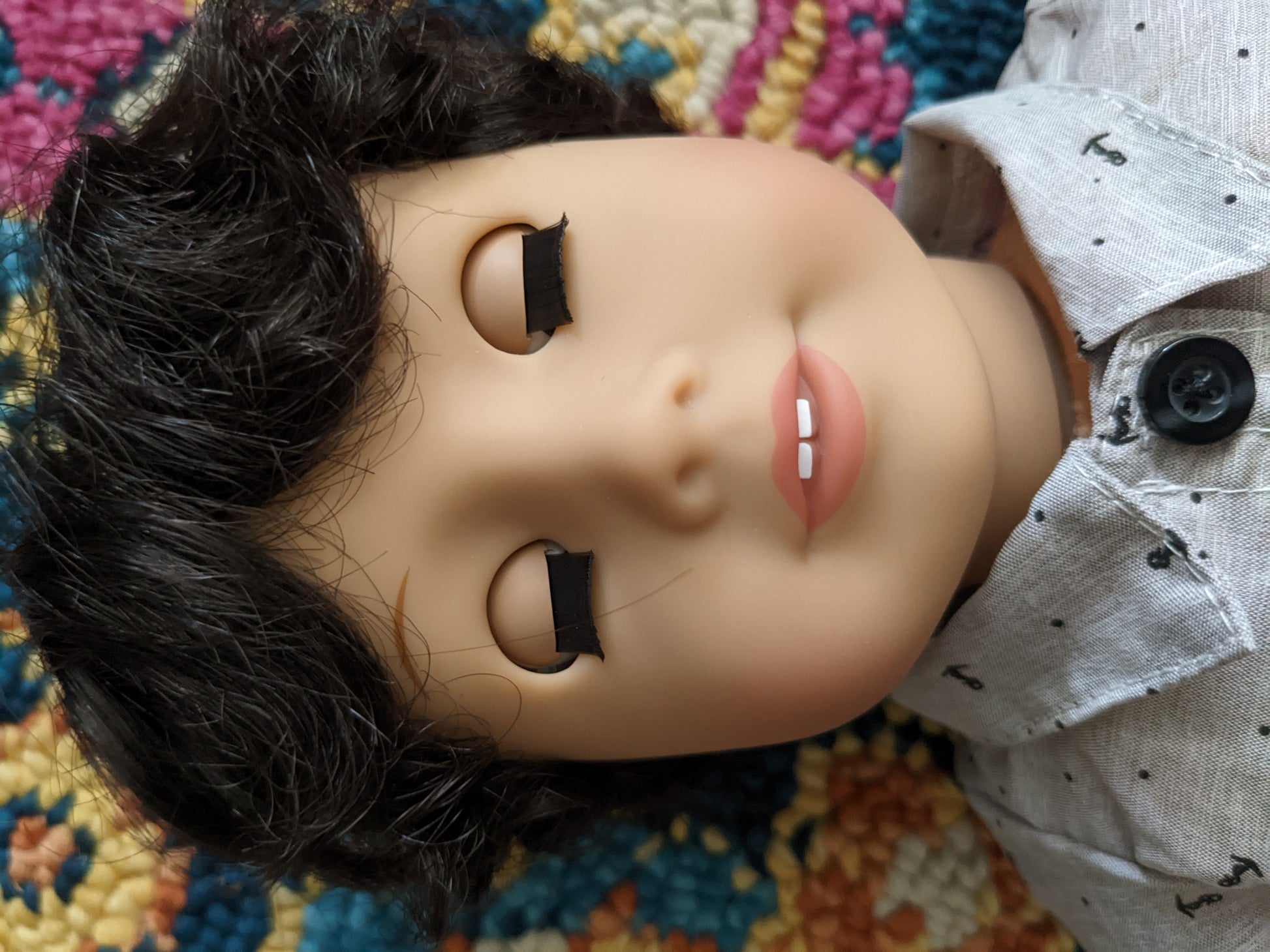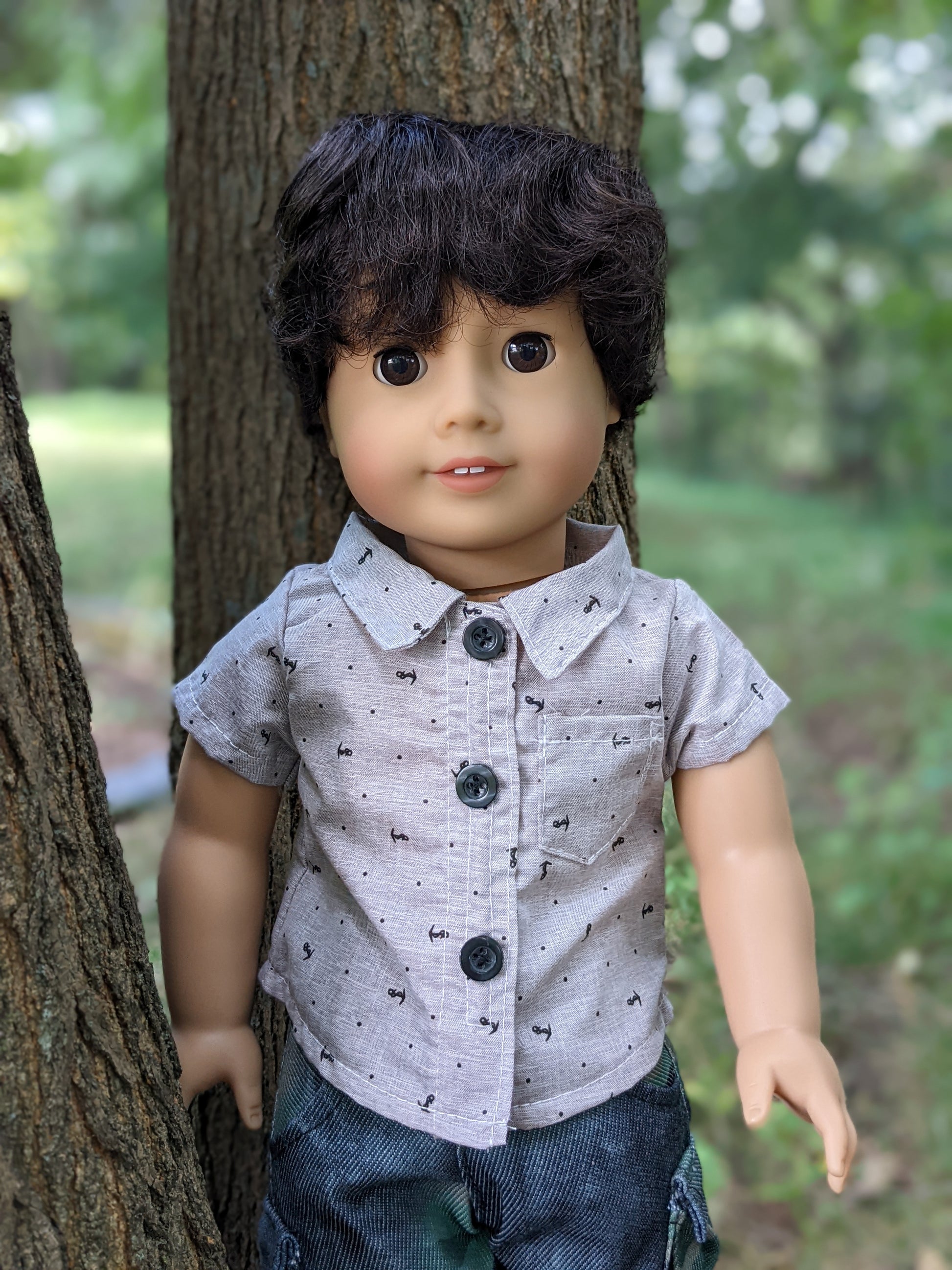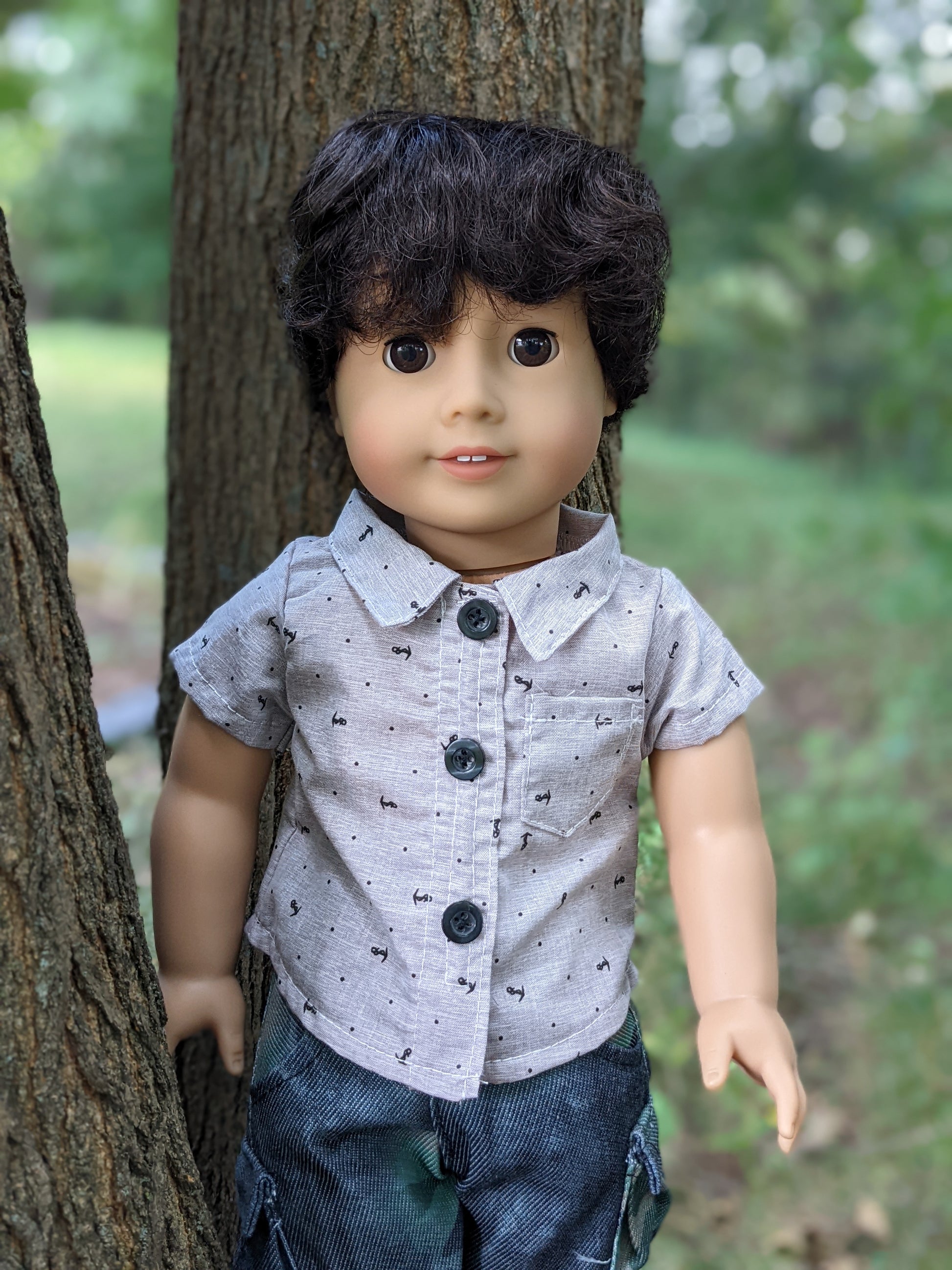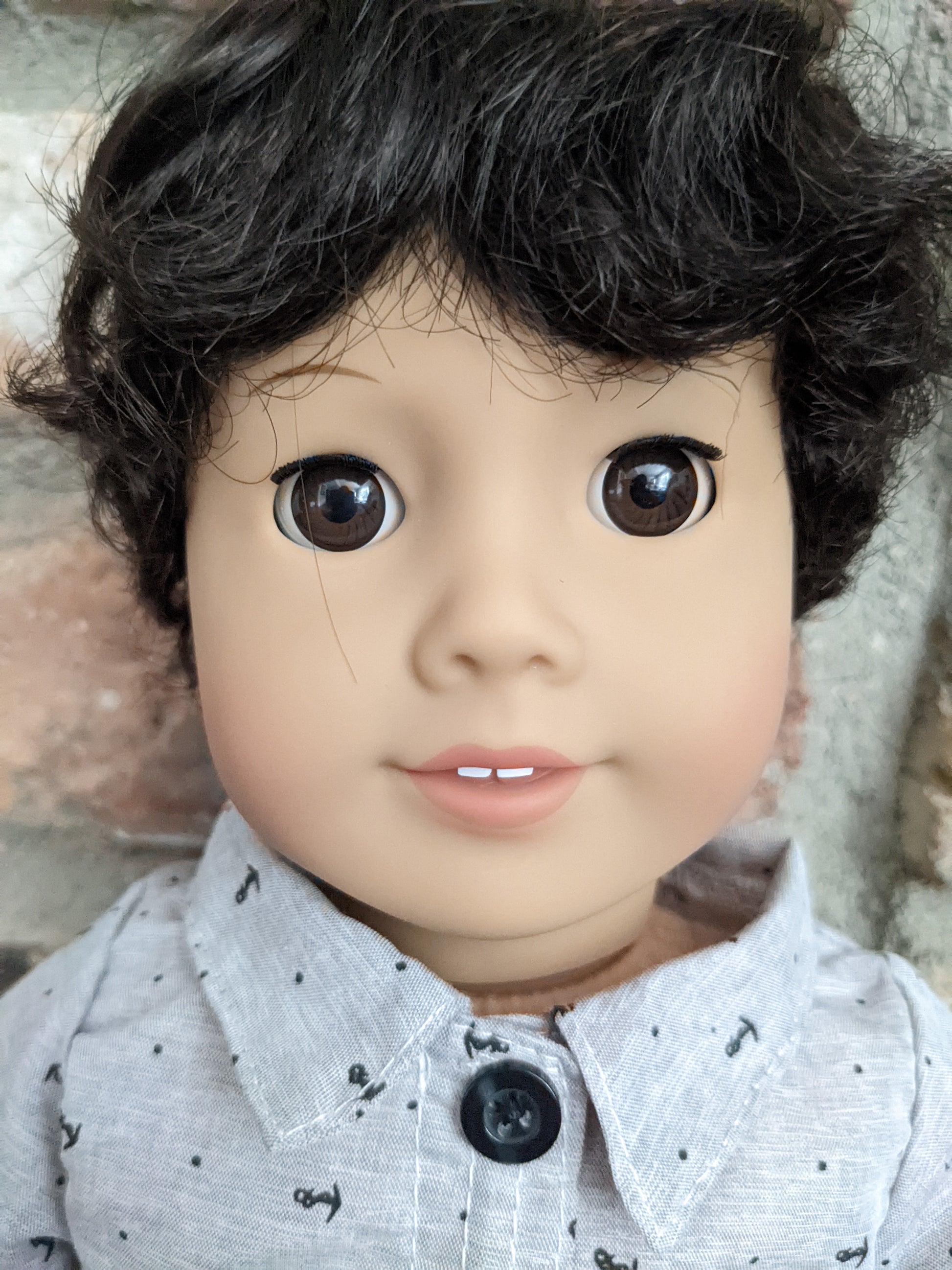 This one of a kind OOAK custom American Girl doll was created with a brand new Truly Me doll, a black wig, and brown eyes. He may have some minor shine marks from handling. He comes with the outfit pictured. He has a microfiber cloth body.