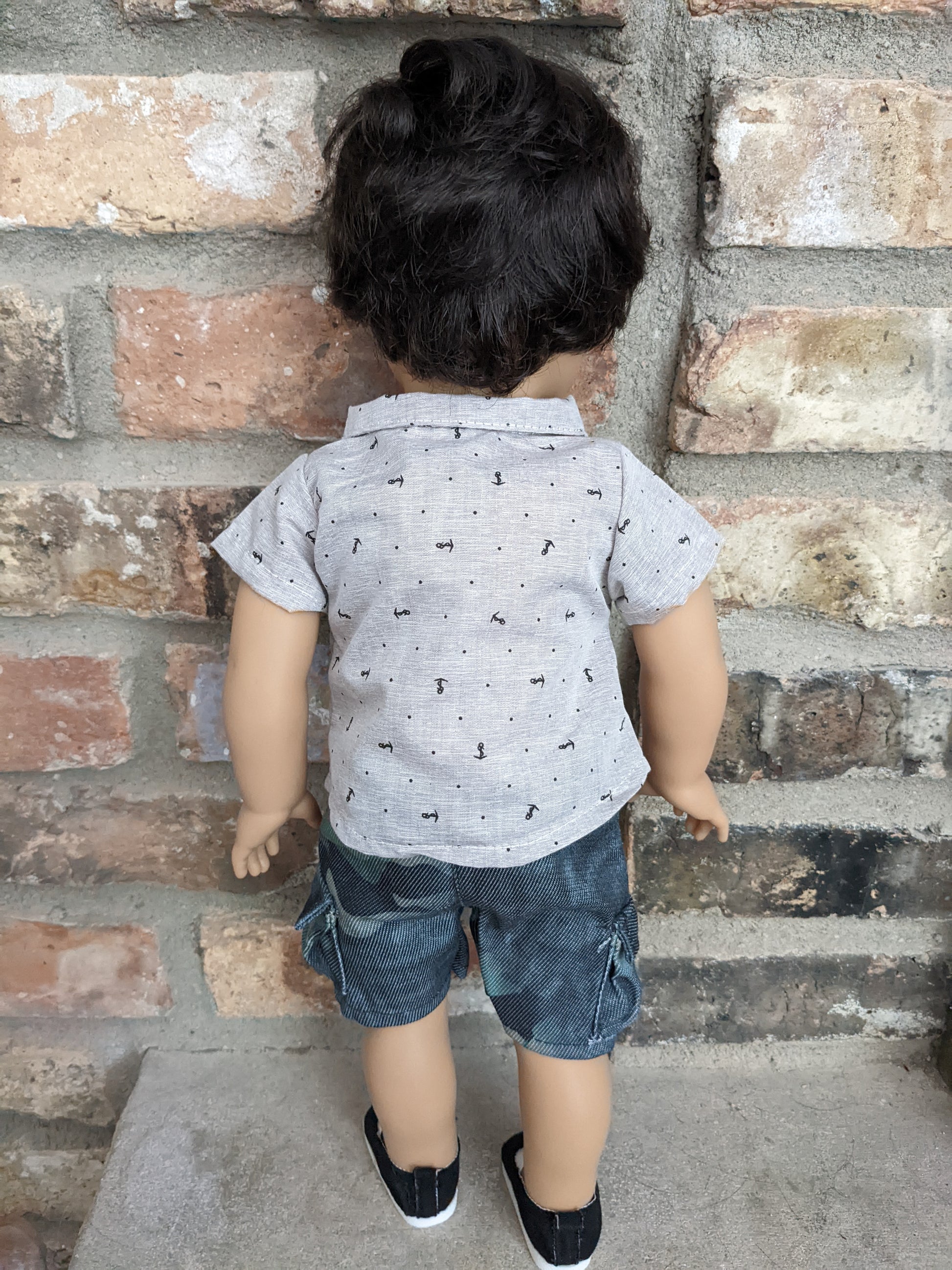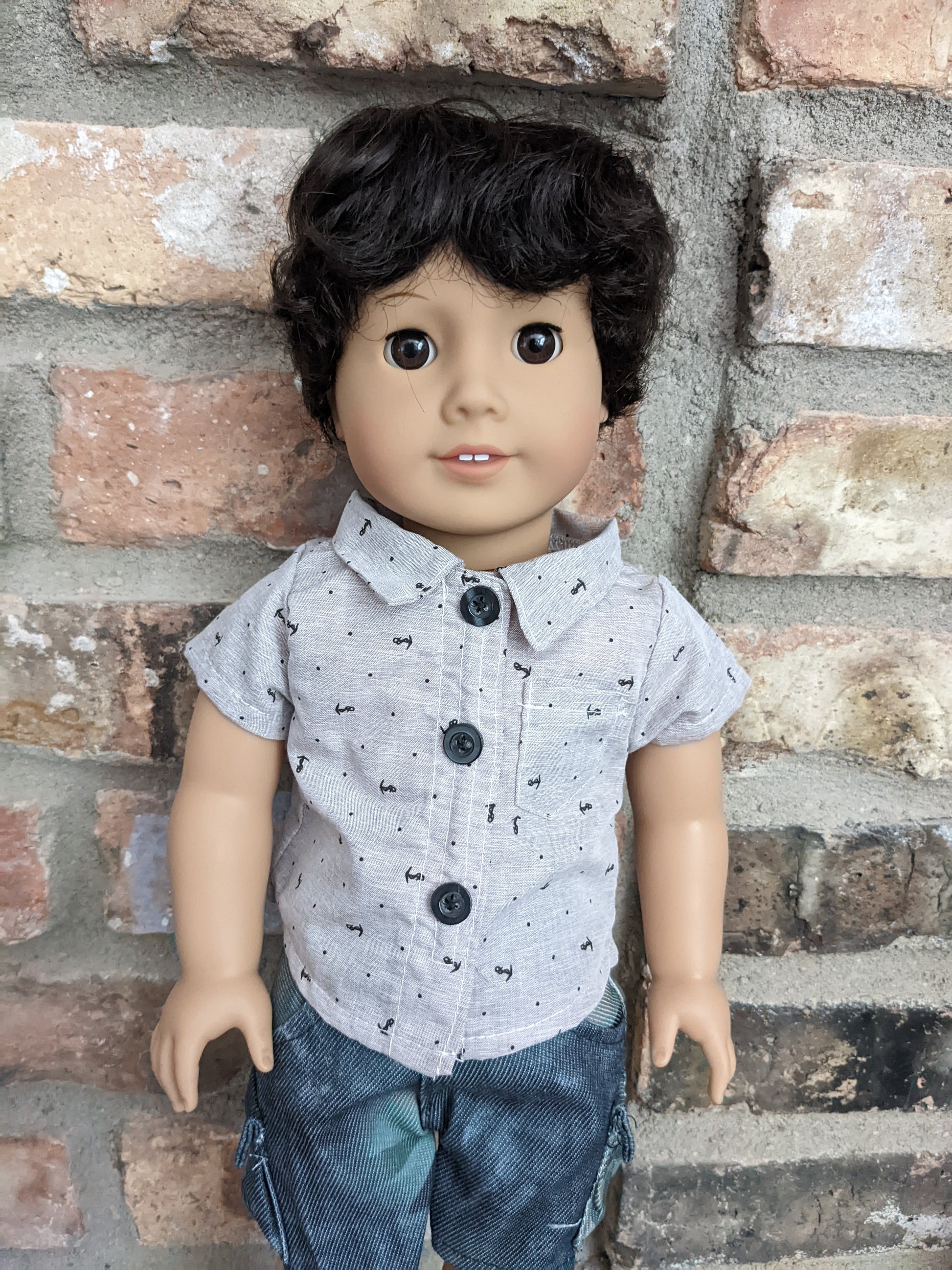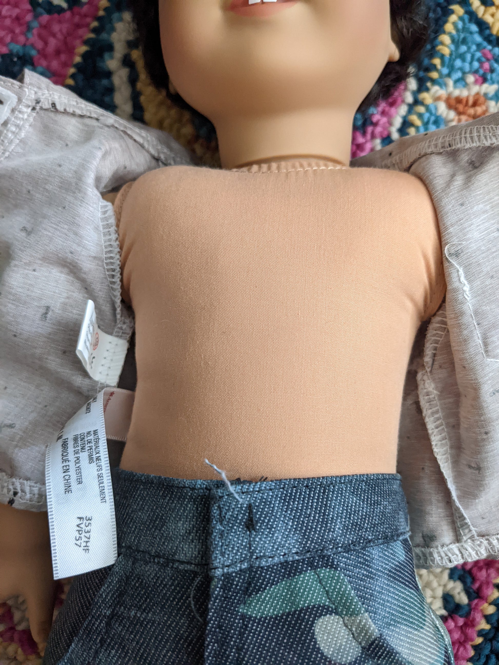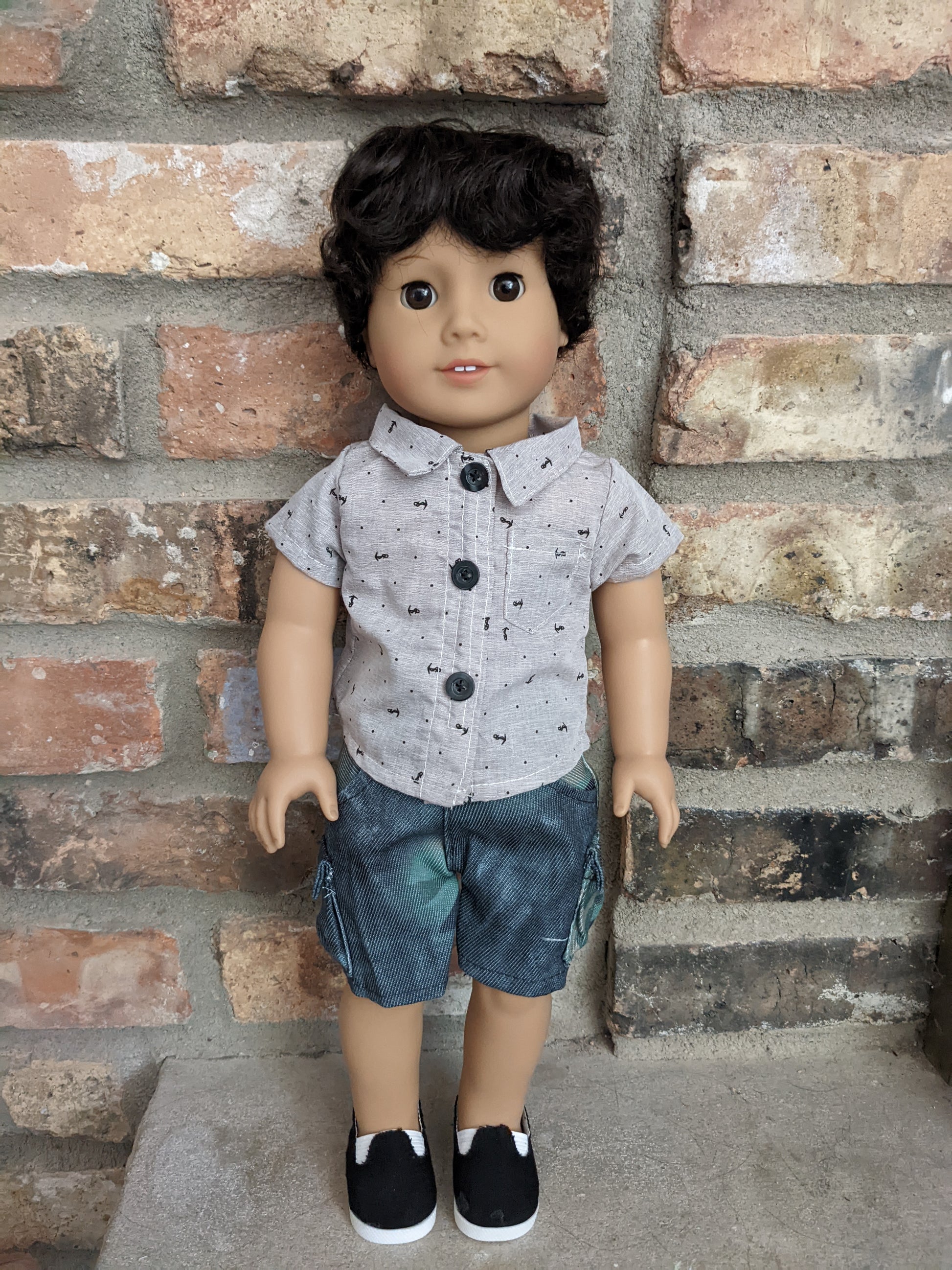 This one of a kind OOAK custom American Girl doll was created with a brand new Truly Me doll, a black wig, and brown eyes. He may have some minor shine marks from handling. He comes with the outfit pictured. He has a microfiber cloth body.