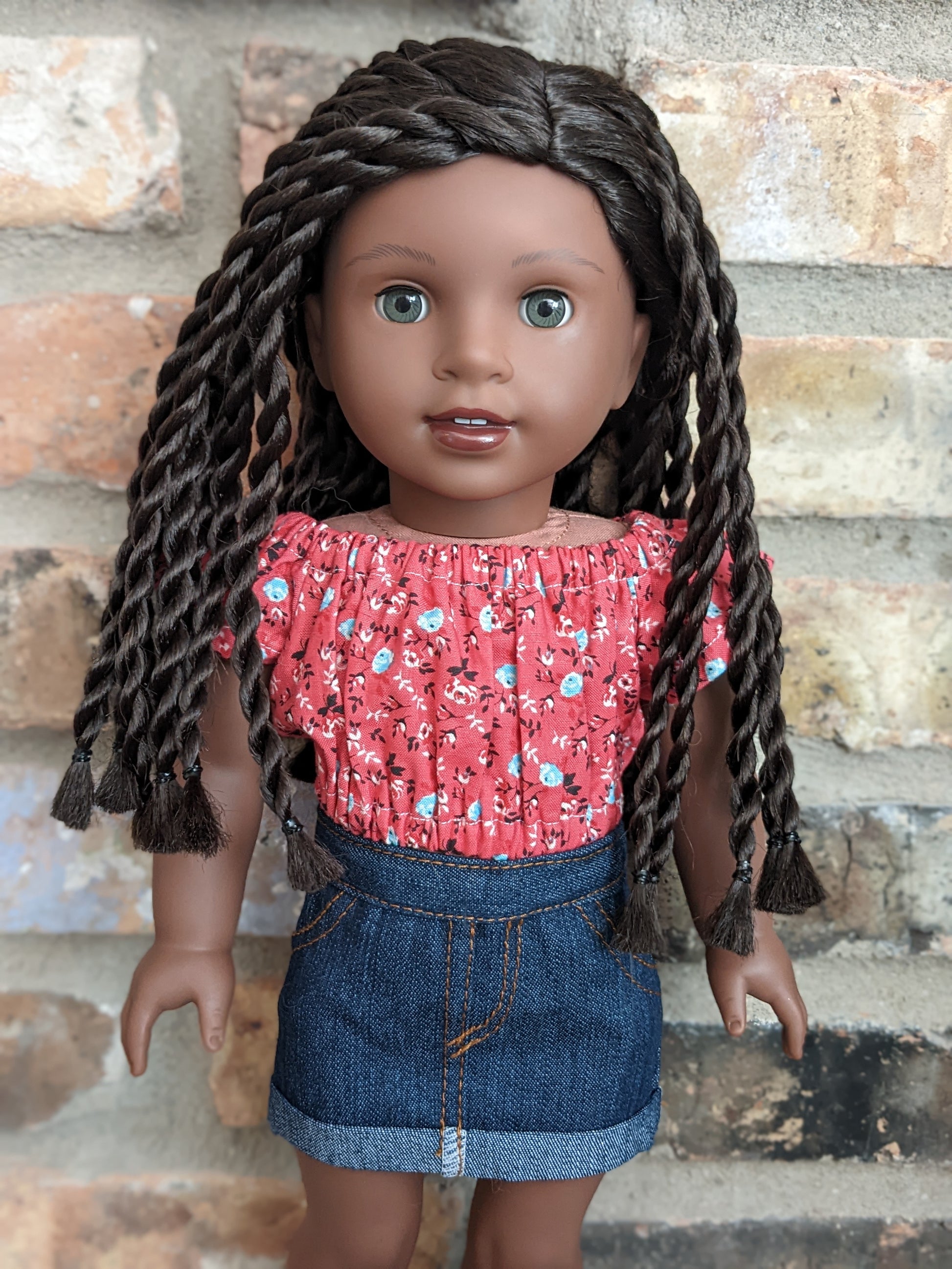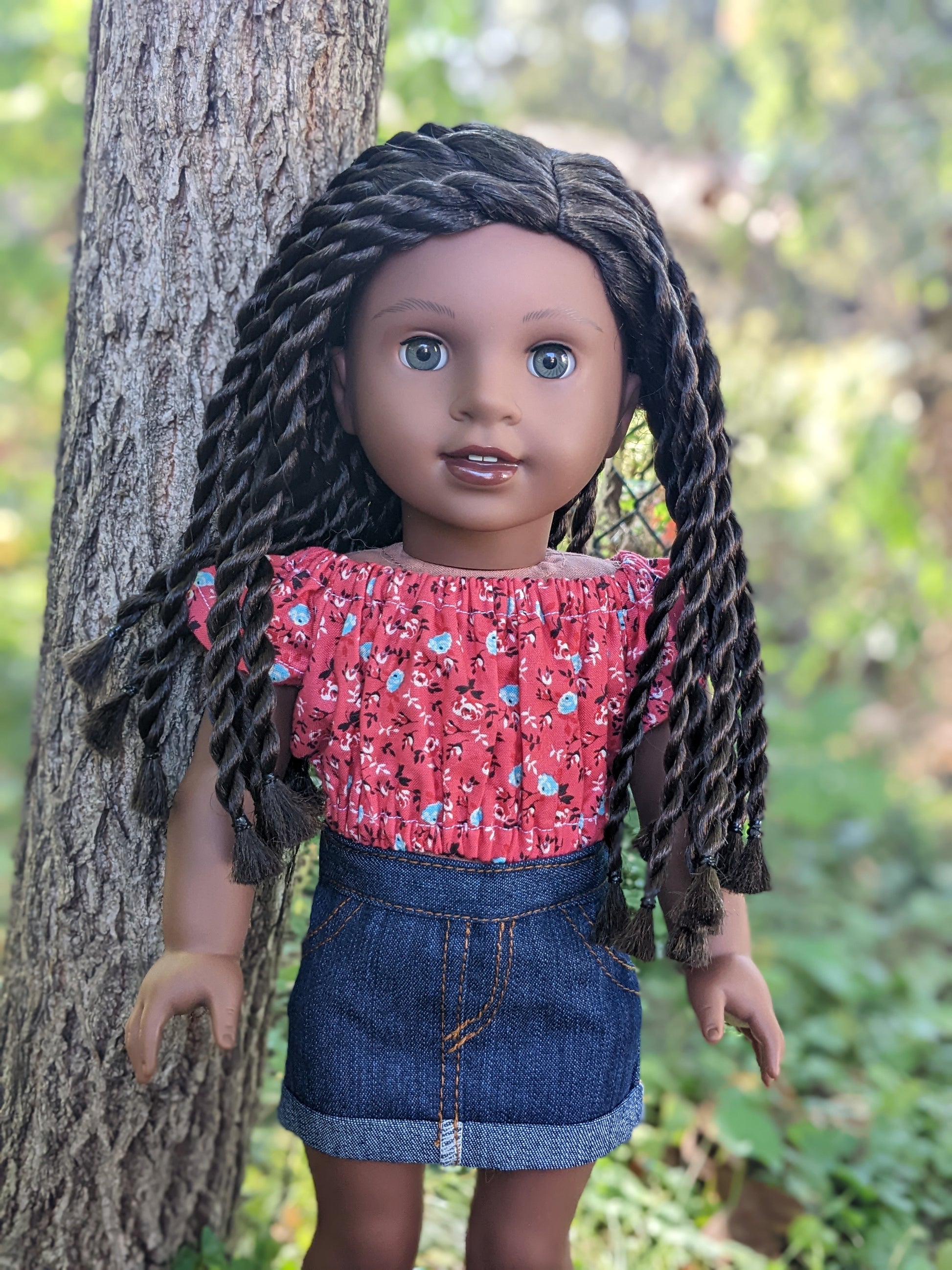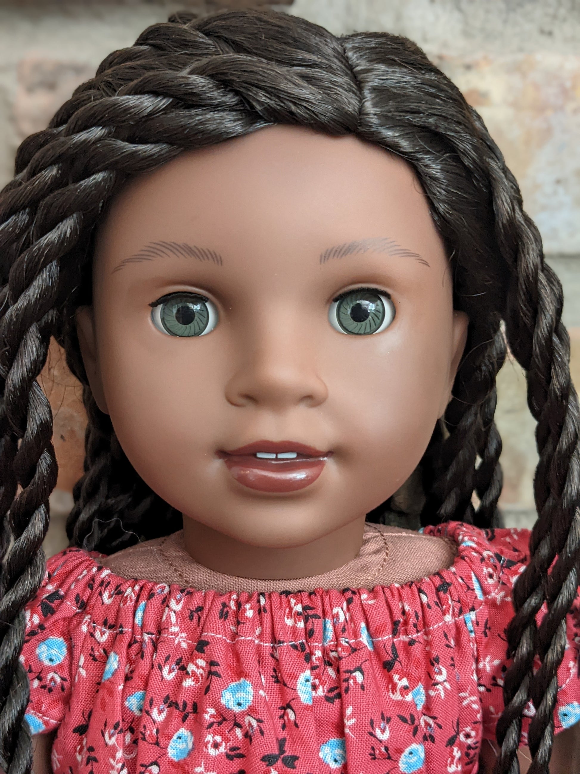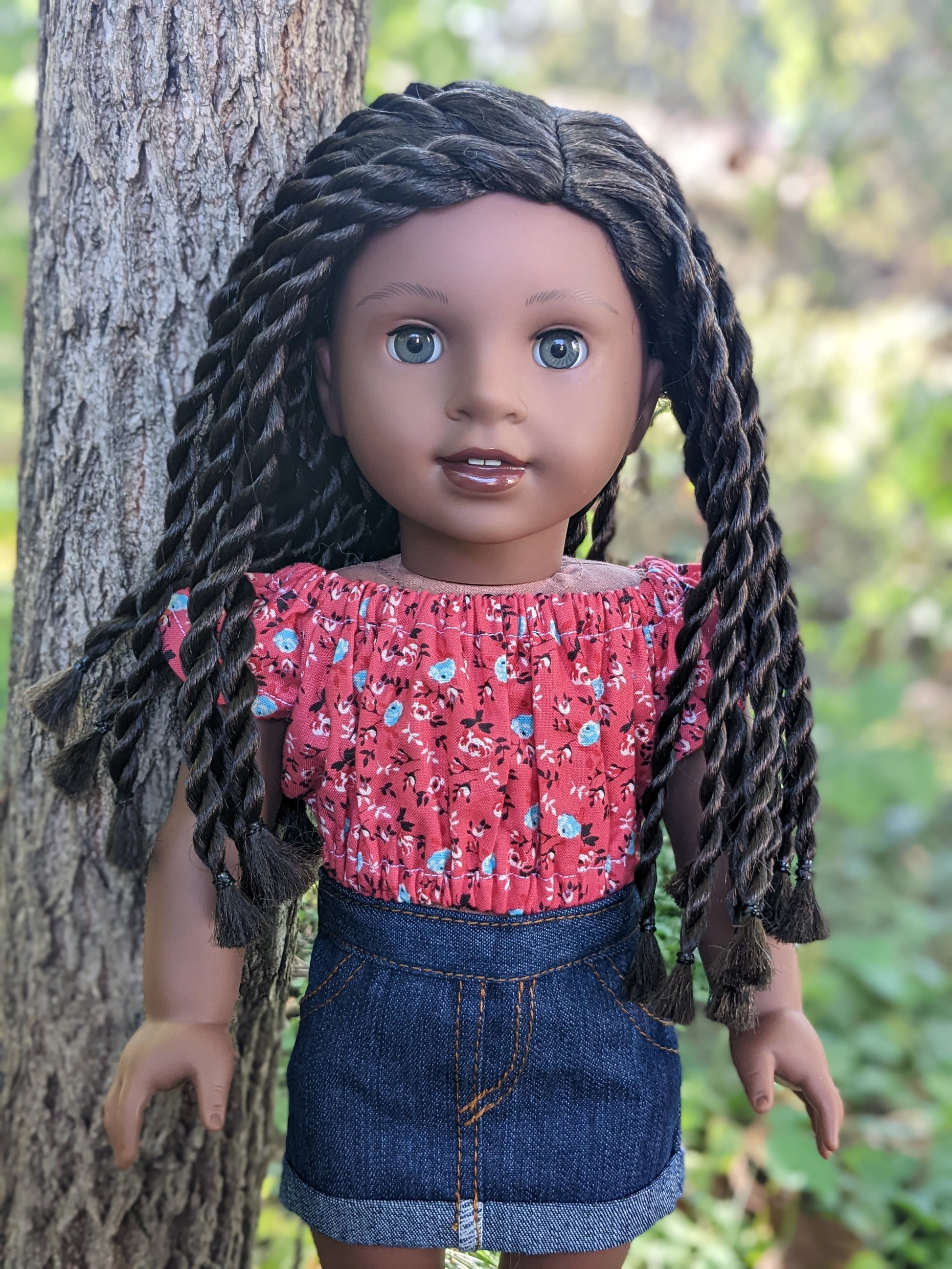 This one of a kind OOAK custom American Girl doll was created with a brand new Claudie doll, a wig from a new Makena doll, and grey eyes. She has lip gloss that was hand painted and sealed. She may have some minor shine marks from handling. She comes with the outfit pictured. Her painted on eyelashes have been removed.