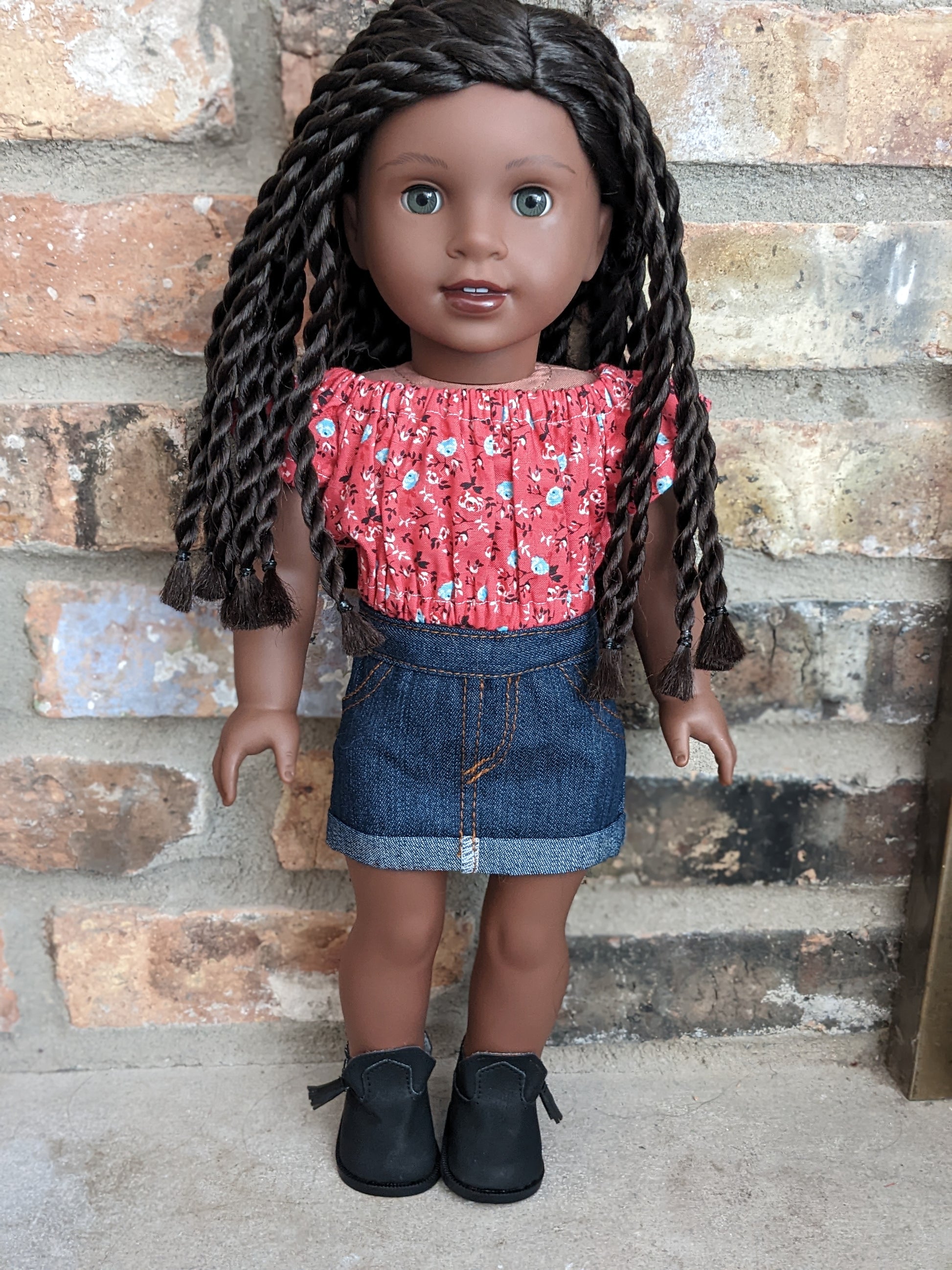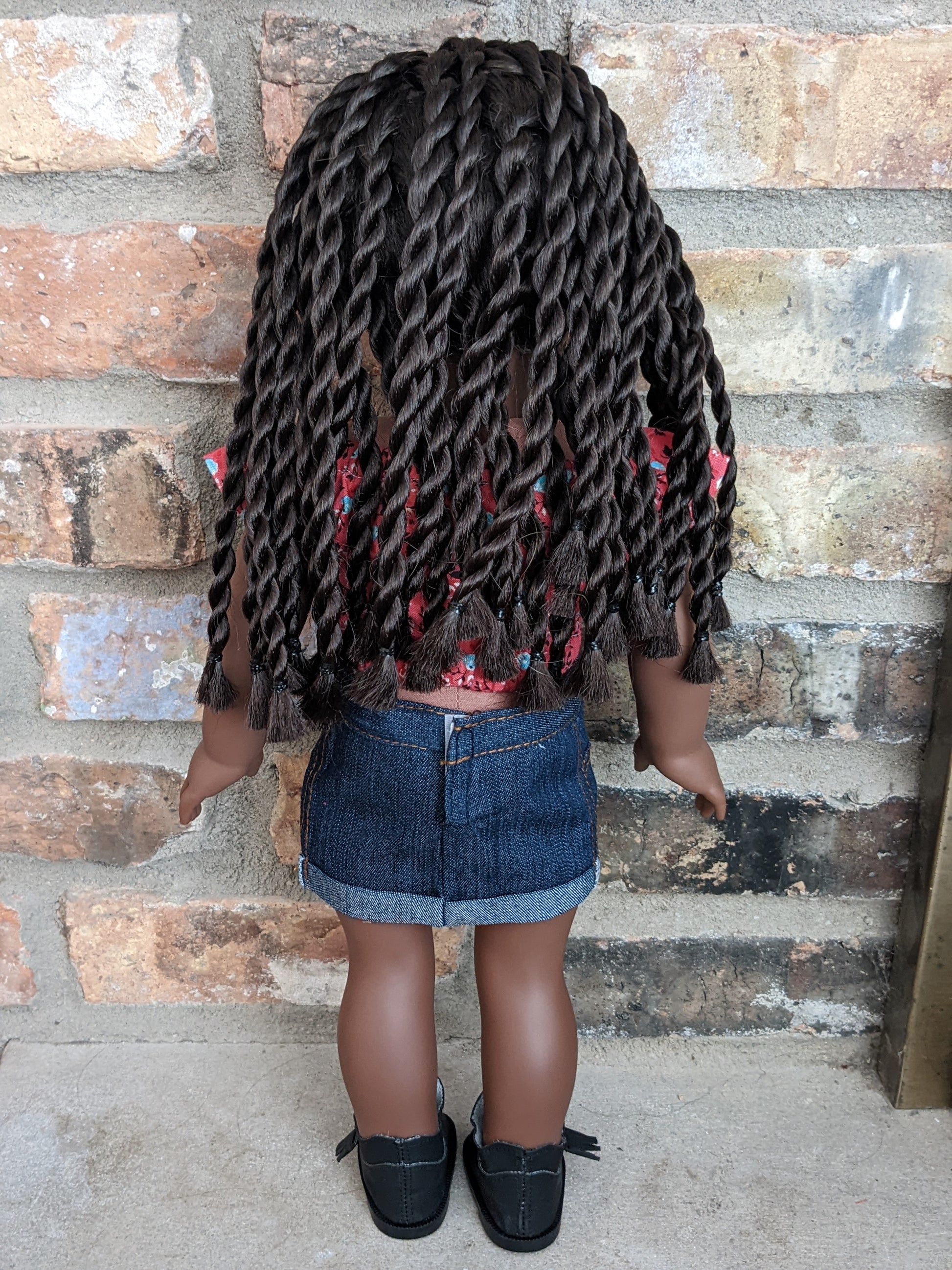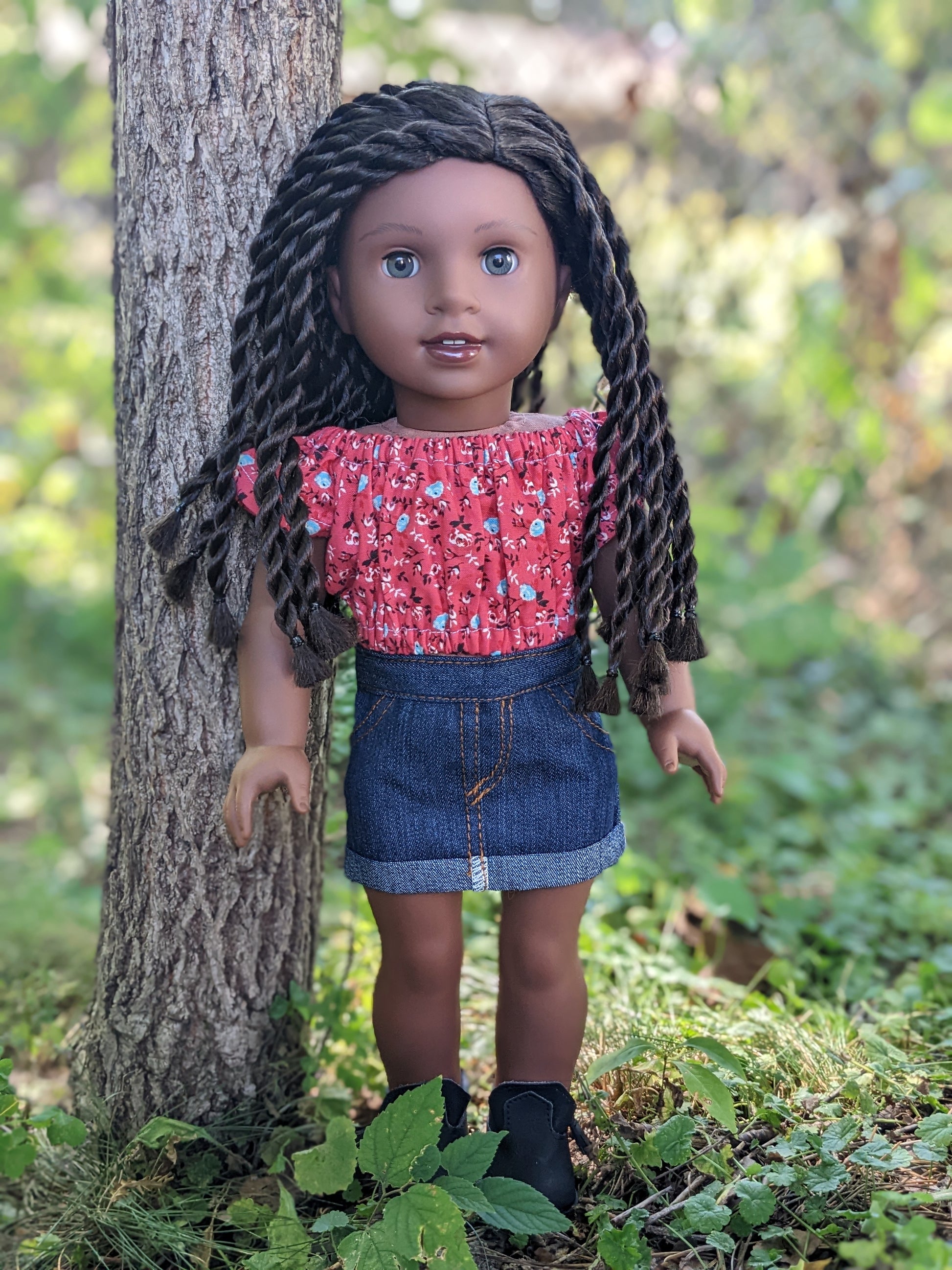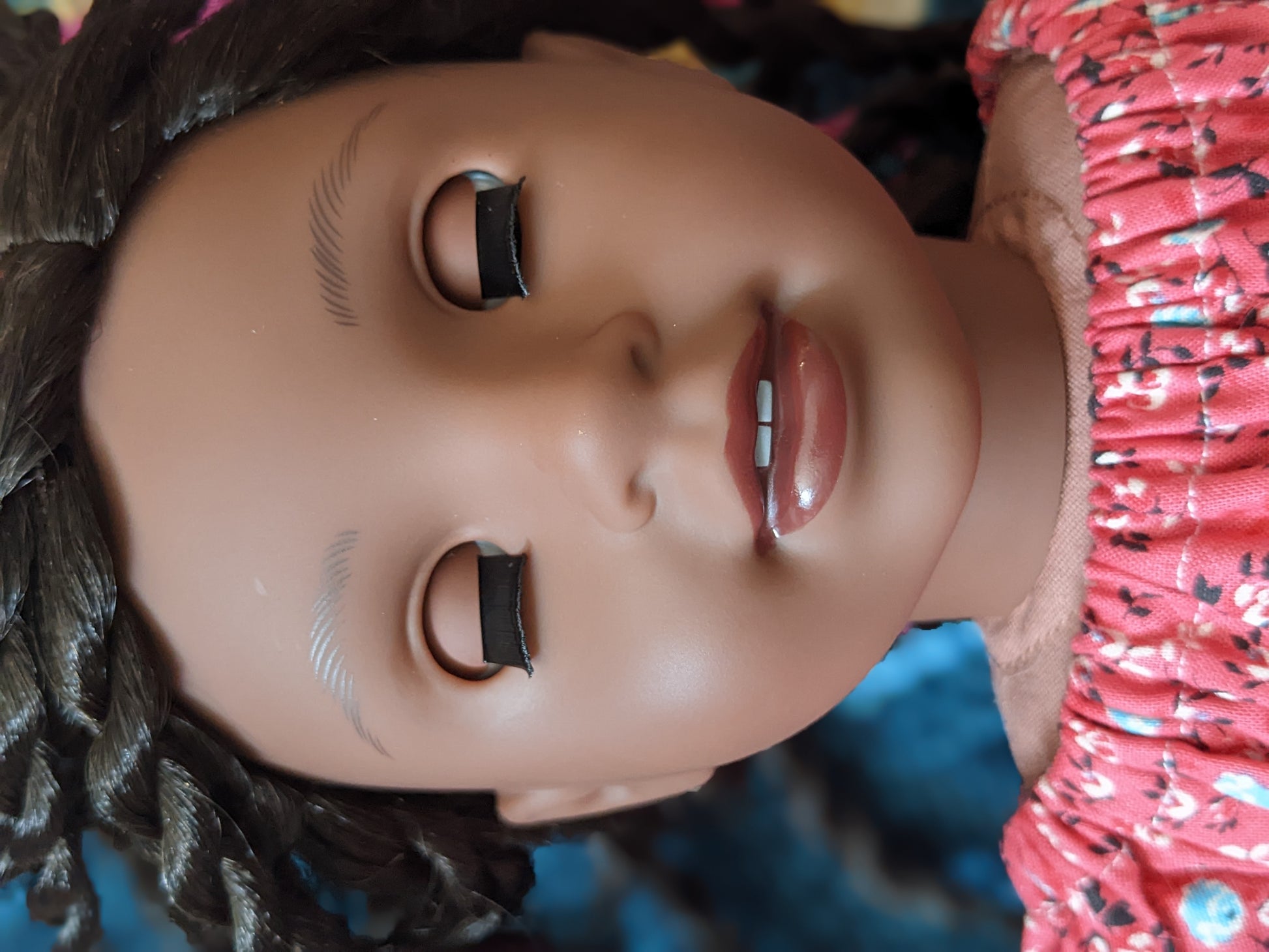 This one of a kind OOAK custom American Girl doll was created with a brand new Claudie doll, a wig from a new Makena doll, and grey eyes. She has lip gloss that was hand painted and sealed. She may have some minor shine marks from handling. She comes with the outfit pictured. Her painted on eyelashes have been removed.