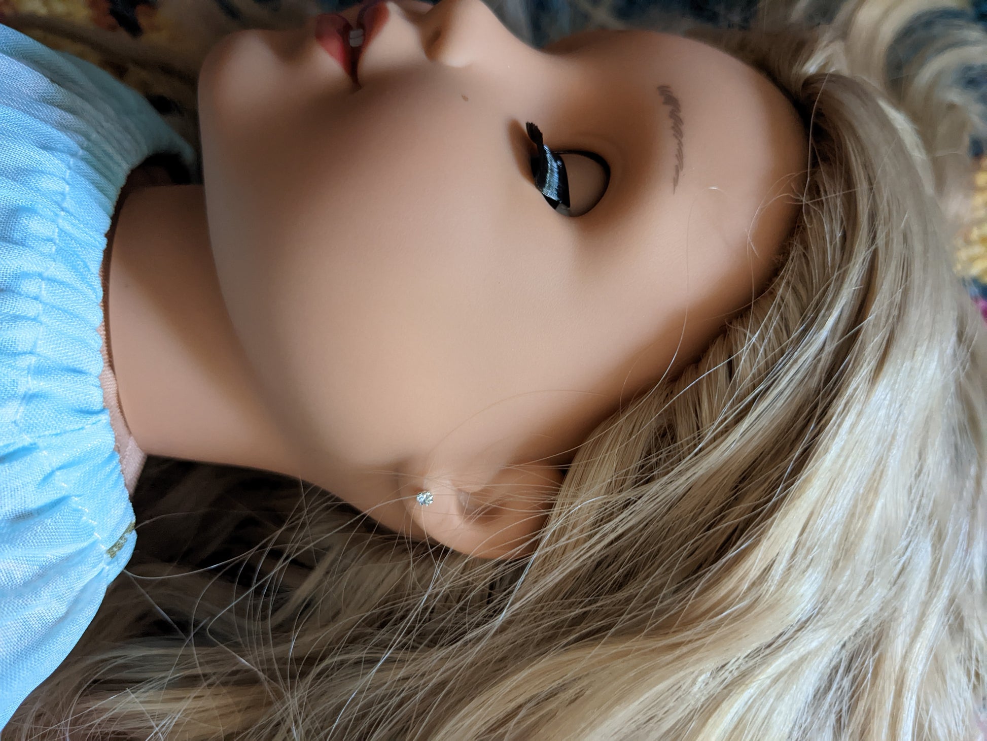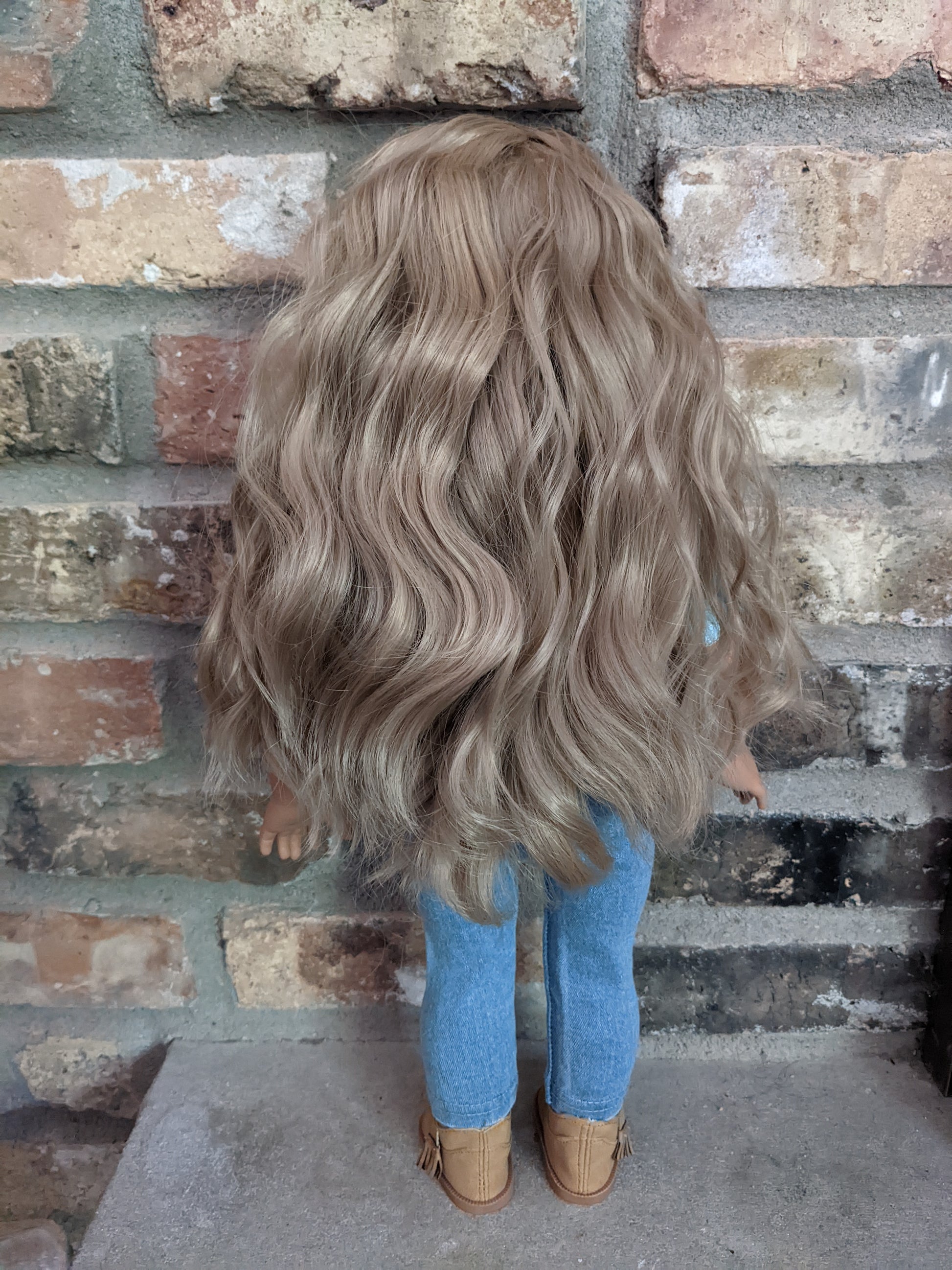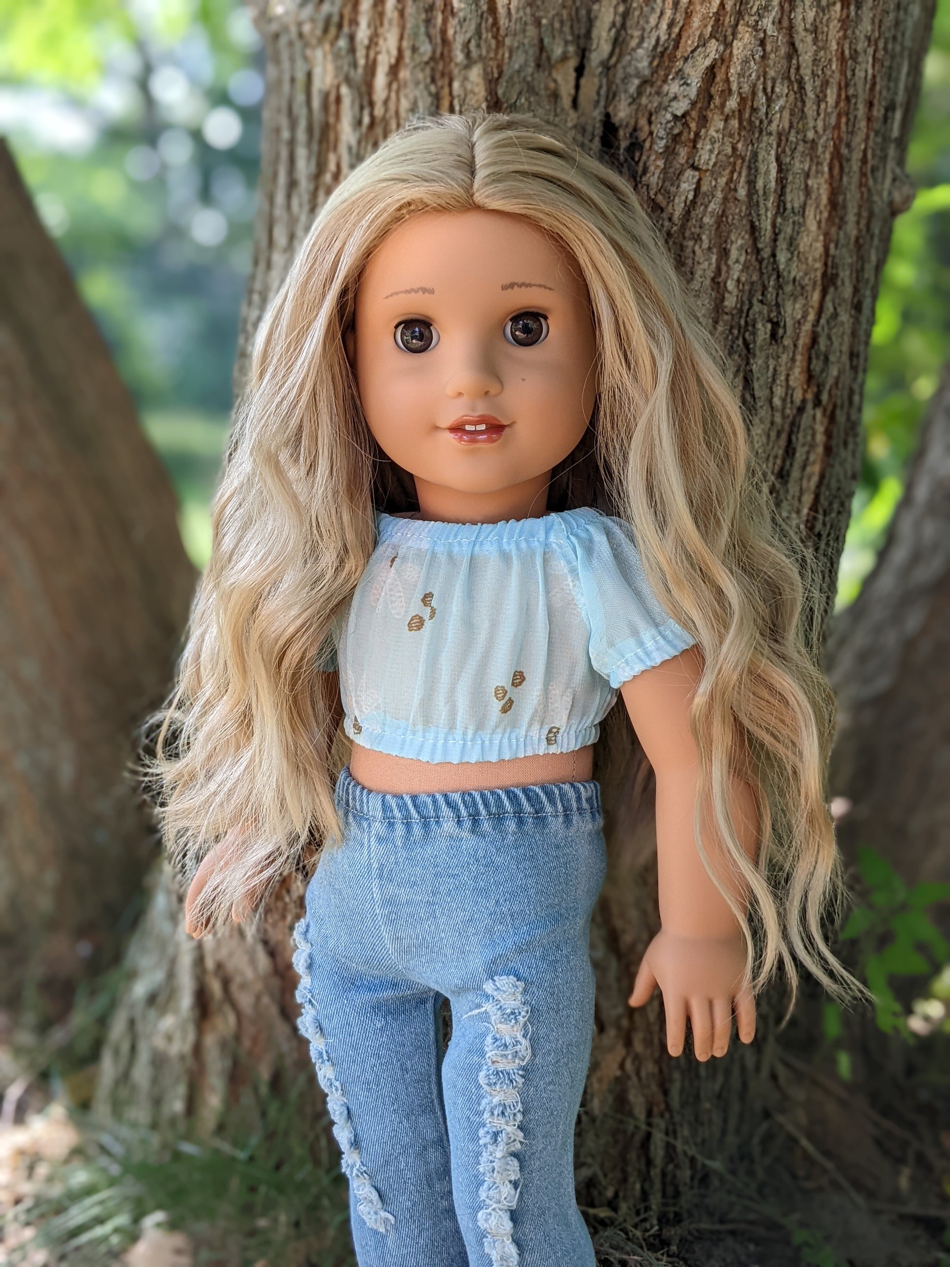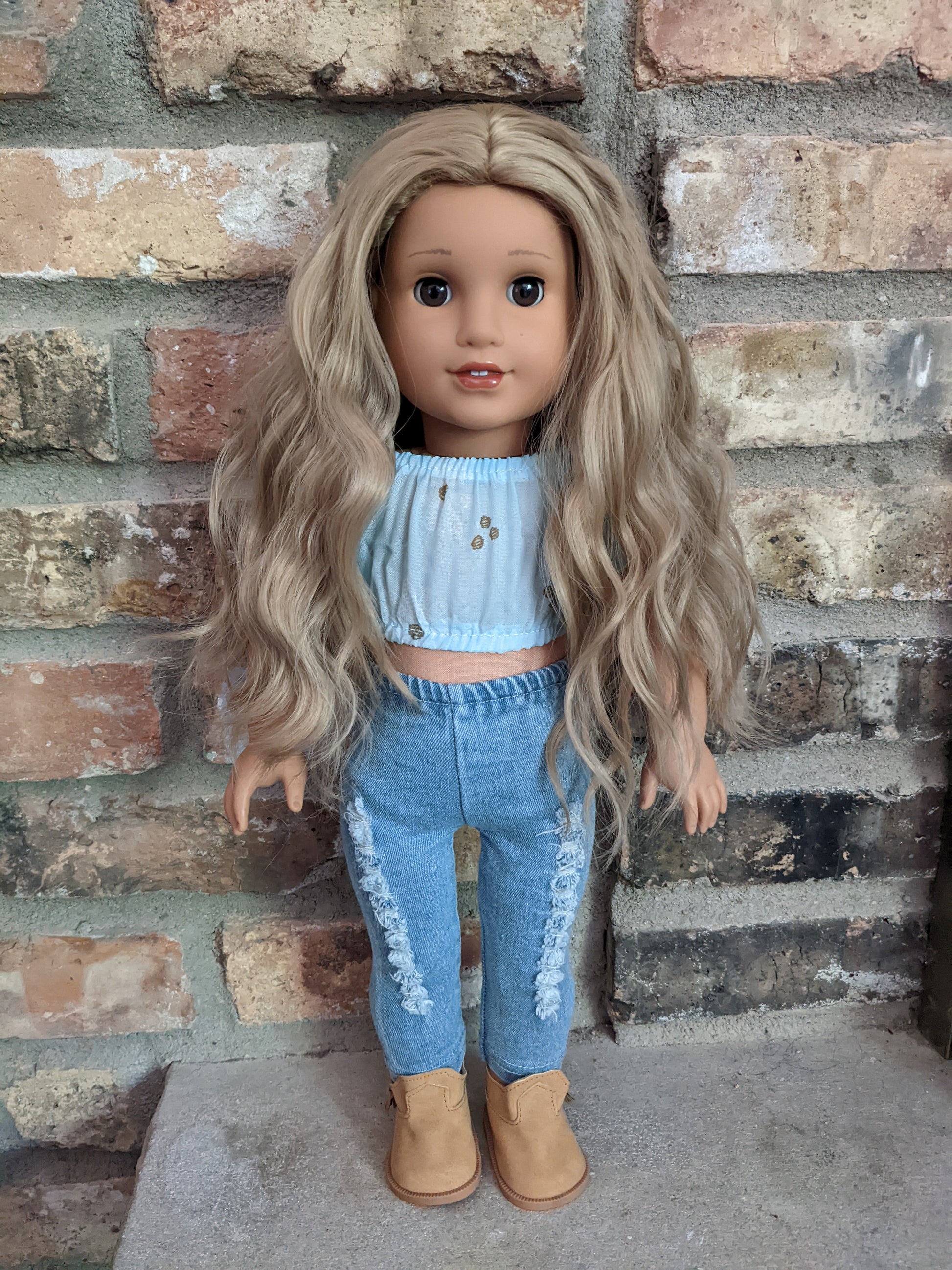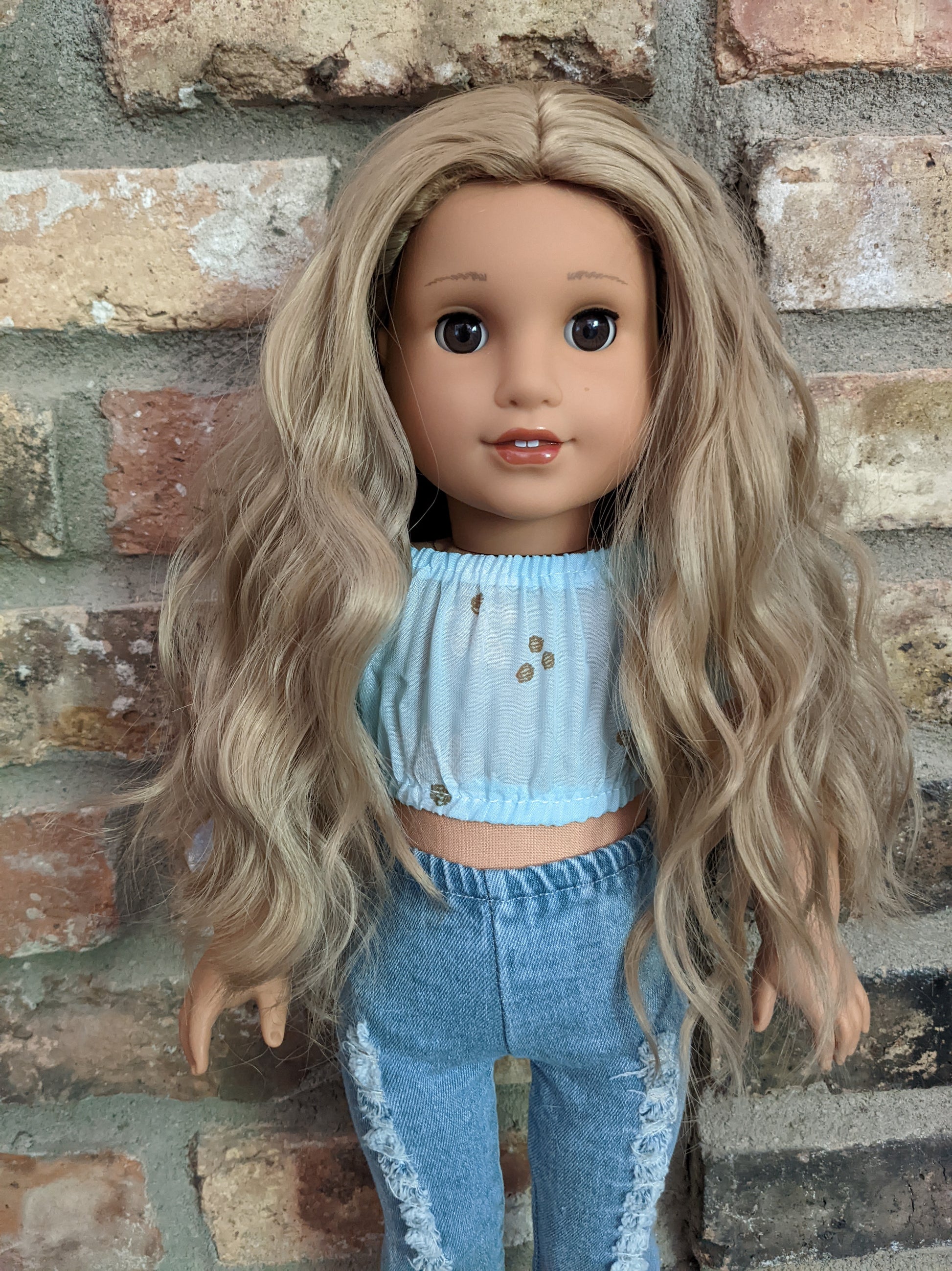 This one of a kind OOAK custom American Girl doll was created with a brand new Sparkling Ballerina doll, a blonde wavy wig, and brown eyes. She has lip gloss and a beauty mark that was hand painted and sealed. Her ears are pierced with normal earrings and the tiny diamond look studs are included. She may have some minor shine marks from handling. She comes with the outfit pictured.