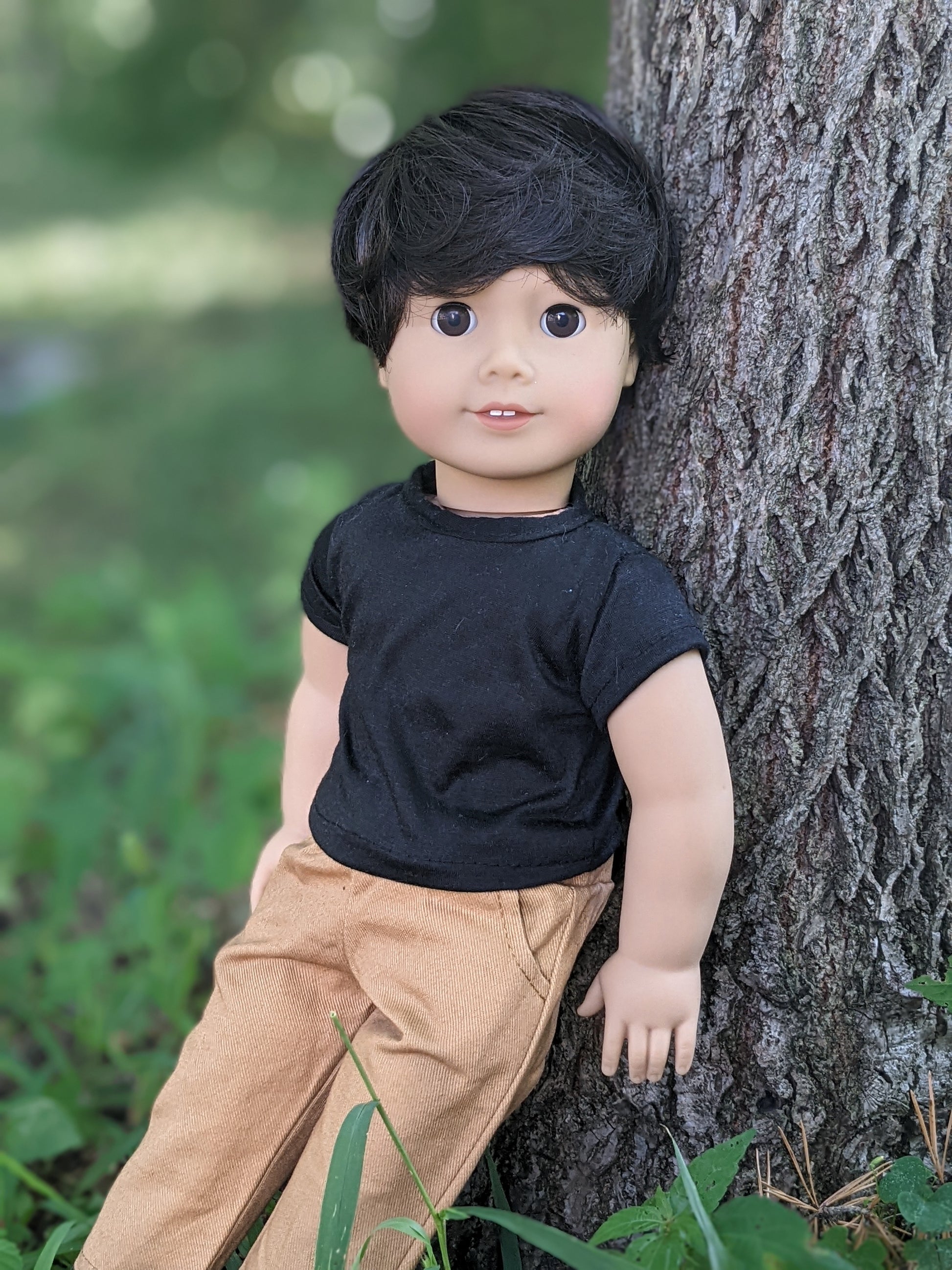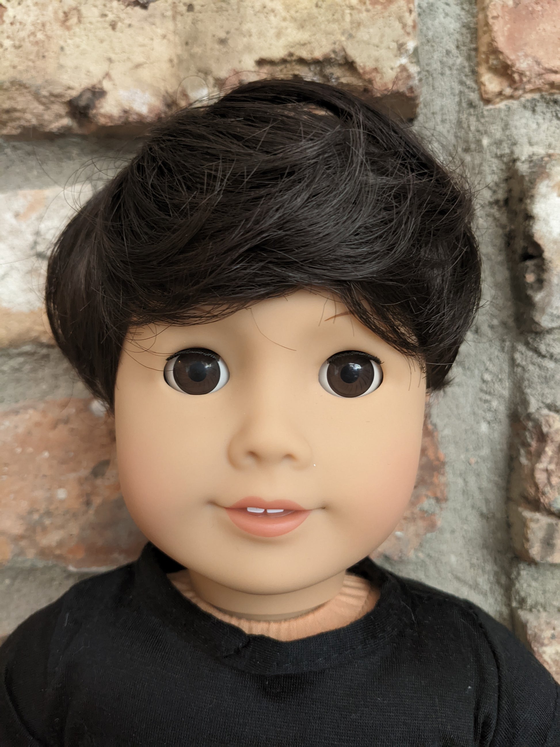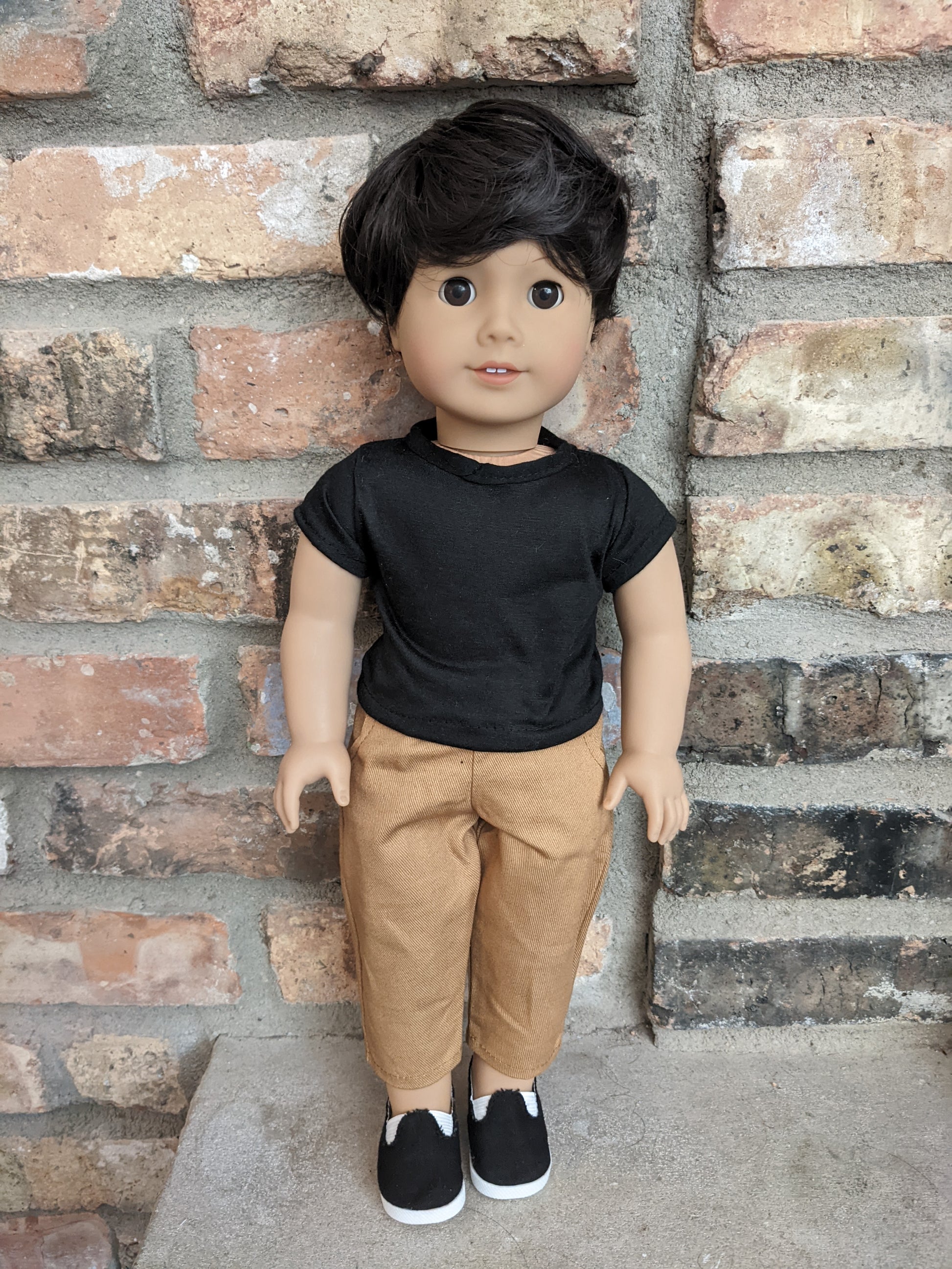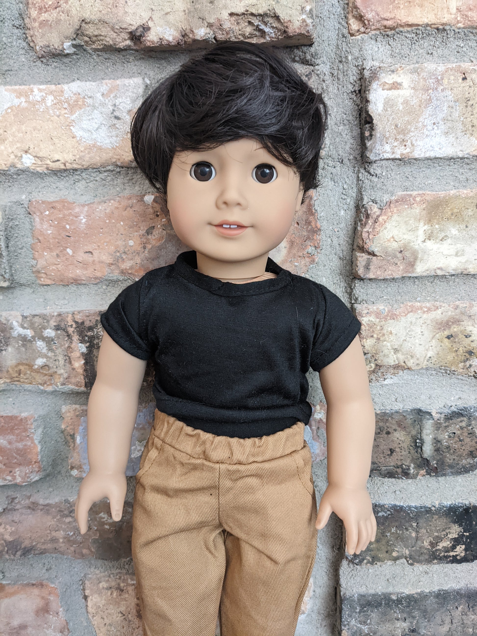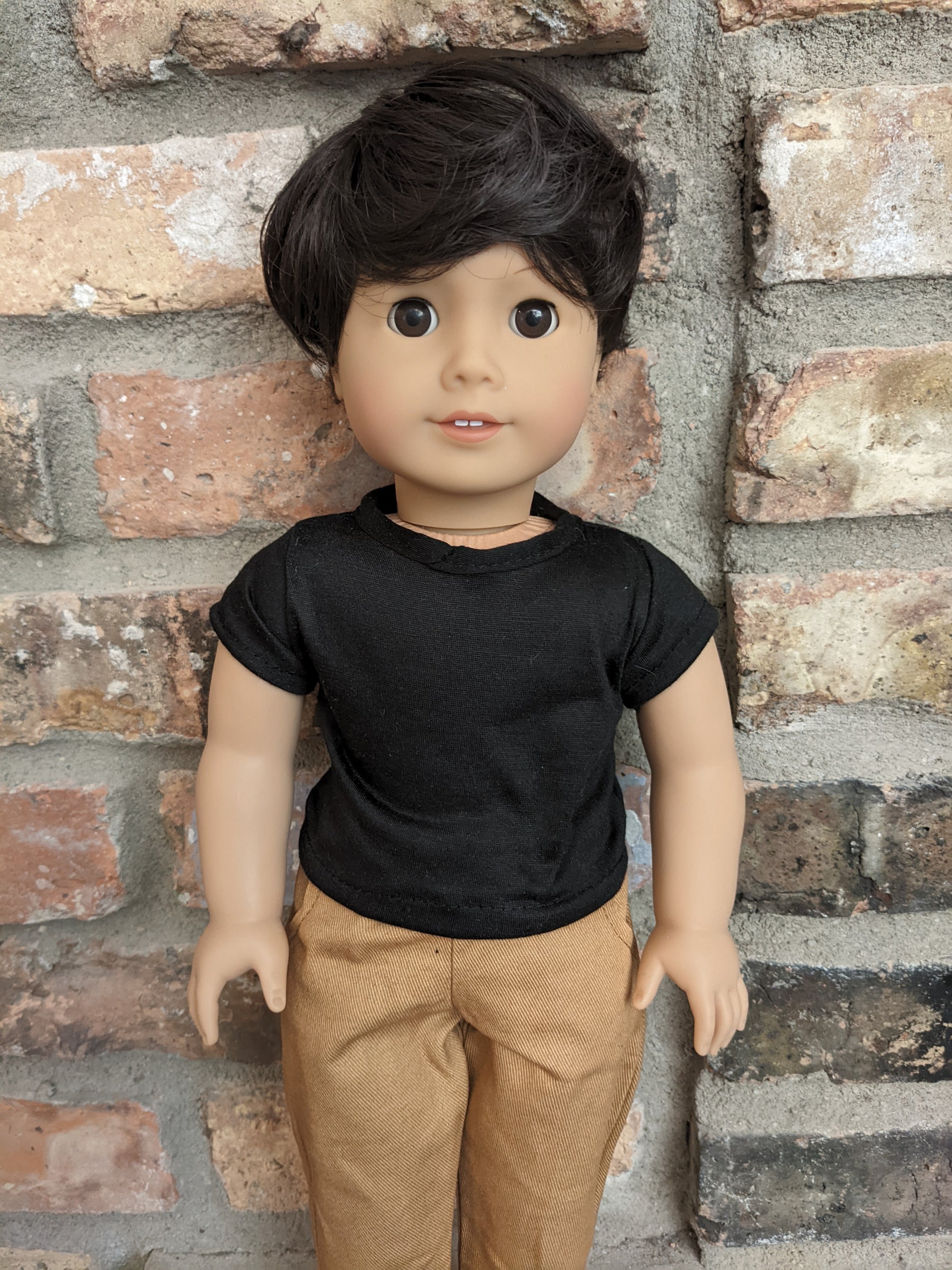 This one of a kind OOAK custom American Girl doll was created with a brand new Truly Me doll, a dark brown wig, and brown eyes. He may have some minor shine marks from handling. He comes with the outfit pictured. He has a microfiber cloth body.