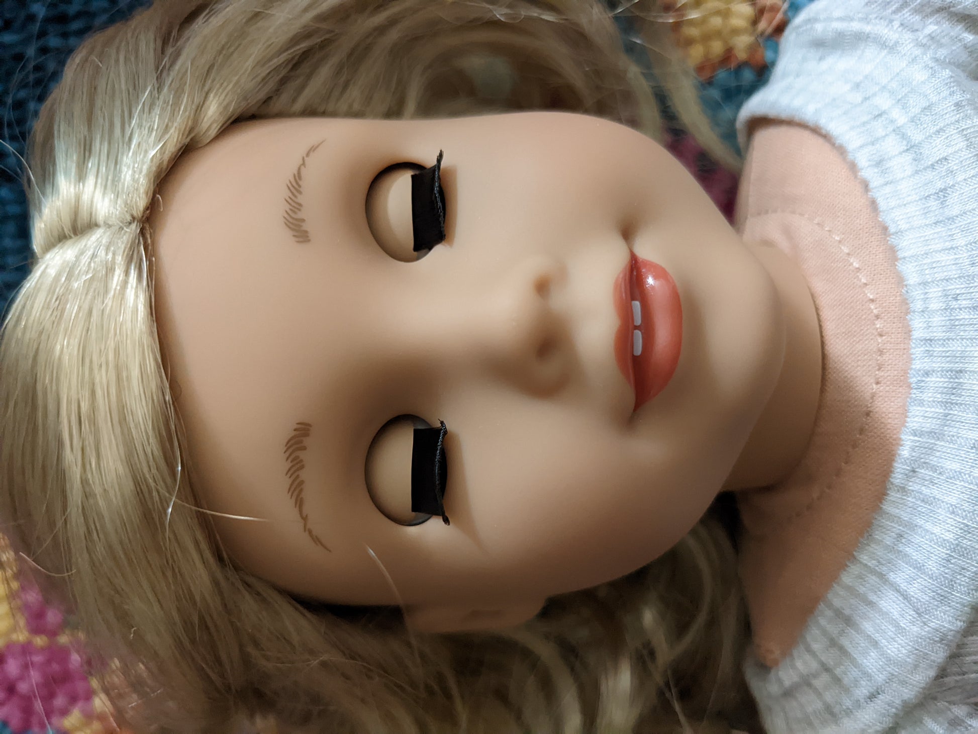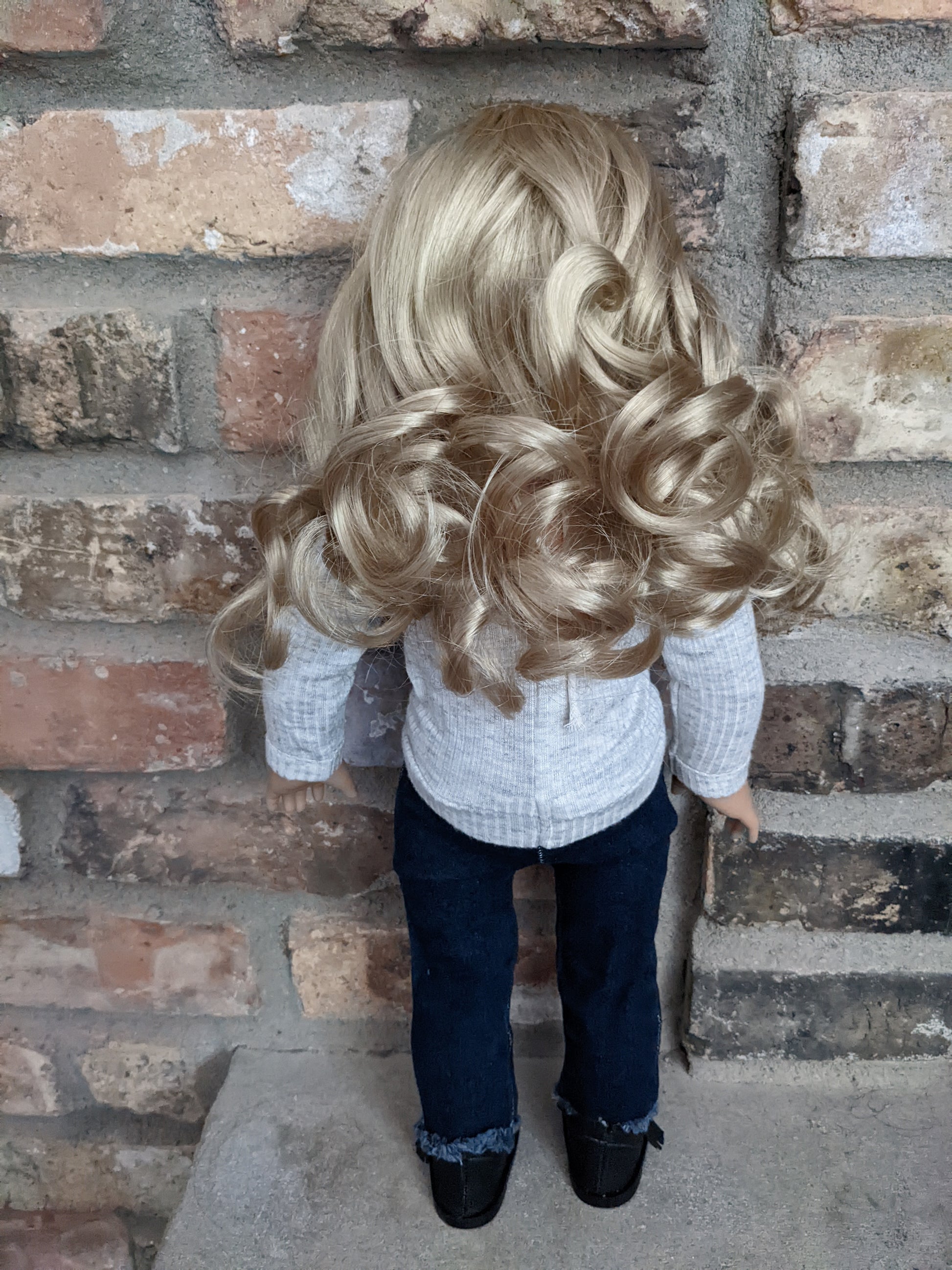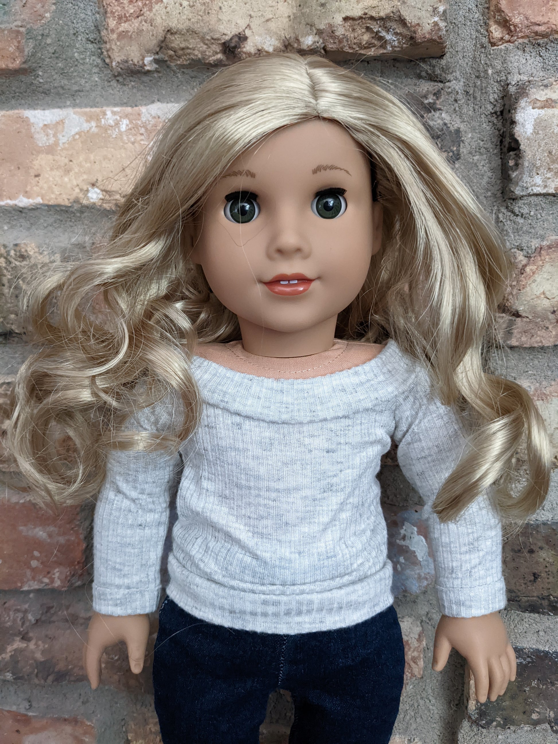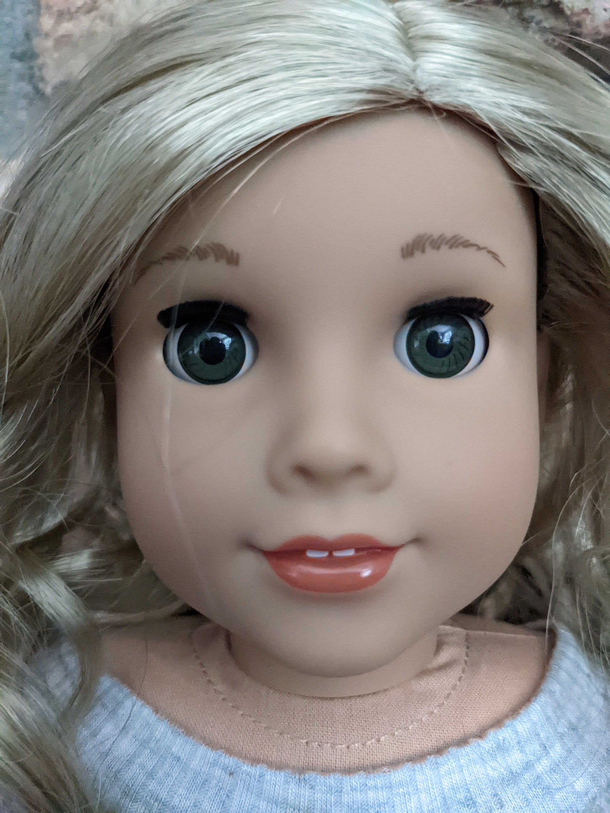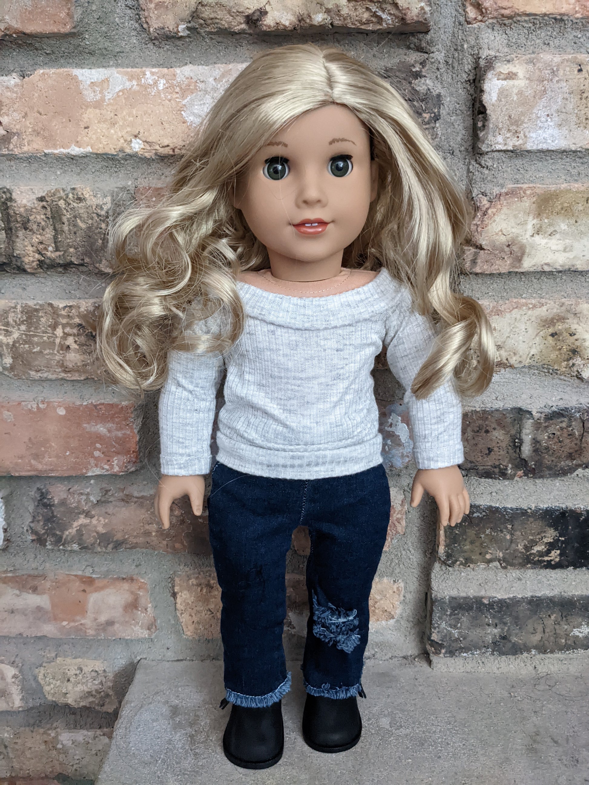 This one of a kind OOAK custom American Girl doll was created with a brand new Joss doll, a light blonde wig from a new TM doll, and green eyes. She has lip gloss that was hand painted and sealed. She may have some minor shine marks from handling. She comes with the outfit pictured.