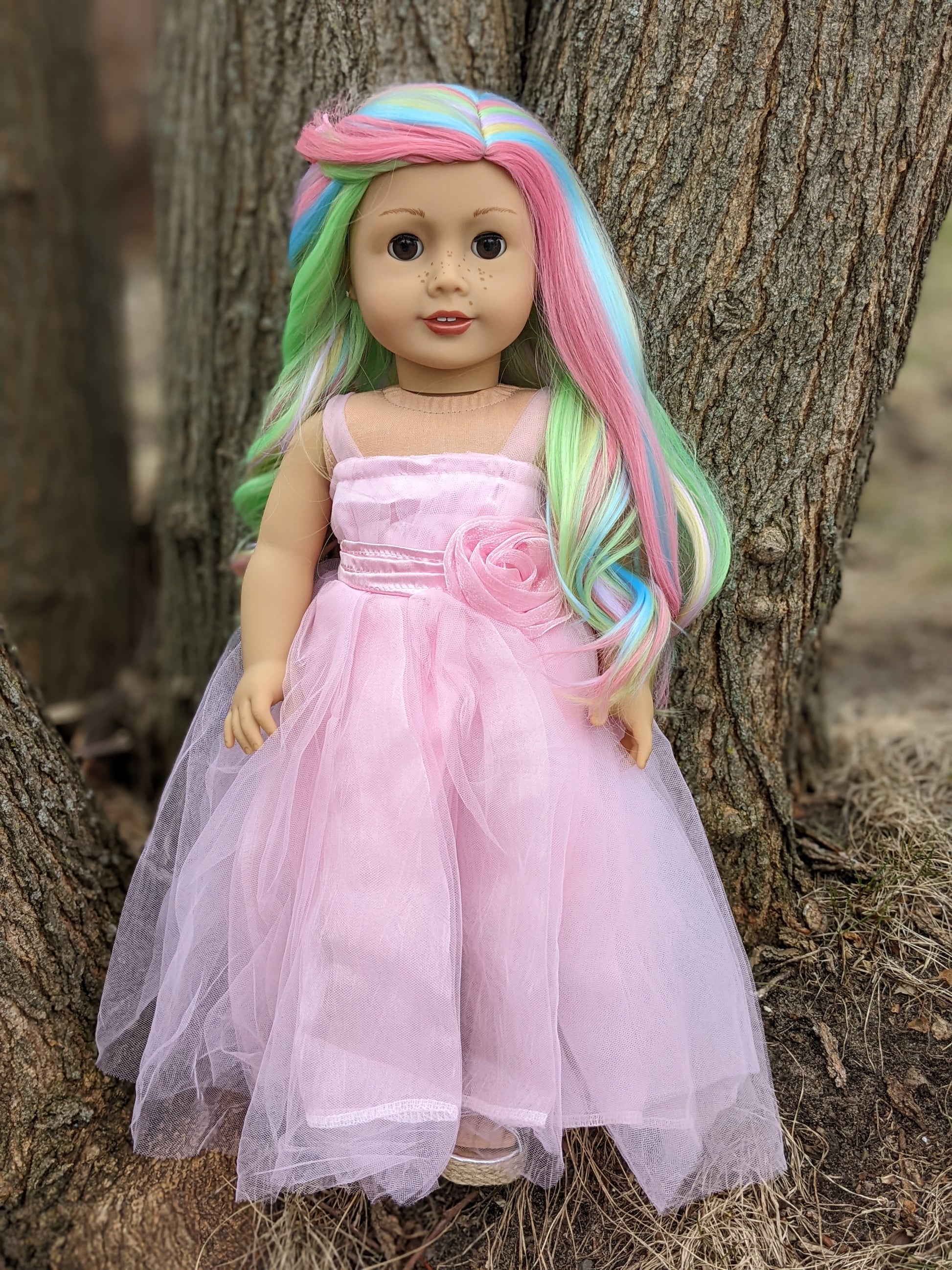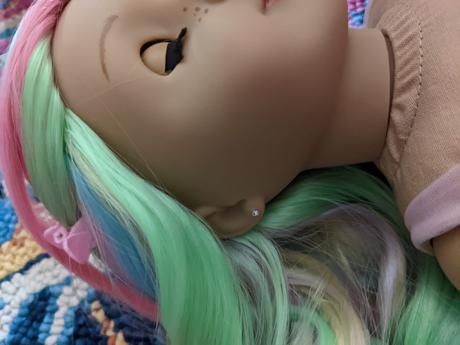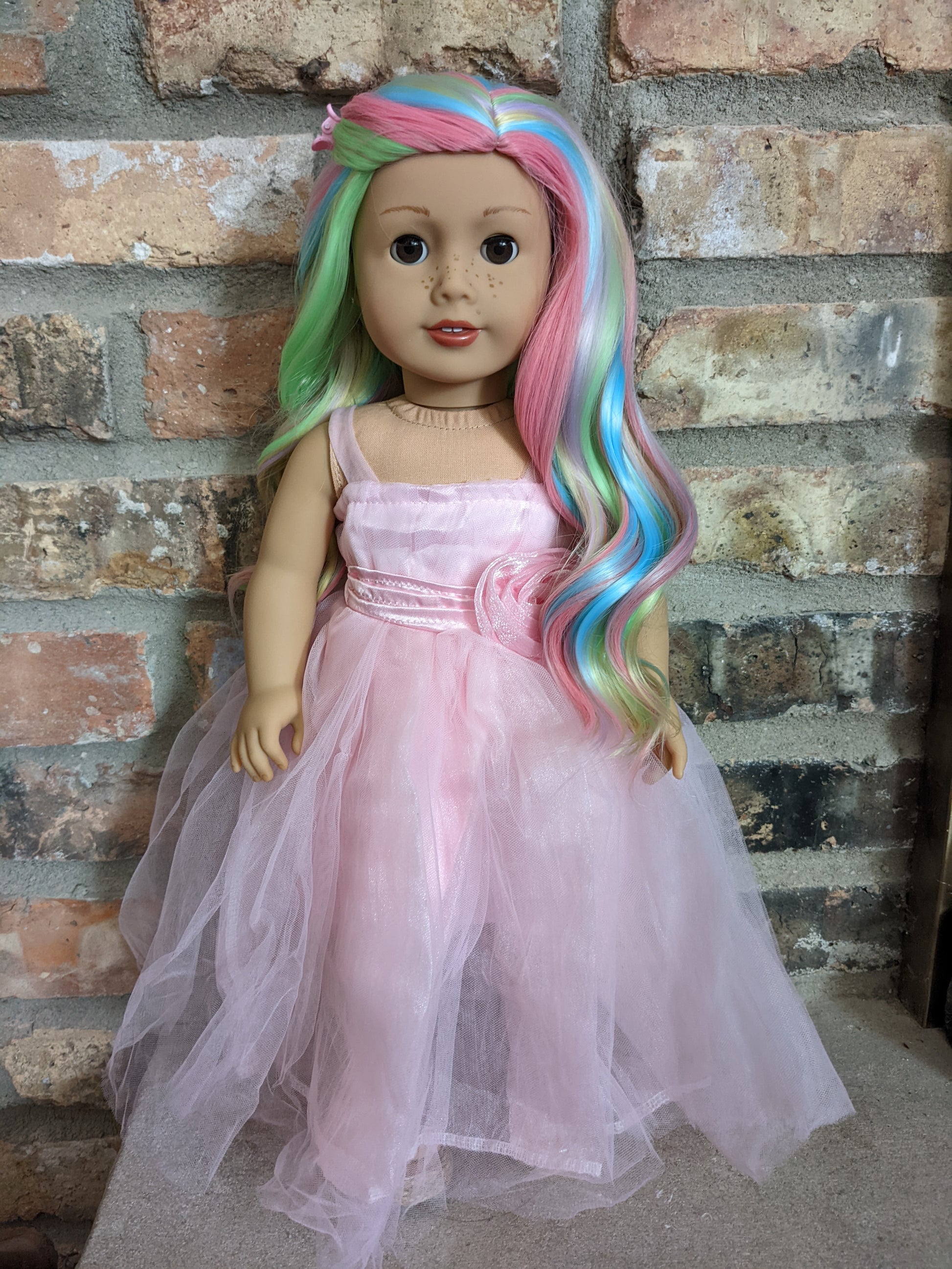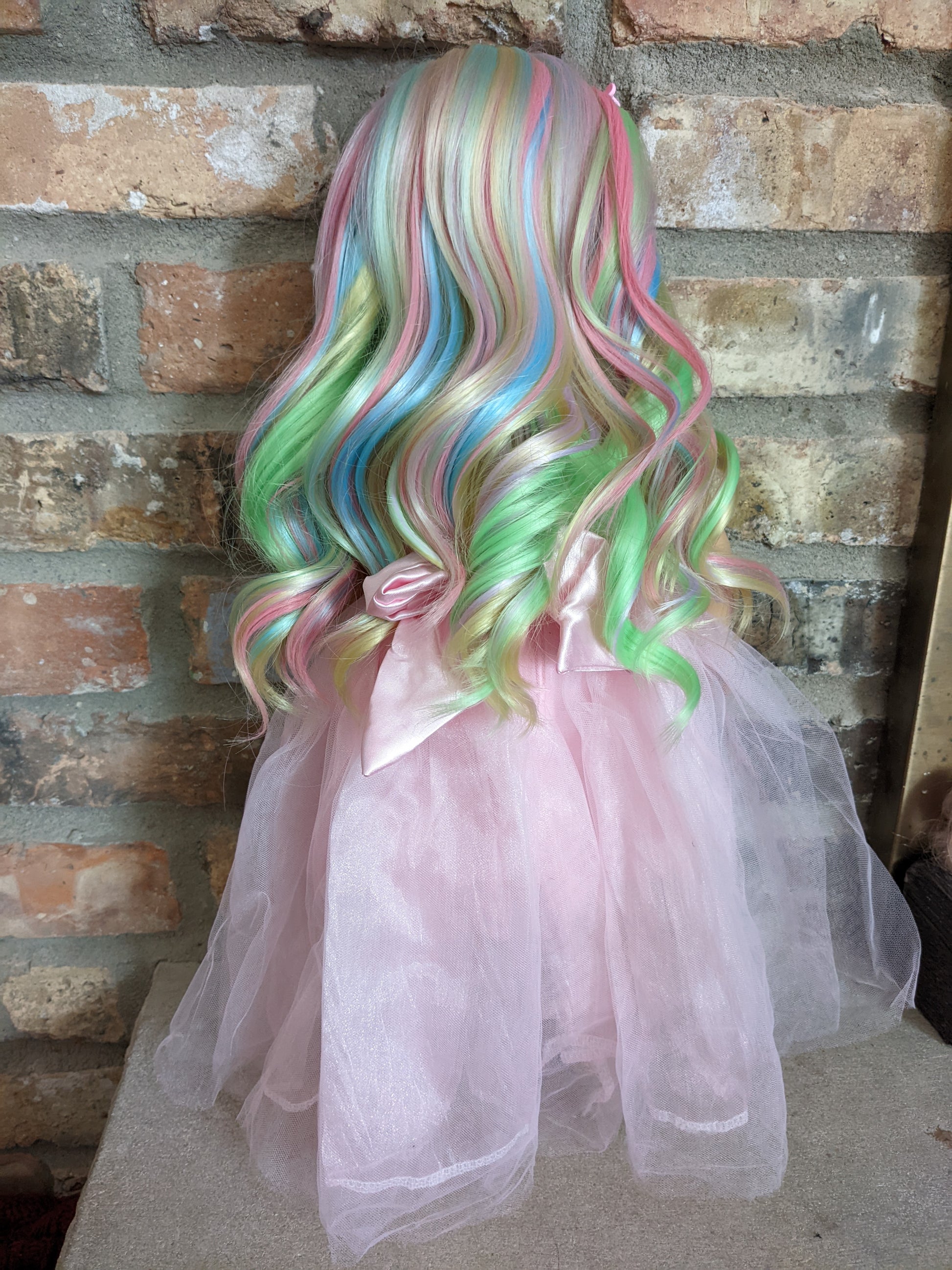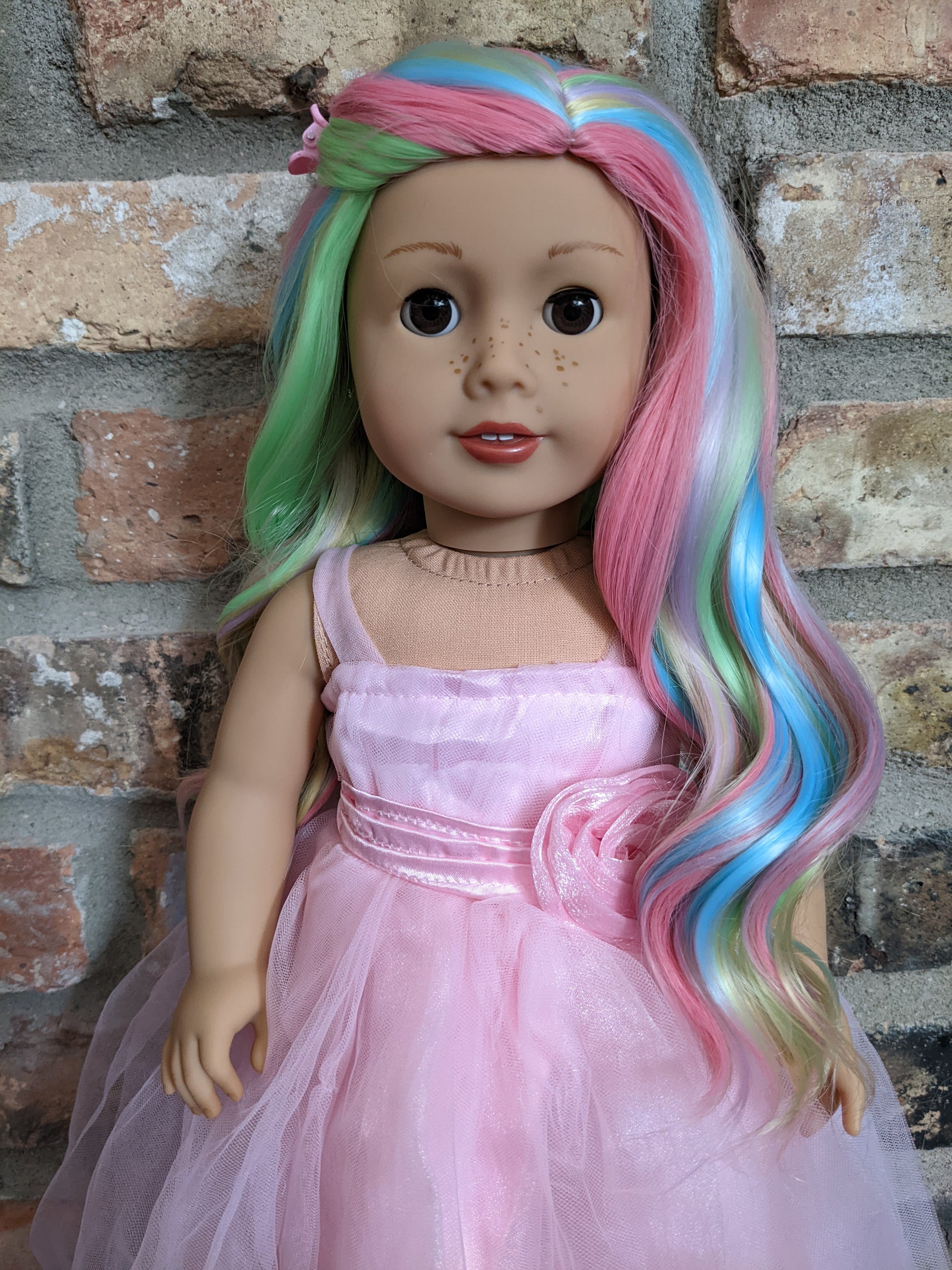 This one of a kind OOAK custom American Girl doll was created with a brand new Tenney doll, a new pastel rainbow wig, and brown eyes. She has lip gloss that was hand painted and sealed. She may have some minor shine marks from handling and she has a tiny x on her bum. Her ears are pierced with normal earrings and the tiny diamond look studs are included. She comes with the outfit pictured. If you would like the wig left unattached, please leave a note in the "Order Special Instructions" box upon checkout. Otherwise I will attach the wig using a heavy duty permanent adhesive for a strong hold.