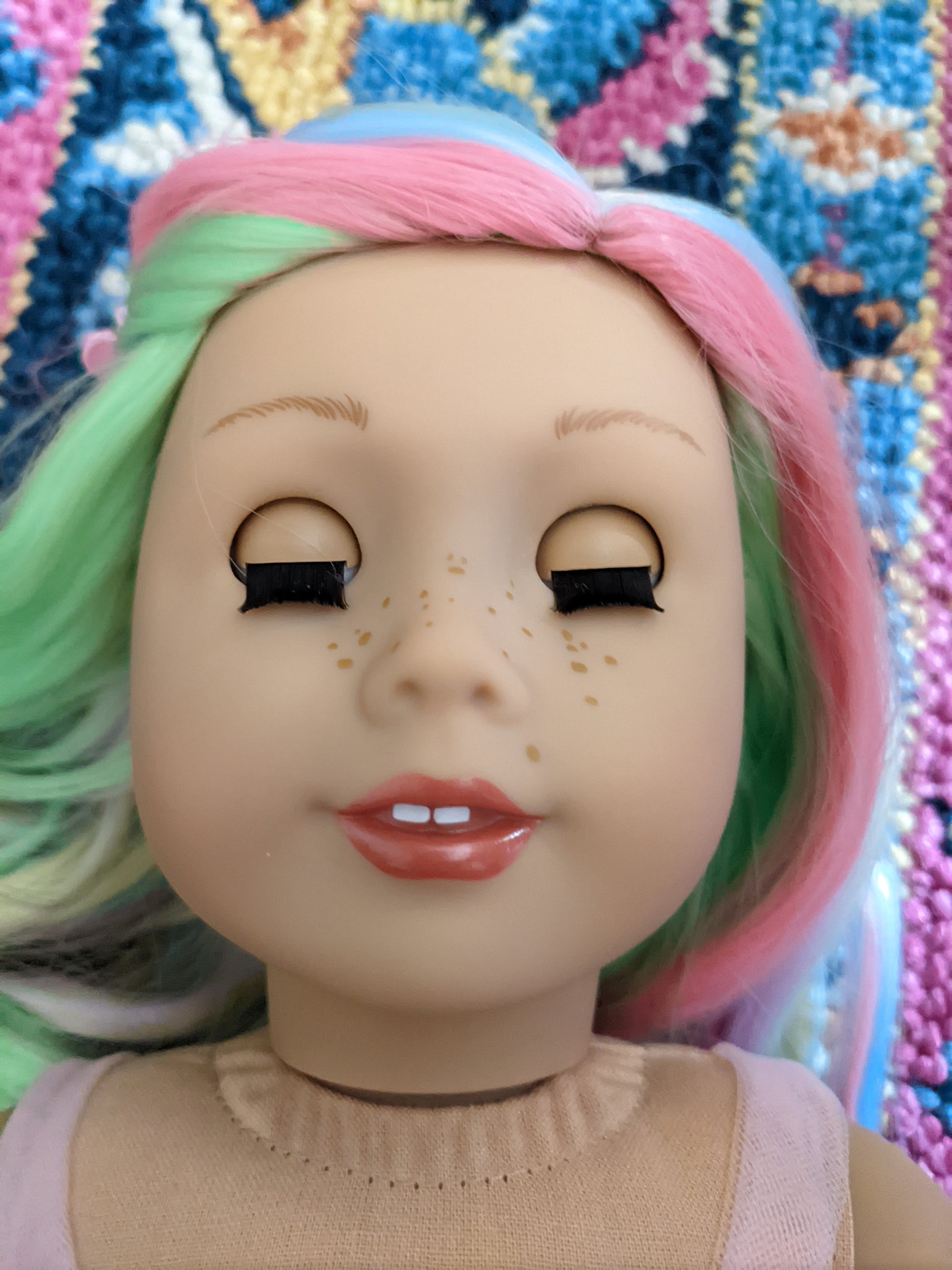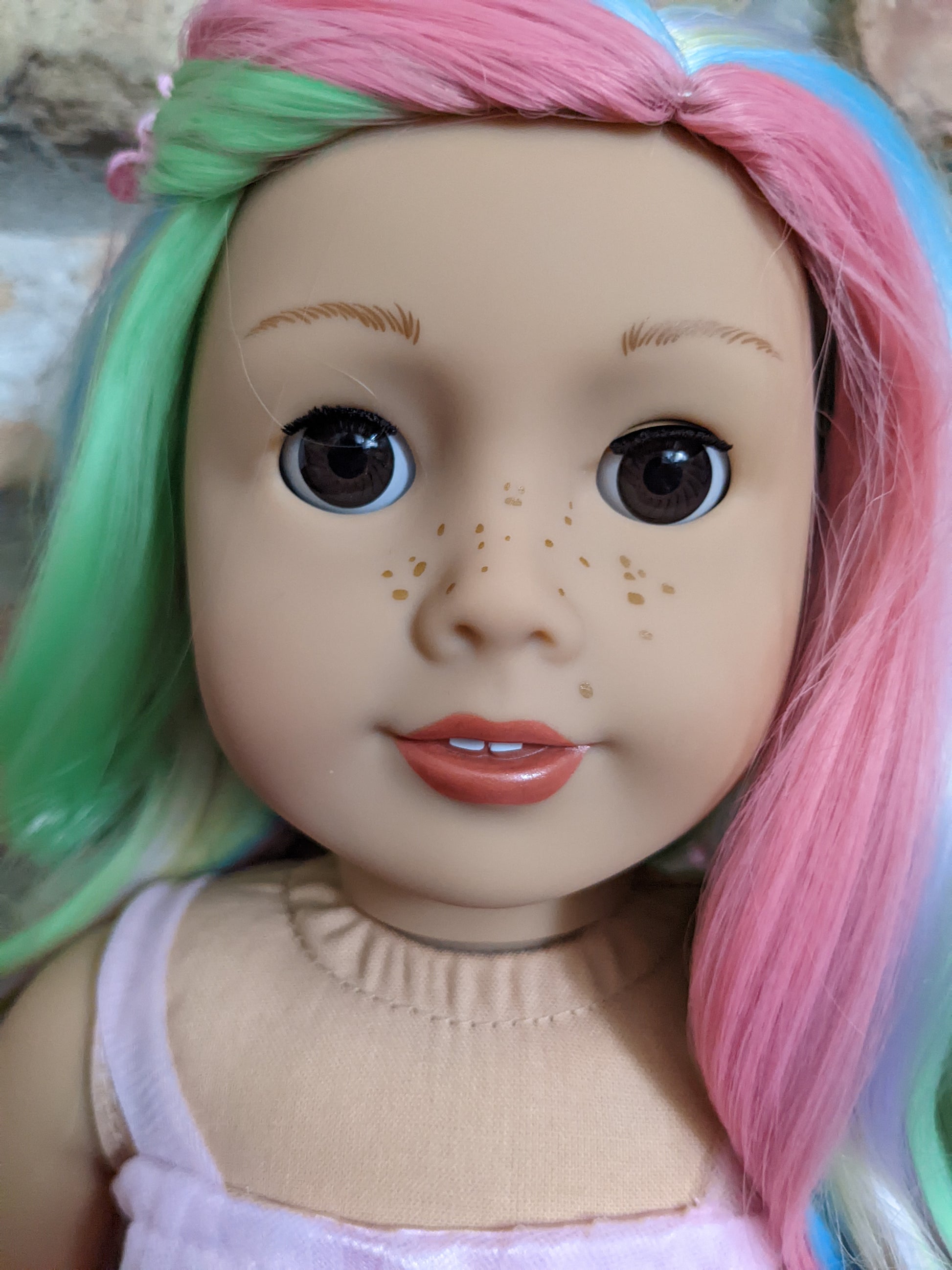 Cora - pastel rainbow hair, brown eyes, light skin tone, classic face mold, freckles.