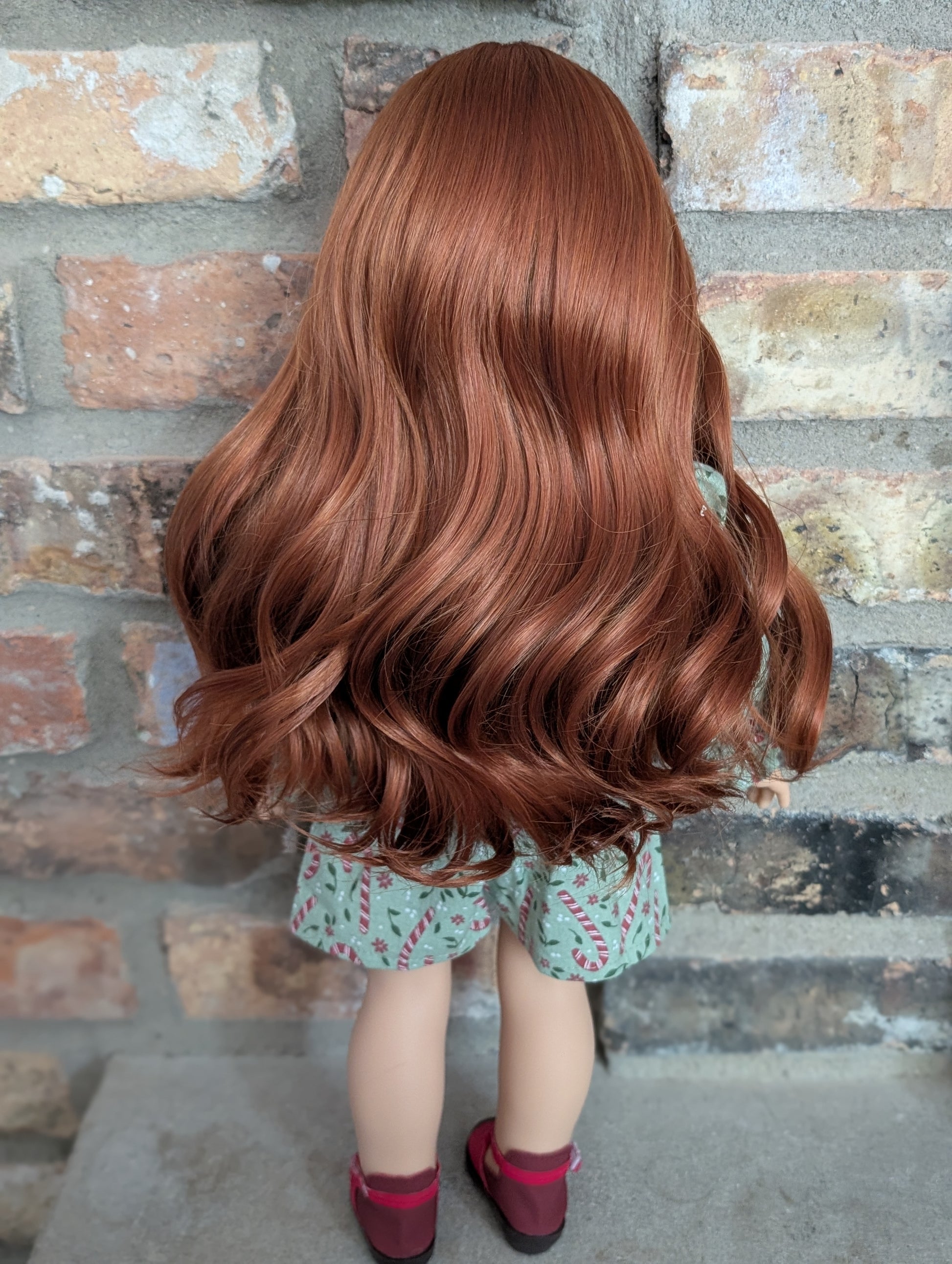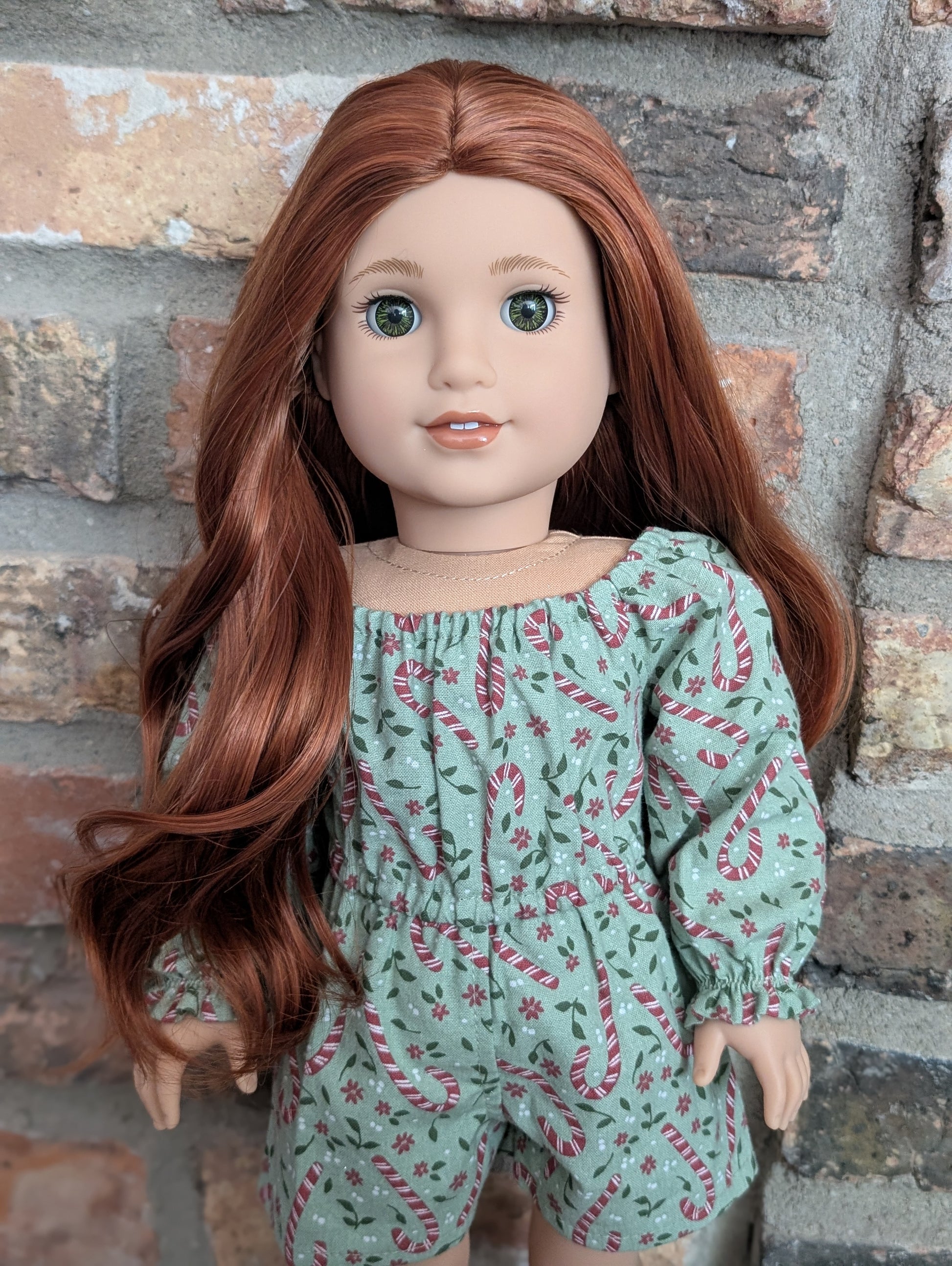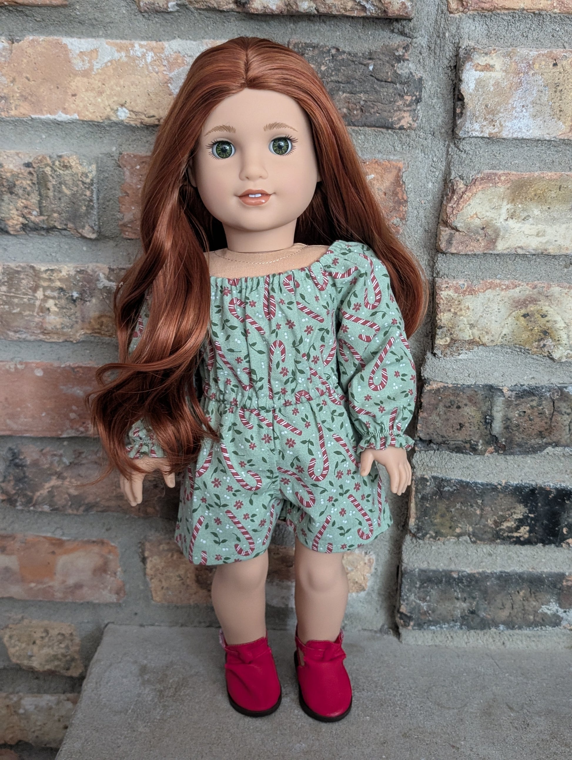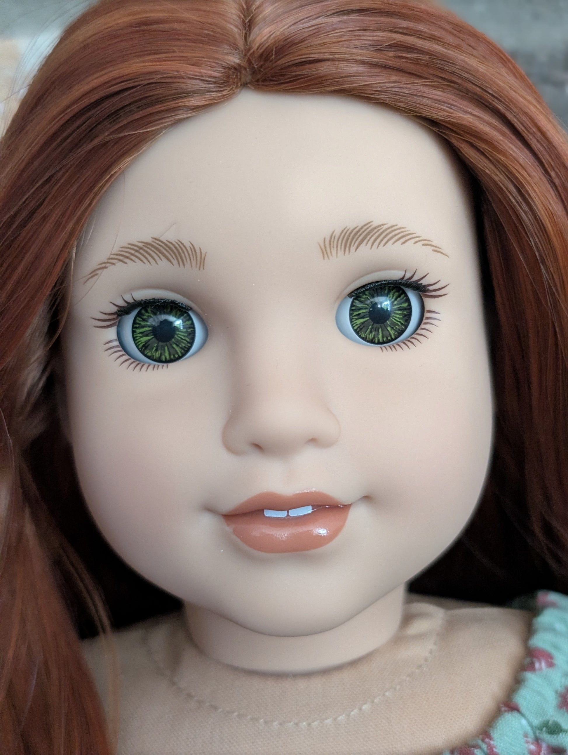 This one of a kind OOAK custom American Girl doll was created with a brand new doll, a red wig, and hazel eyes. She has lip gloss that was hand painted and sealed. She may have some minor shine marks from handling. She comes with the outfit pictured.