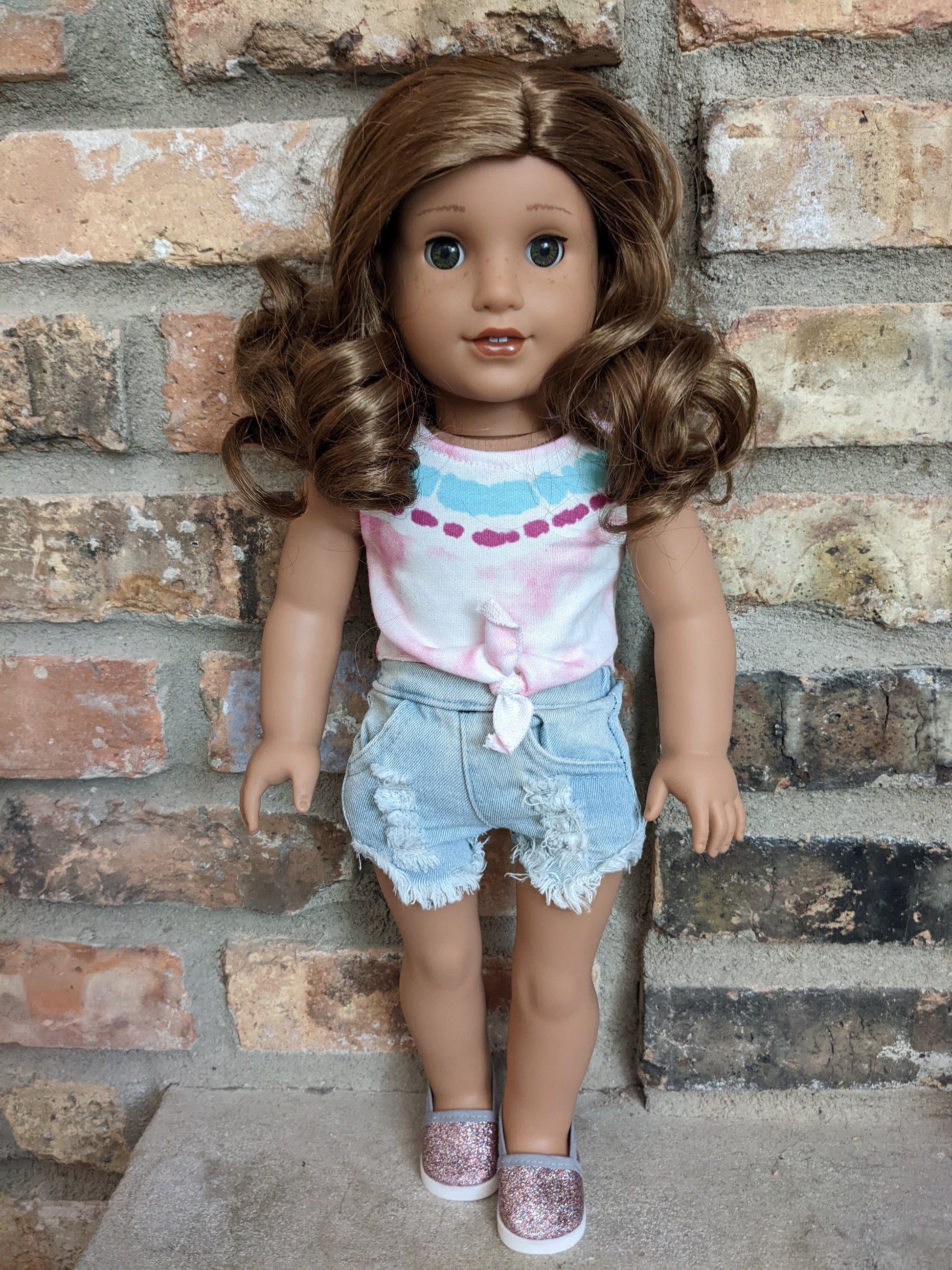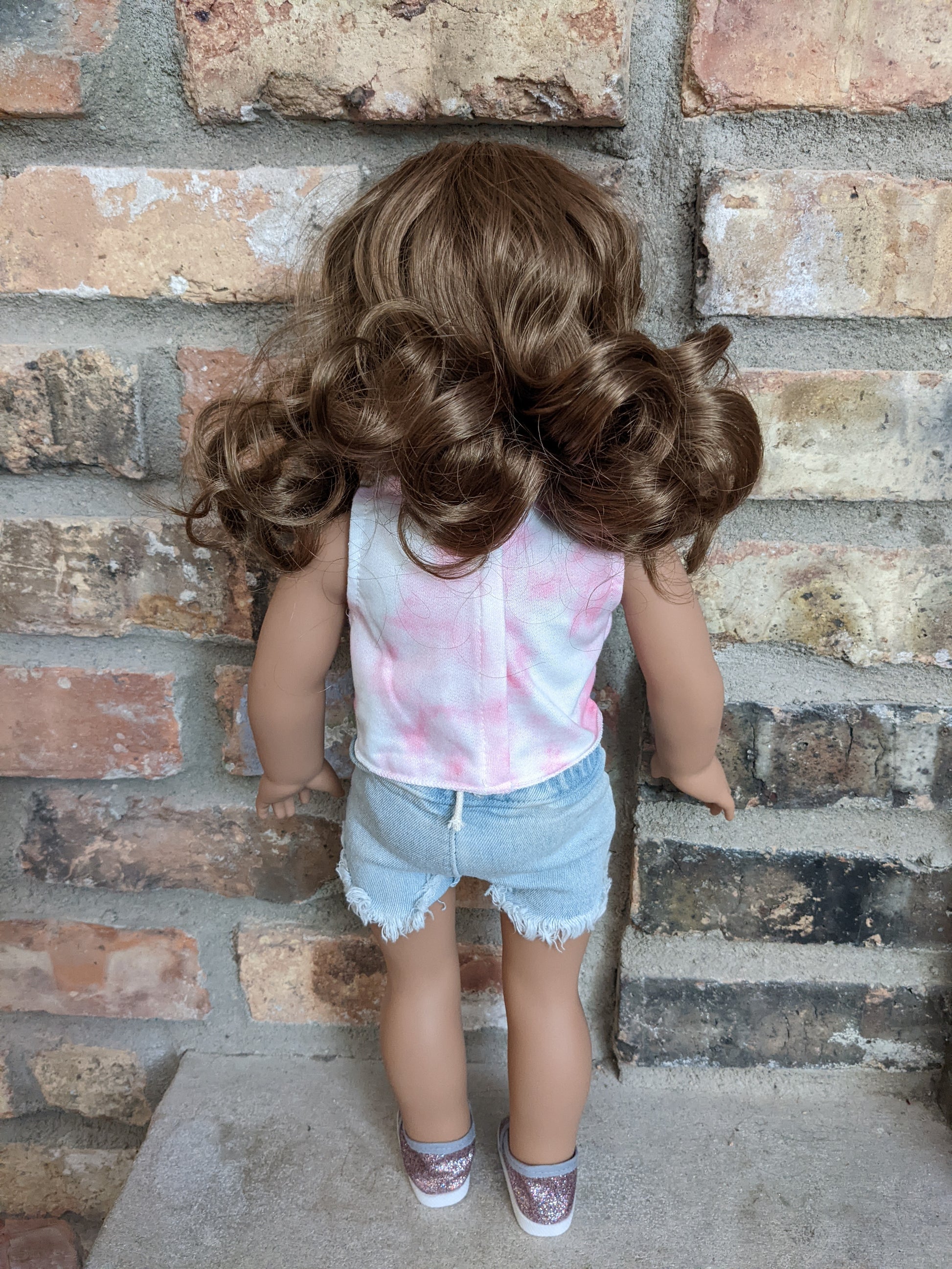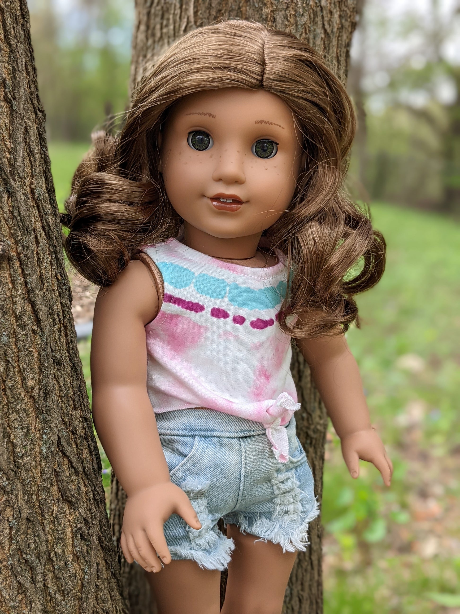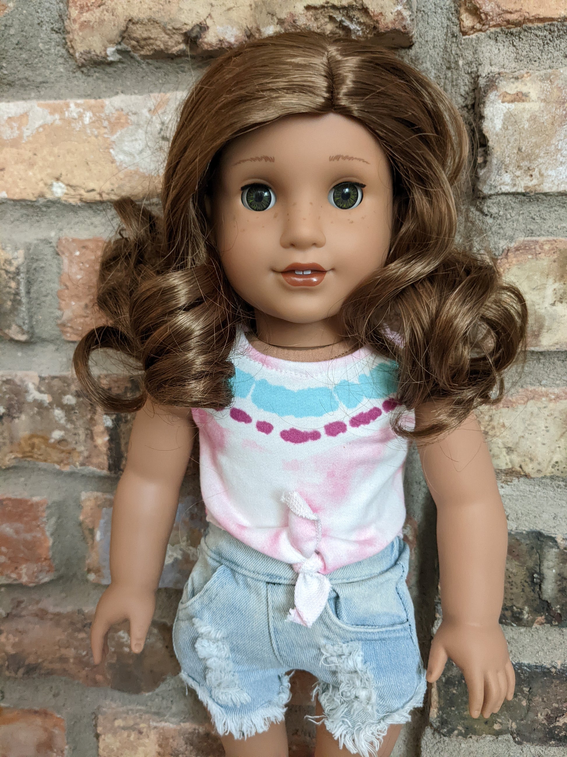 This one of a kind OOAK custom American Girl doll was created with a brand new TM 89 doll, a brown curly wig from a new Rebecca doll, and hazel eyes. She has lip gloss  and freckles that were hand painted and sealed. She may have some minor shine marks from handling. She comes with the outfit pictured. If you would like the wig left unattached, please leave a note in the "Order Special Instructions" box upon checkout. Otherwise I will attach the wig using a heavy duty permanent adhesive for a strong hold.