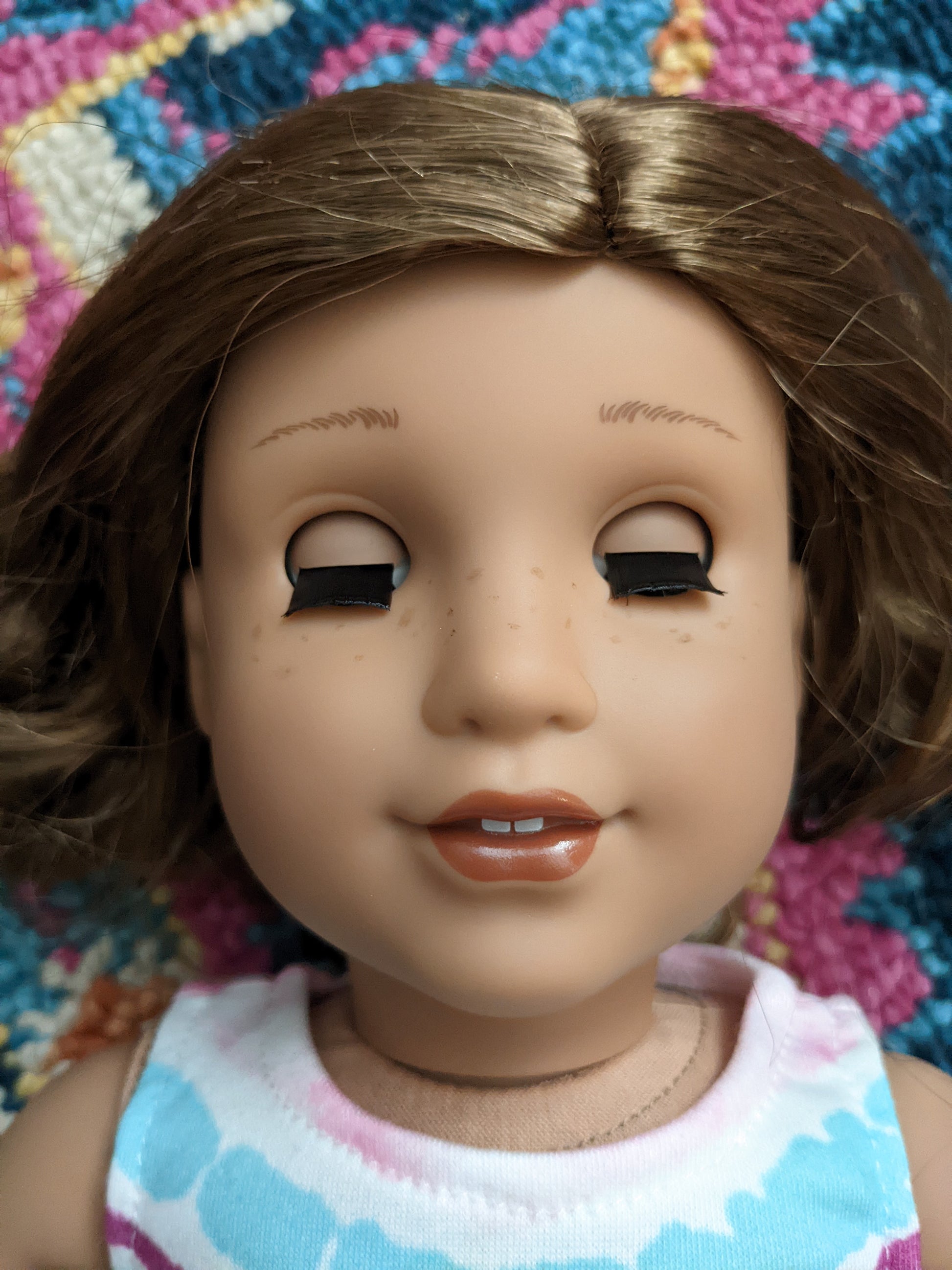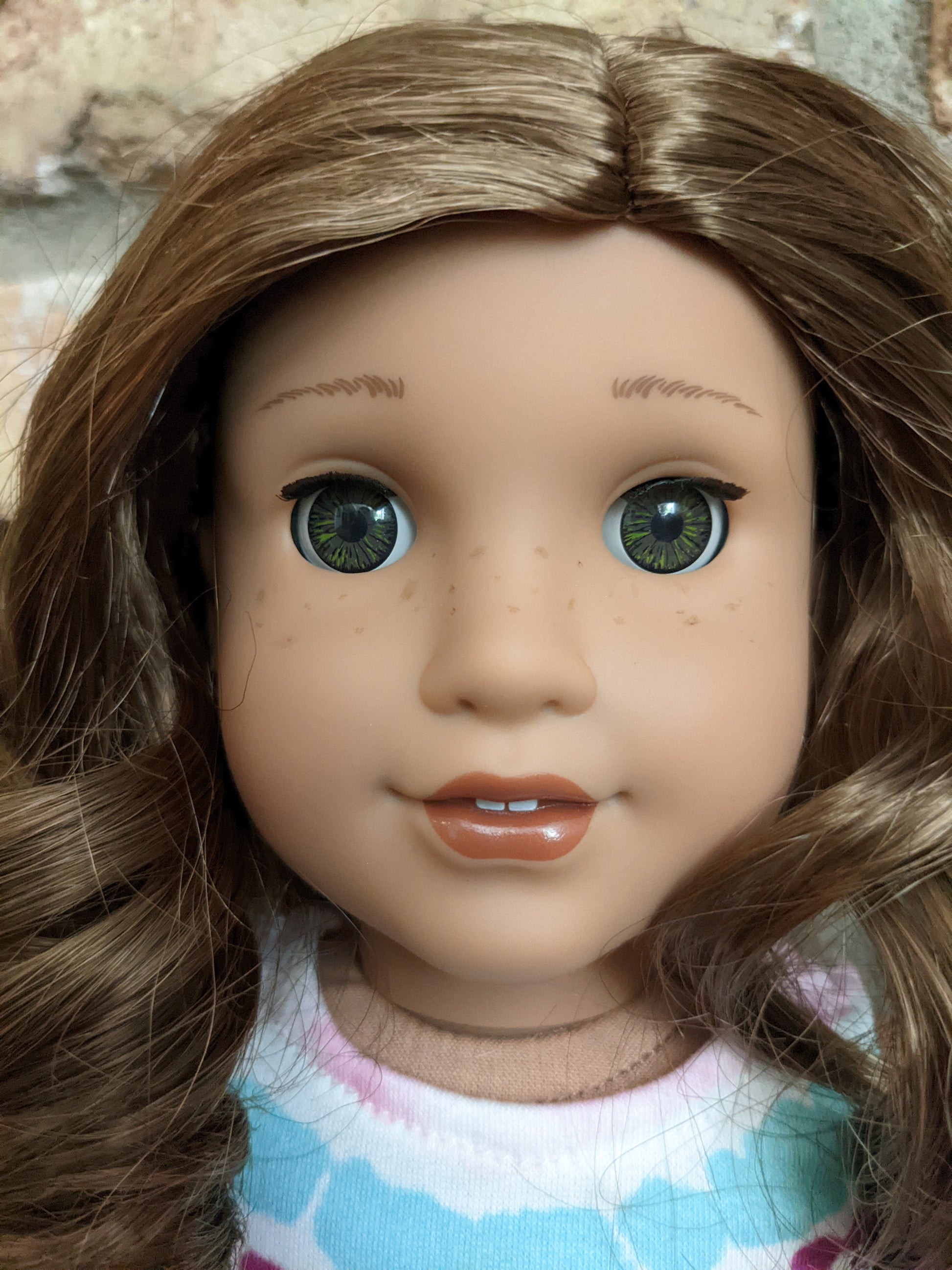 Emerson - brown curly hair, hazel eyes, medium skin tone, Josefina face mold, freckles