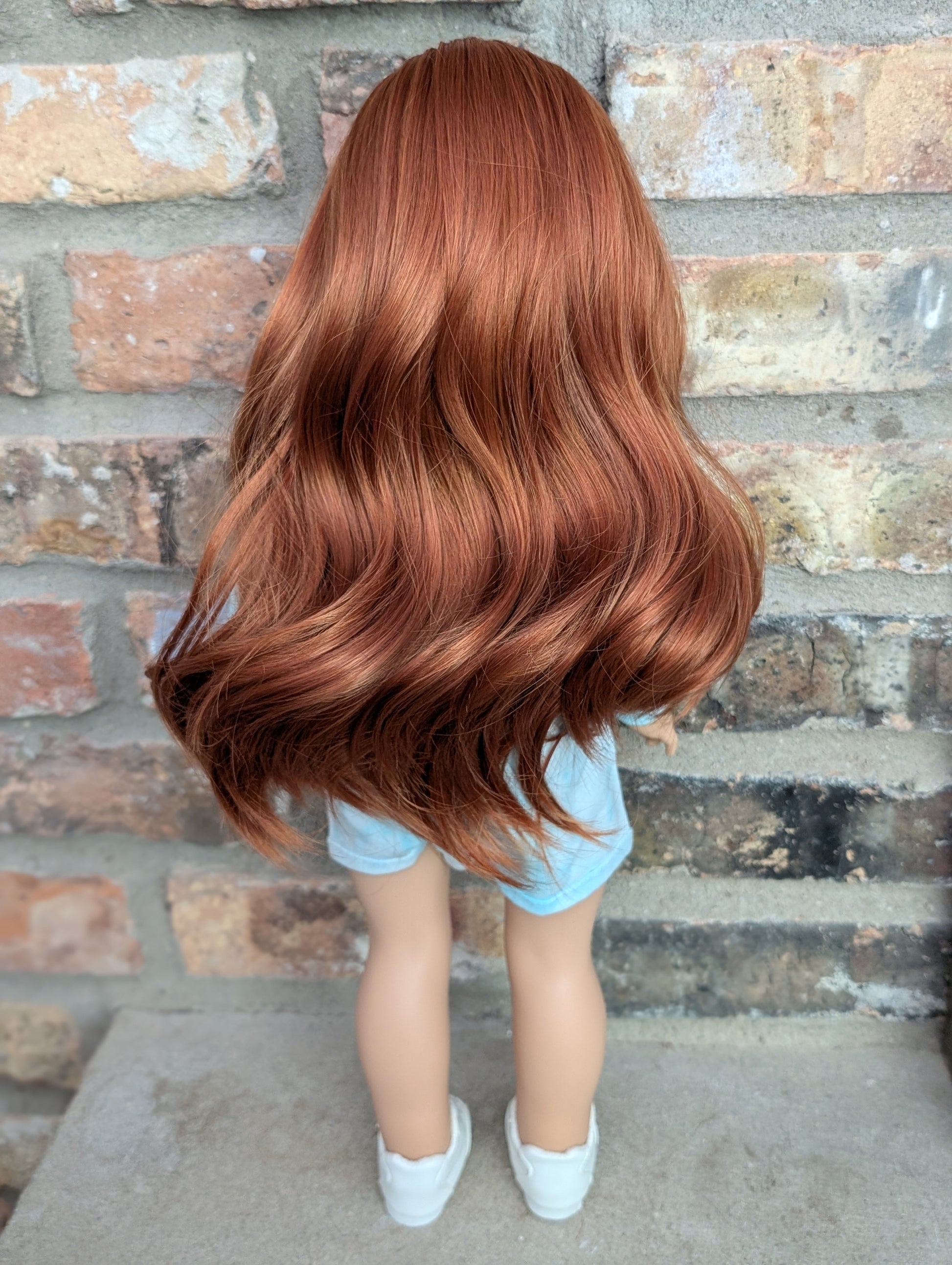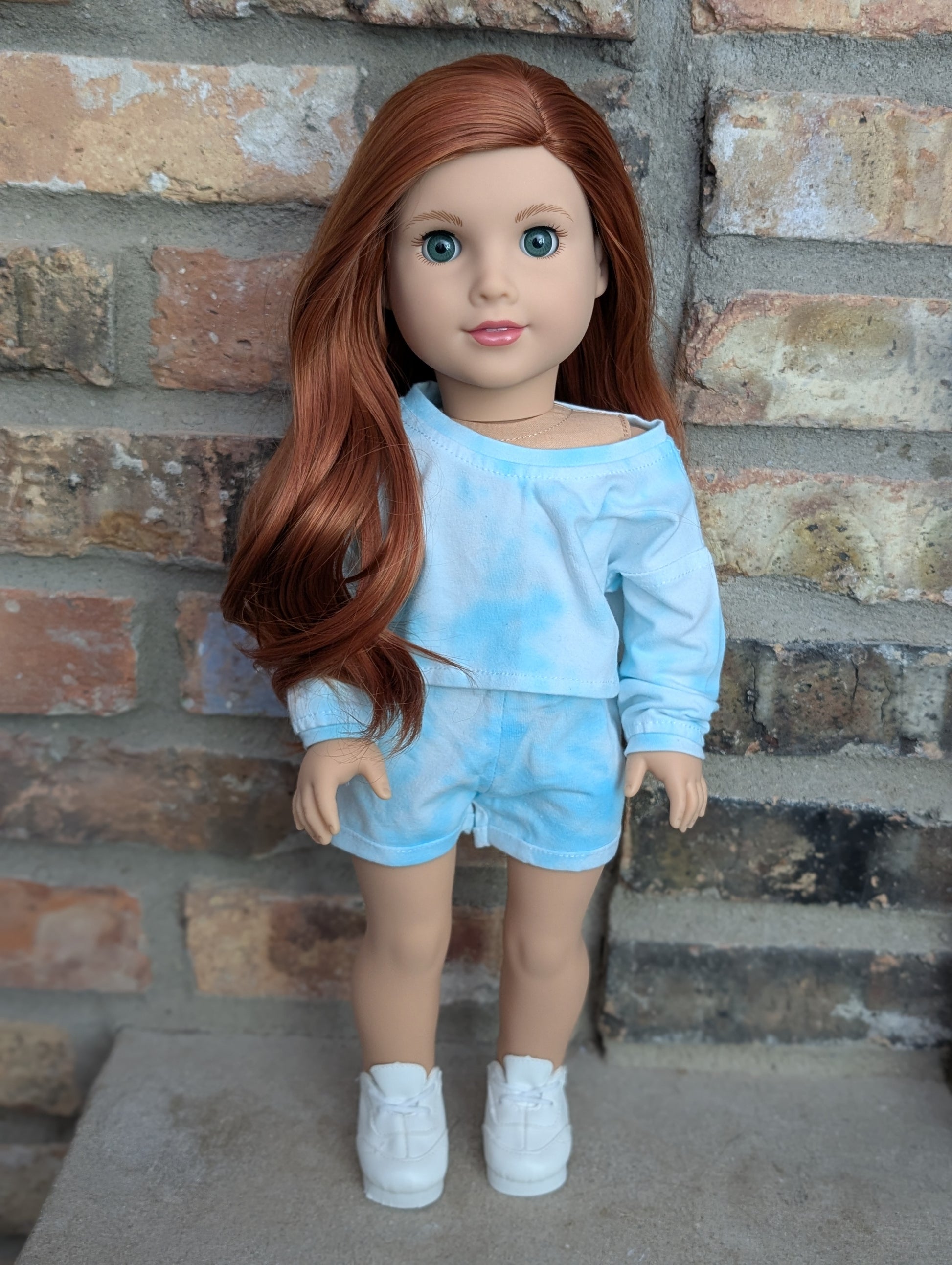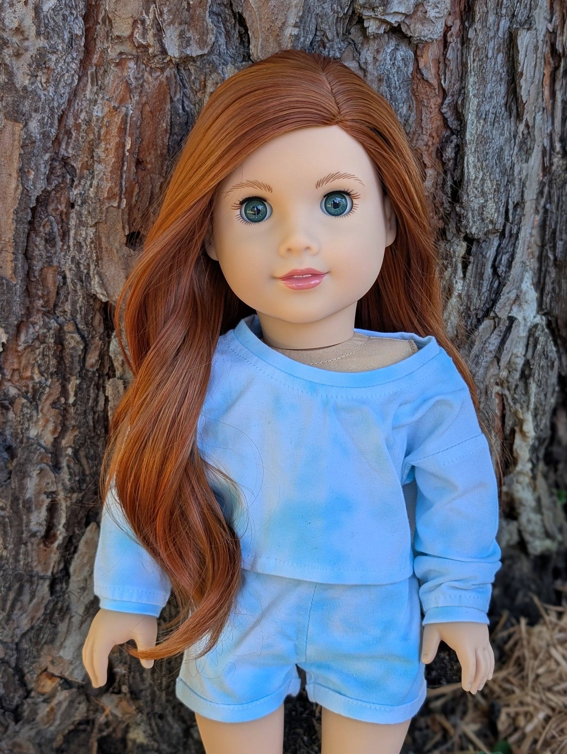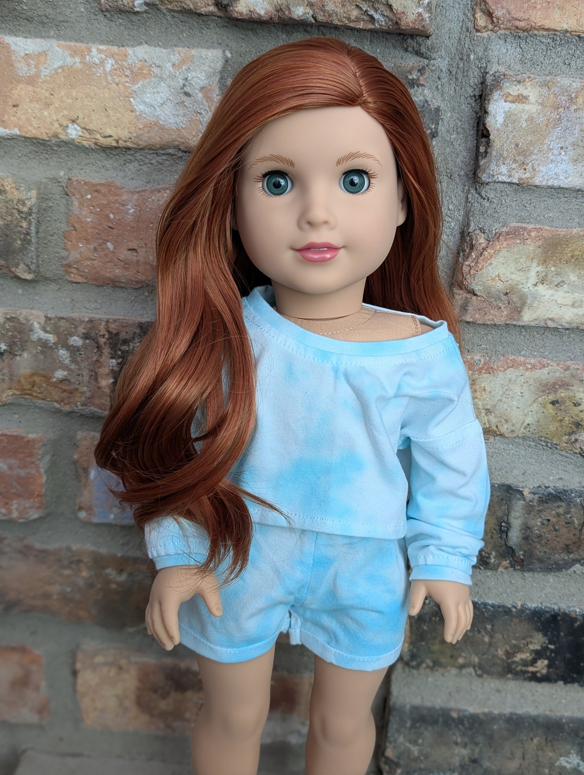 This one of a kind OOAK custom American Girl doll was created with a brand new Long Hair Looks doll, a red wig, and grey green from a Rapunzel doll. She has lip gloss that was hand painted and sealed. She may have some minor shine marks from handling. She comes with the outfit pictured.