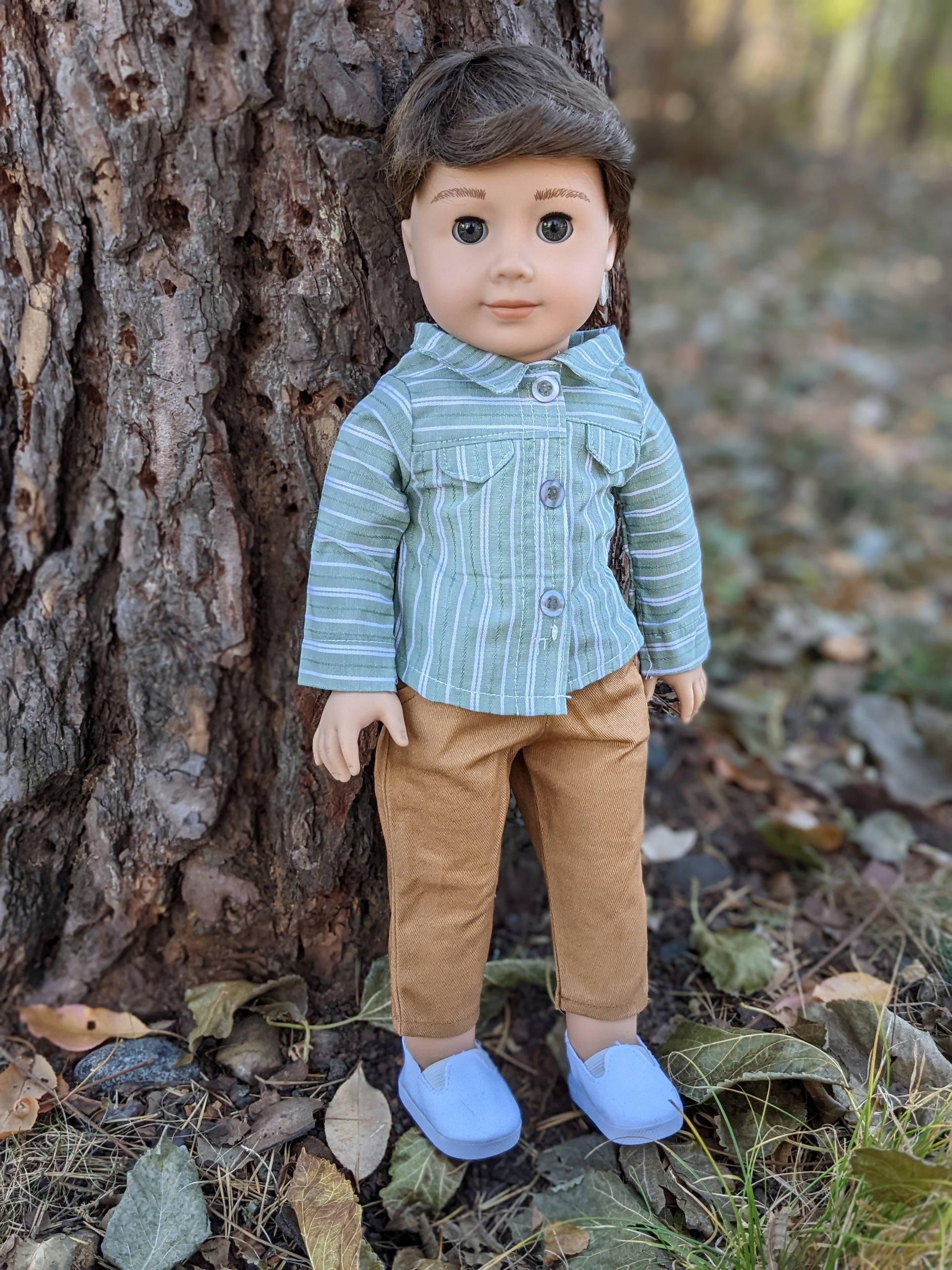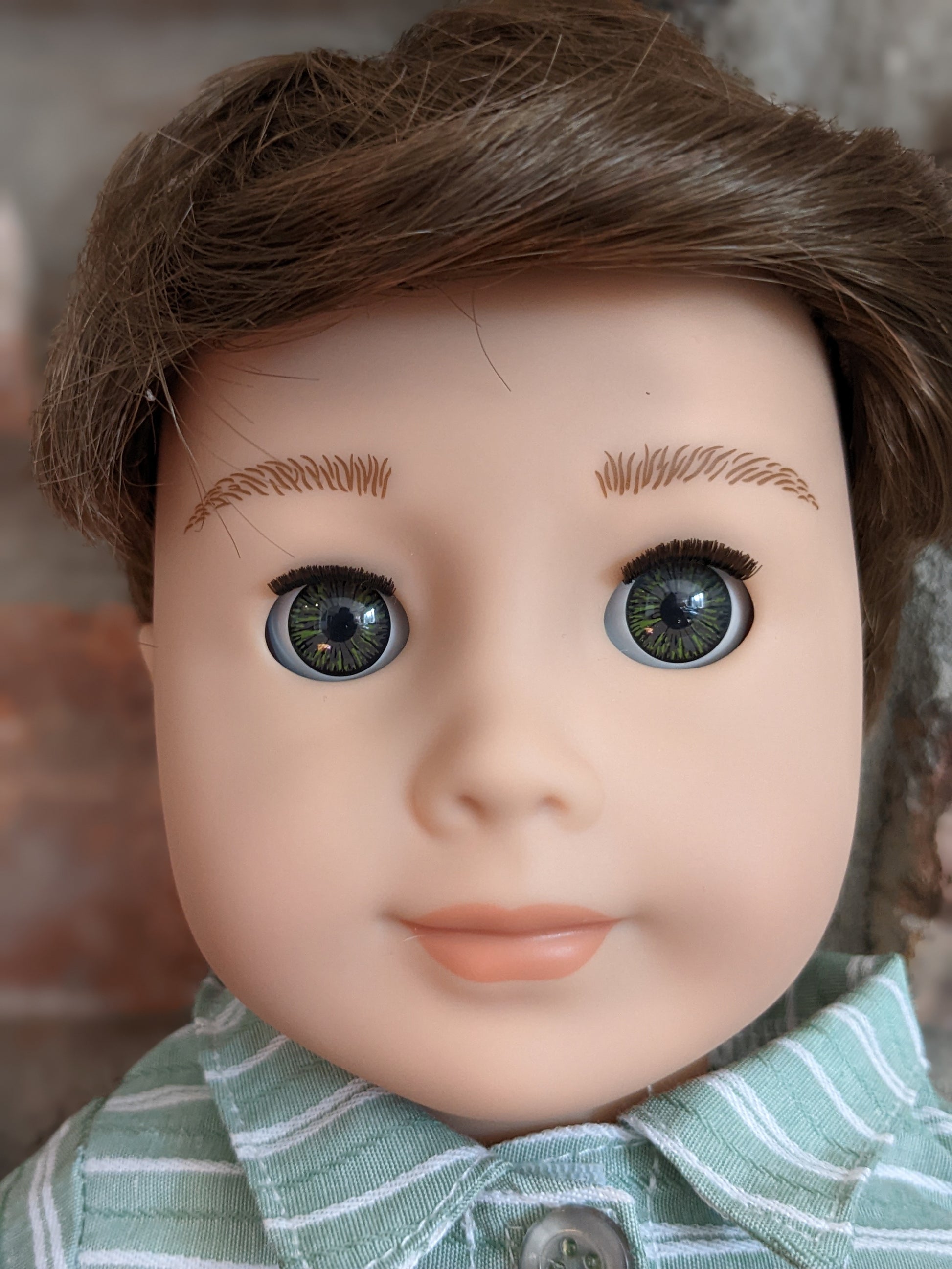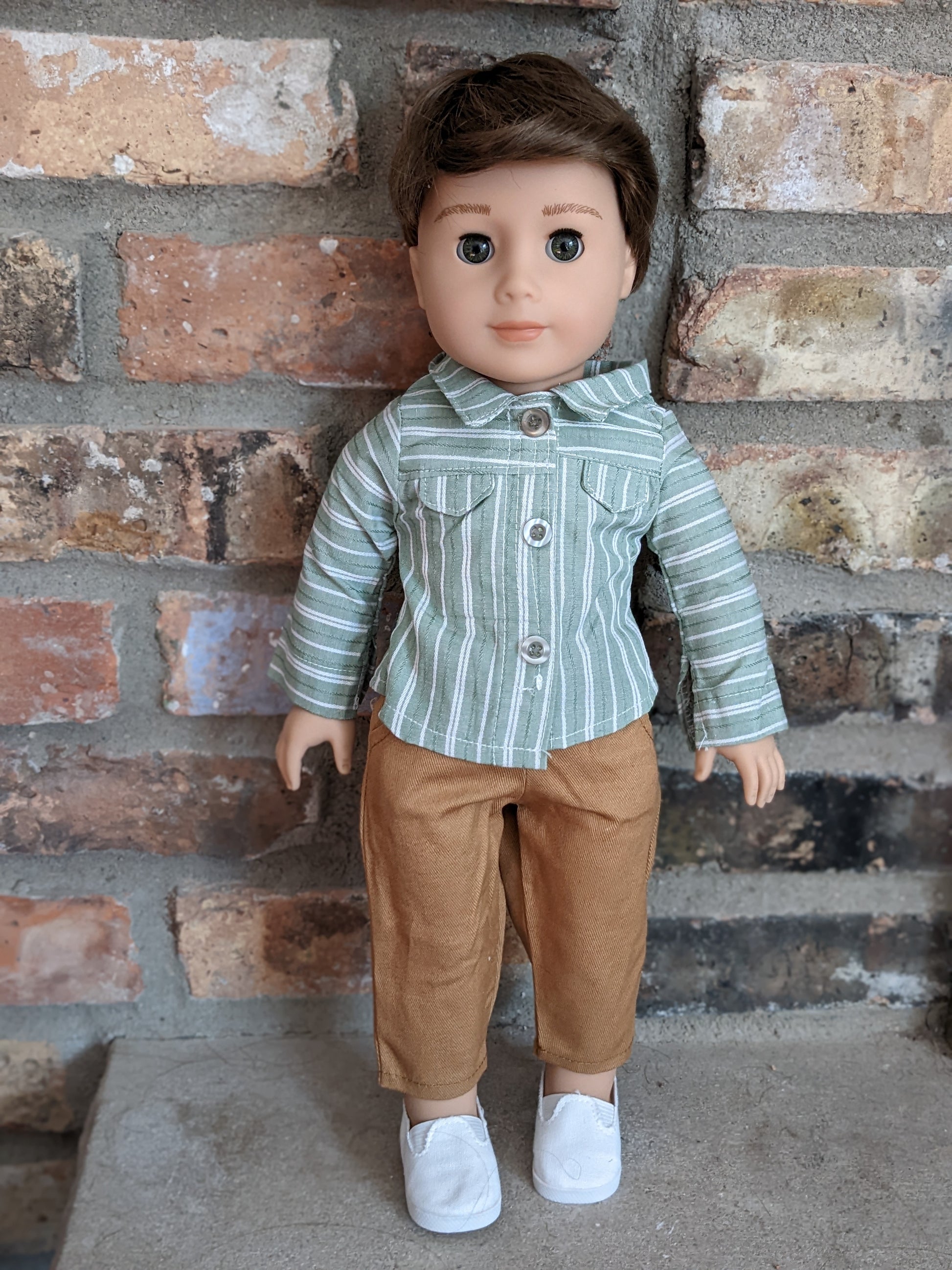 This one of a kind OOAK custom American Girl doll was created with a brand new Truly Me 104 doll, a brown wig from a new Logan doll, and hazel eyes. He may have some minor shine marks from handling. He comes with the outfit pictured.