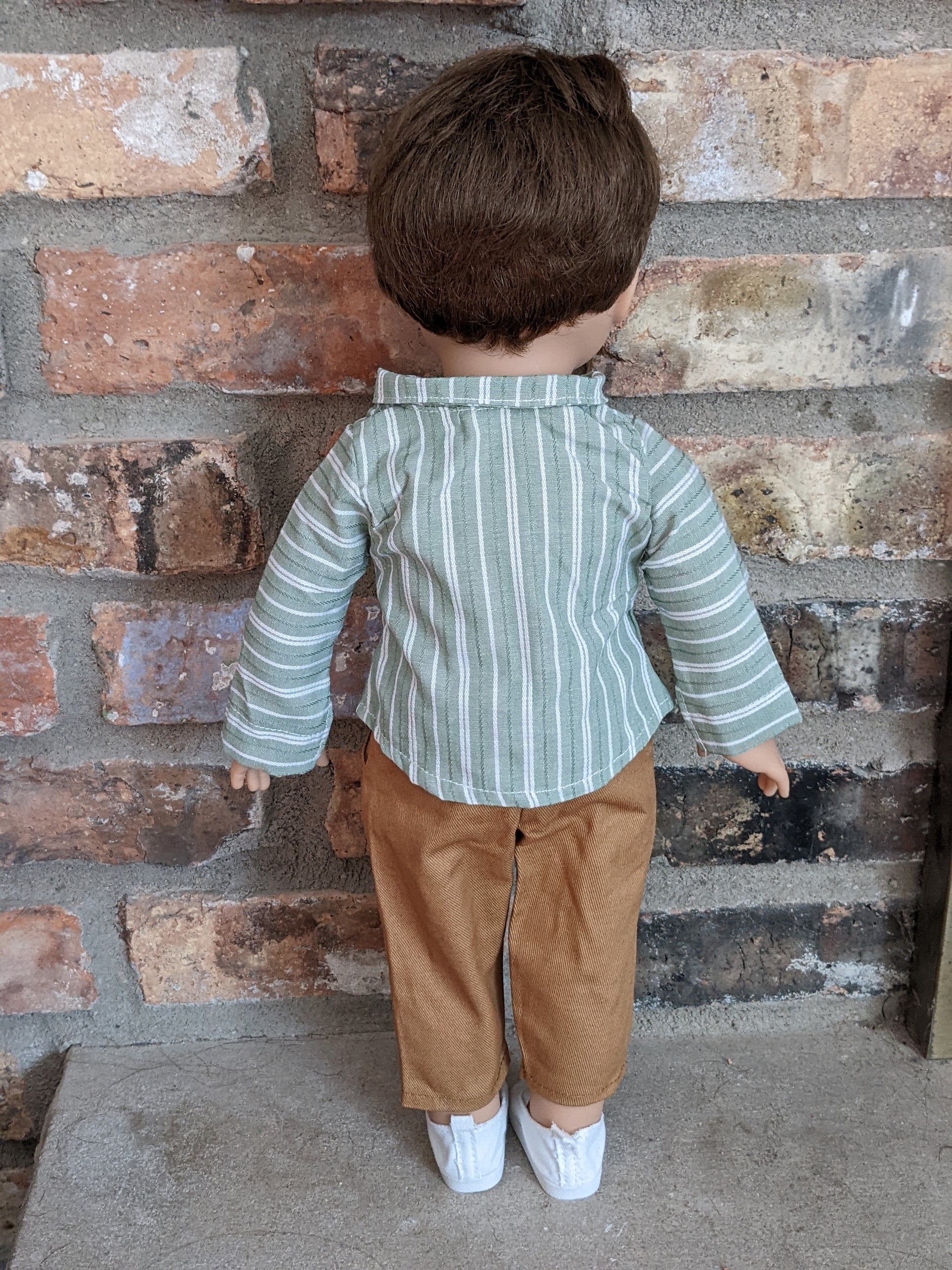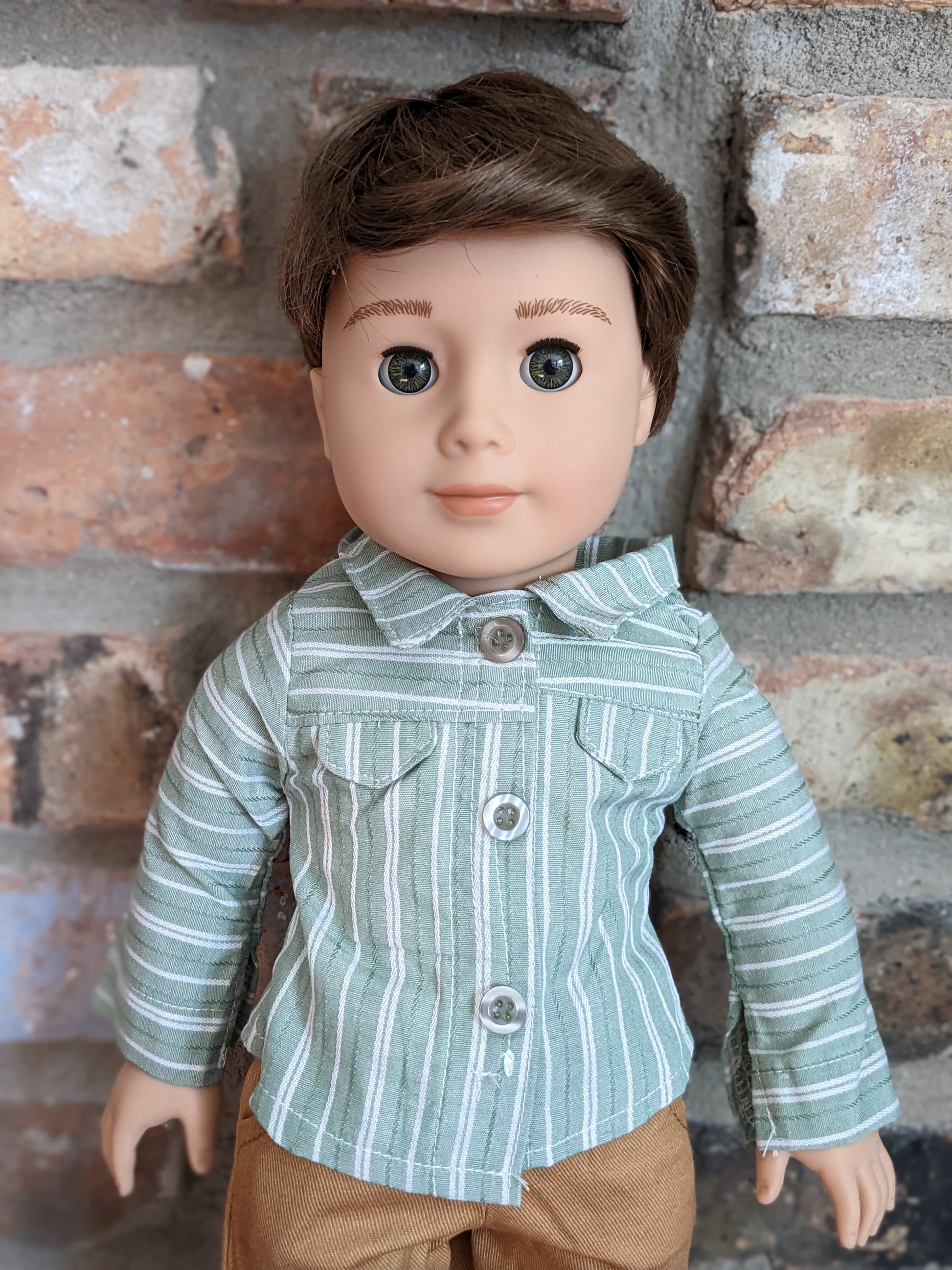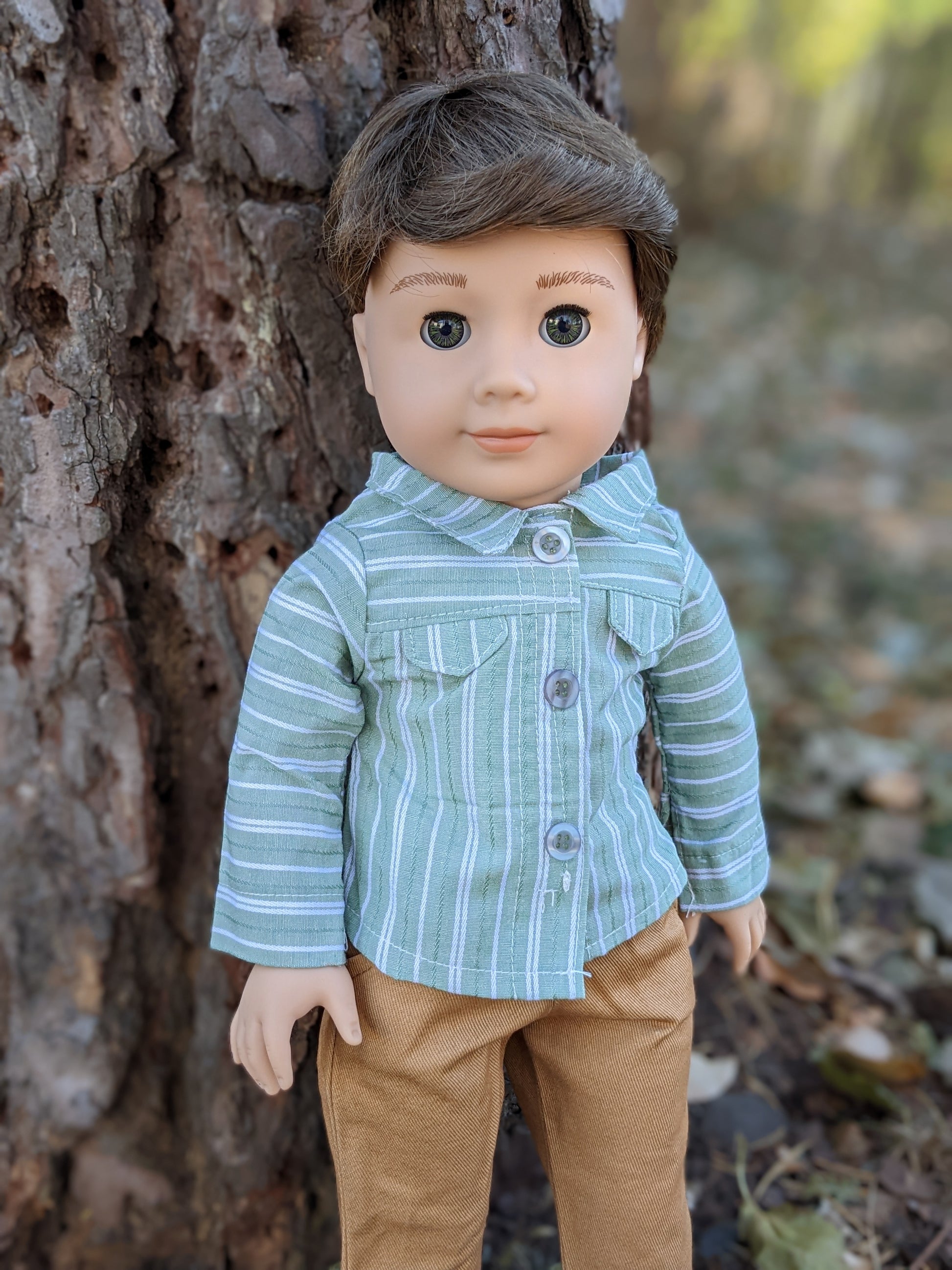 This one of a kind OOAK custom American Girl doll was created with a brand new Truly Me 104 doll, a brown wig from a new Logan doll, and hazel eyes. He may have some minor shine marks from handling. He comes with the outfit pictured.
