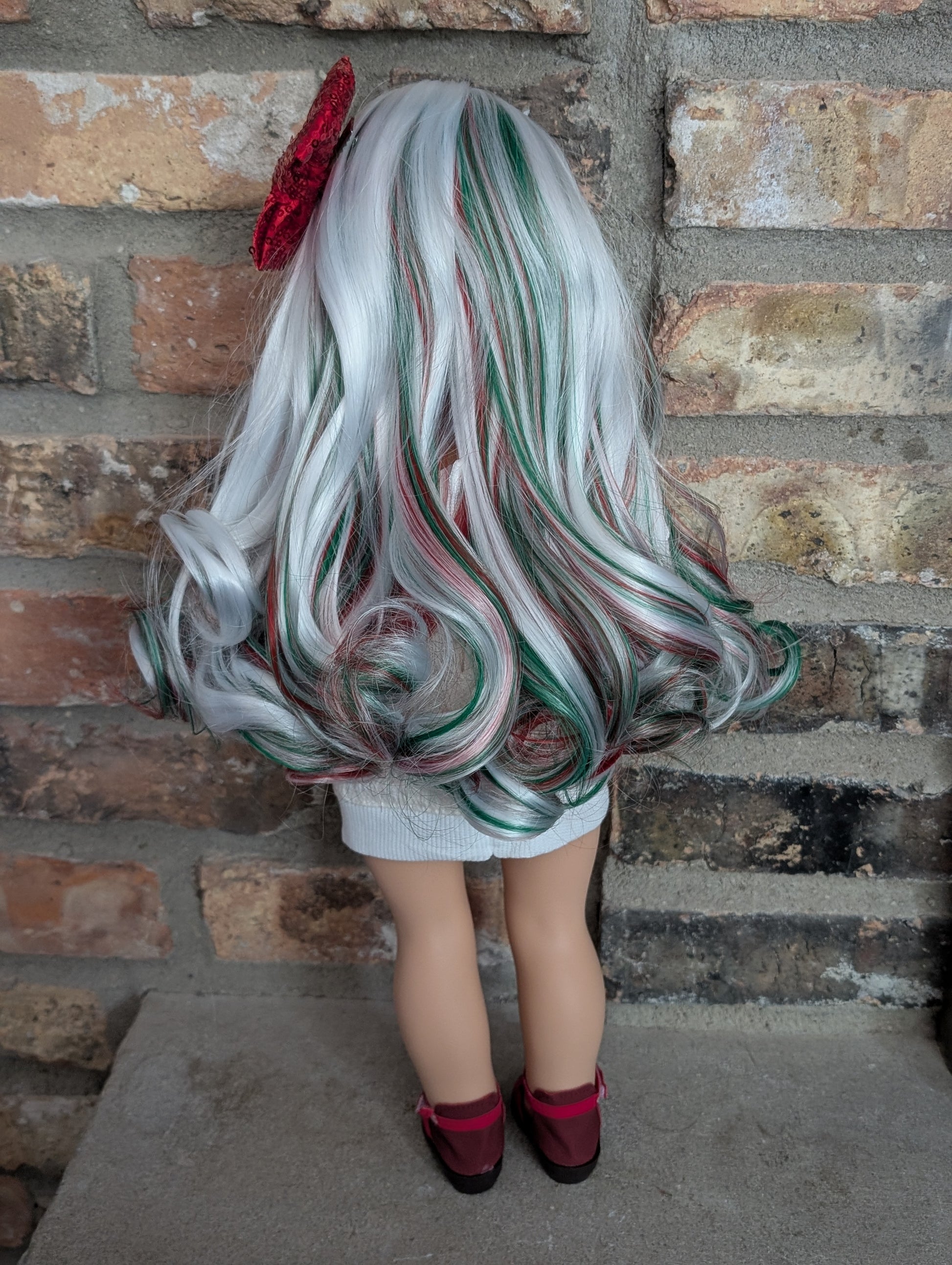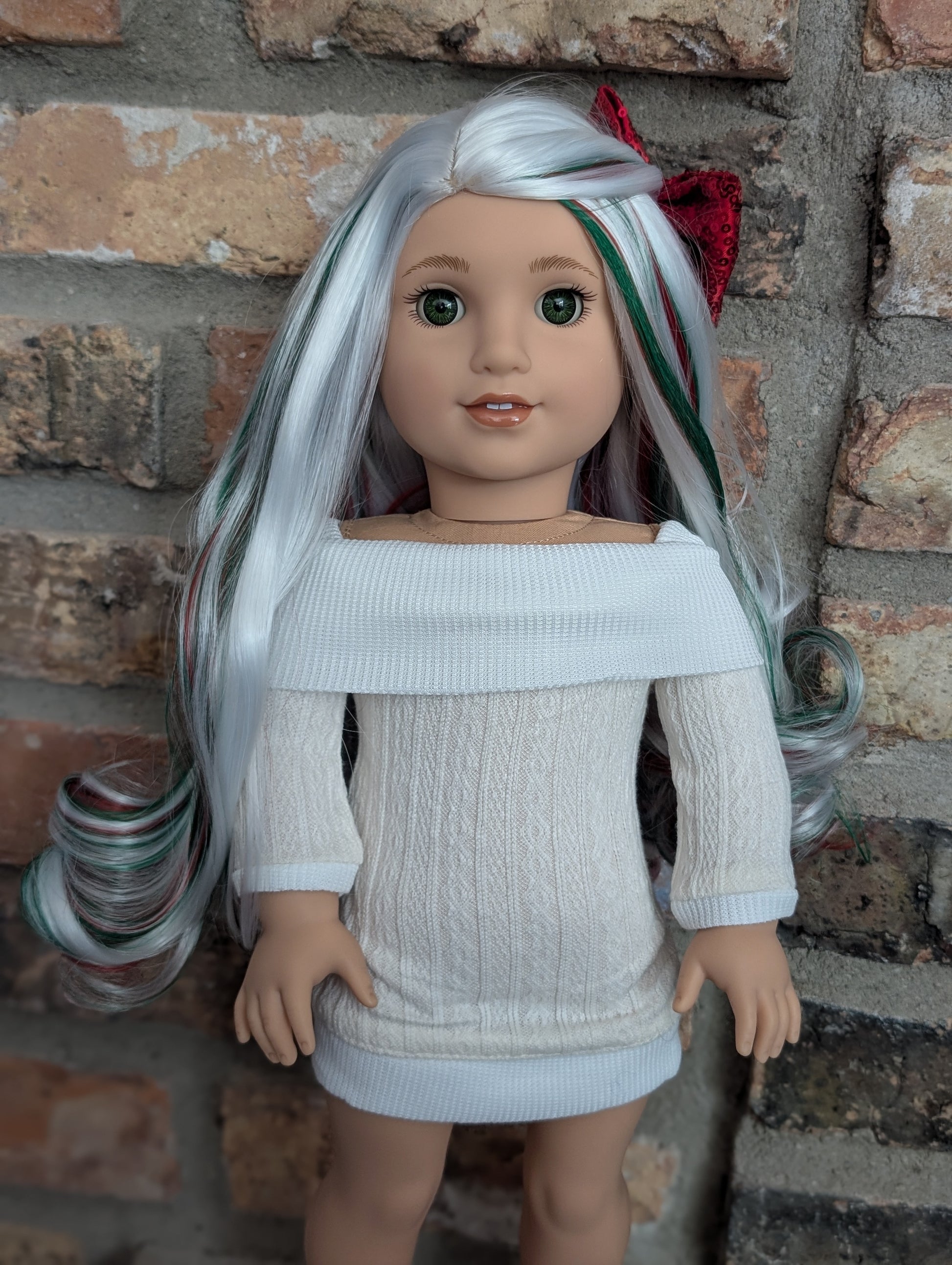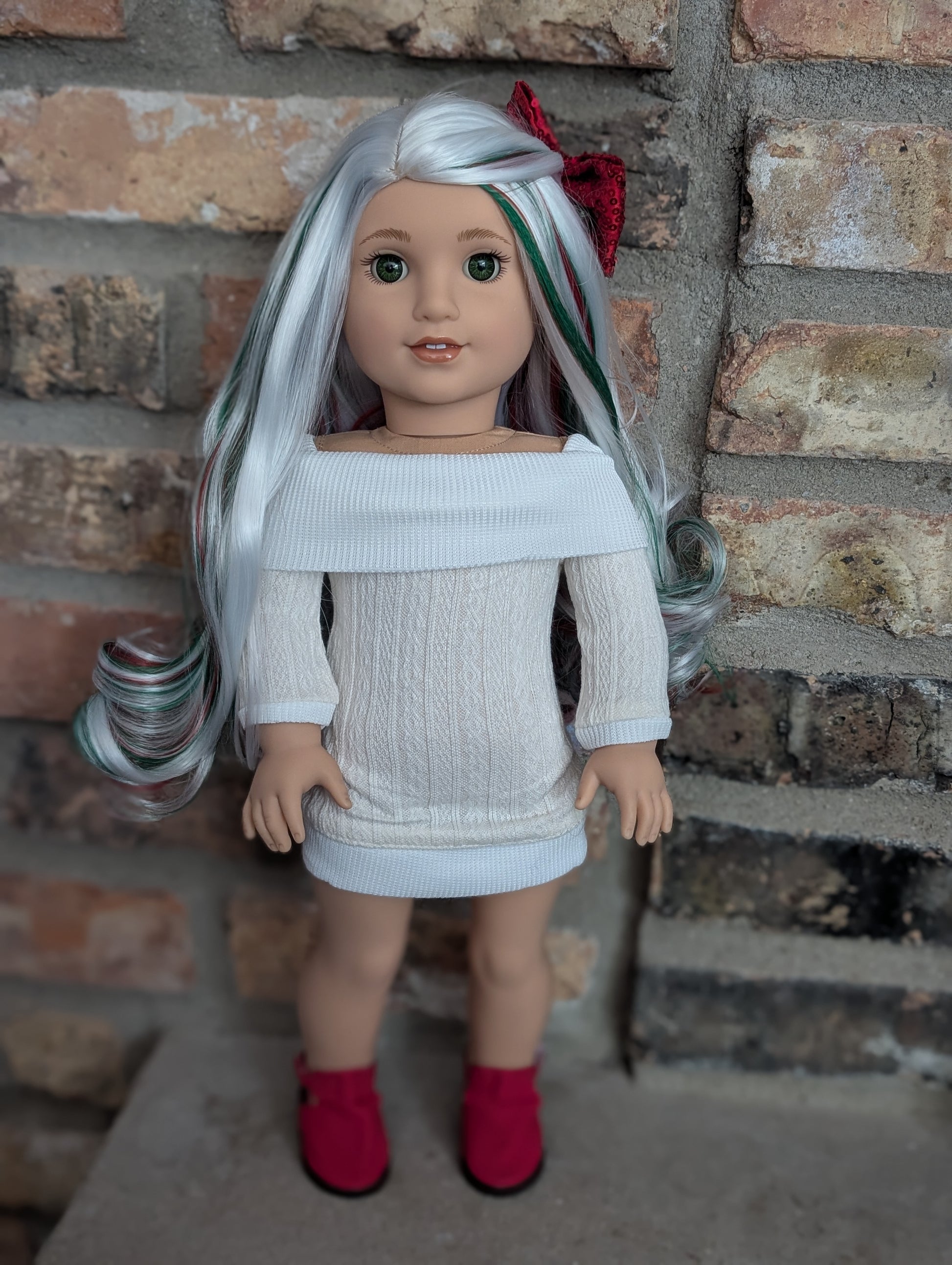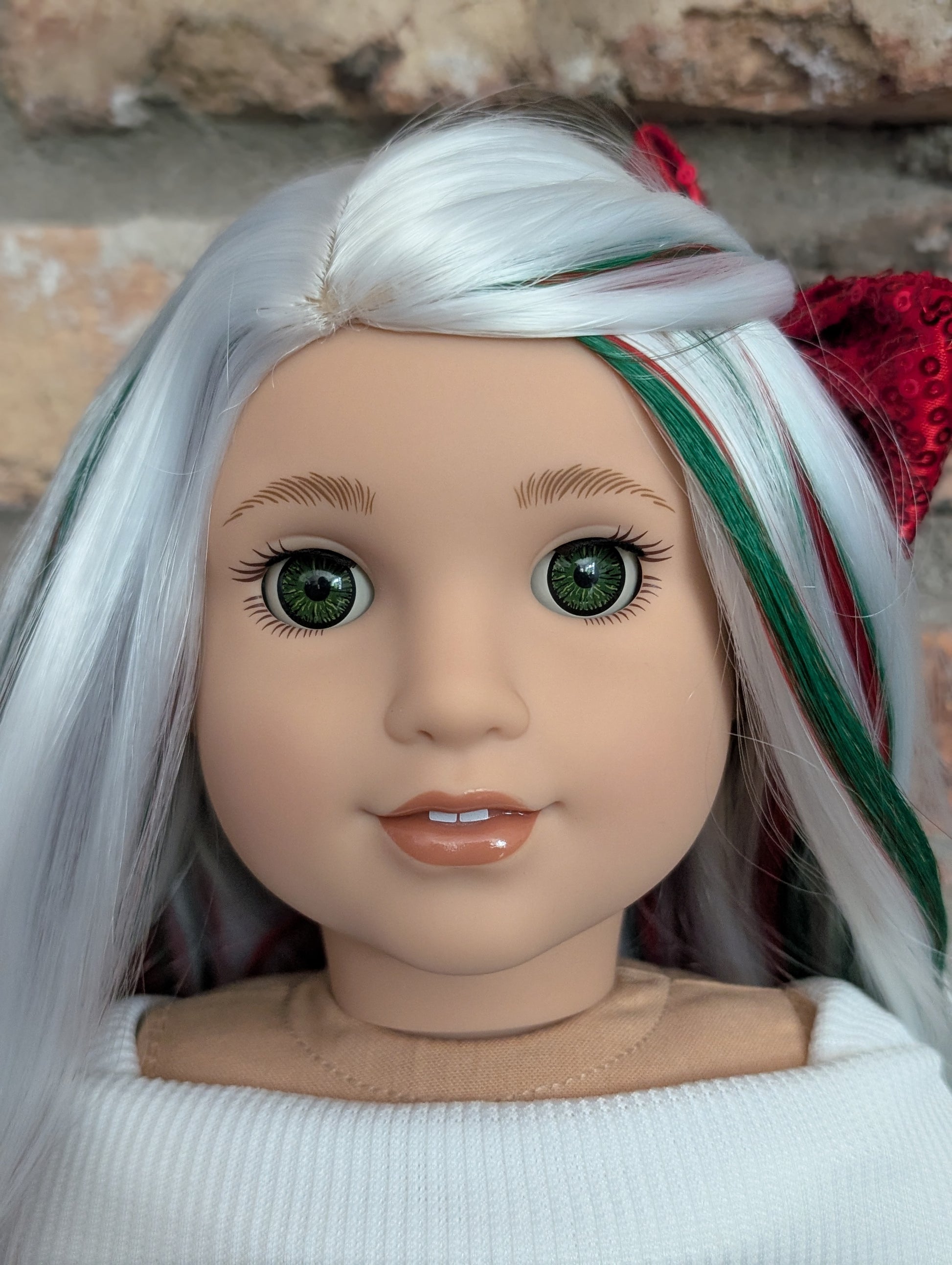 This one of a kind OOAK custom American Girl doll was created with a brand new doll, a white with red and green highlights, and green eyes from a BeForever Felicity. She has lip gloss that was hand painted and sealed. She may have some minor shine marks from handling. She comes with the outfit pictured.