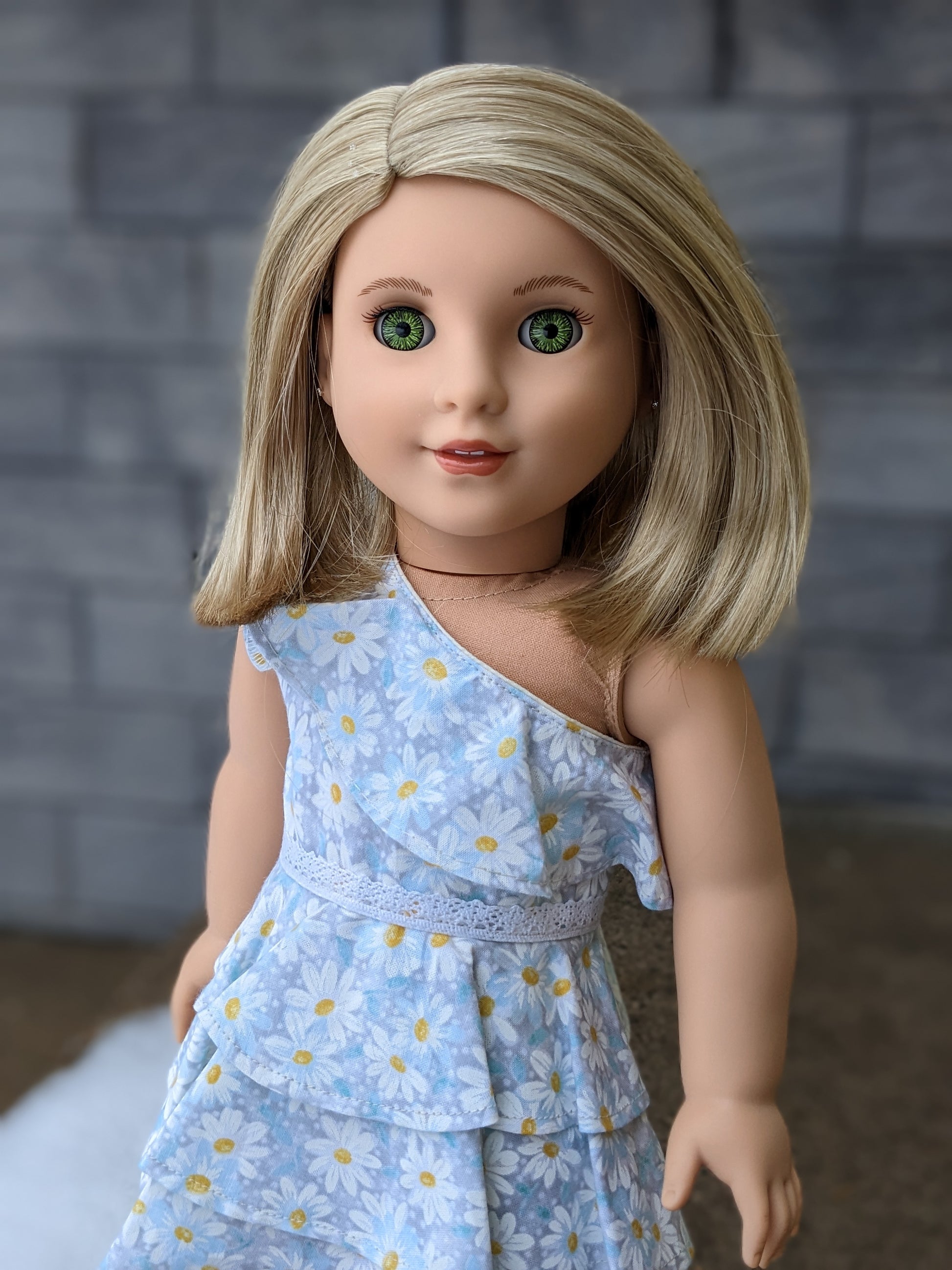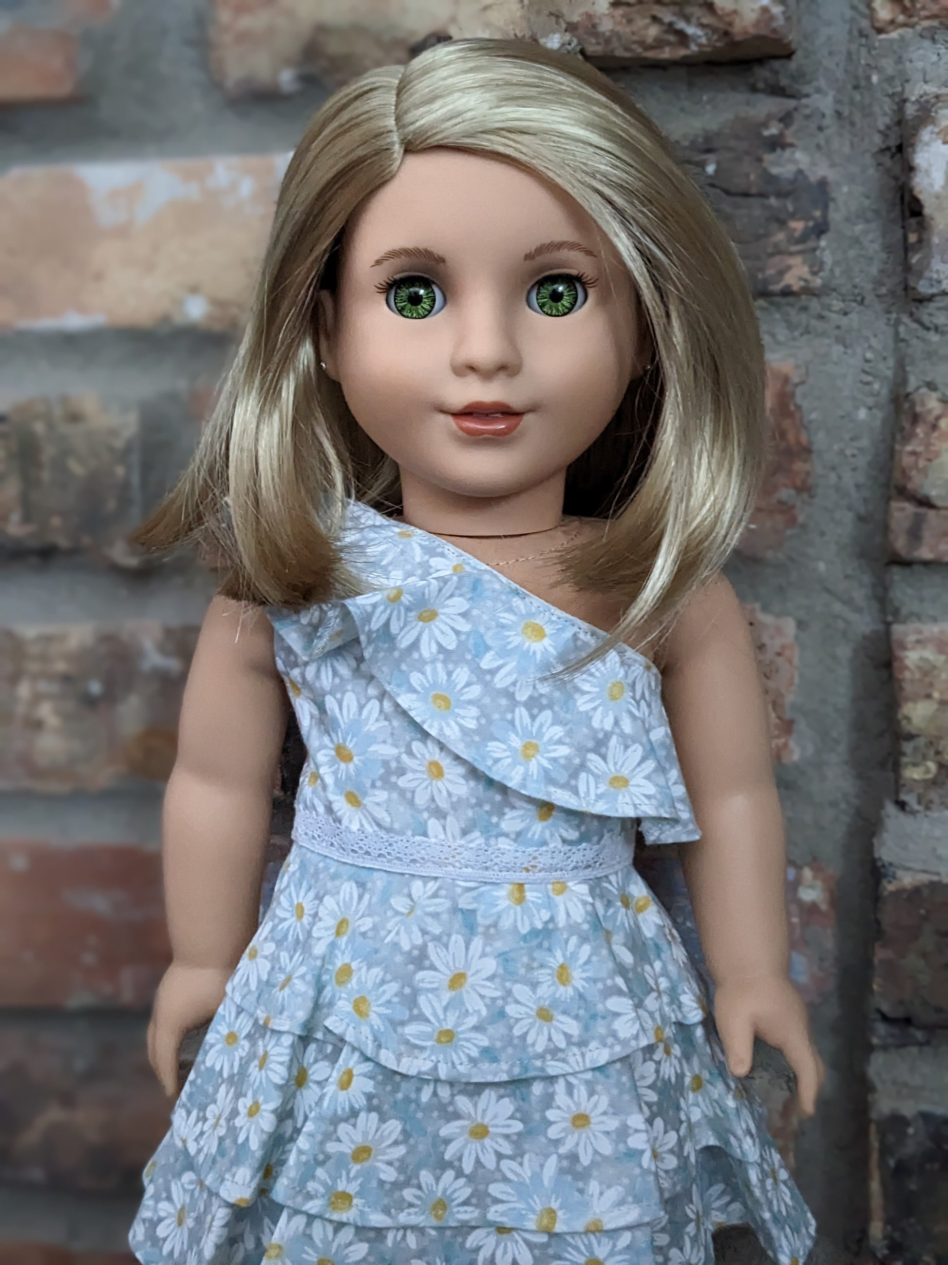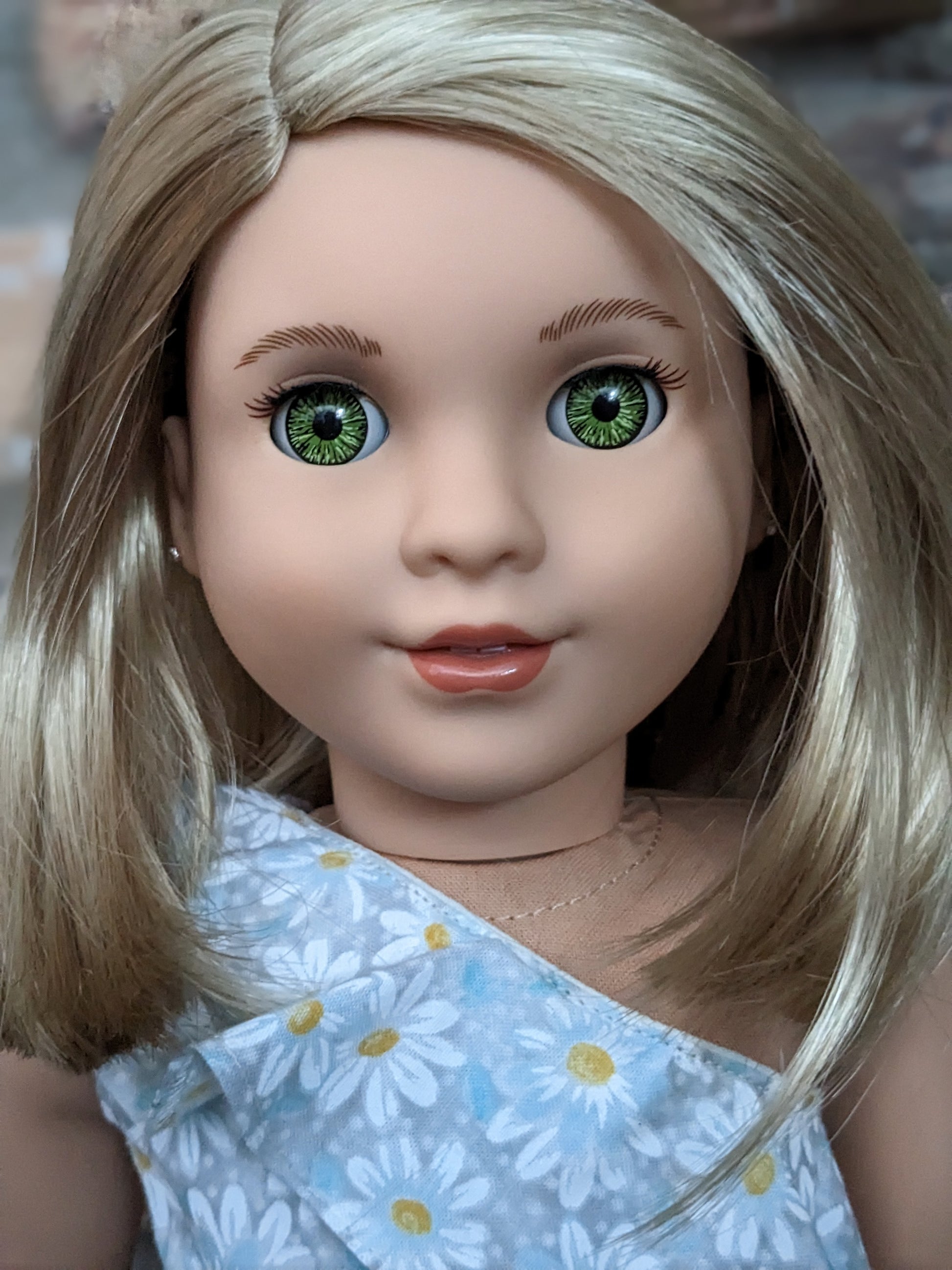 This one of a kind OOAK custom American Girl doll was created with a brand new TM 116 doll, a blonde wig and green decal eyes. She has lip gloss that was hand painted and sealed. She may have some minor shine marks from handling. She comes with the outfit pictured. Her painted on lower eyelashes have been removed.