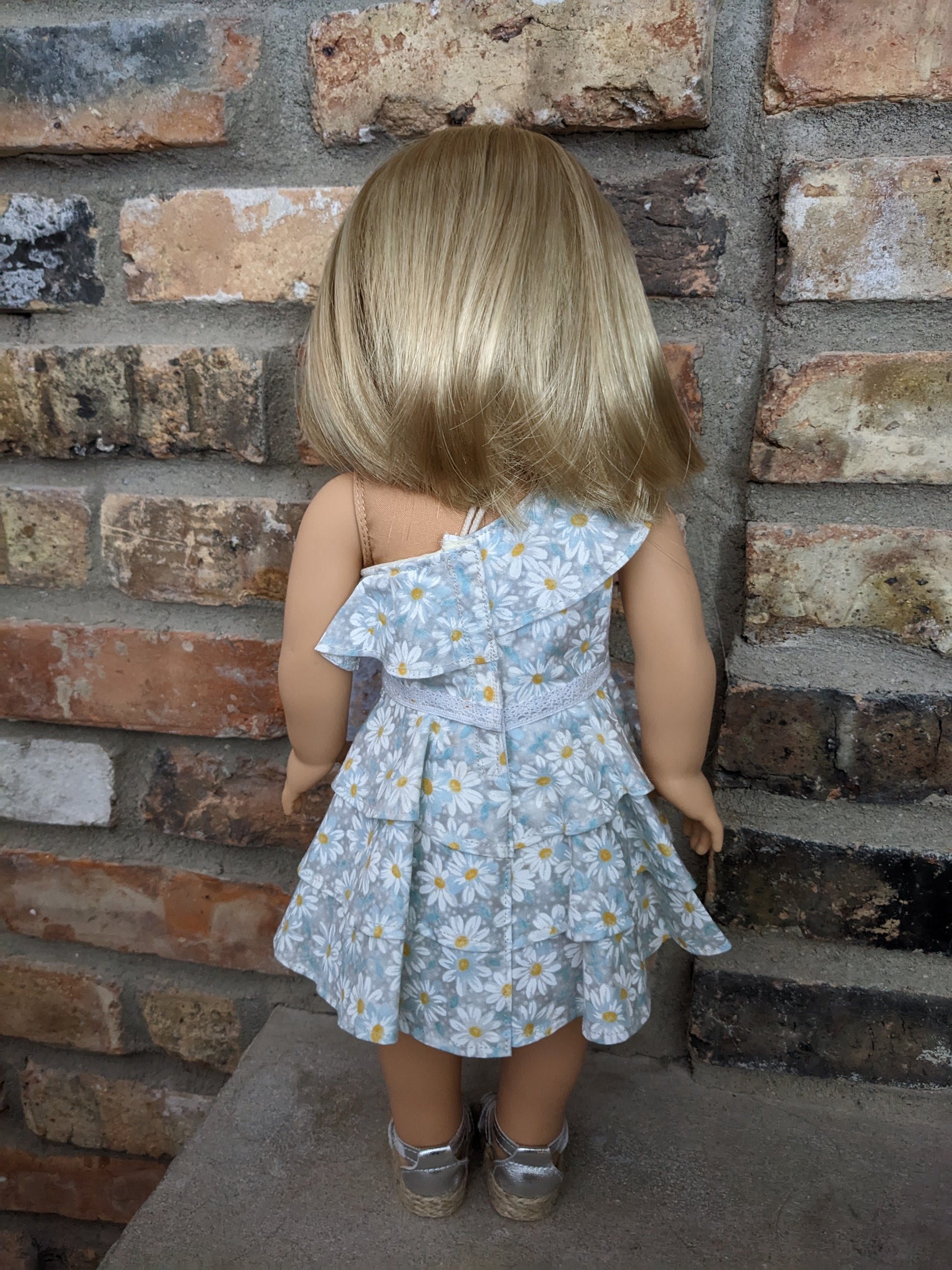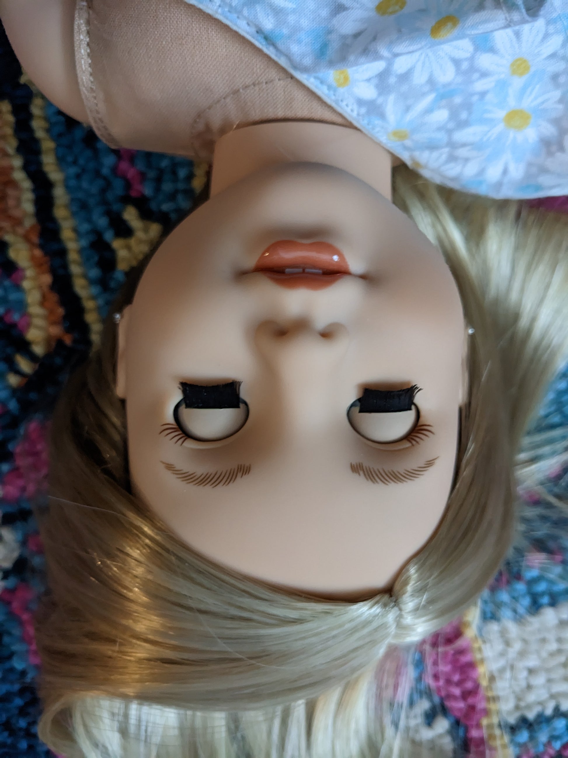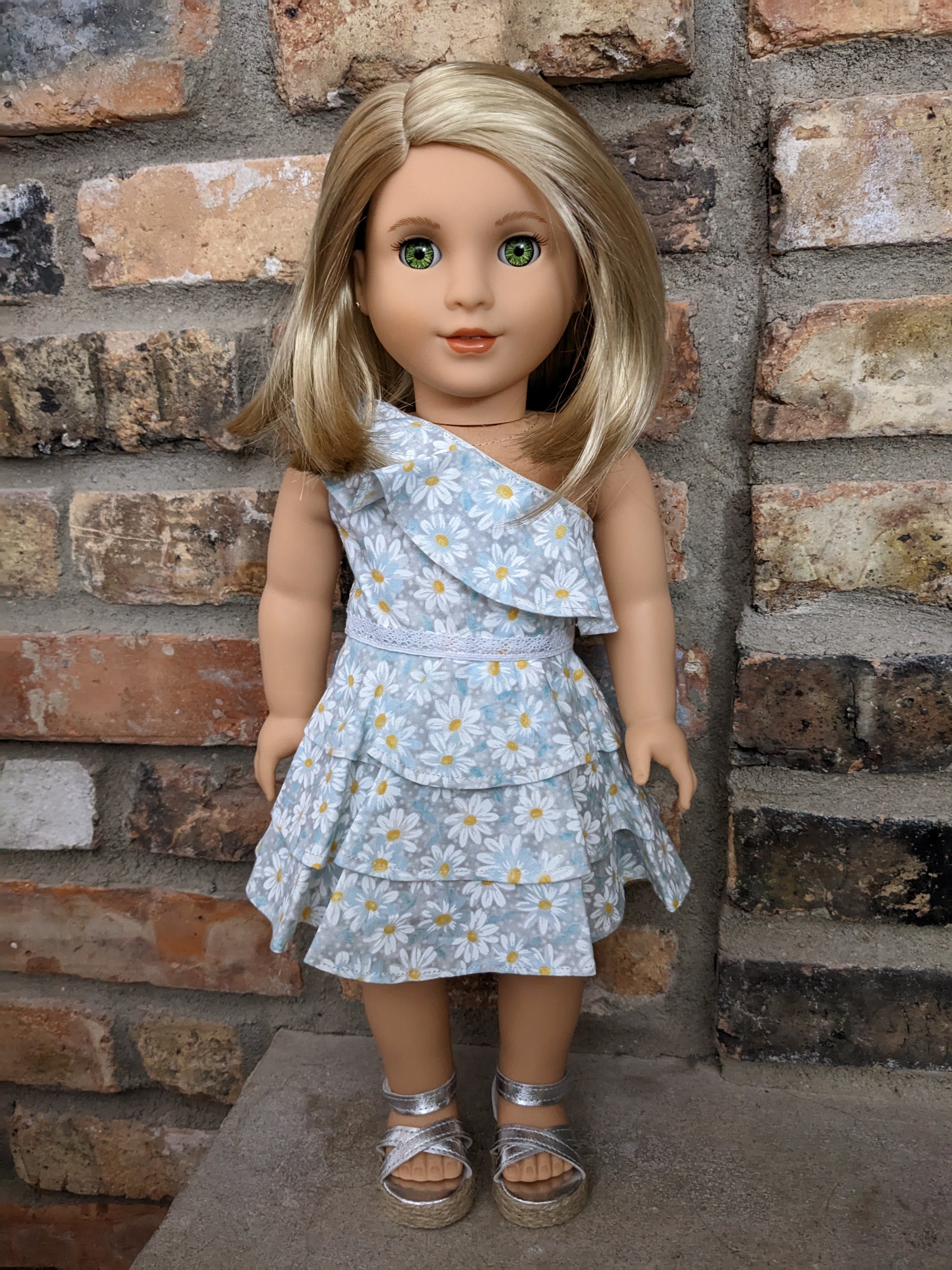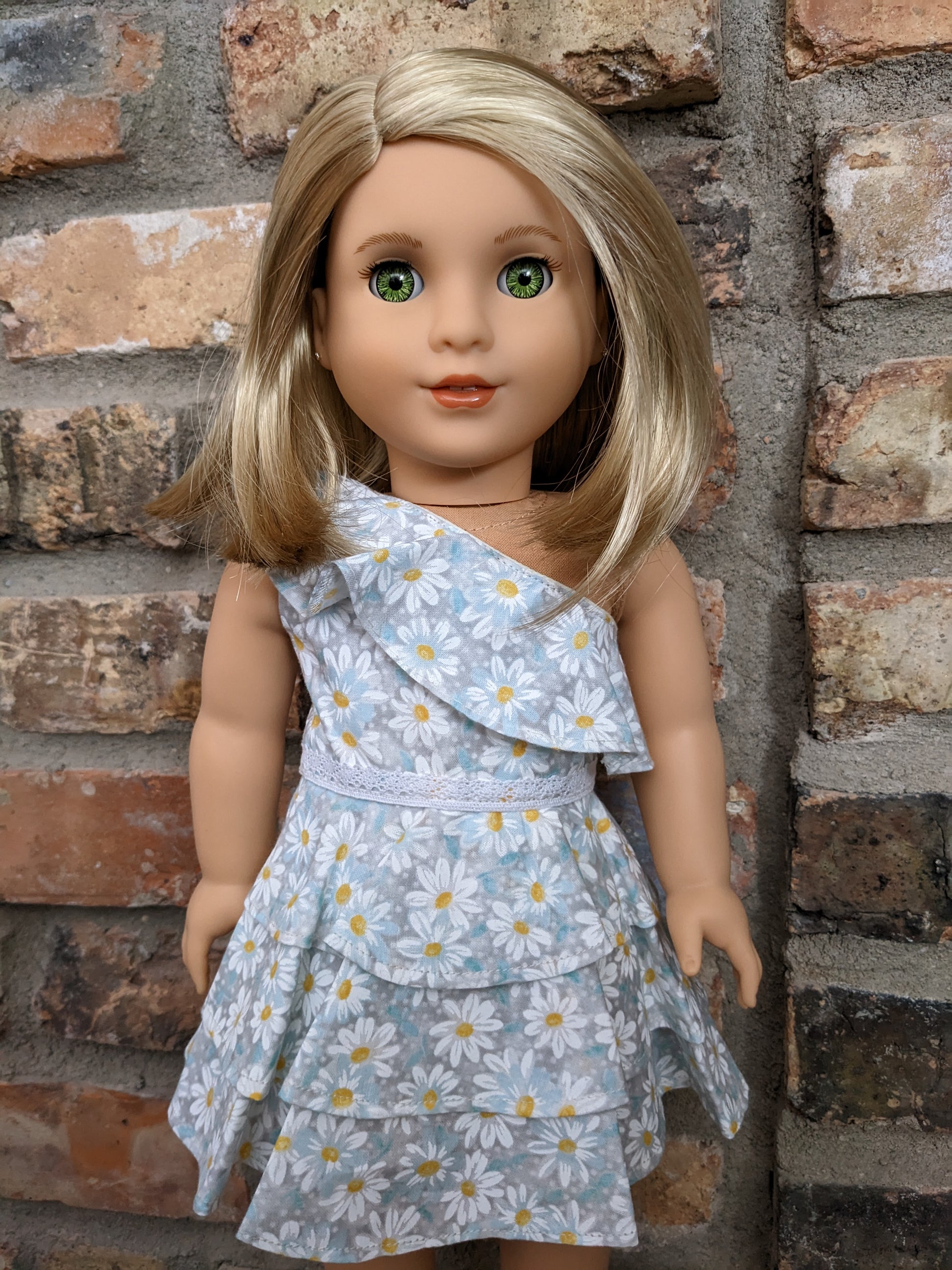 This one of a kind OOAK custom American Girl doll was created with a brand new TM 116 doll, a blonde wig and green decal eyes. She has lip gloss that was hand painted and sealed. She may have some minor shine marks from handling. She comes with the outfit pictured. Her painted on lower eyelashes have been removed.