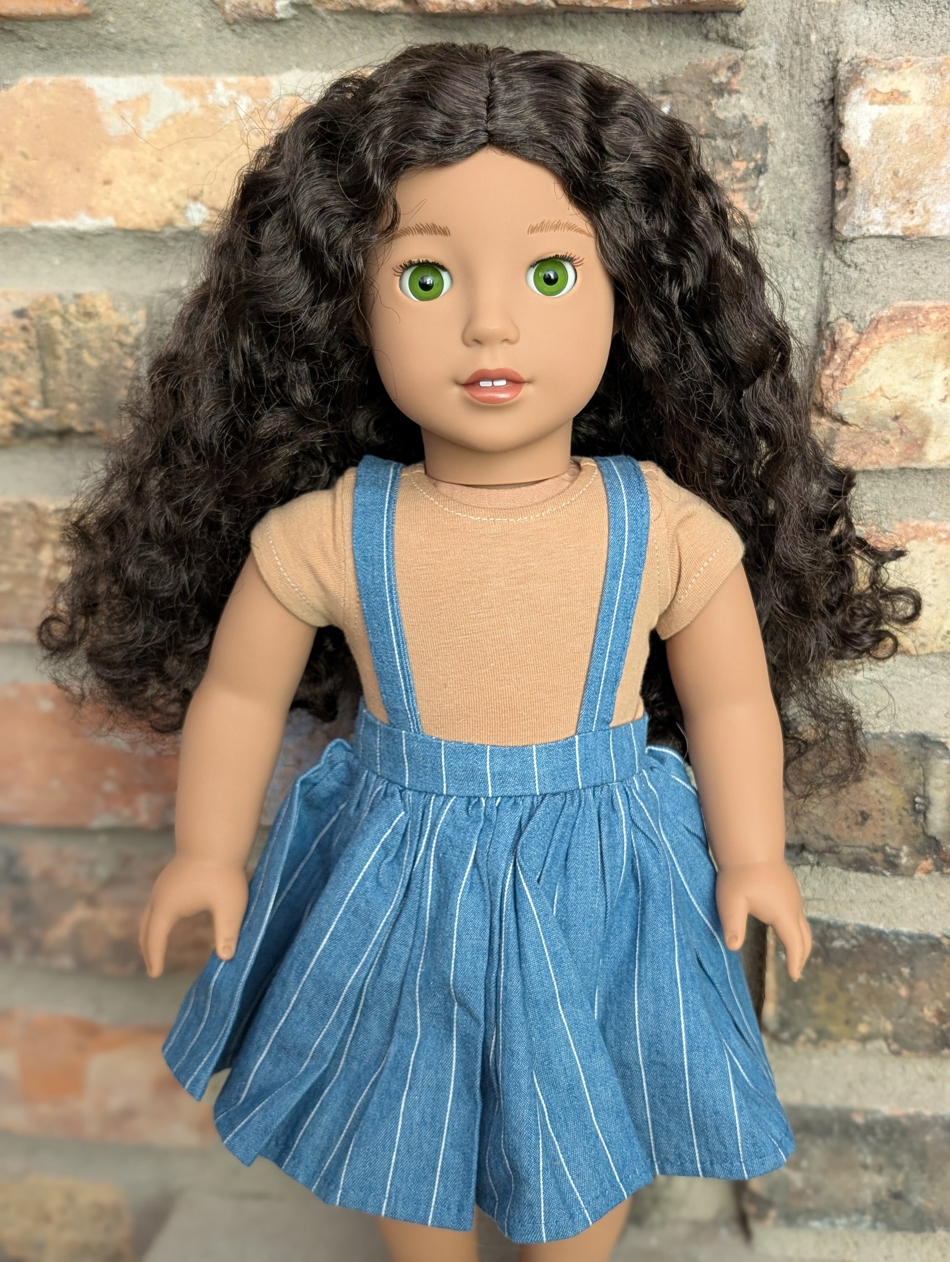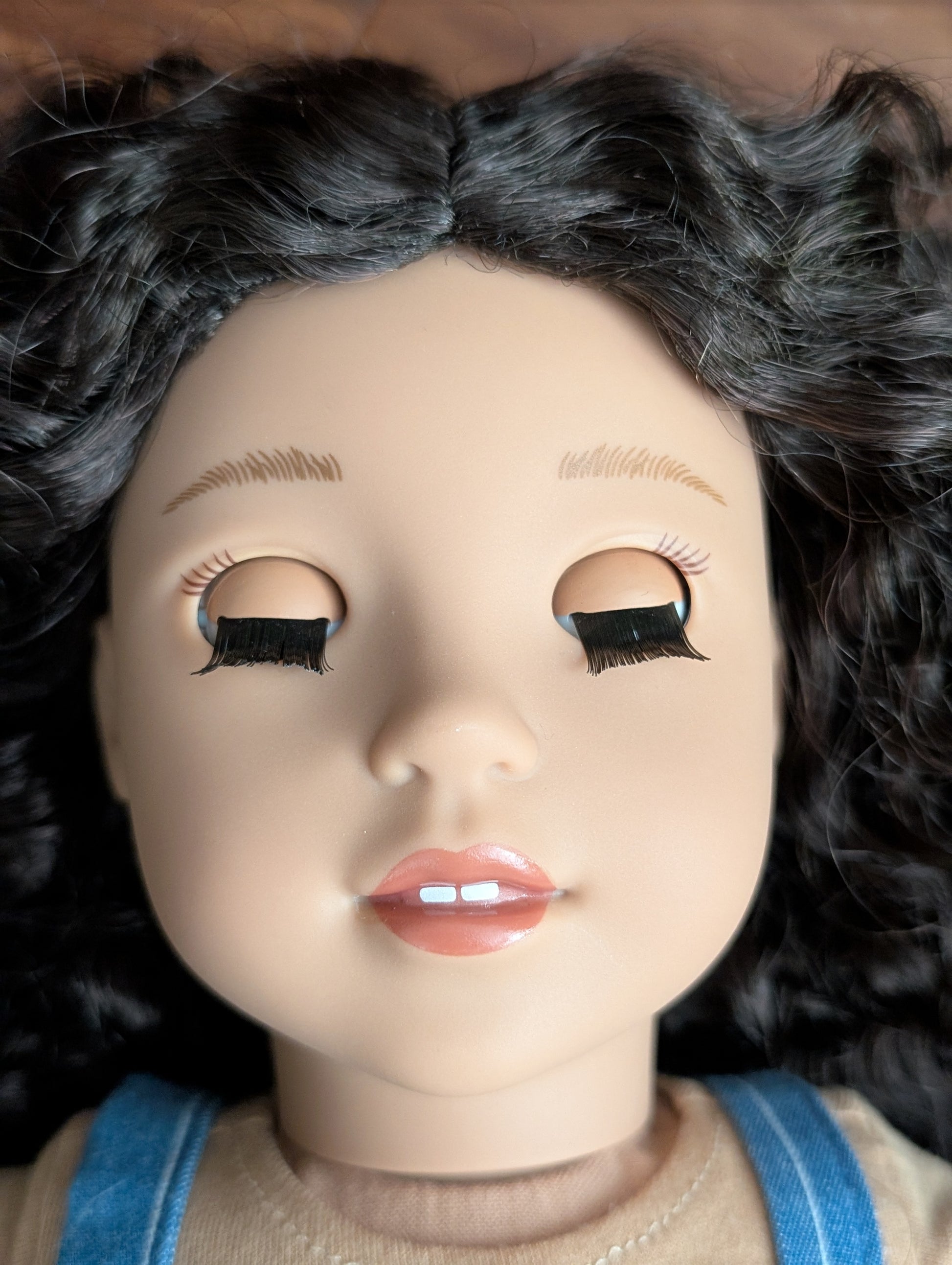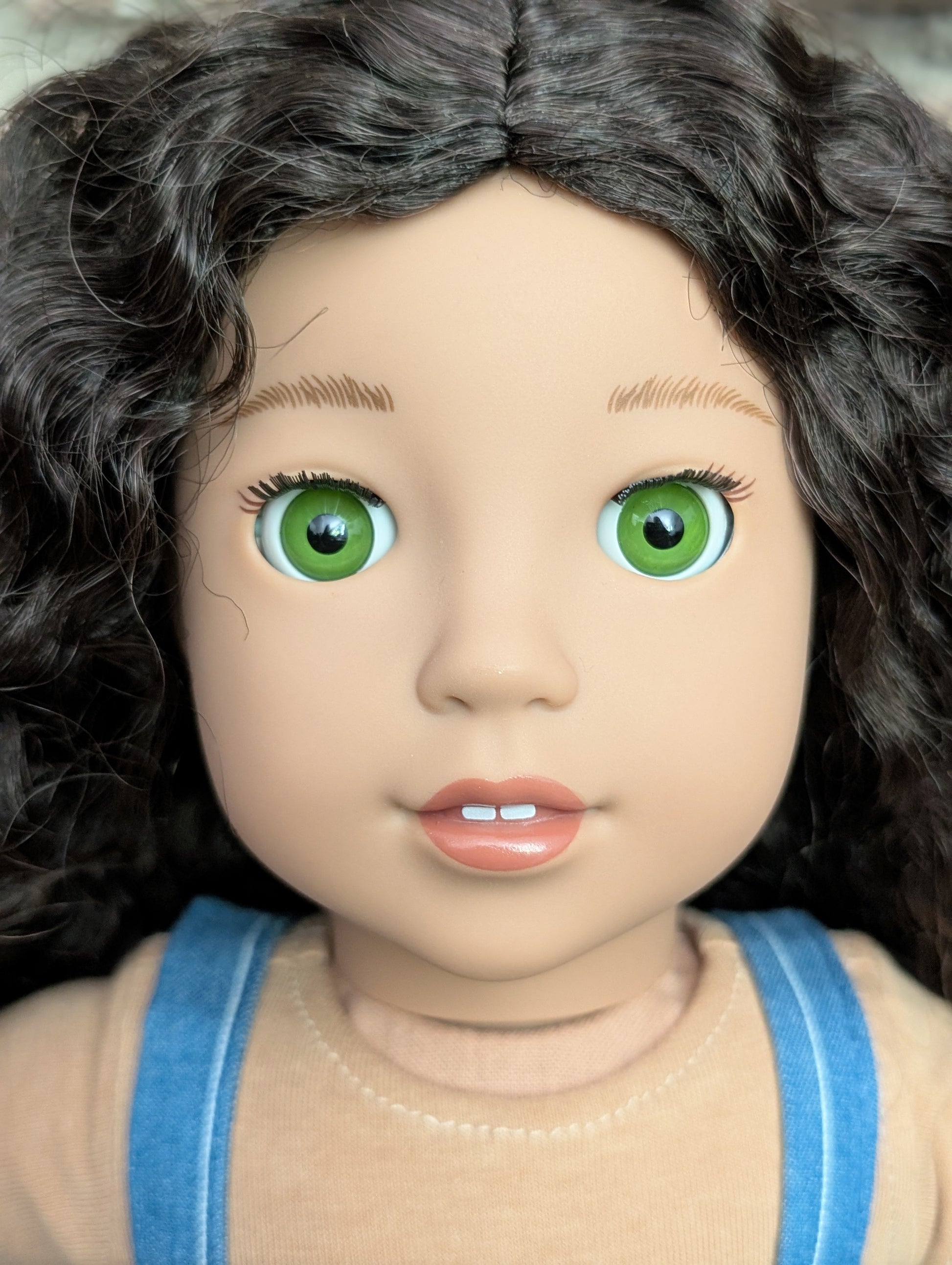 This one of a kind OOAK custom American Girl doll was created with a brand new doll, a dark brown wig, and green eyes from Etsy. She has lip gloss that was hand painted and sealed. She may have some minor shine marks from handling. She comes with the outfit pictured.