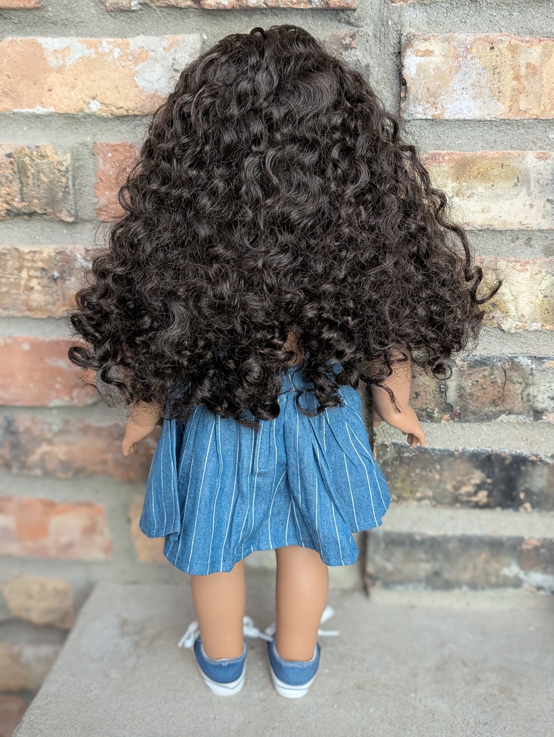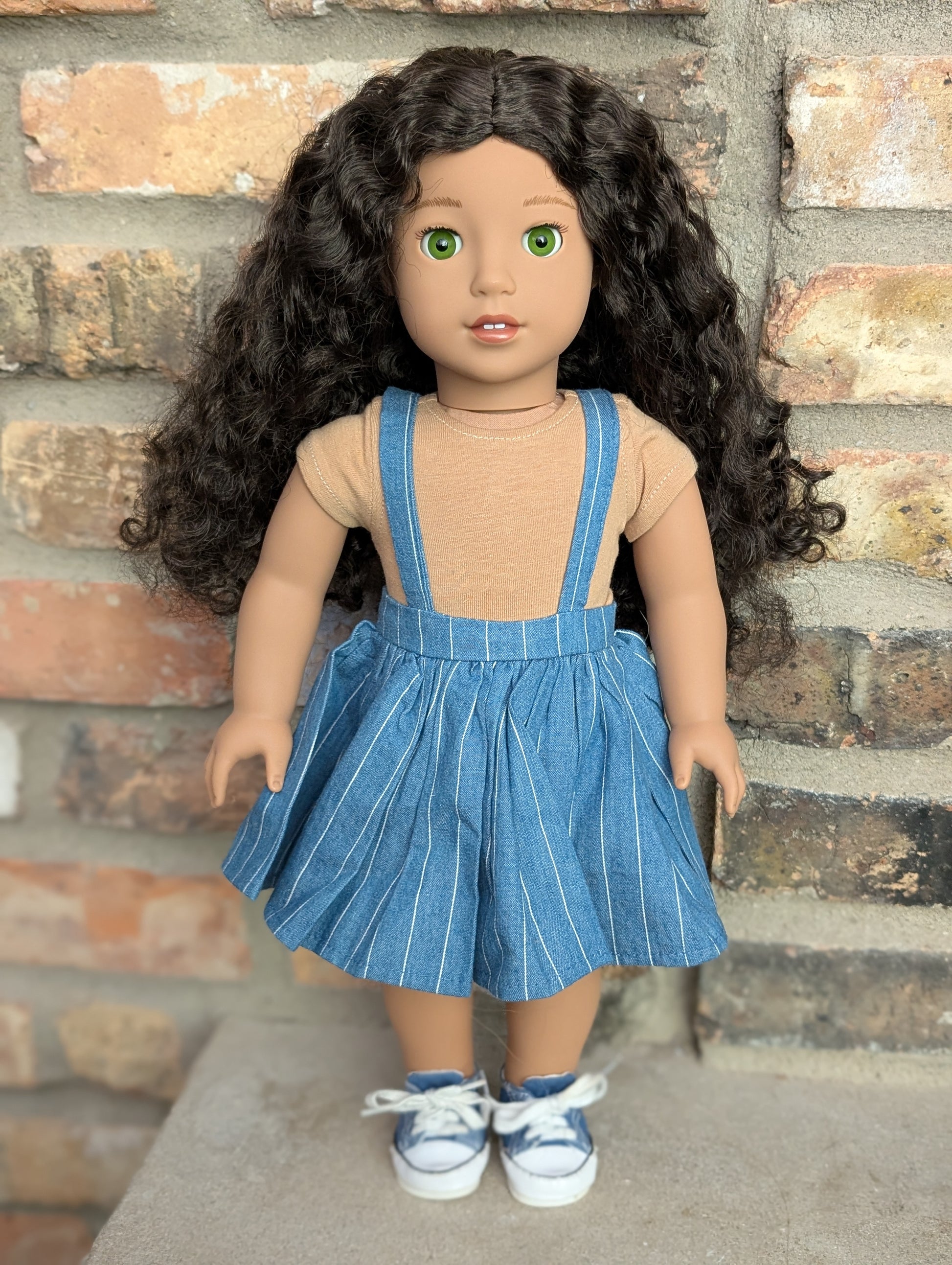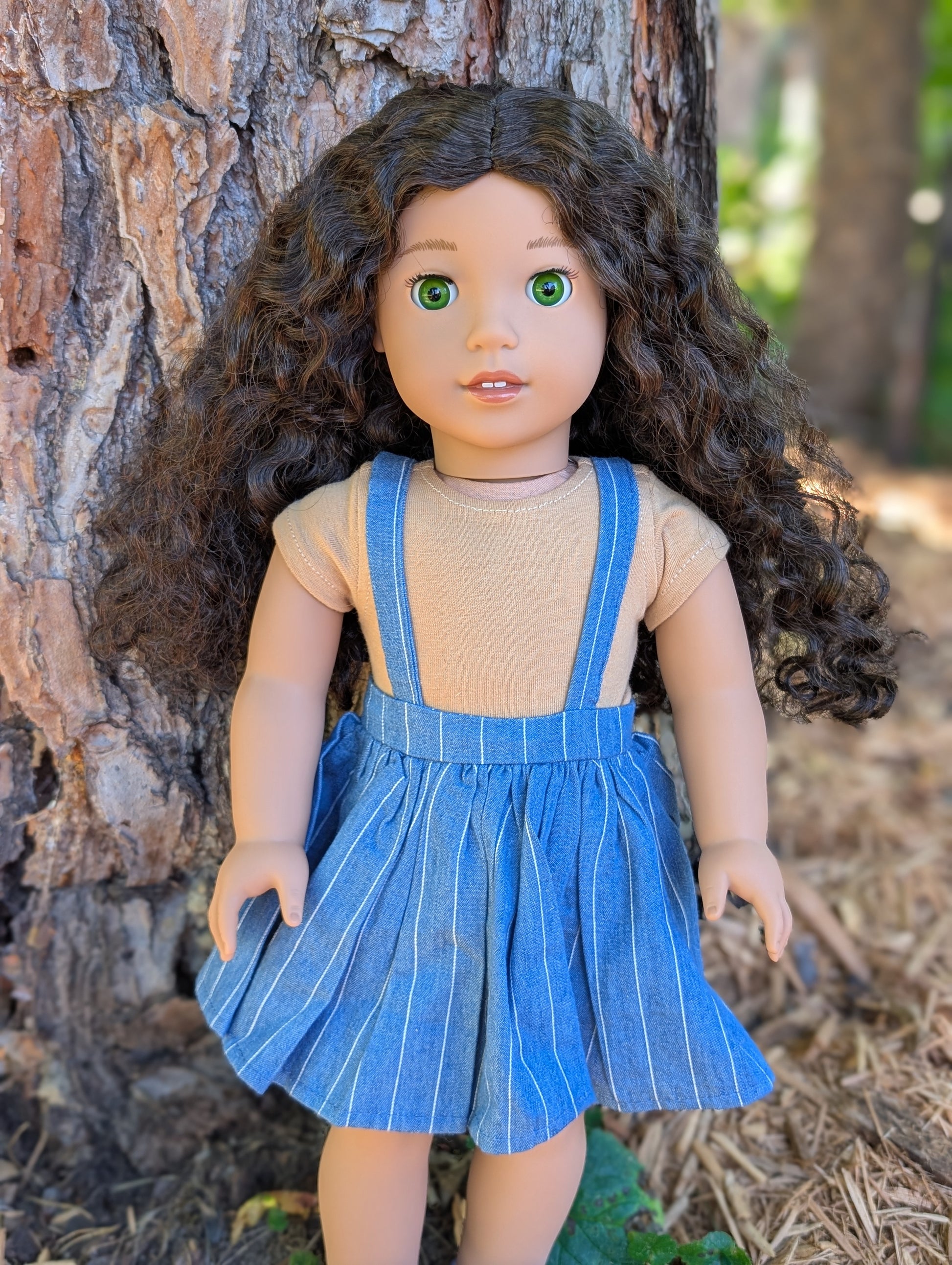 This one of a kind OOAK custom American Girl doll was created with a brand new doll, a dark brown wig, and green eyes from Etsy. She has lip gloss that was hand painted and sealed. She may have some minor shine marks from handling. She comes with the outfit pictured.