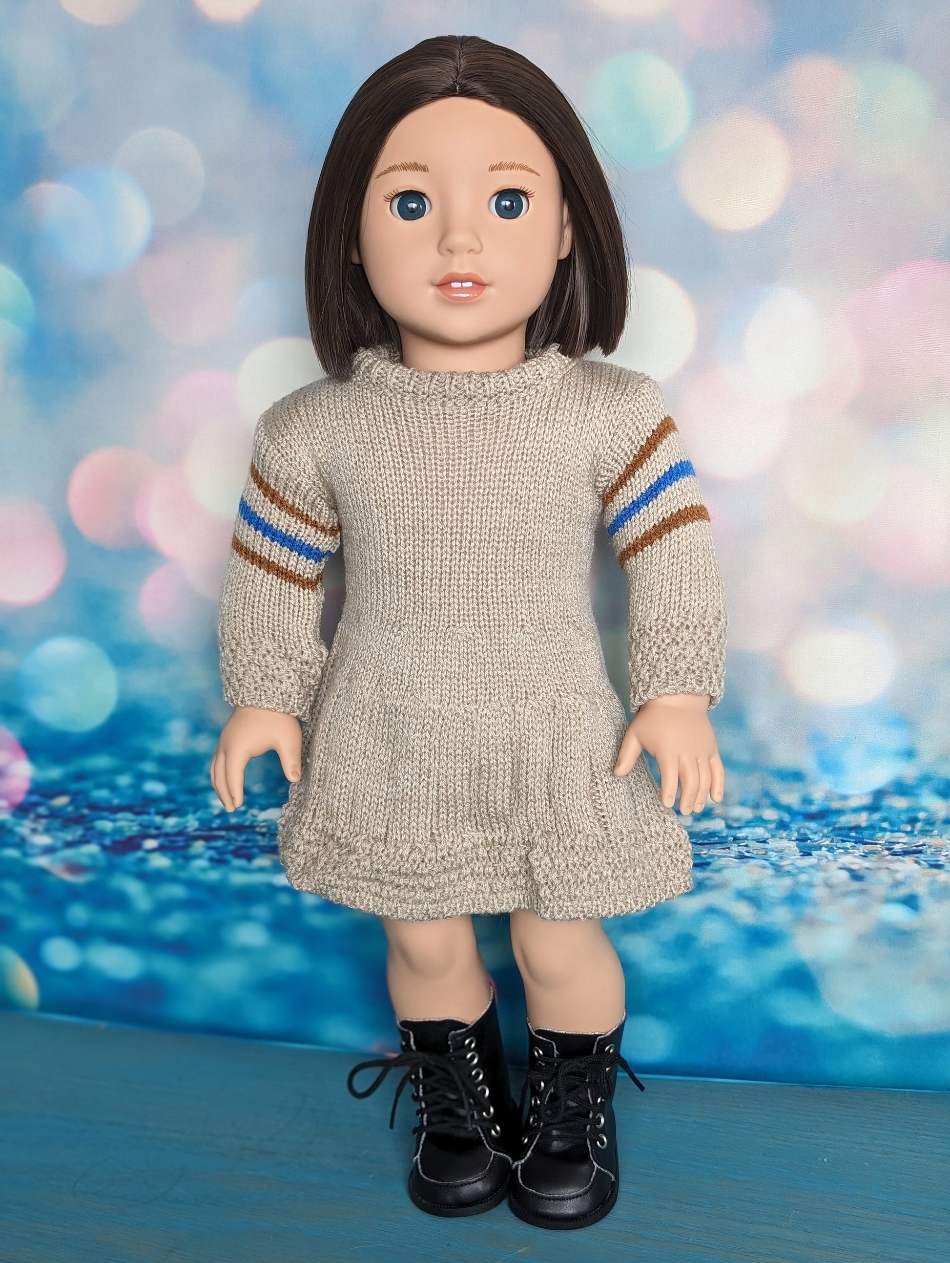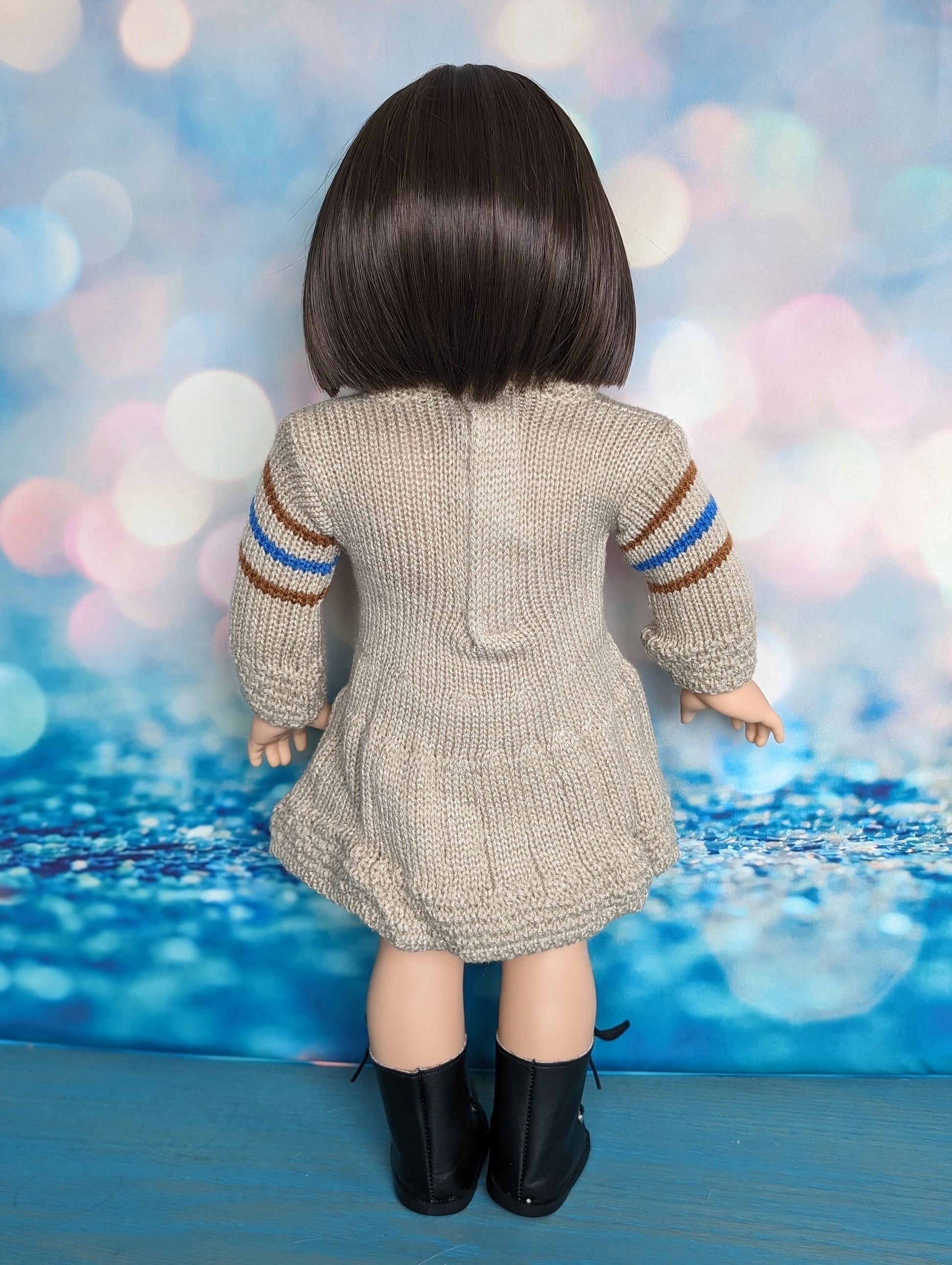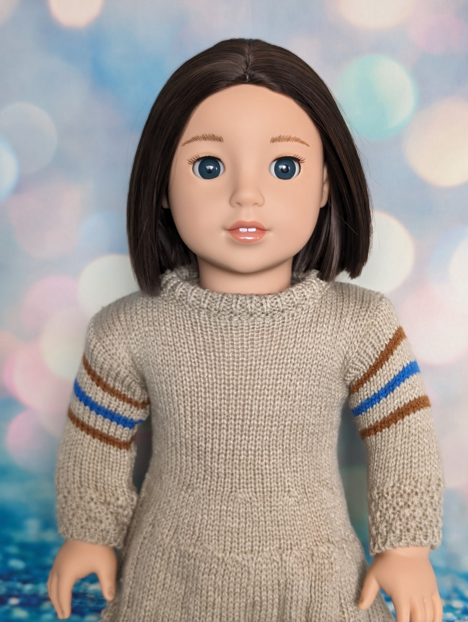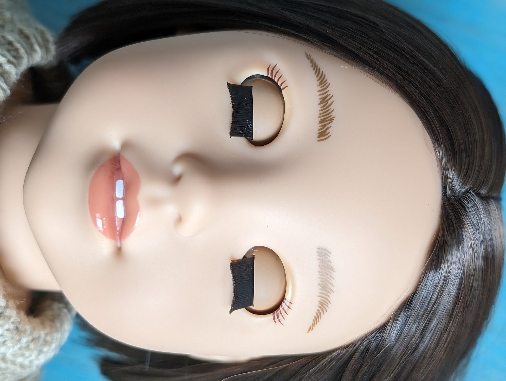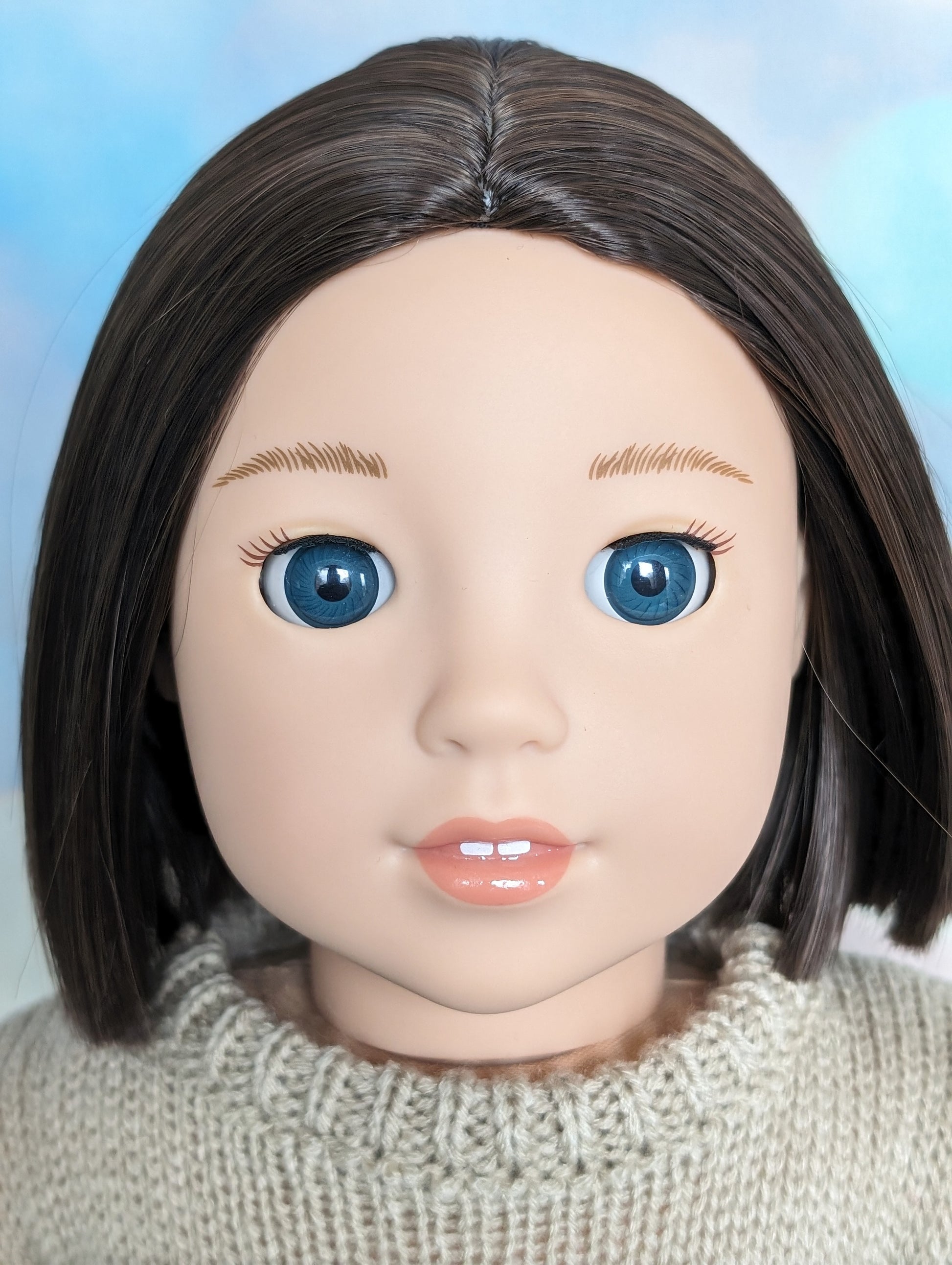 This one of a kind OOAK custom American Girl doll was created with a brand new doll, a dark brown wig, and dark blue eyes. She has lip gloss that was hand painted and sealed. She may have some minor shine marks from handling. She comes with the outfit pictured. Her lower painted on eyelashes have been removed.