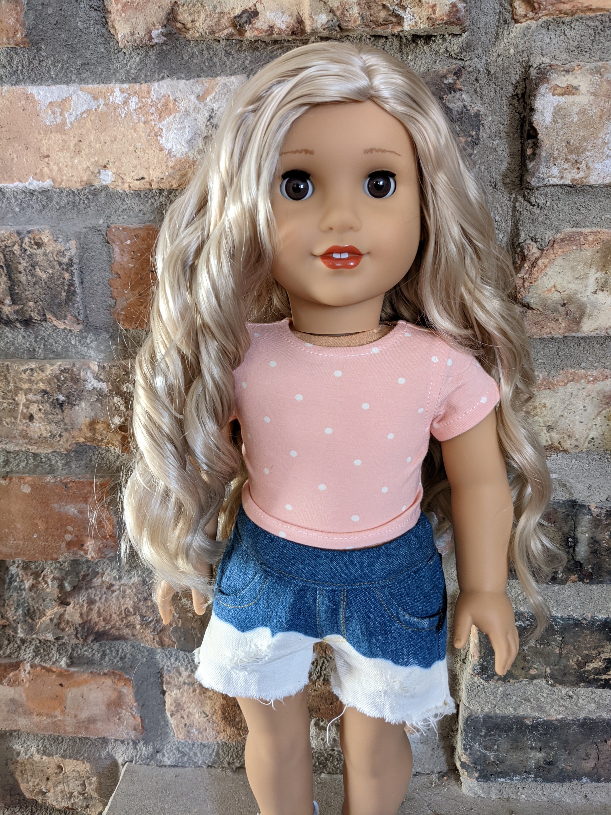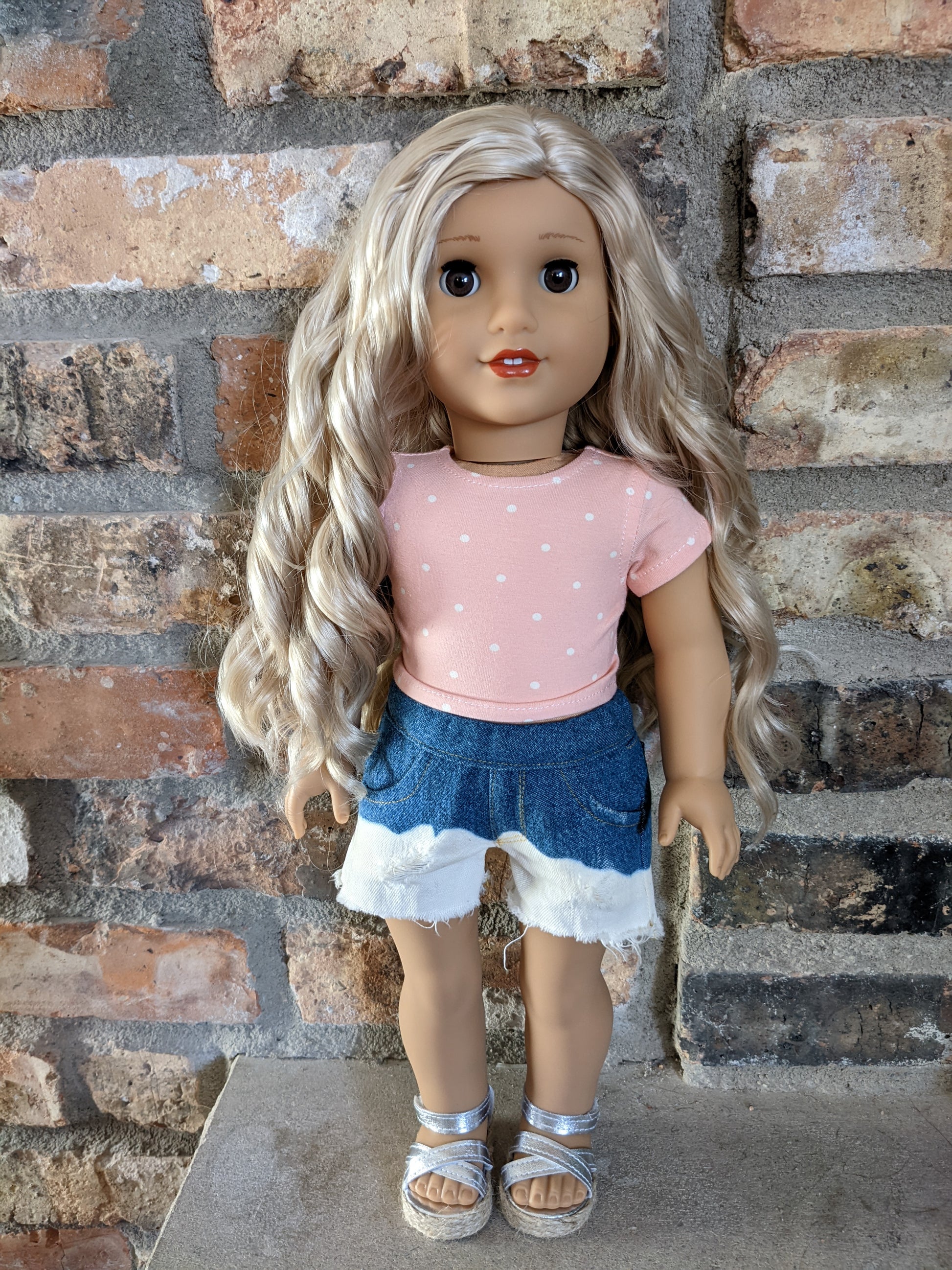 This one of a kind OOAK custom American Girl doll was created with a brand new Kira doll, a new blonde curly wig, and brown eyes. She has lip gloss that was hand painted and sealed. She may have some minor shine marks from handling. She comes with the outfit pictured. If you would like the wig left unattached, please leave a note in the "Order Special Instructions" box upon checkout. Otherwise I will attach the wig using a heavy duty permanent adhesive for a strong hold.
