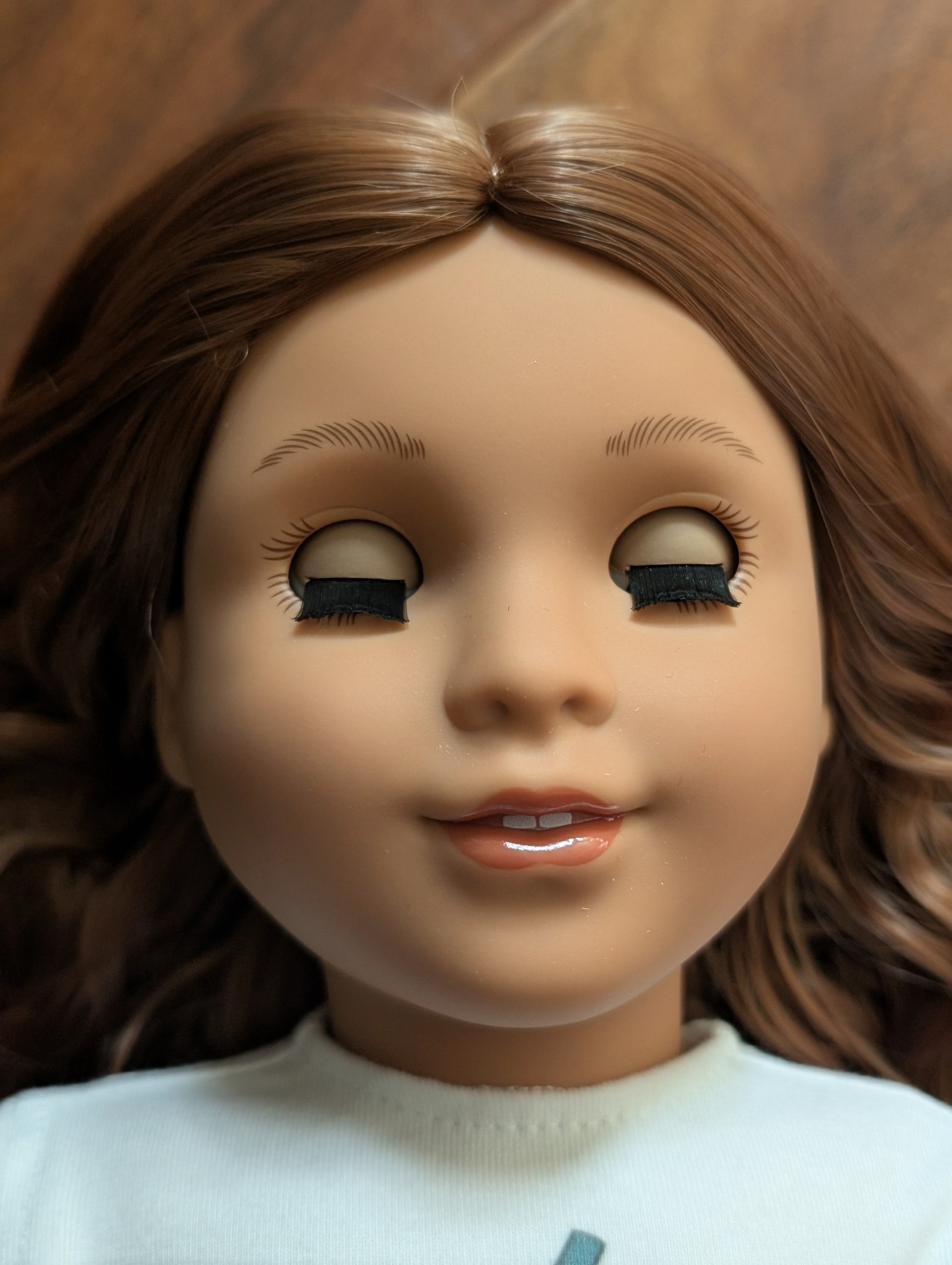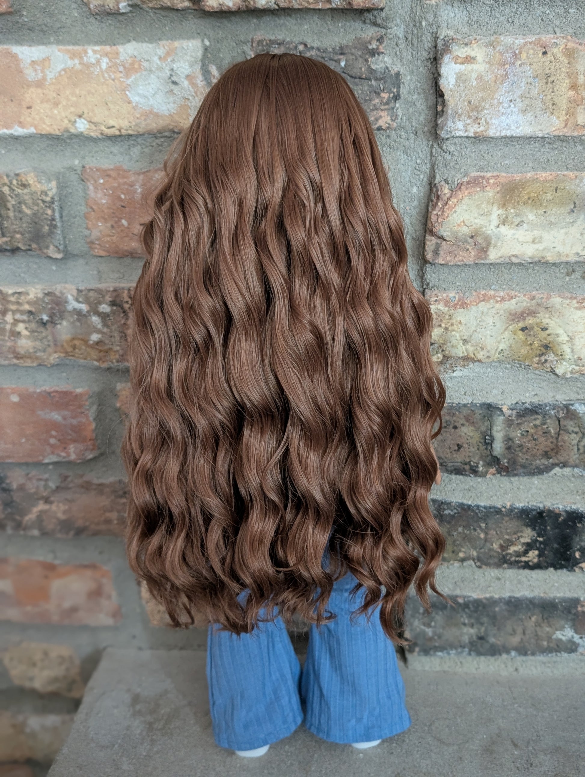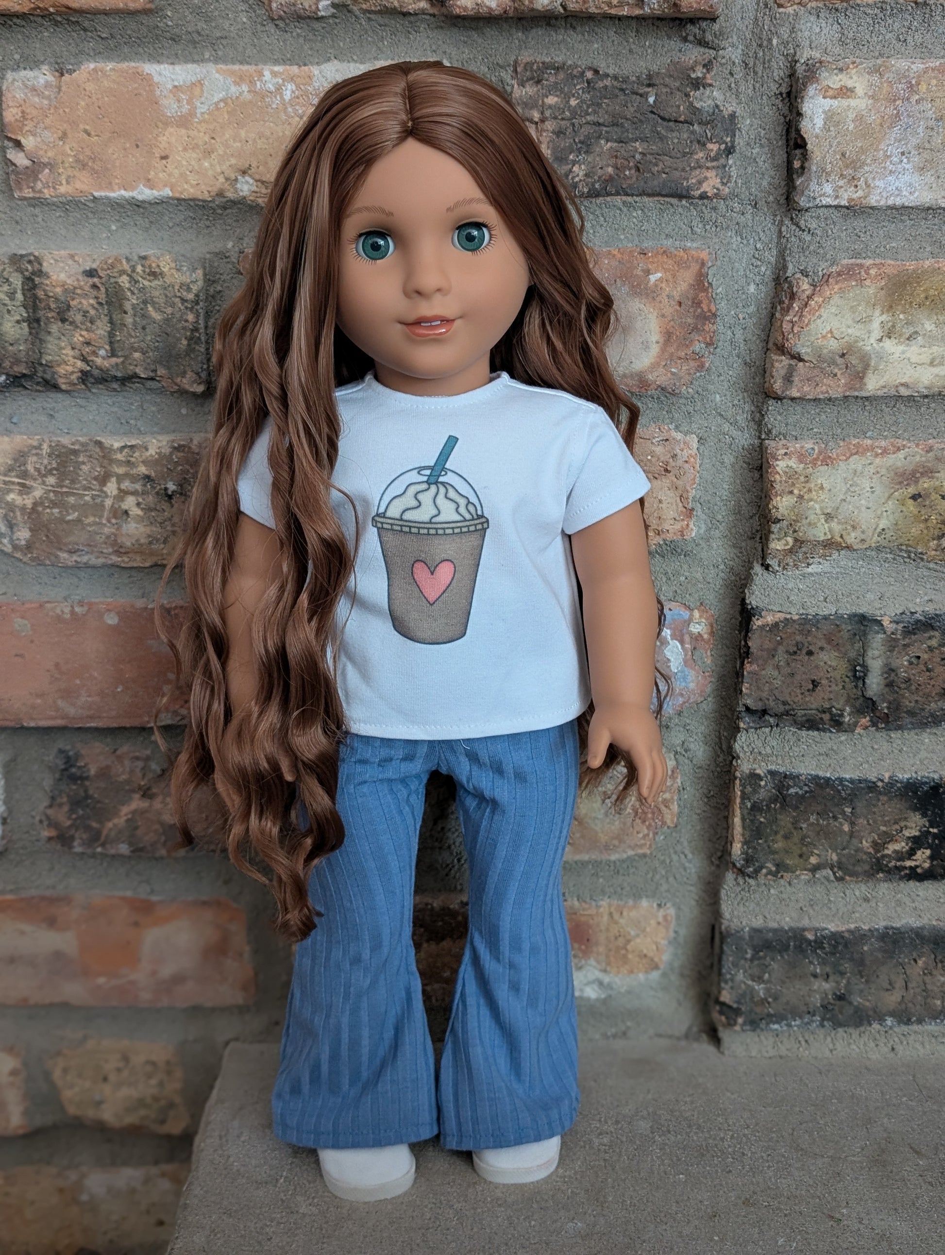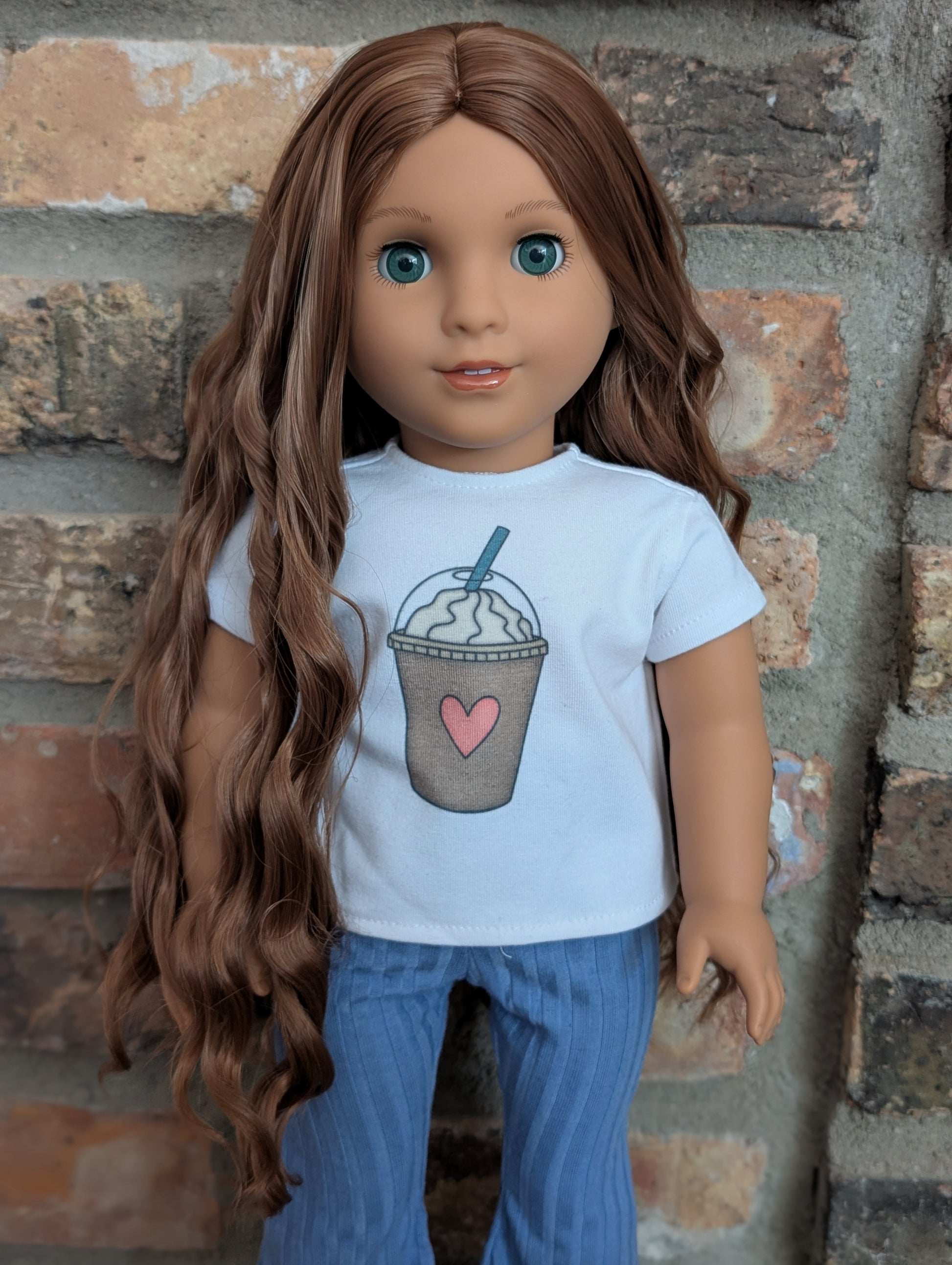 This one of a kind OOAK custom American Girl doll was created with a brand new doll, an auburn wig, and green grey eyes from a Rapunzel doll. She has lip gloss that was hand painted and sealed. She may have some minor shine marks from handling. She comes with the outfit pictured.