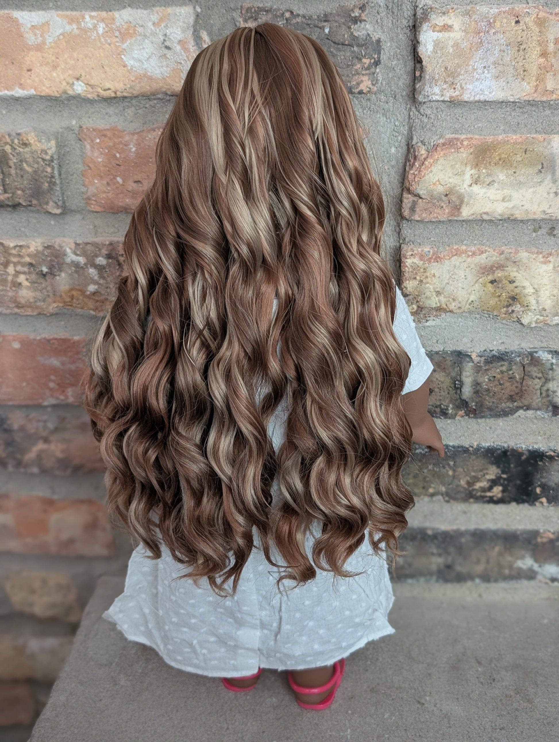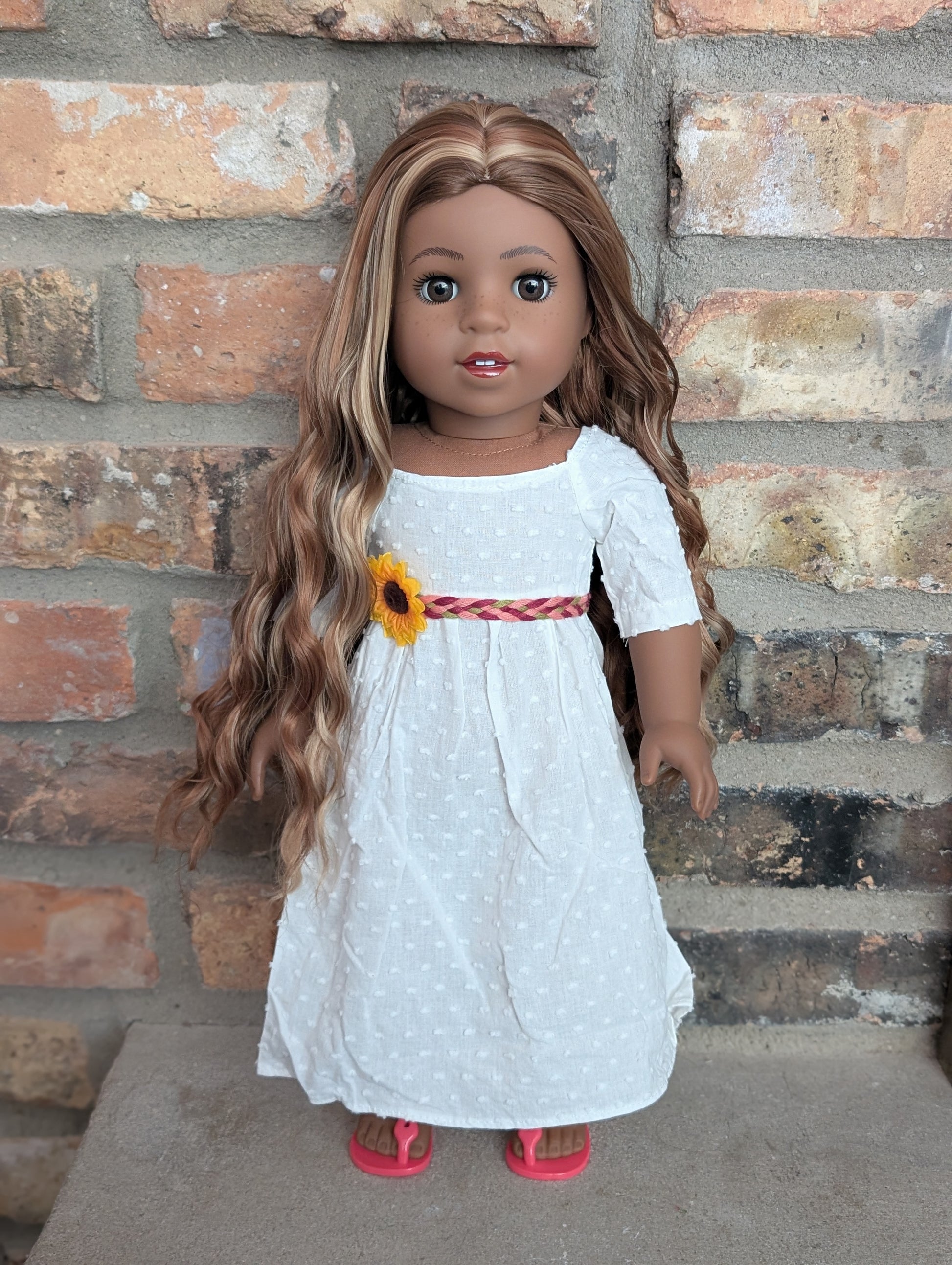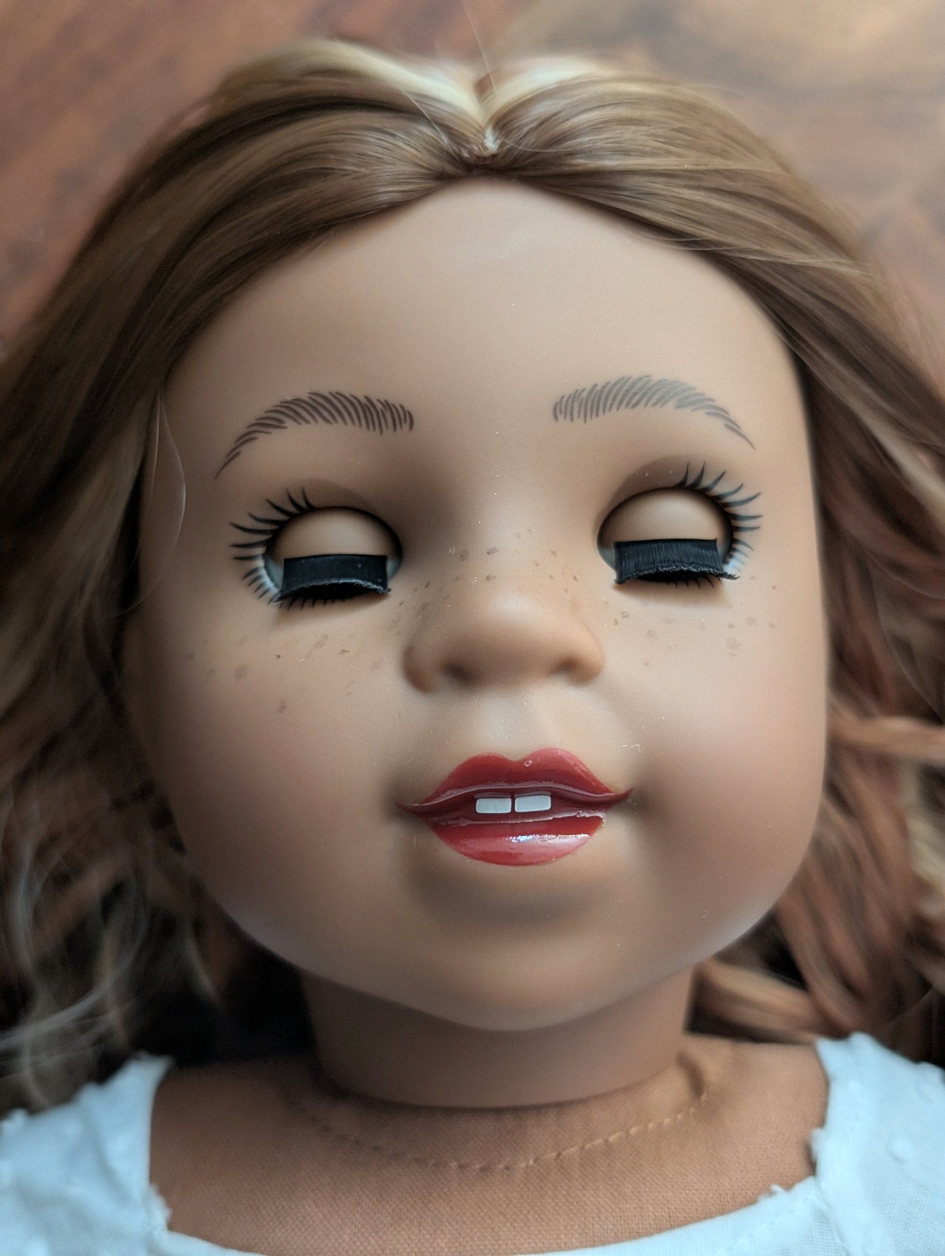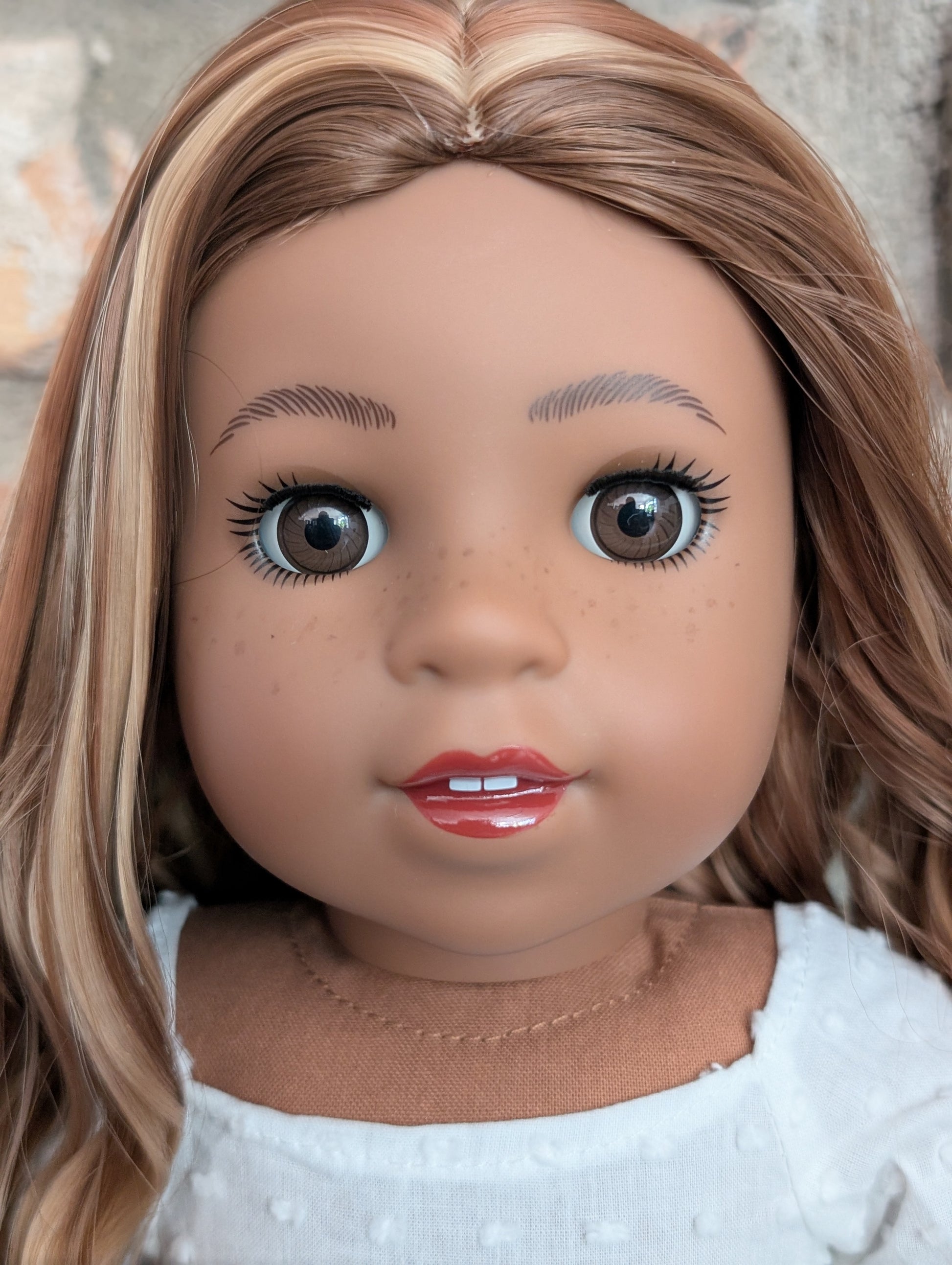 This one of a kind OOAK custom American Girl doll was created with a brand new doll, a brown wig, and brown eyes. She has lip gloss and freckles that were hand painted and sealed. She may have some minor shine marks from handling. She comes with the outfit pictured.