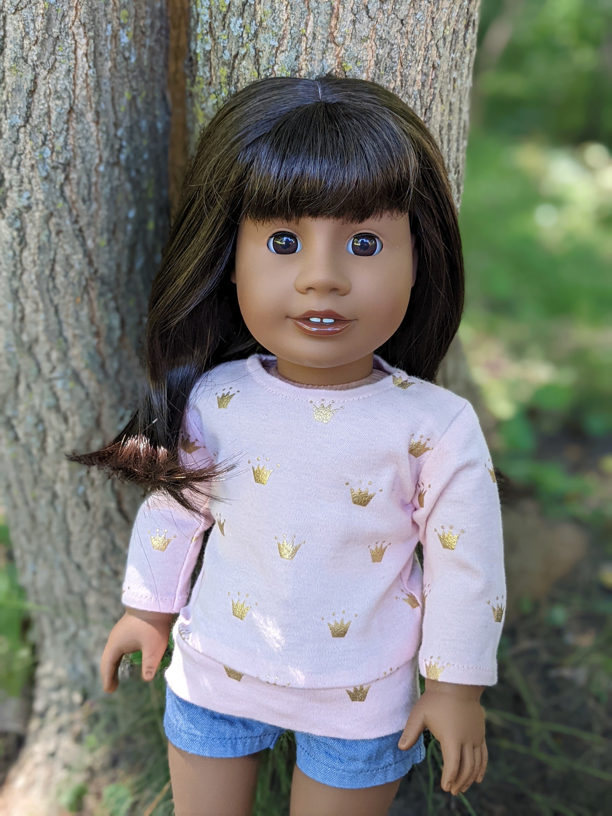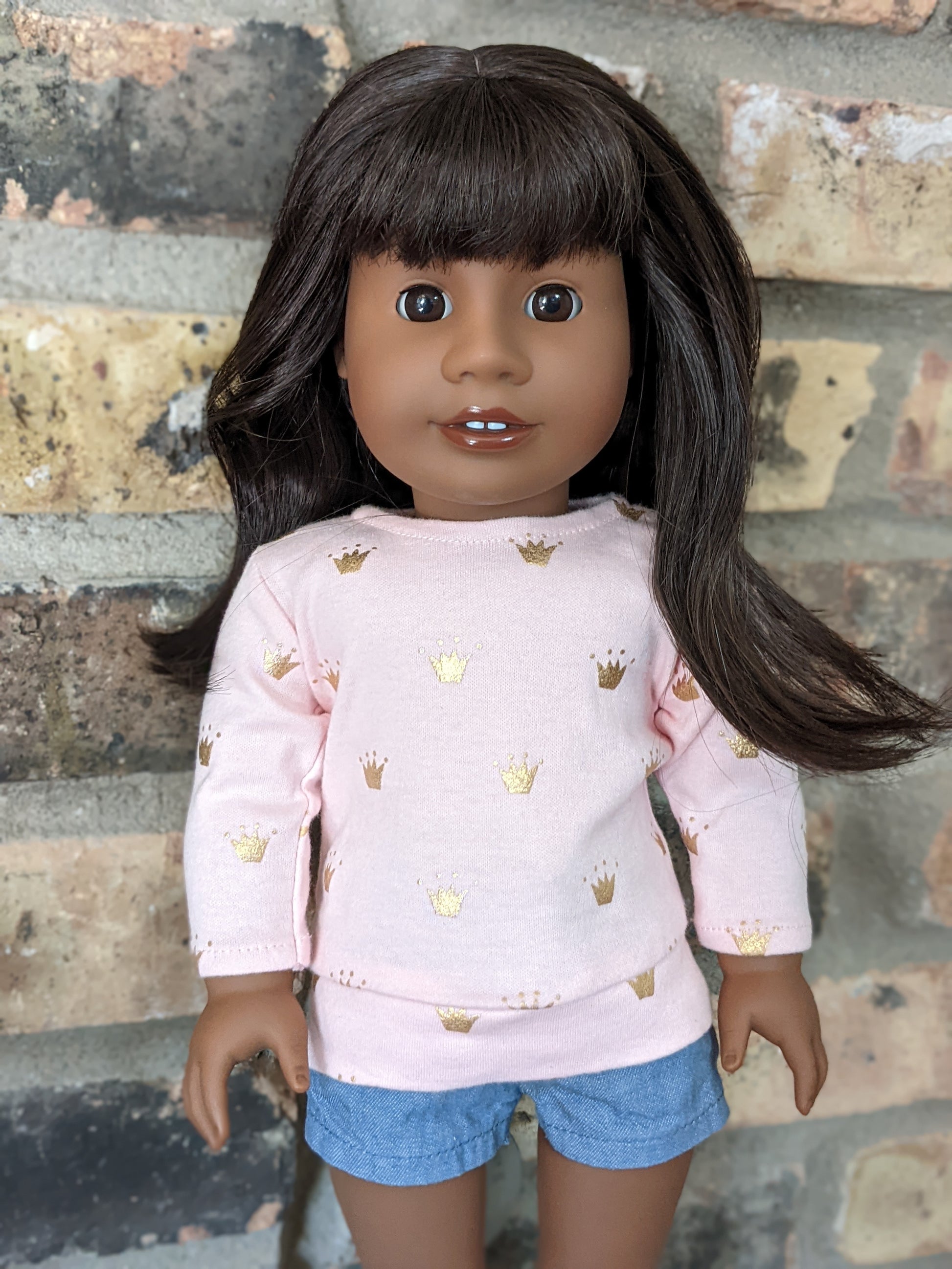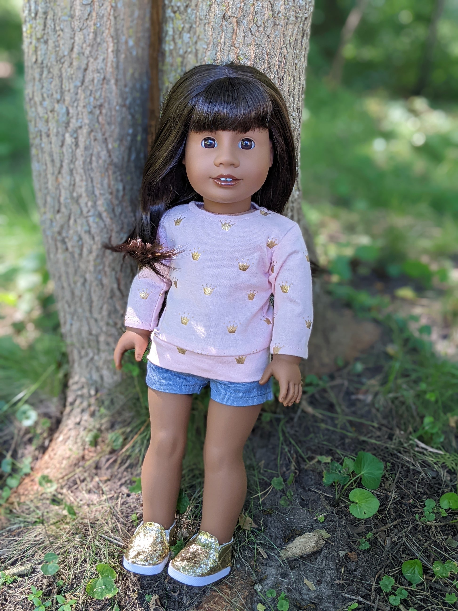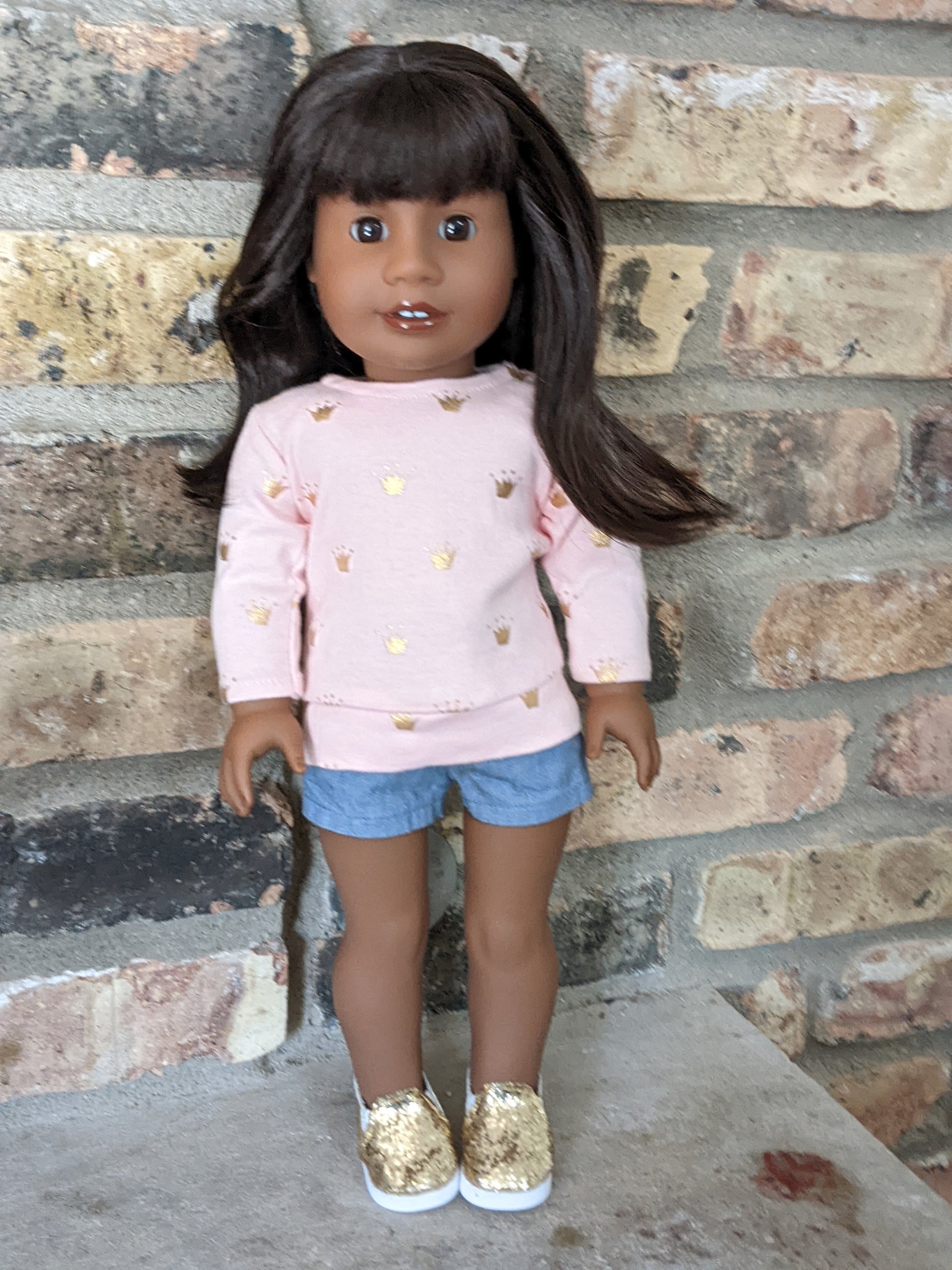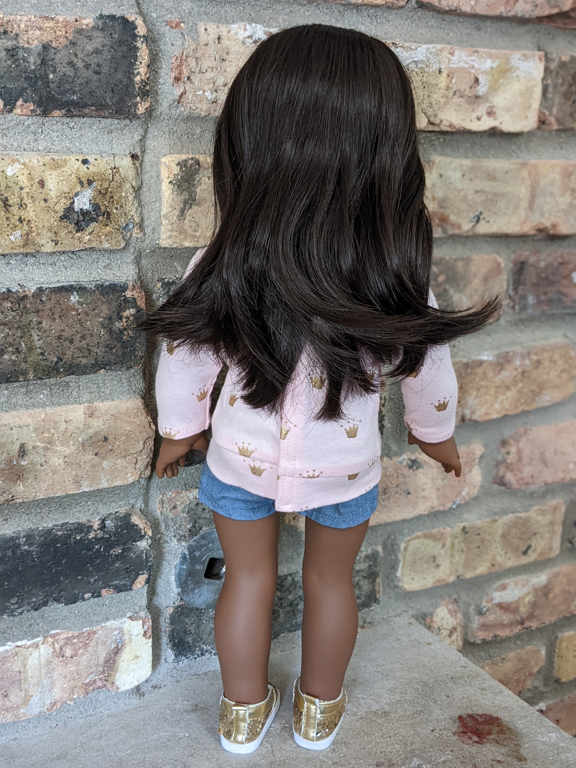 This one of a kind OOAK custom American Girl doll was created with a brand new Truly Me doll, a dark brown wig from a new Truly Me doll, and brown eyes. She has lip gloss that was hand painted and sealed. She may have some minor shine marks from handling. She comes with the outfit pictured. She has the microfiber cloth body.