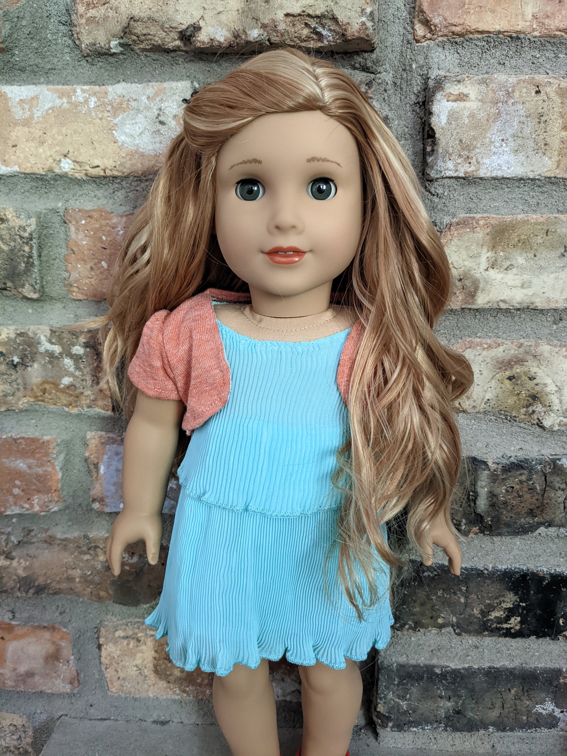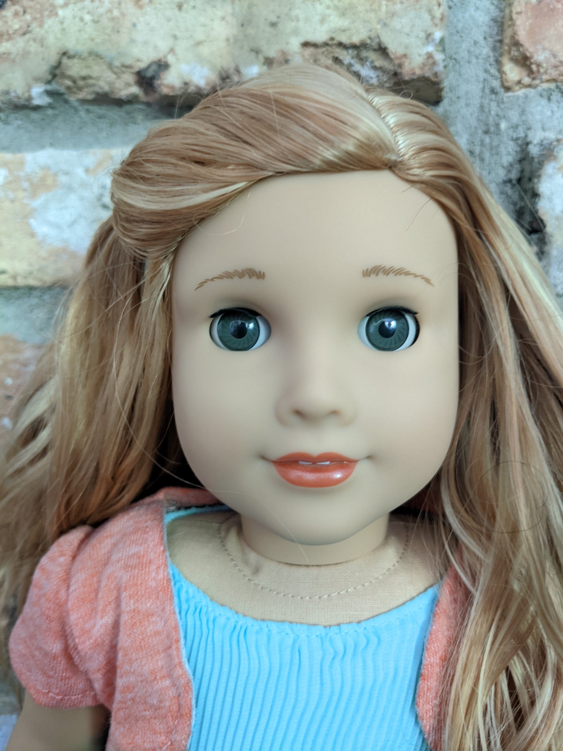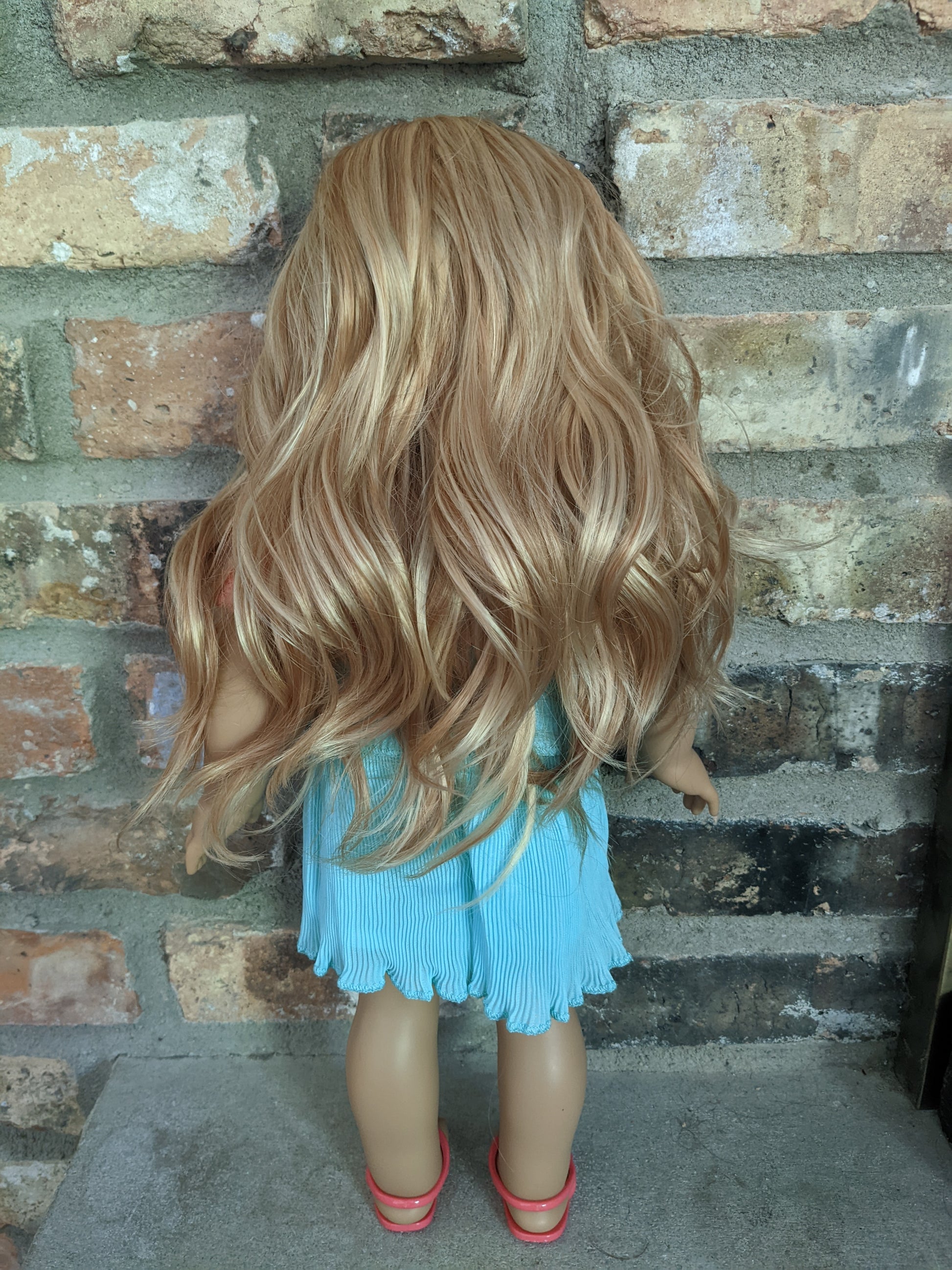 This one of a kind OOAK custom American Girl doll was created with a brand new Joss doll, a strawberry blonde wavy wig, and grey eyes. She has lip gloss that was hand painted and sealed. She may have some minor shine marks from handling. She comes with the outfit pictured. If you would like the wig left unattached, please leave a note in the "Order Special Instructions" box upon checkout. Otherwise I will attach the wig using a heavy duty permanent adhesive for a strong hold.