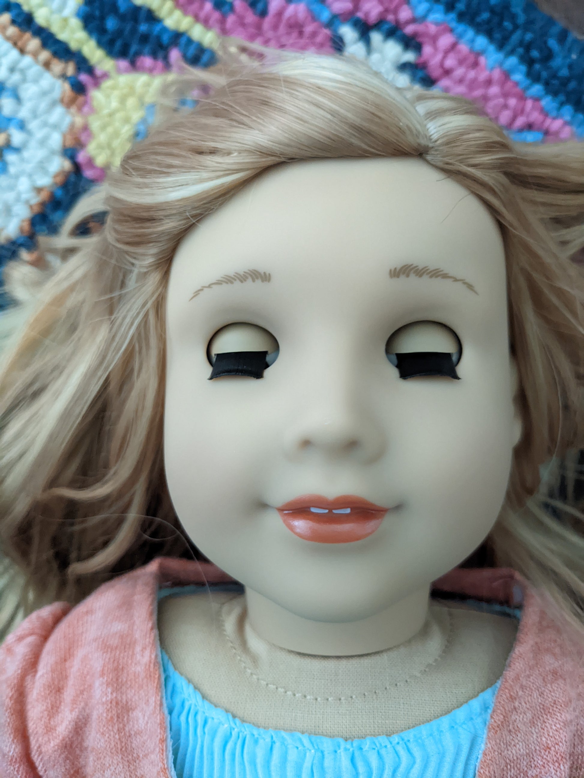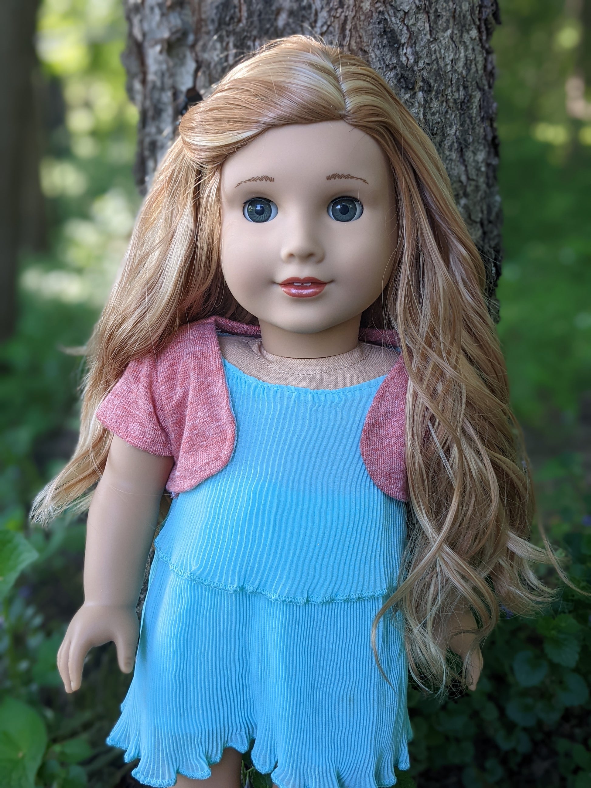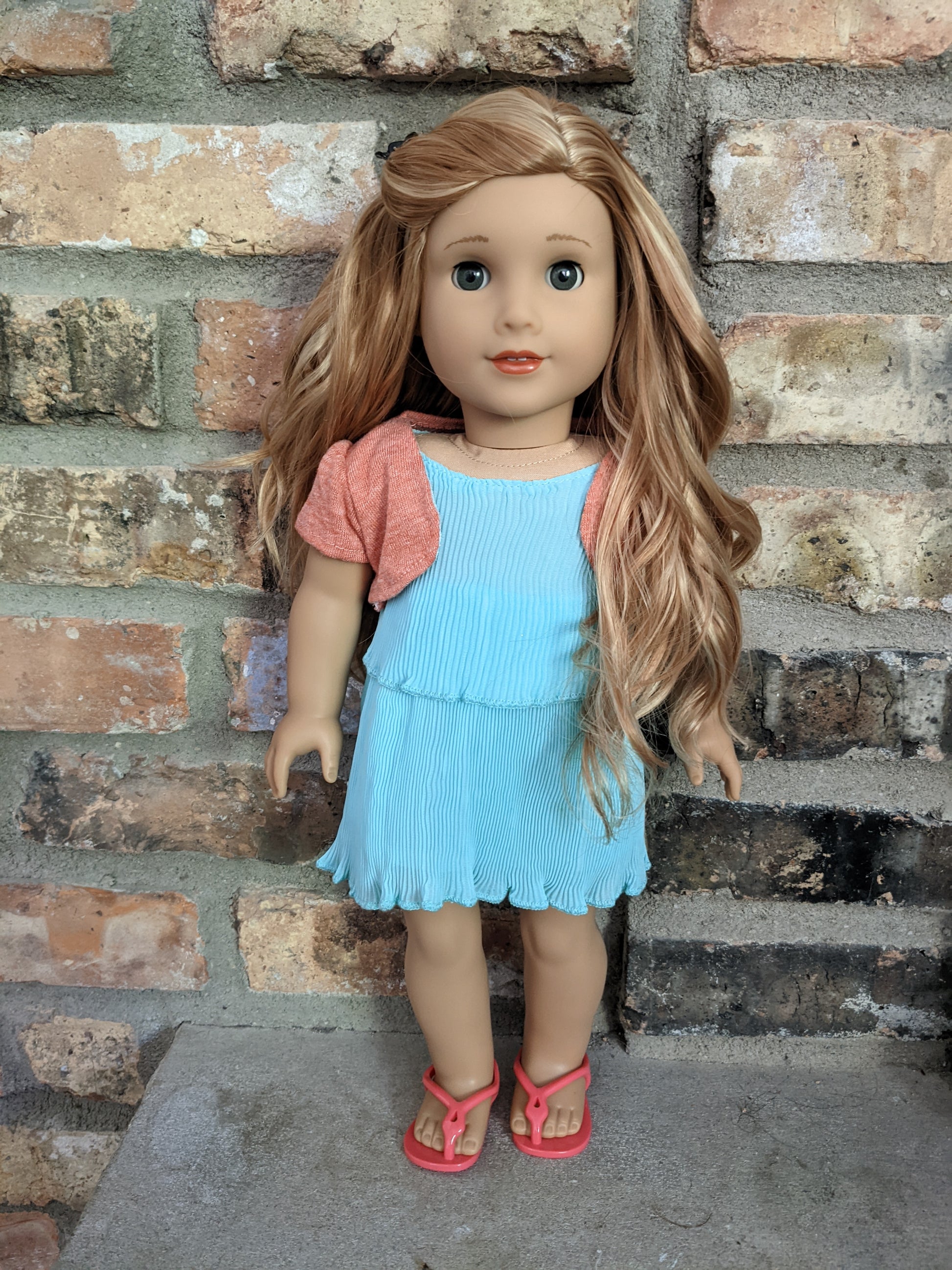 This one of a kind OOAK custom American Girl doll was created with a brand new Joss doll, a strawberry blonde wavy wig, and grey eyes. She has lip gloss that was hand painted and sealed. She may have some minor shine marks from handling. She comes with the outfit pictured. If you would like the wig left unattached, please leave a note in the "Order Special Instructions" box upon checkout. Otherwise I will attach the wig using a heavy duty permanent adhesive for a strong hold.