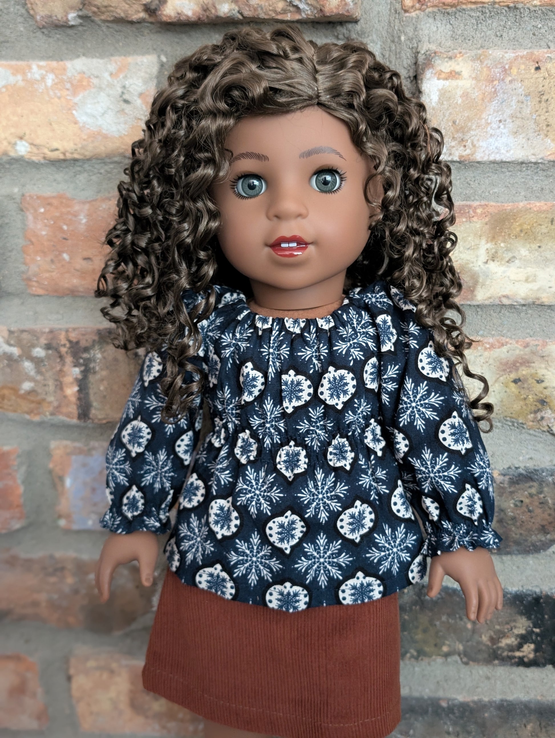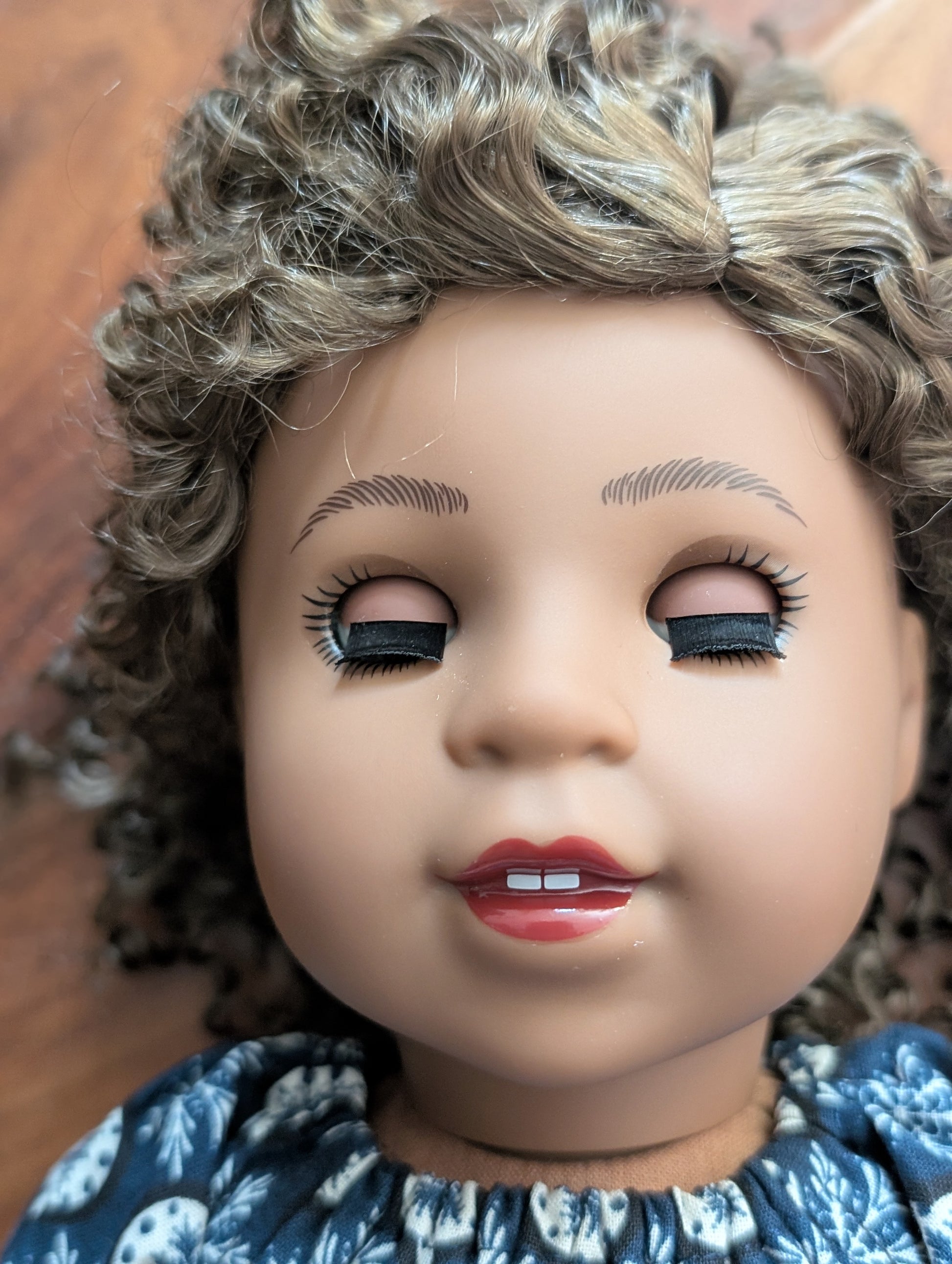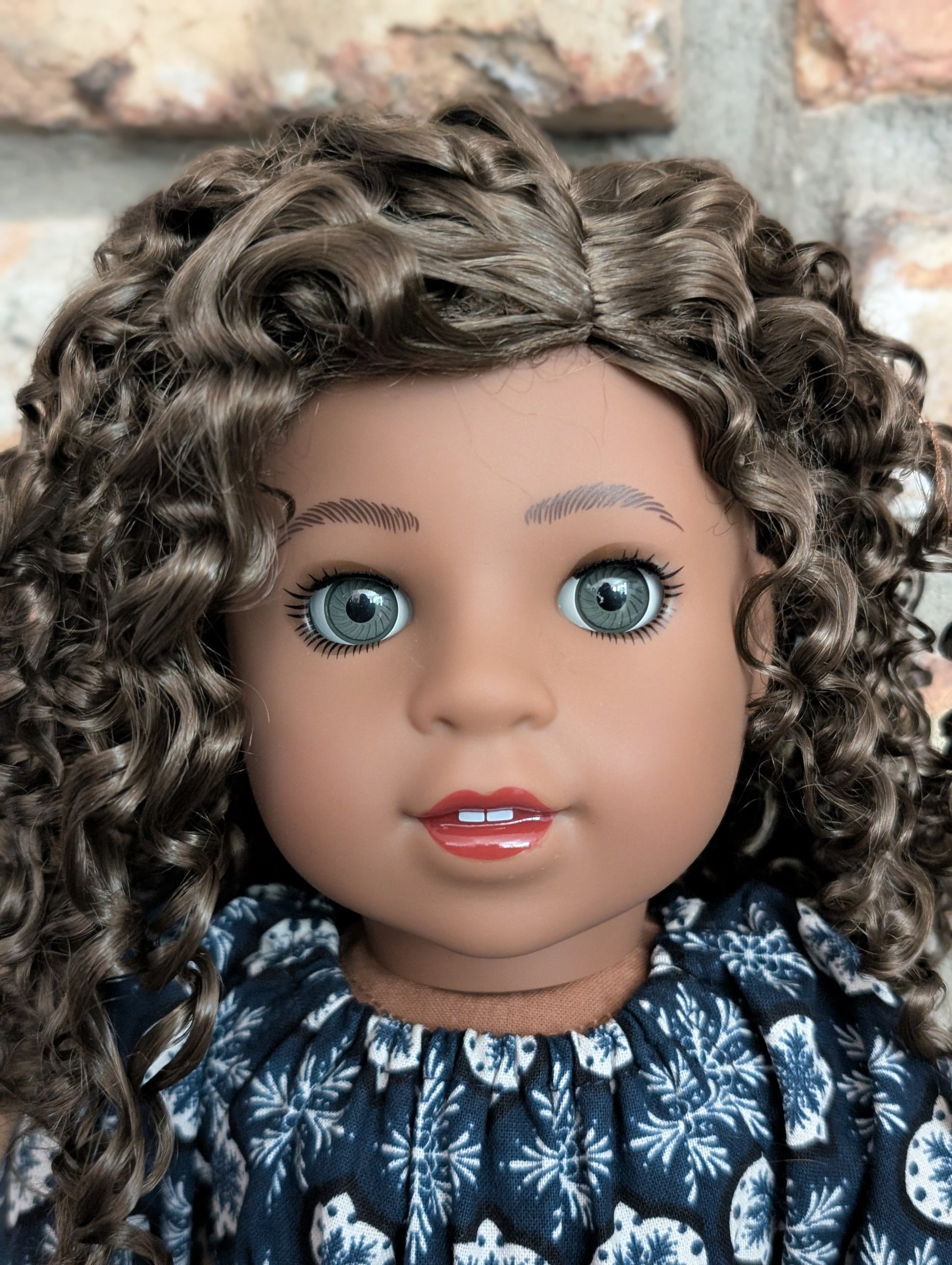 This one of a kind OOAK custom American Girl doll was created with a brand new doll, a brown wig, and grey eyes. She has lip gloss that was hand painted and sealed. She may have some minor shine marks from handling. She comes with the outfit pictured. This is a vegan mohair wig so it doesn't have hair at the edge of the wig cap.