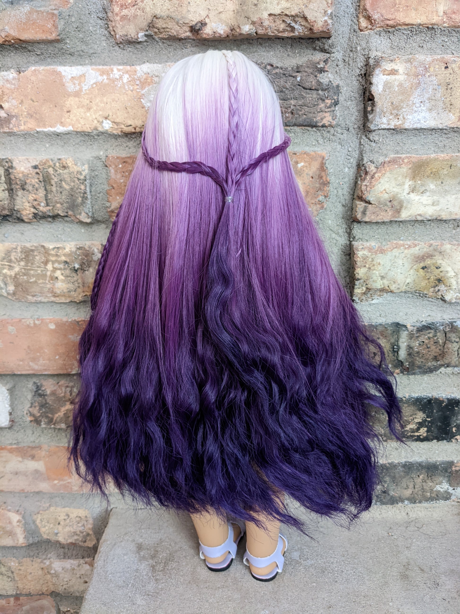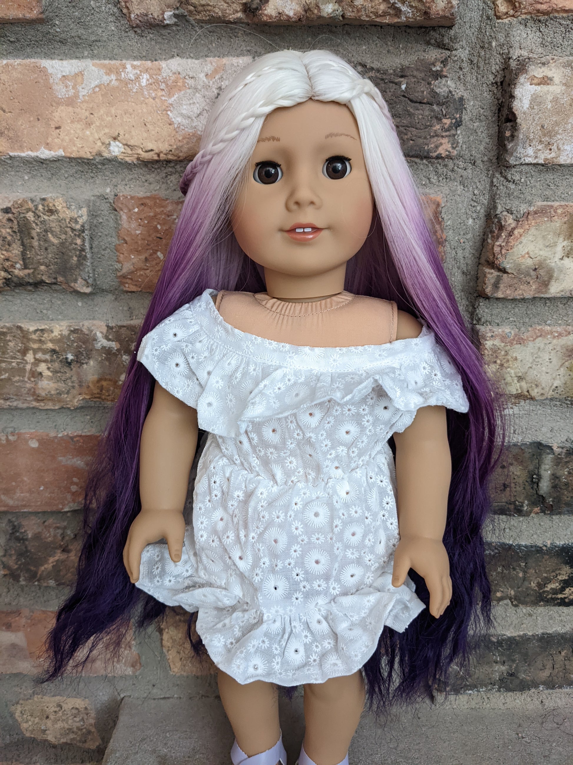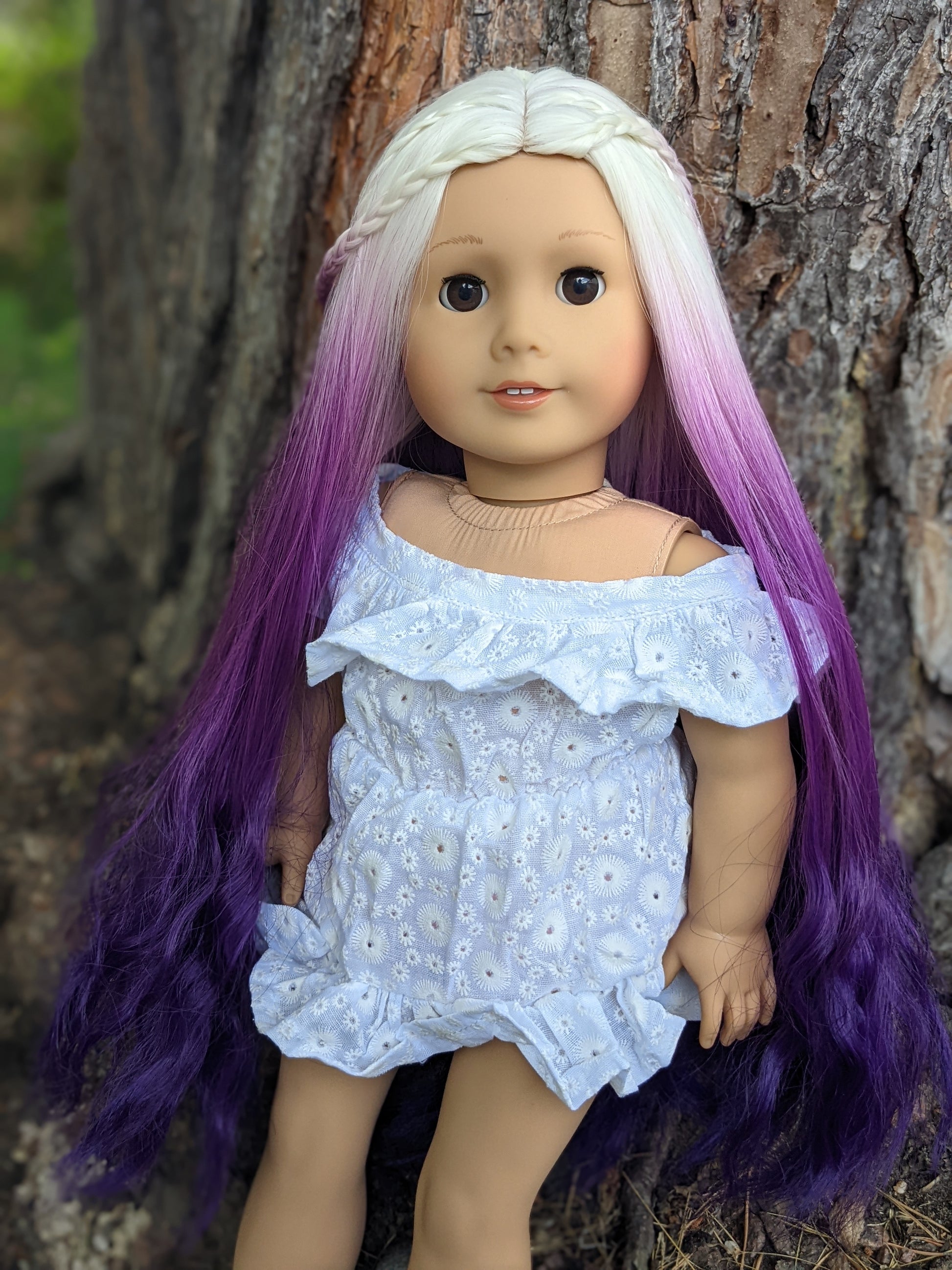 This one of a kind OOAK custom American Girl doll was created with a brand new Truly Me doll, a purple and white ombre wig, and brown eyes. She has lip gloss that was hand painted and sealed. She may have some minor shine marks from handling. She comes with the outfit pictured. She has the microfiber cloth body with permapanties and a tiny x on her bum.