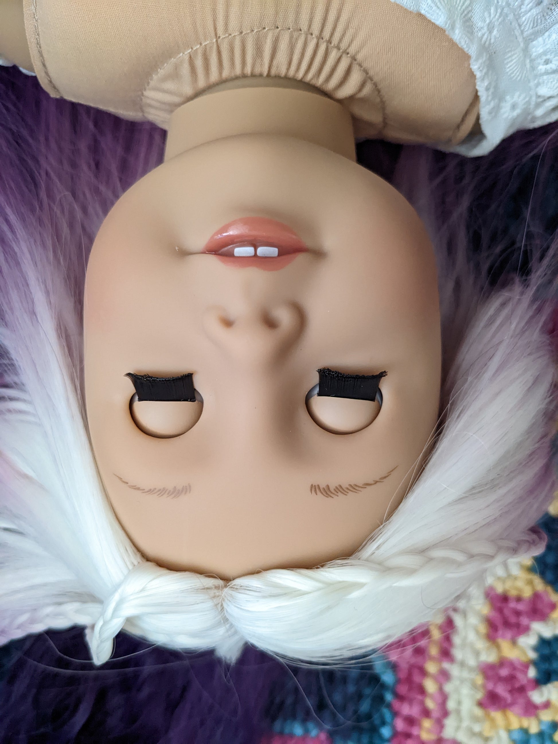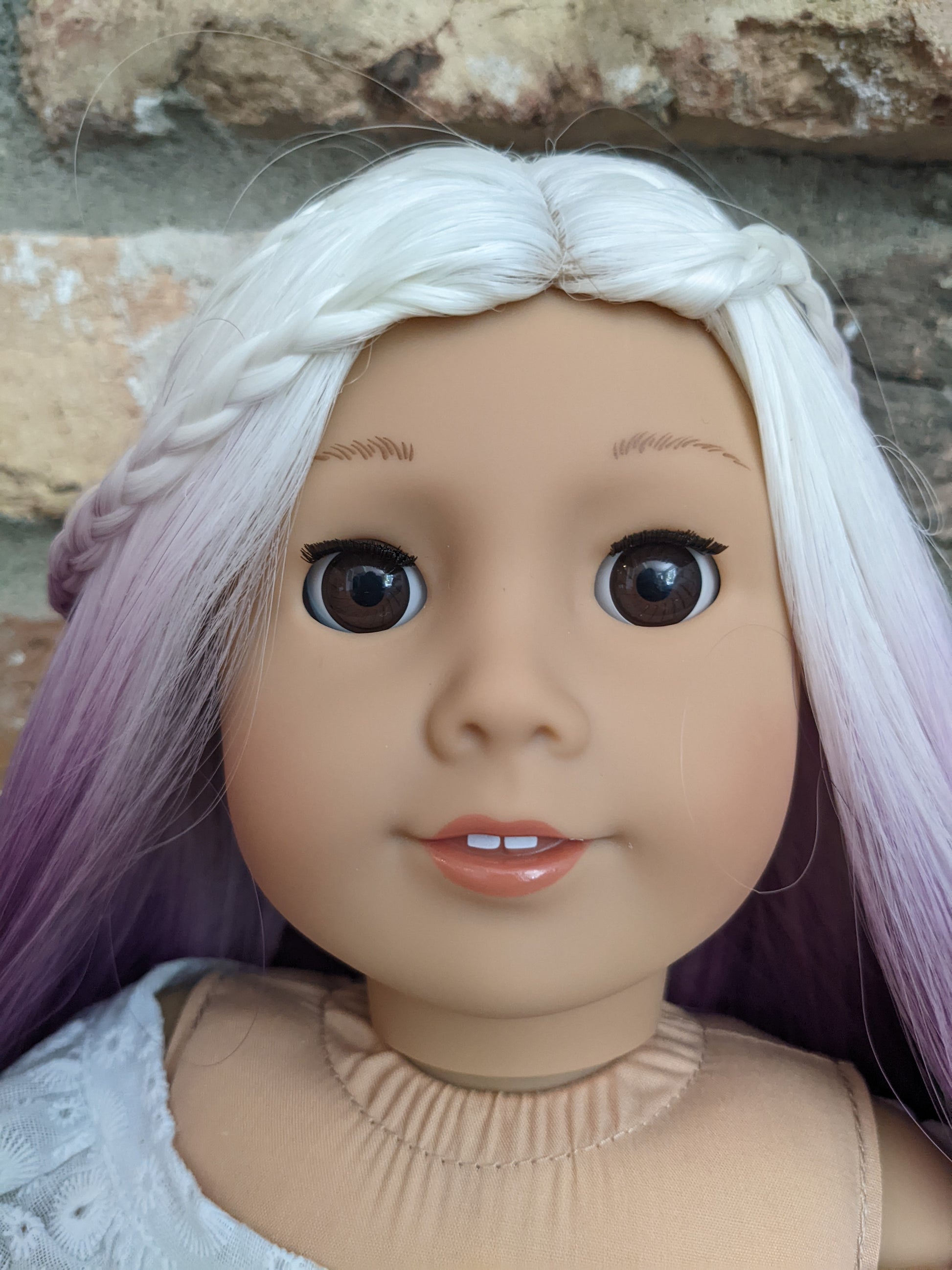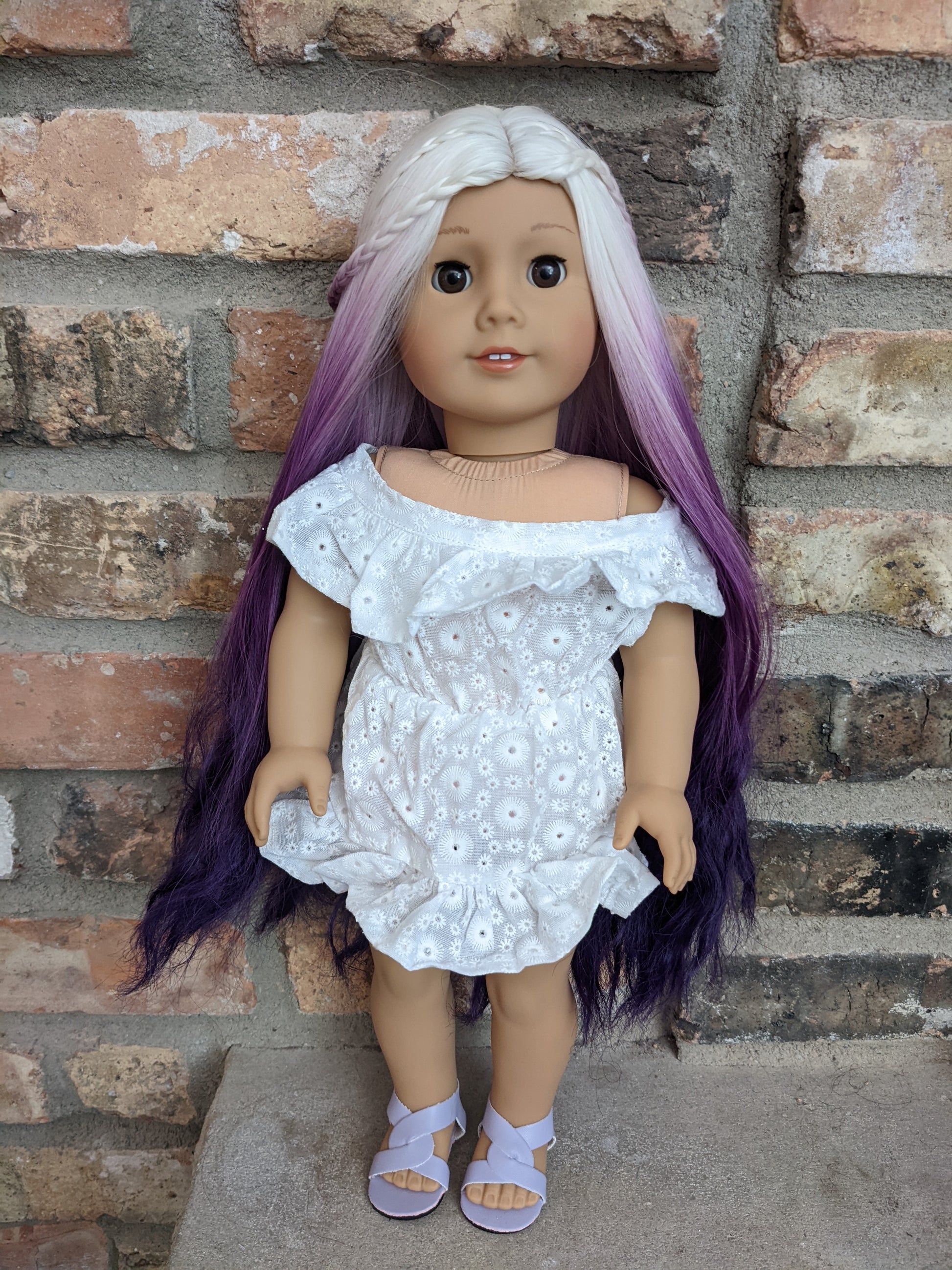 This one of a kind OOAK custom American Girl doll was created with a brand new Truly Me doll, a purple and white ombre wig, and brown eyes. She has lip gloss that was hand painted and sealed. She may have some minor shine marks from handling. She comes with the outfit pictured. She has the microfiber cloth body with permapanties and a tiny x on her bum.