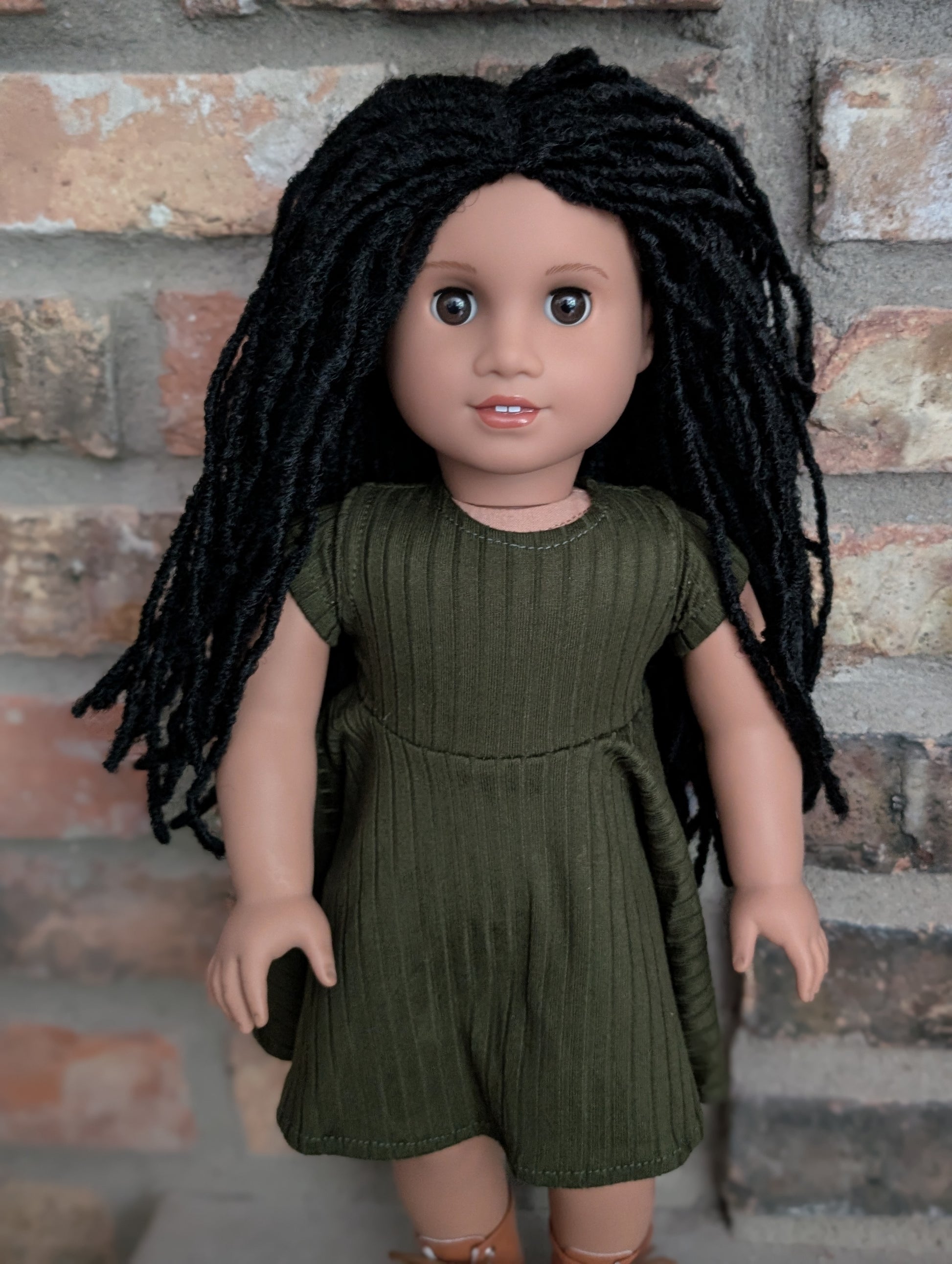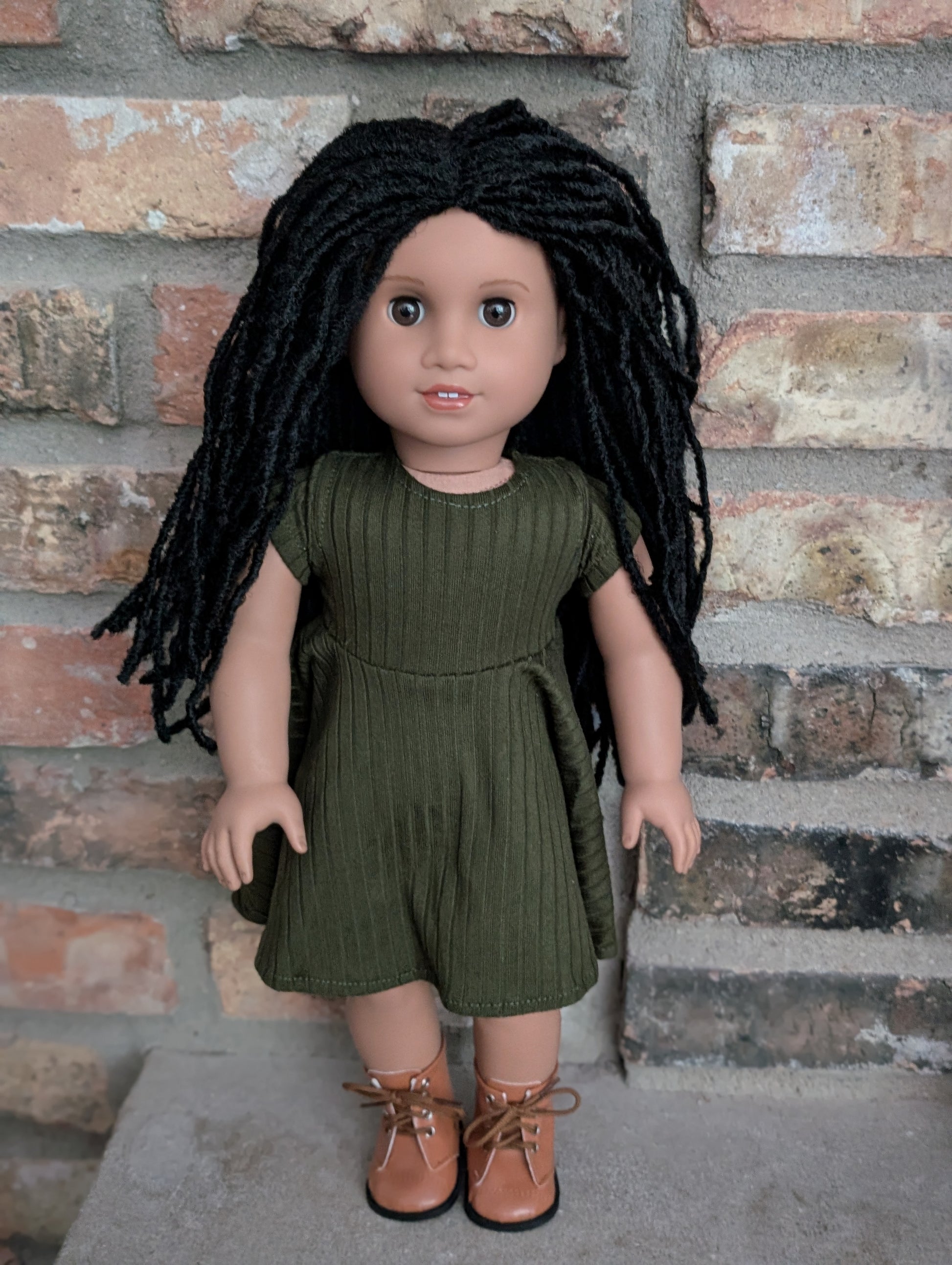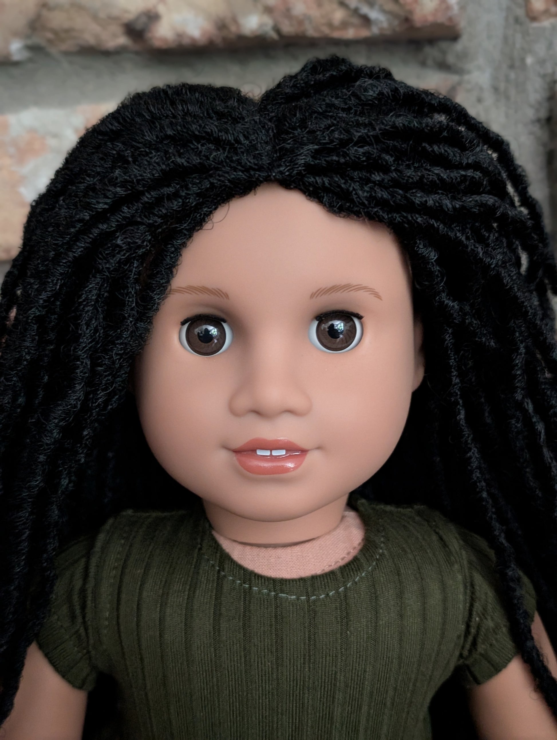This one of a kind OOAK custom American Girl doll was created with a brand new doll, a black wig, and brown eyes. She has lip gloss that was hand painted and sealed. She may have some minor shine marks from handling. She comes with the outfit pictured.