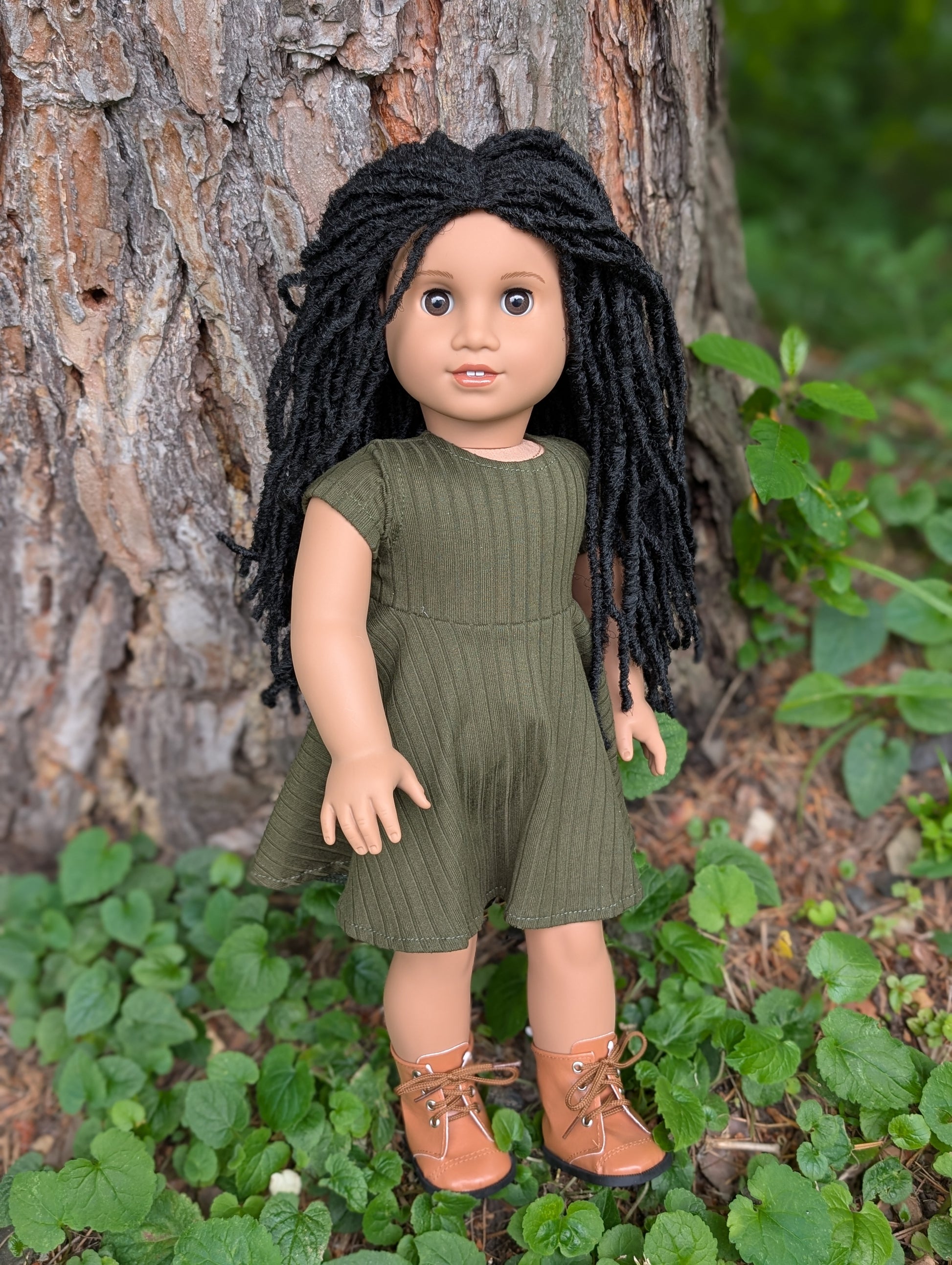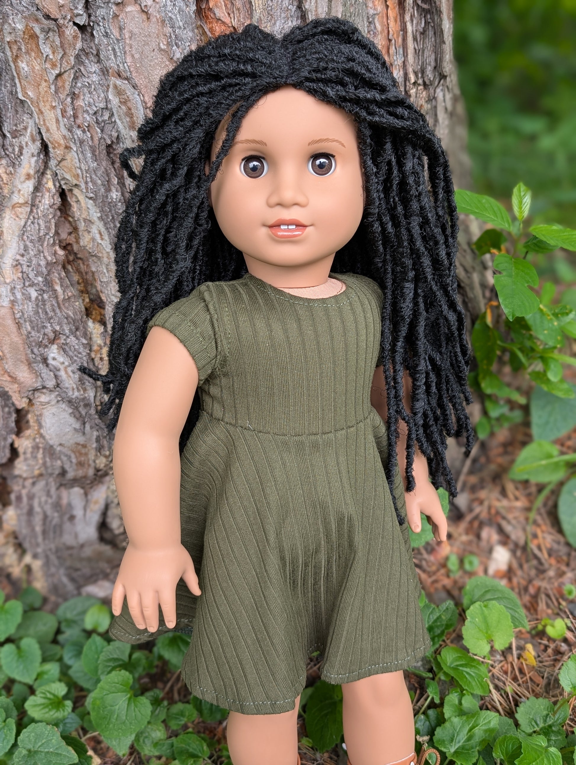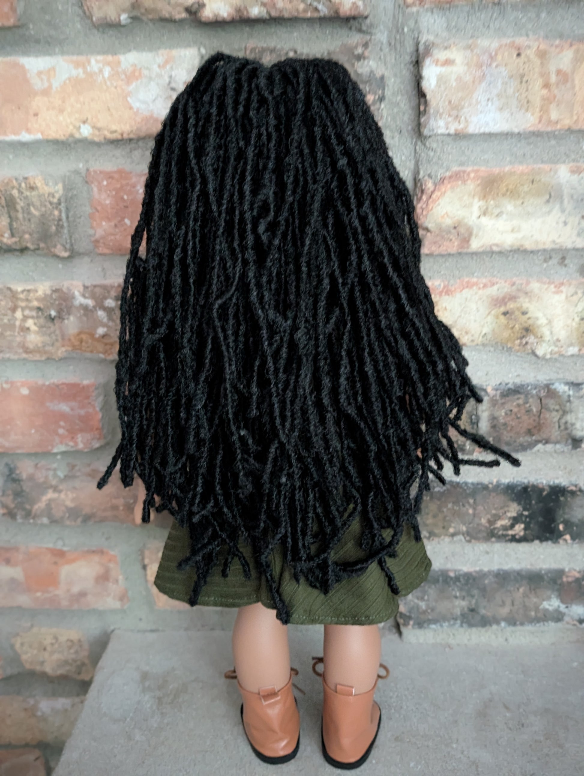 This one of a kind OOAK custom American Girl doll was created with a brand new doll, a black wig, and brown eyes. She has lip gloss that was hand painted and sealed. She may have some minor shine marks from handling. She comes with the outfit pictured.