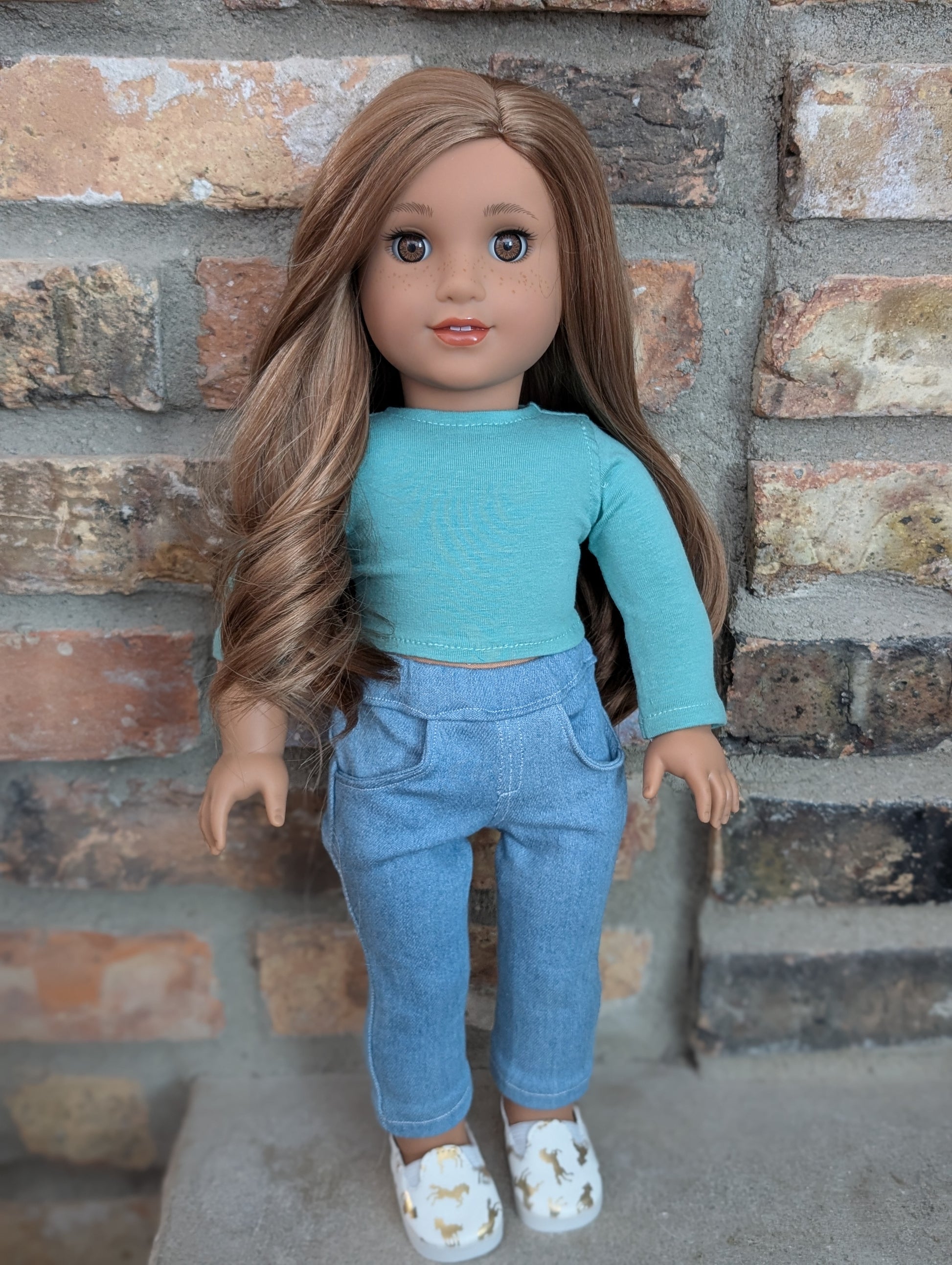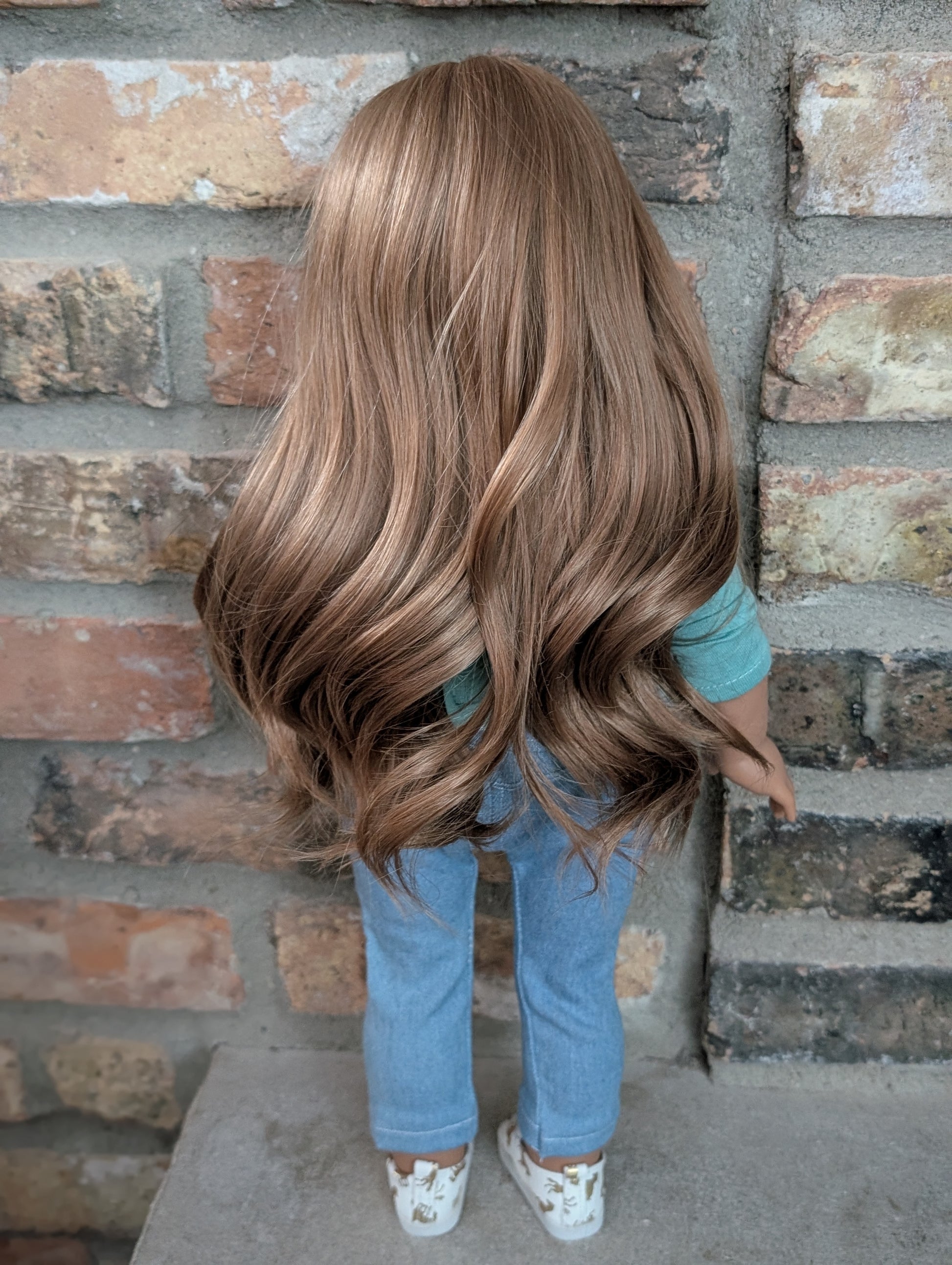 This one of a kind OOAK custom American Girl doll was created with a brand new doll, a brown wig, and light brown eyes. She has lip gloss that was hand painted and sealed. She may have some minor shine marks from handling. She comes with the outfit pictured.