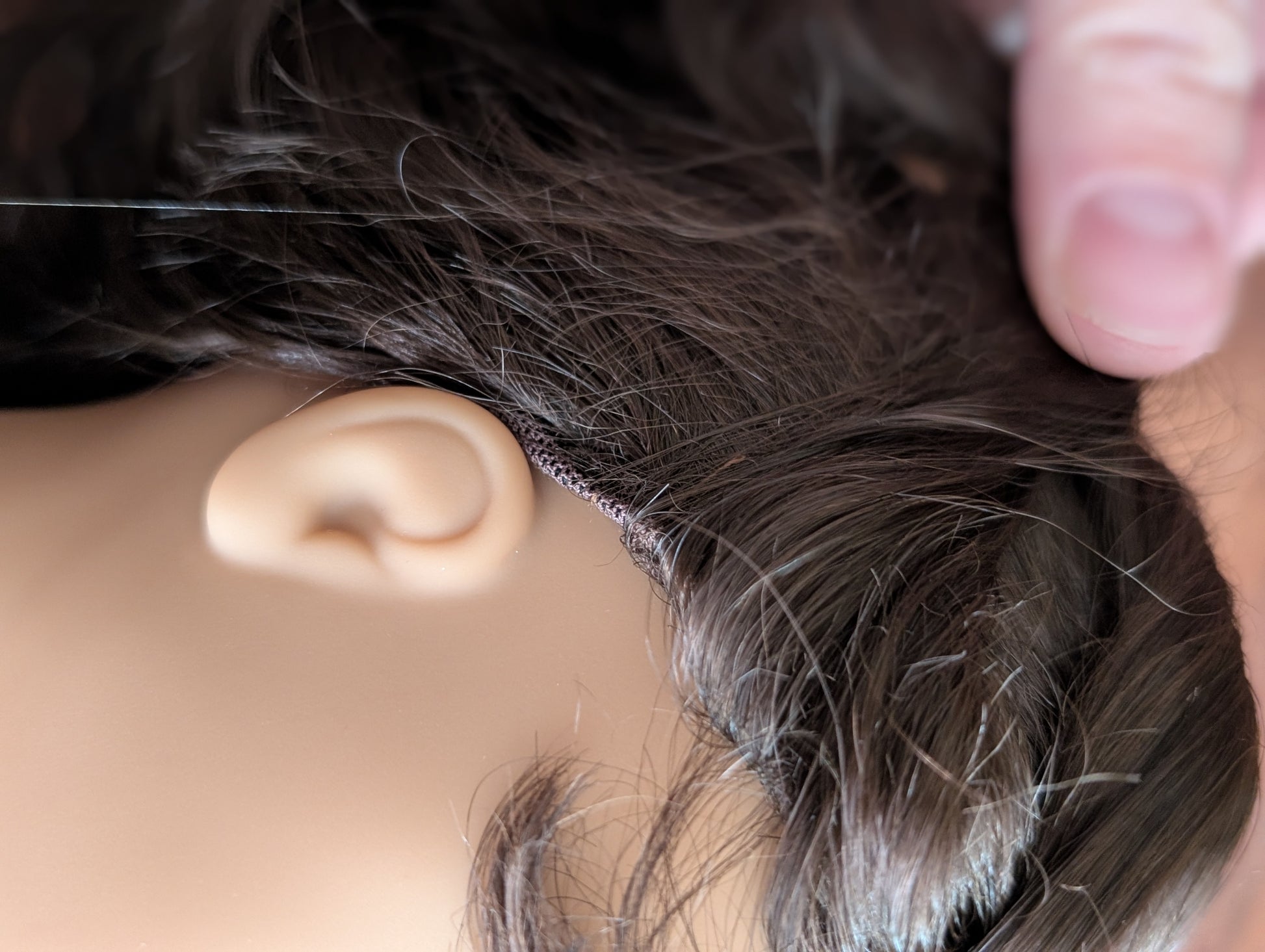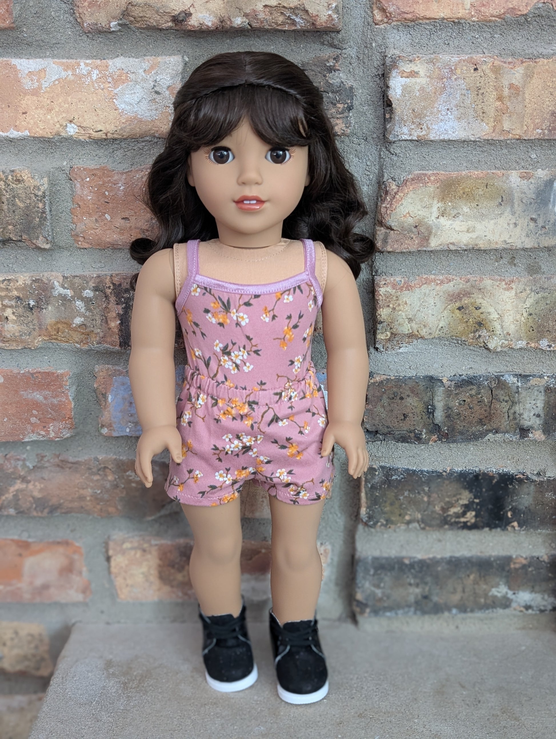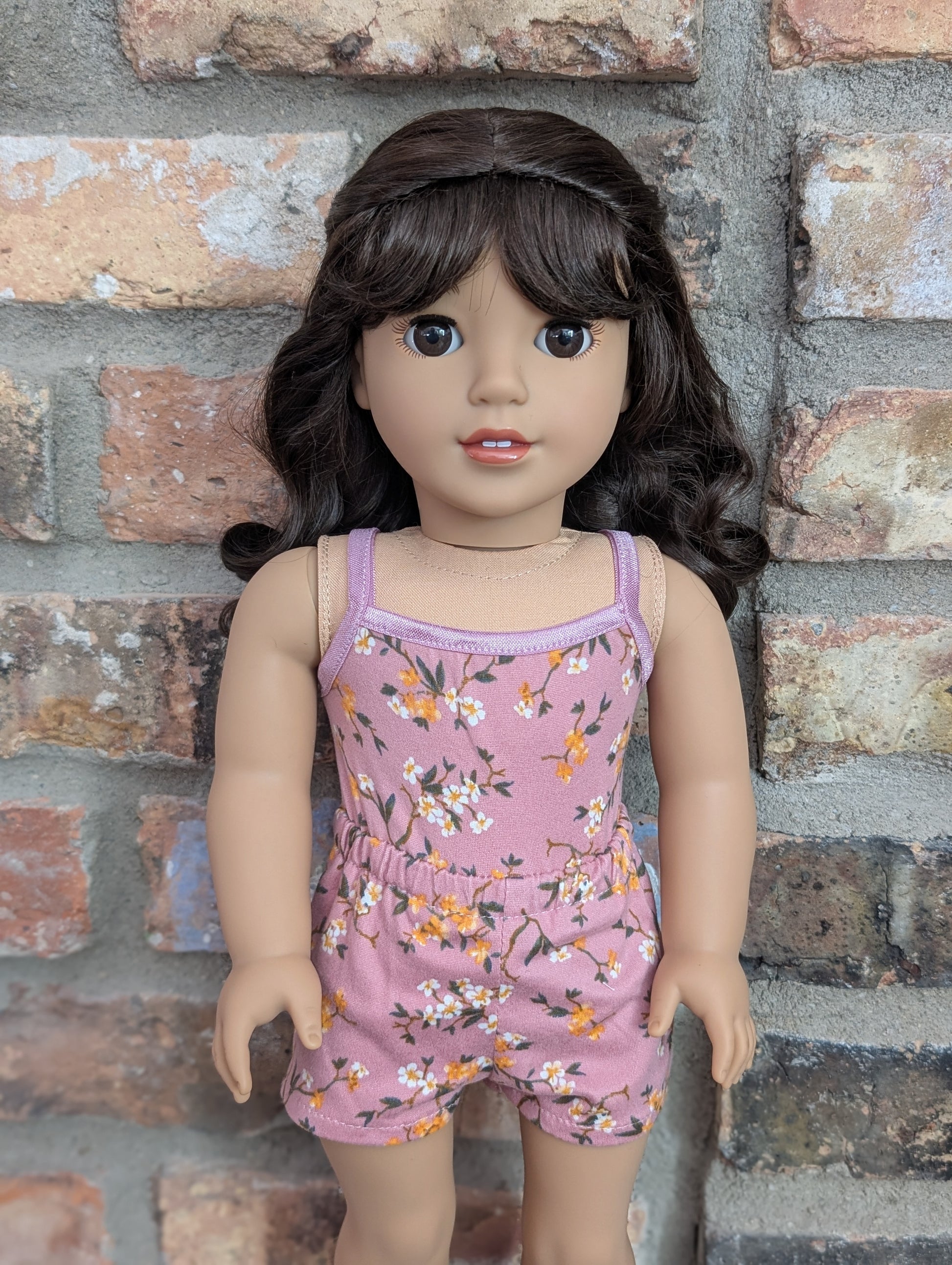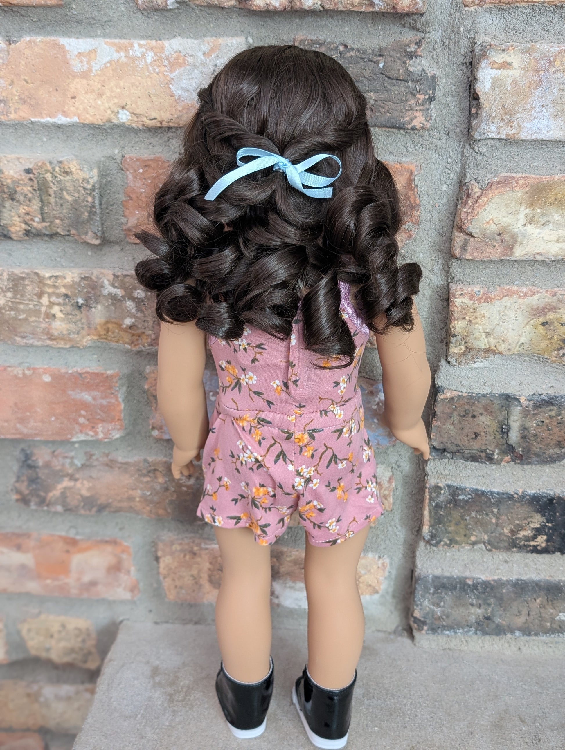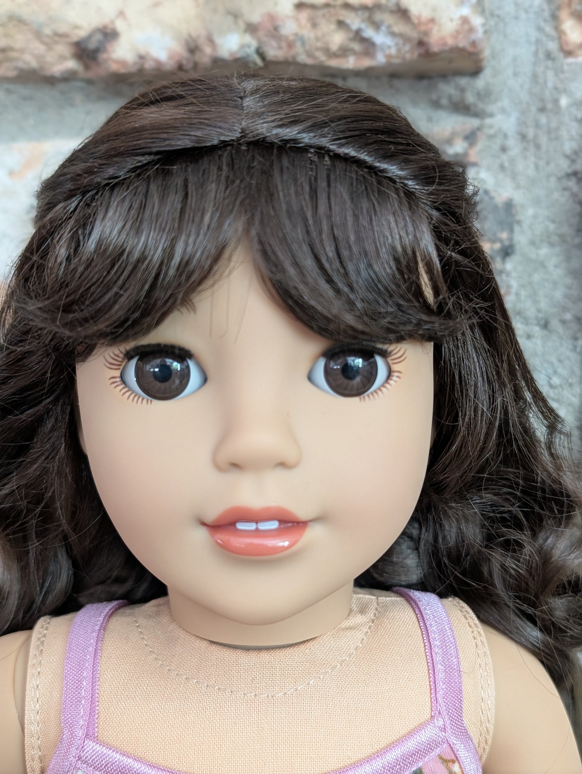 This one of a kind OOAK custom American Girl doll was created with a brand new doll, a brown wig, and brown eyes. She has lip gloss that was hand painted and sealed. She may have some minor shine marks from handling. She comes with the outfit pictured. Her wig is a vegan mohair wig and the edge of the wig cap will show if her hair is pulled back as shown in the last photo.