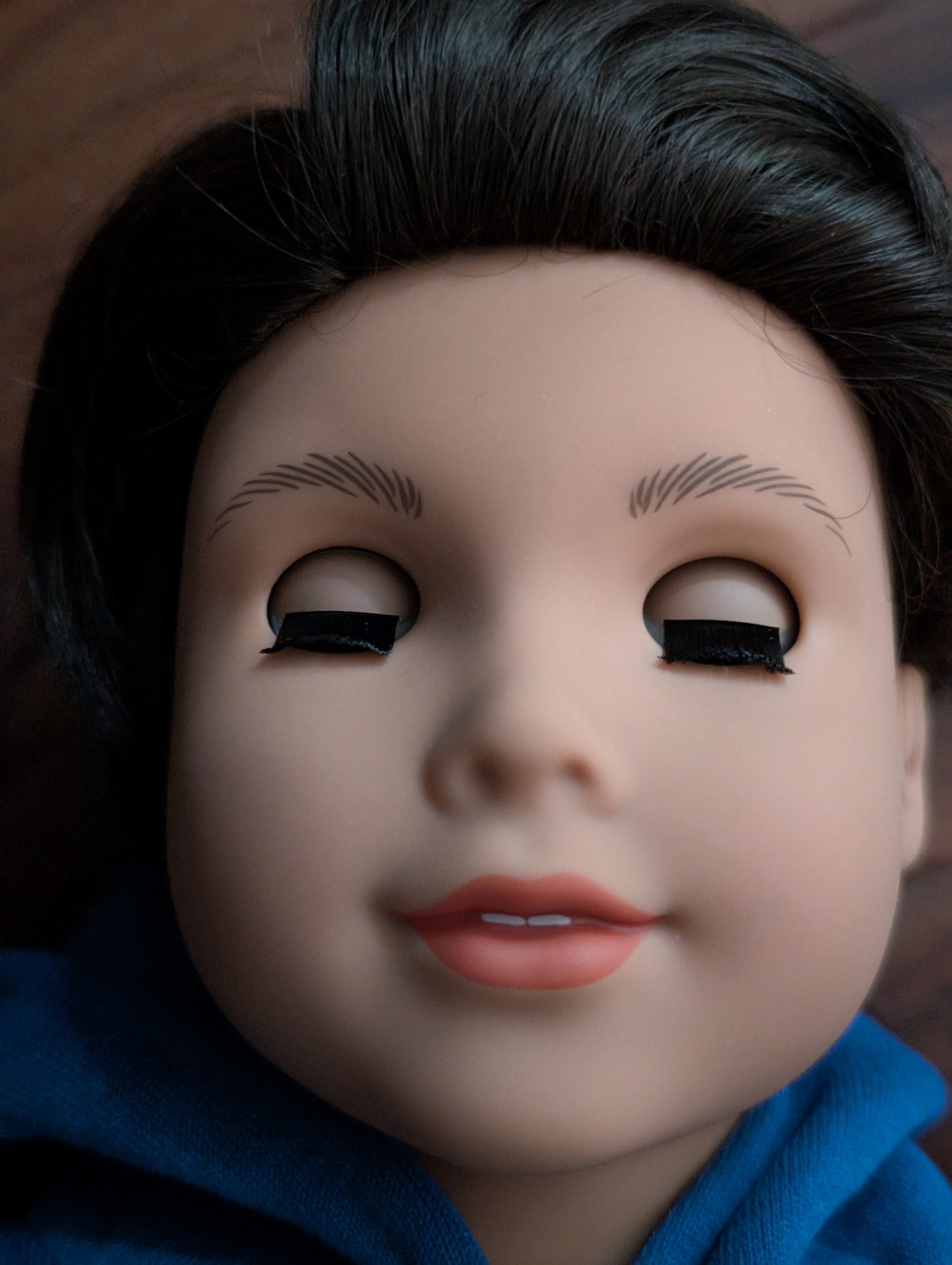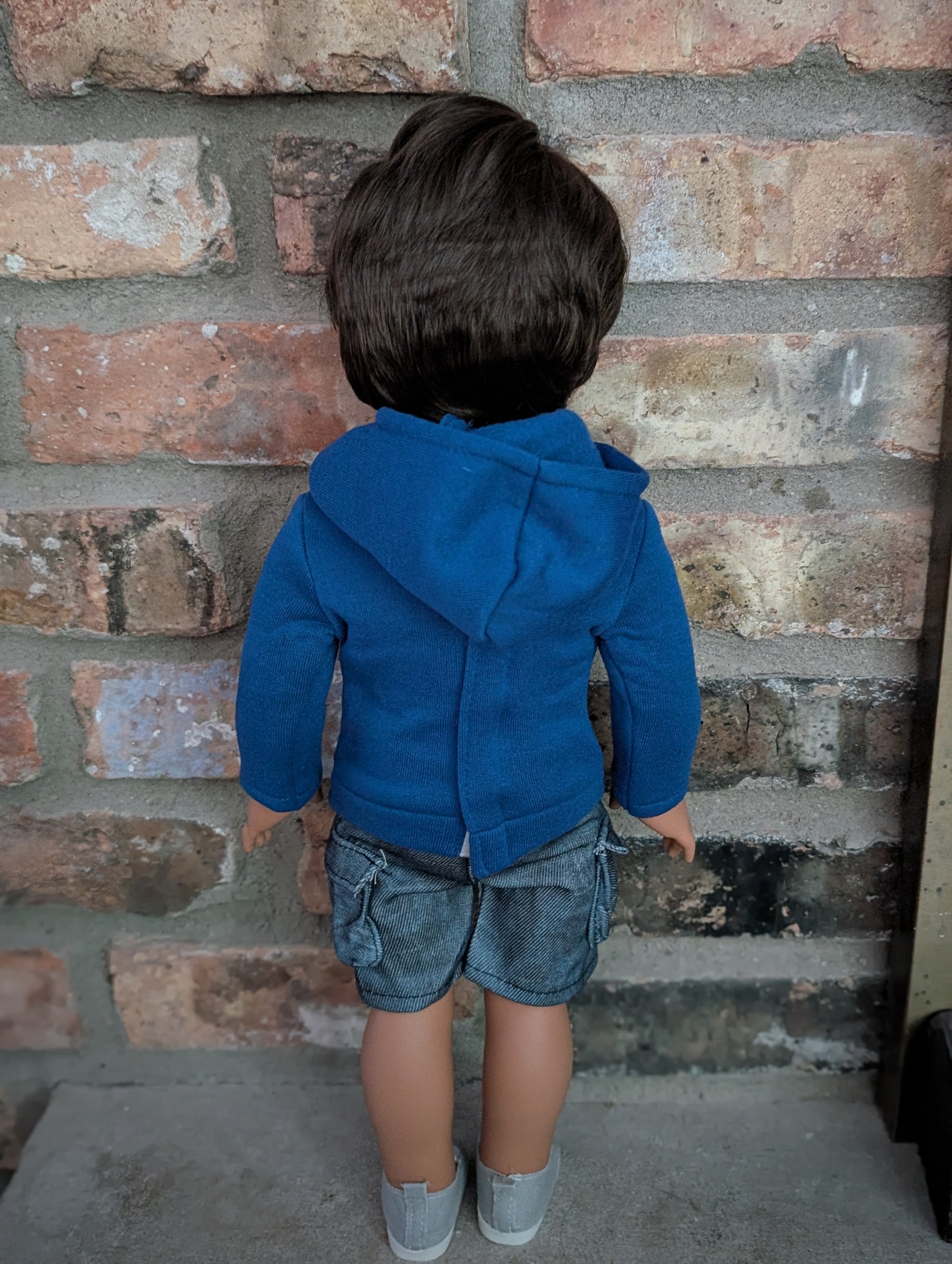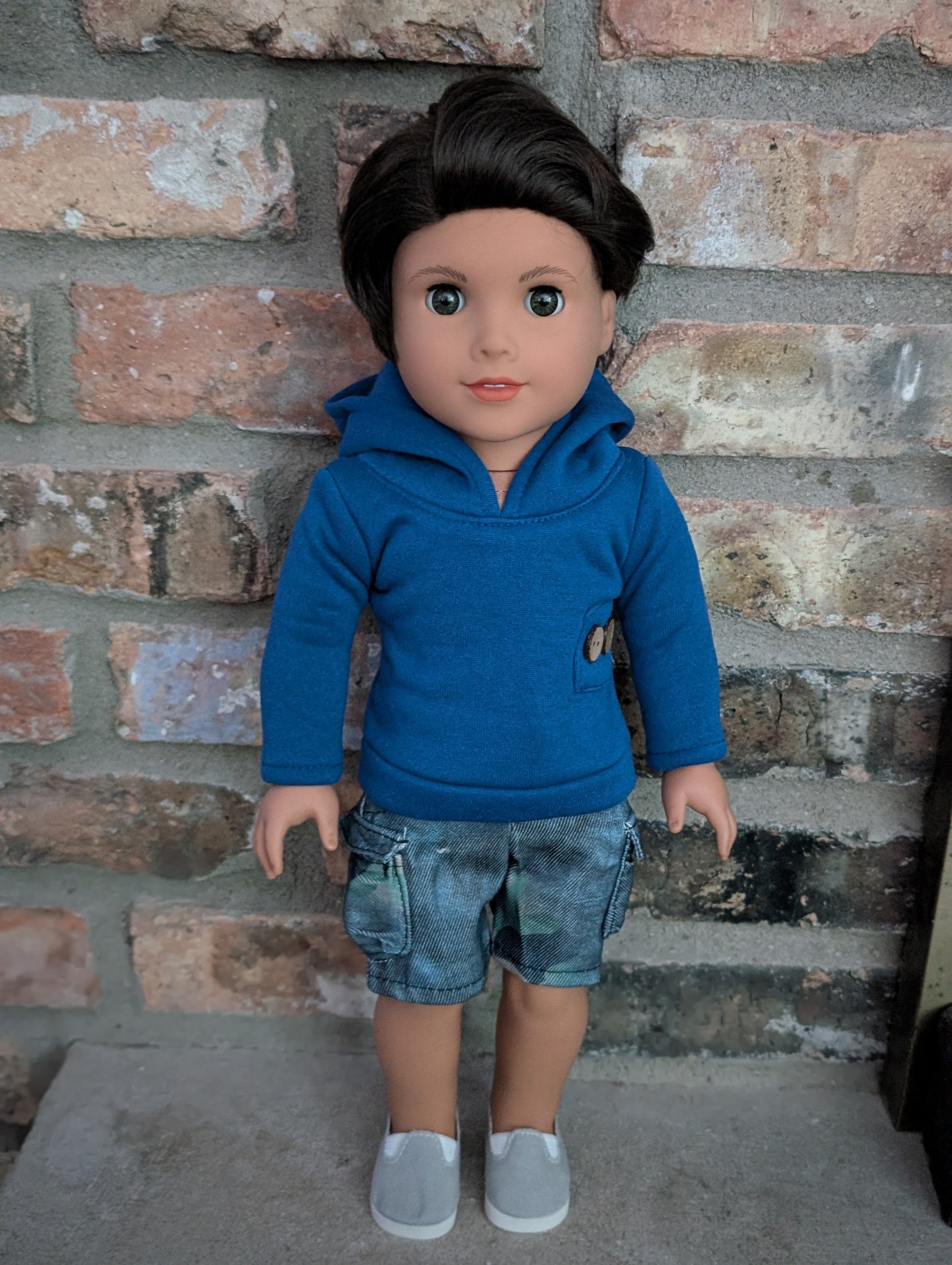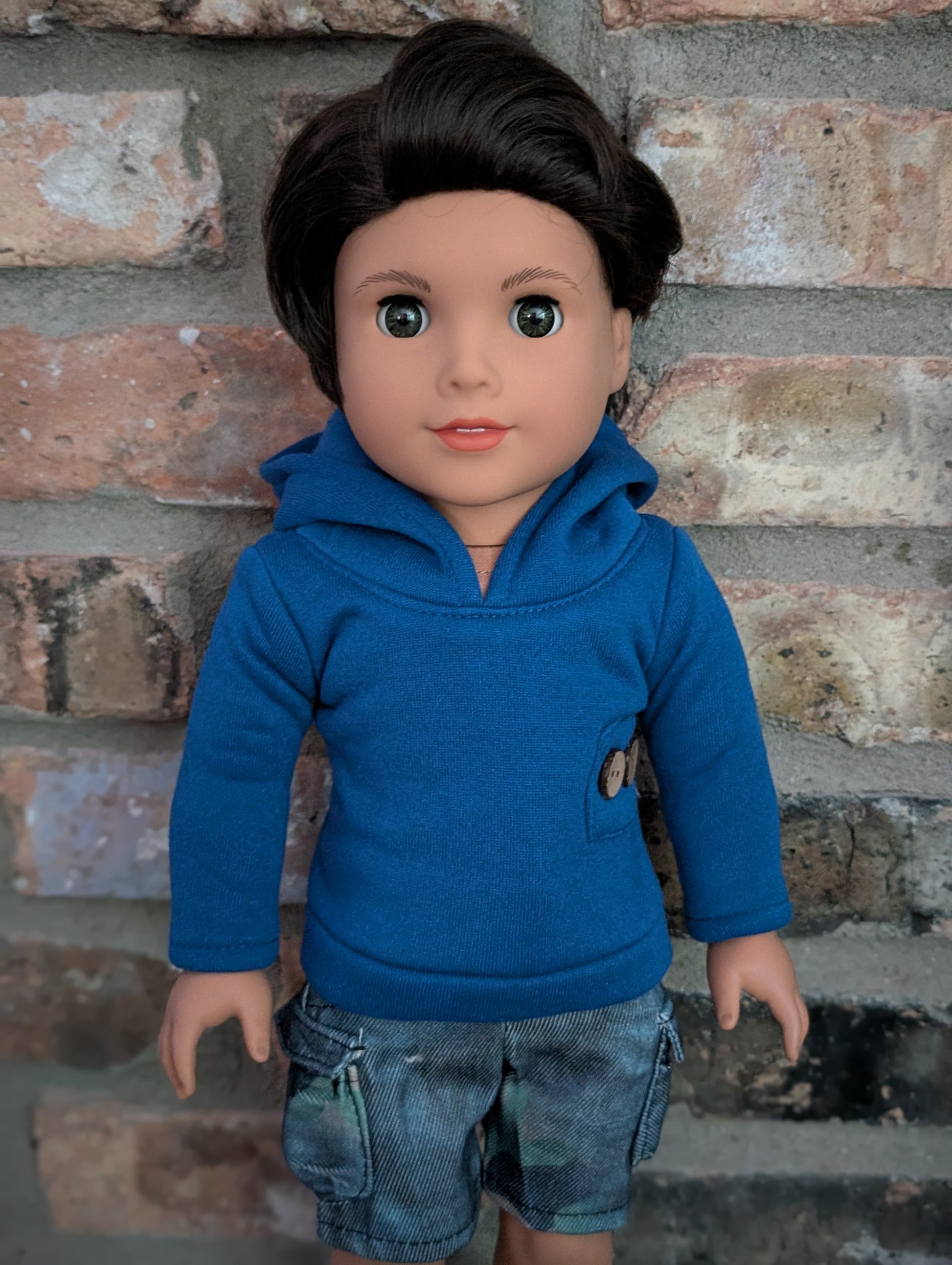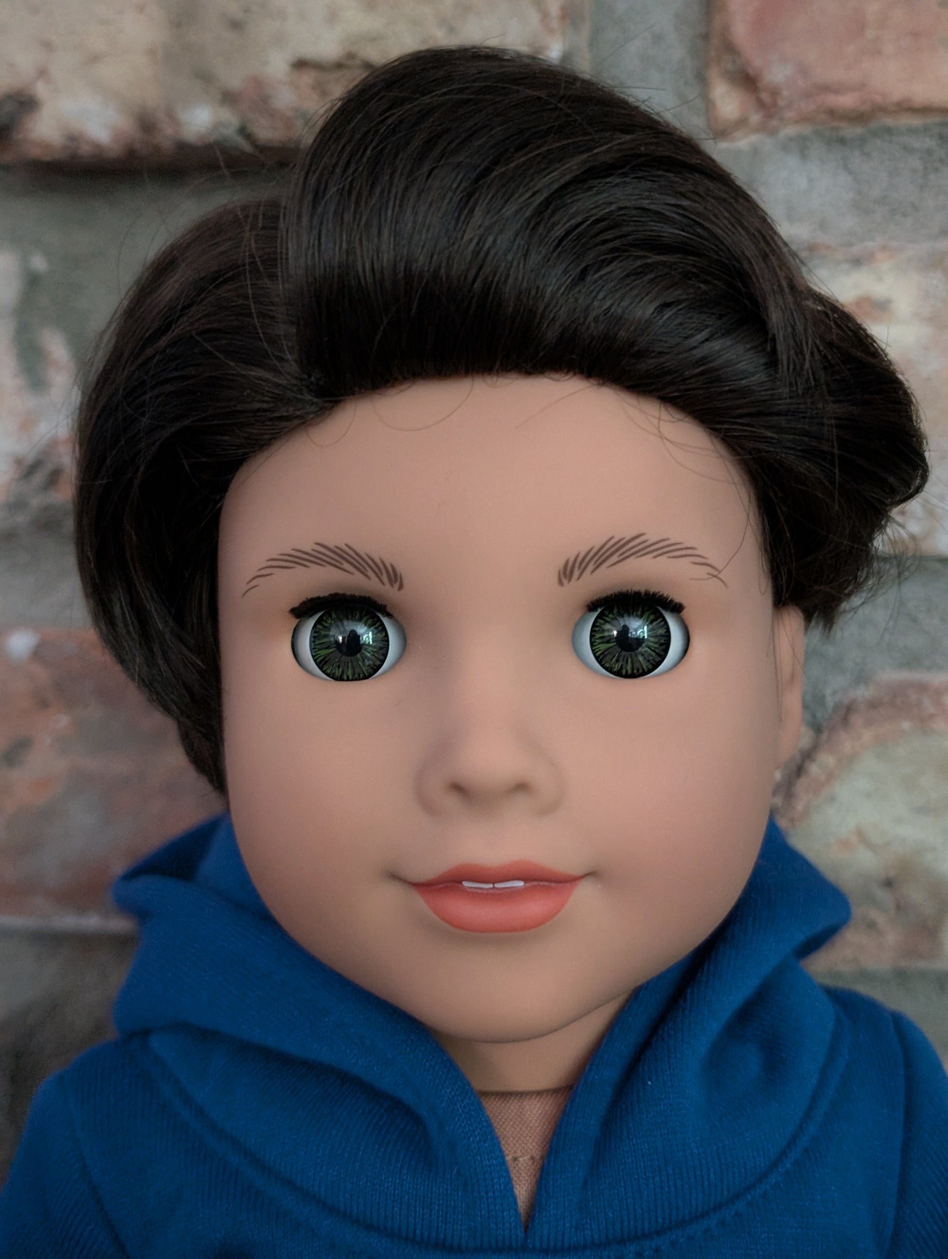 This one of a kind OOAK custom boy American Girl doll was created with a brand new doll, a dark brown wig, and hazel eyes. He may have some minor shine marks from handling. He comes with the outfit pictured.