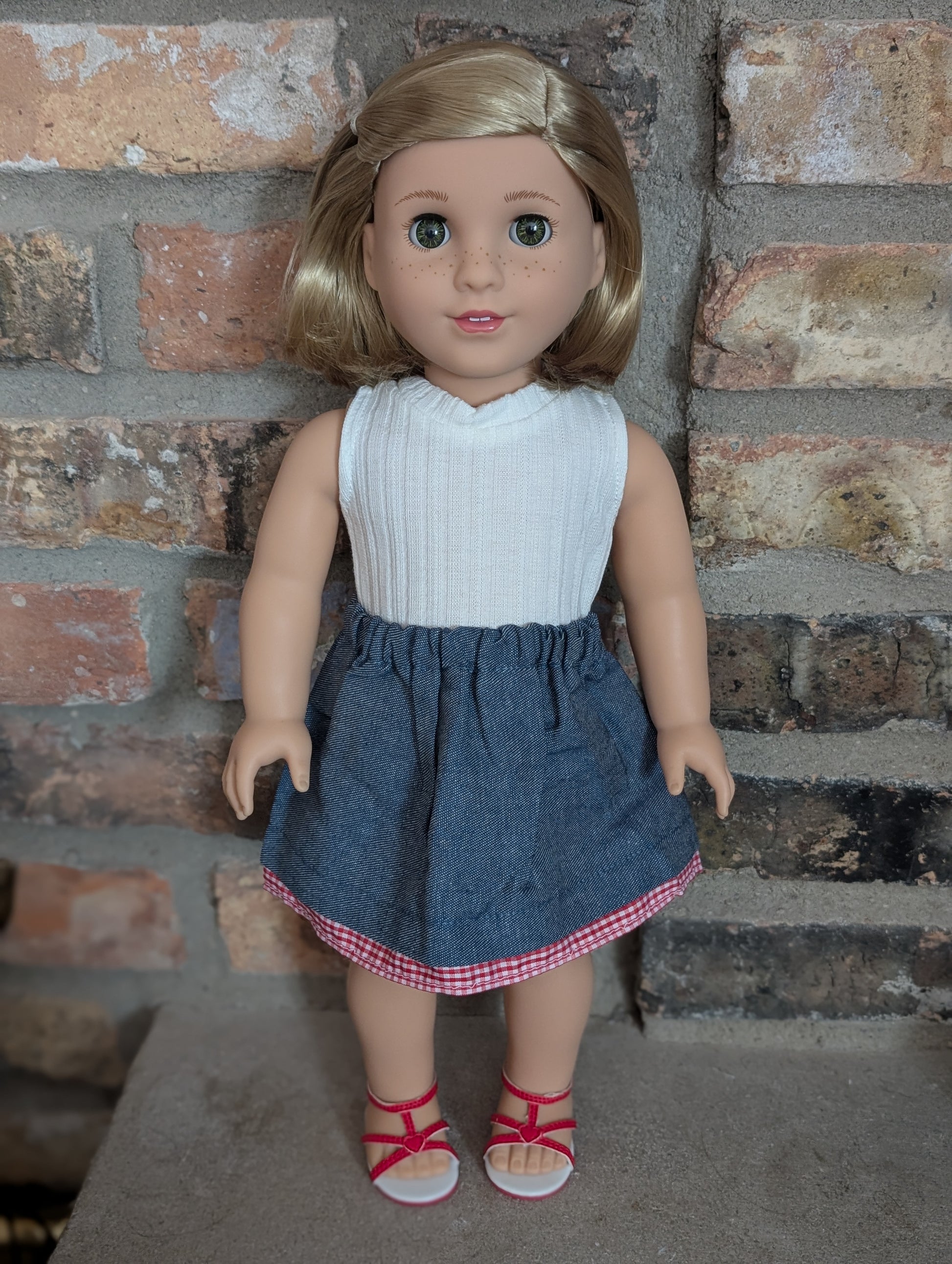 This one of a kind OOAK custom American Girl doll was created with a brand new doll, a blonde wig, and hazel eyes. She has lip gloss that was hand painted and sealed. She may have some minor shine marks from handling. She comes with the outfit pictured.