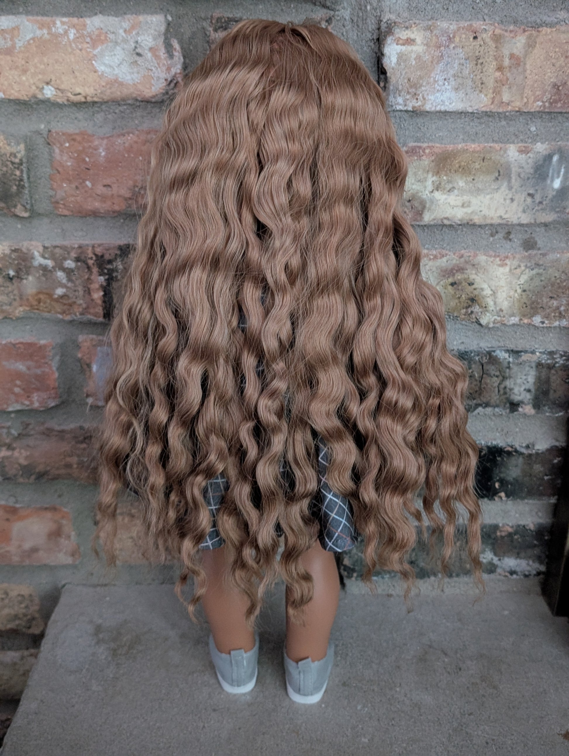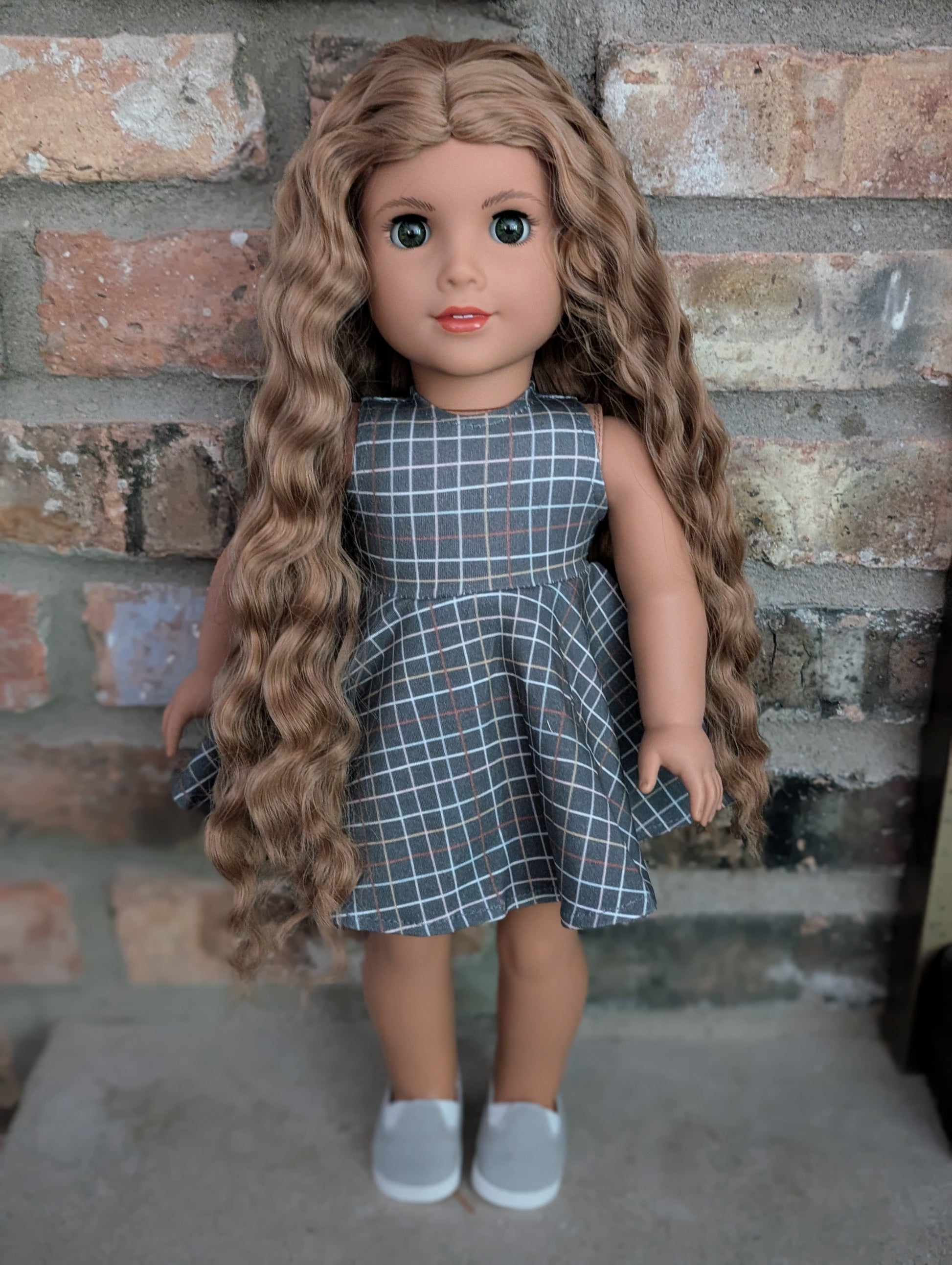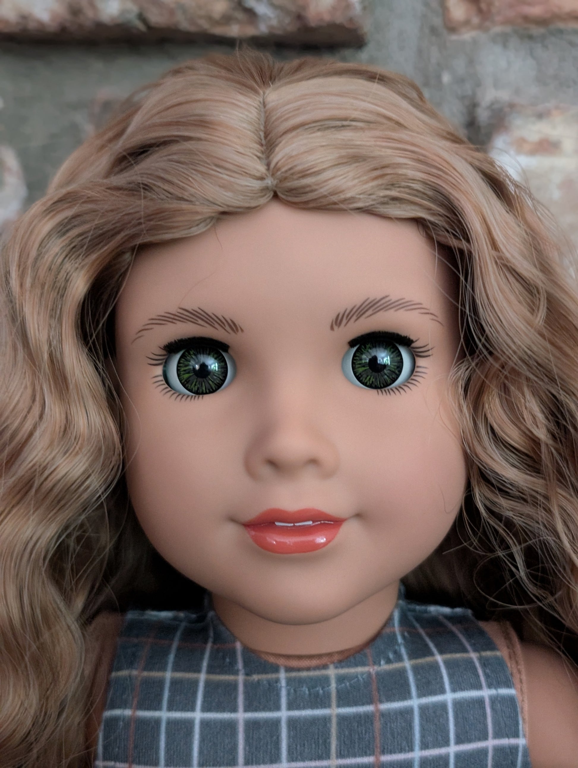 This one of a kind OOAK custom American Girl doll was created with a brand new doll, a brown wig, and hazel eyes. She has lip gloss that was hand painted and sealed. She may have some minor shine marks from handling. She comes with the outfit pictured.